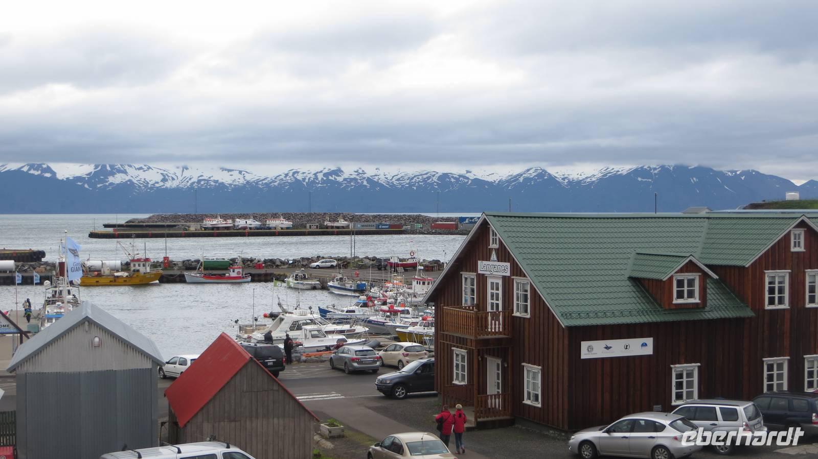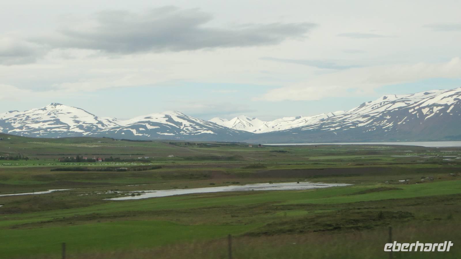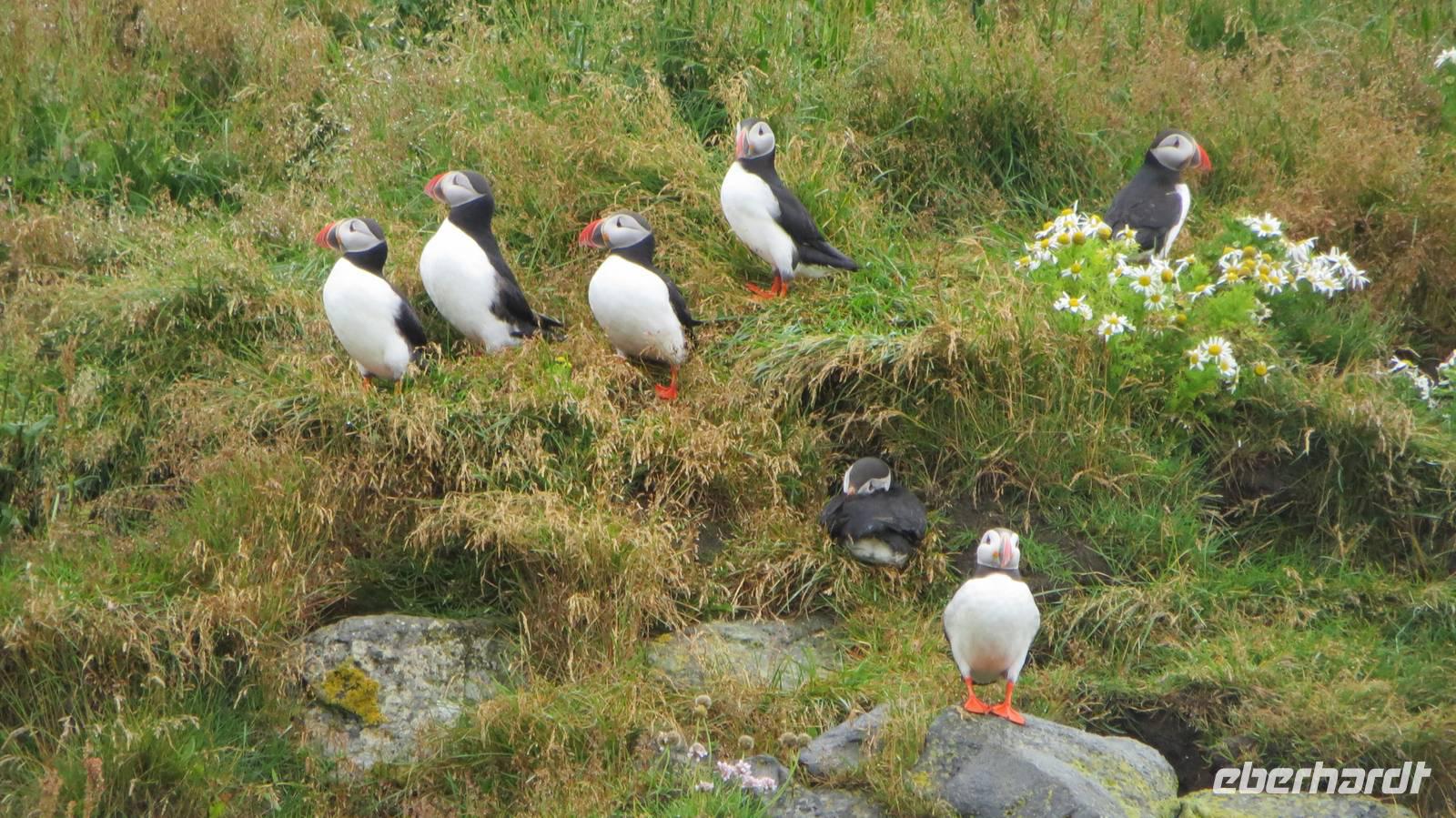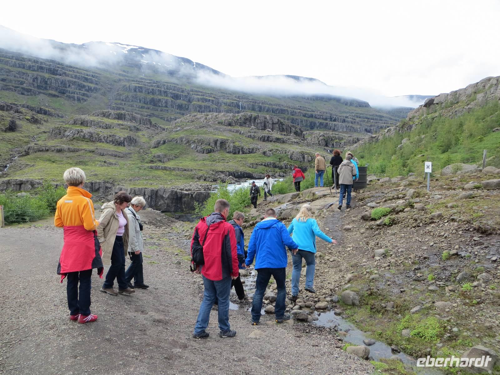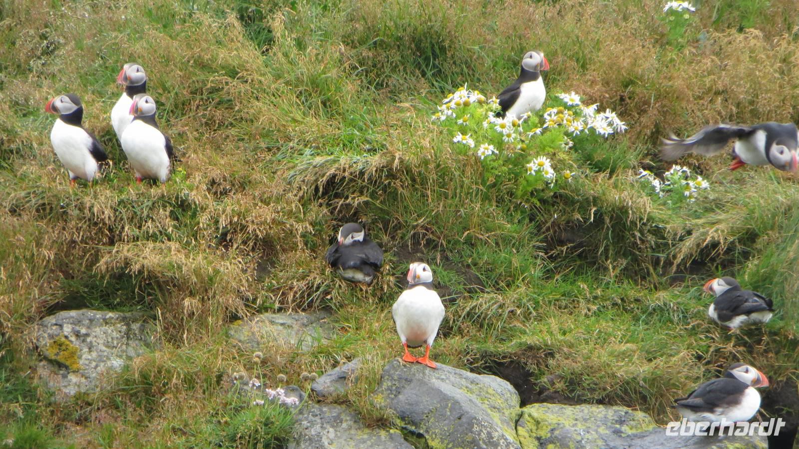 Nach einem reichhaltigen Frühstück starten wir heute leider bei Regen in den Tag. Doch dies sollte sich wohl Dank einer Dame, welche das Wetter besungen hatte, im Laufe des Tages schnell ändern. Von unserem Hotel fahren wir den Berg hinab bis zur Küstenstraße, wo wir noch einen kurzen Stopp an dem Dichterhaus von Jôn Sveinsson einlegen. Dieser hatte hier in den 1860er-Jahren seine Kindheit verbracht und ist dann später durch seine Nonni-Kinderbücher bekannt geworden. Über eine Brücke, die am Flughafen von Akureyri vorbeiführt, erreichen wir die andere Seite des Fjords, welchen wir erst einmal noch Stück entlang fahren. Dann verlassen wir die Küste um zum sagenumwobenen Godafoss zu fahren. Dieser wird auch als Götterwasserfall bezeichnet, da Þorgeir nach seiner Entscheidung, dass die Isländer zum Christentum übertreten sollen, alle seine heidnischen Götterbilder in den Wasserfall geworfen hat. Wir steigen am Wasserfall aus und unternehmen einen kleinen Spaziergang entlang dieses 12 m hohen Sturzes und dem Fluss Skálfandafljót. Über eine Brücke, wo wir nochmals einen herrlichen Blick auf das Gewässer haben, erreichen wir wieder unseren Bus. Weiter führt uns die heutige Reise in das malerische Fischerörtchen Húsavík. Hier gehen wir erst einmal in eine Bank, um uns für die kommenden Tage mit weiteren Isländischen Kronen auszustatten. Da es hier in der Bank auch noch kostenlosen Kaffee gibt, legen wir kurzerhand eine kleine Kaffeepause ein, bevor dann jeder zu seiner individuellen Besichtigungstour aufbricht. Wir bummeln durch die Straßen der Stadt, kaufen uns eine Kleinigkeit für unser Mittagspicknick, besuchen die kleine Holzkirche aus dem Jahre 1907 und spazieren entlang des Hafens, von welchem wir die schneebedeckten Berge im Hintergrund sehen. Ein tolles Bild, das wir mit unseren Fotoapparaten für die Daheimgebliebenen festhalten. Anschließend fahren wir weiter entlang der Küste über die Halbinsel Tjörnes. Wir sind jetzt nur noch ca. 2360 km vom Nordpol entfernt, dennoch herrschen hier auf Island die höchsten Temperaturen. Um unseren Tag mit einer kleinen Überraschung zu versüßen, legen wir einen kurzen Stopp ein, wo wir das erste Mal während unserer Reise die niedlichen Papageitaucher sehen. Diese typisch für die Nordhalbkugel anzutreffenden Vögel werden jedoch immer weniger, was vor allem am Wandel des Klimas und an deren beschaulichem Ausbrüten von nur einem einzigen Ei pro Saison liegt. Mit allerhand tollen Fotos im Kasten setzen wir unsere Fahrt nach Süden zum Nationalpark Asbyrgí fort. Hier machen wir auf der Terrasse des Besucherzentrums mit den eingekauften Snacks aus Húsavík und Blick auf die hufeisenförmige Asbyrgí Schlucht ein Mittagspicknick. Wieder gestärkt, fahren wir weiter in die Schlucht hinein, welche durch einen vom Vatnajökull kommenden Gletscherfluss entstanden ist. Sie ist mit Bäumen bewachsen und lädt somit zu einem kleinen Waldspaziergang ein. Durch den Wald und vorbei an dem See unterhalb des ehemaligen Wasserfalles laufen wir bis zu einem Aussichtpunkt, der uns einen weiten Blick über diese beeindruckende Schlucht und den Botnstjörn See eröffnet. Abschließend laufen wir nochmals zum See. Wir genießen diese traumhafte Natur und beobachten eine kleine Entenfamilie. Nun ist es langsam Zeit die Rückfahrt nach Akureyri anzutreten. Auf unserem Rückweg halten wir auf der gegenüberliegenden Seite von Akureyri. Das Wetter ist im Gegensatz zu heute Morgen sehr freundlich, so dass wir einen fantastischen Blick auf das Städtchen haben. Wieder im Hotel trifft sich ein Teil der Gruppe zu einem gemeinsamen Spaziergang durch den gleich am dem Hotel liegenden Botanischen Garten, welcher mit einer tollen Blumenpracht glänzt. 18:30 Uhr treffen wir uns schließlich im Hotelrestaurant zum gemeinsamen Abendessen. Auch heute hält das Buffet wieder allerhand leckere Speisen und Köstlichkeiten für uns bereit. Damit wir nicht nur die Island-Pferde mal gesehen haben, sondern auch sagen können, dass wir auf einem gegessen haben , bricht ein Großteil der Gruppe zu einem abendlichen Reitausflug auf. Dieser bereitet allen viel Freude, so dass alle gut gelaunt zurück ins Hotel kehren. Bei einem Trink an der Hotelbar lassen wir den Abend mit einer Berichterstattung über das Reiterlebnis ausklingen.