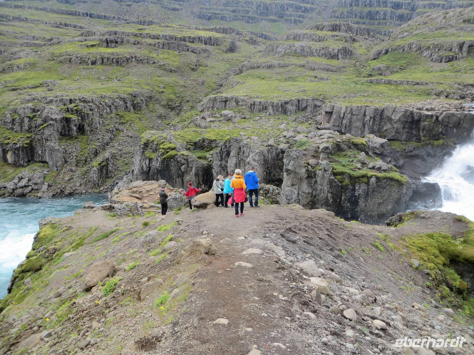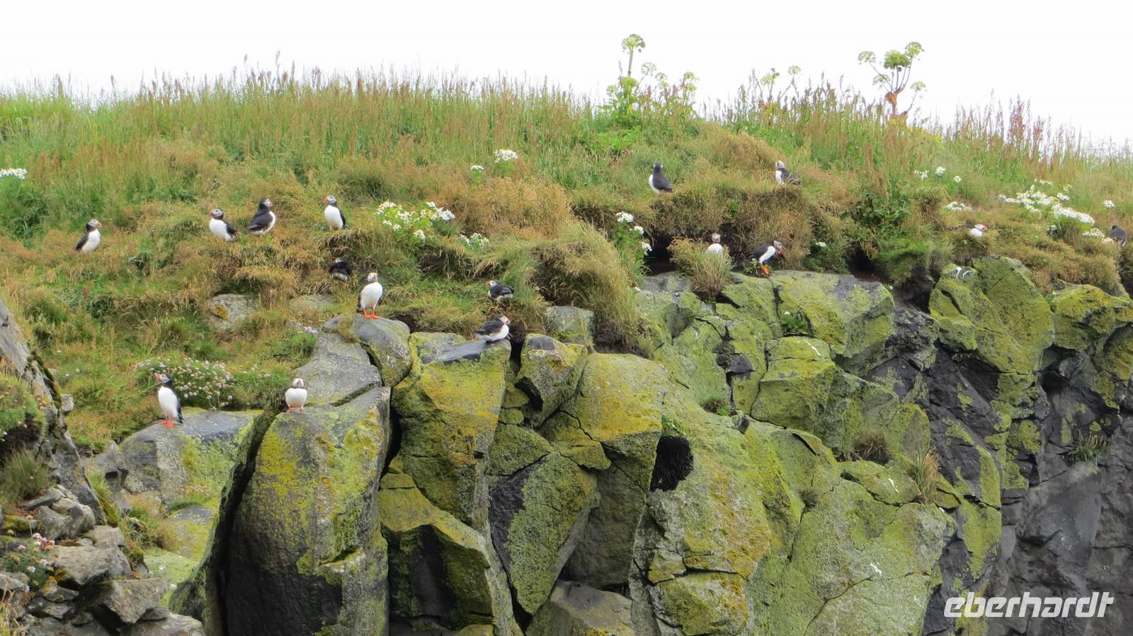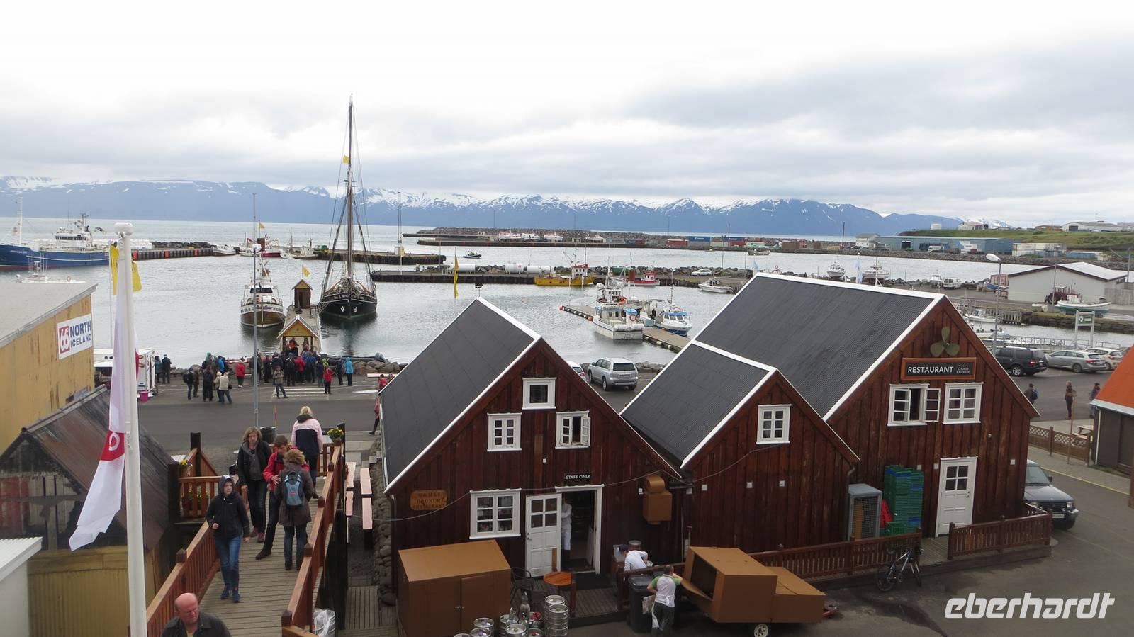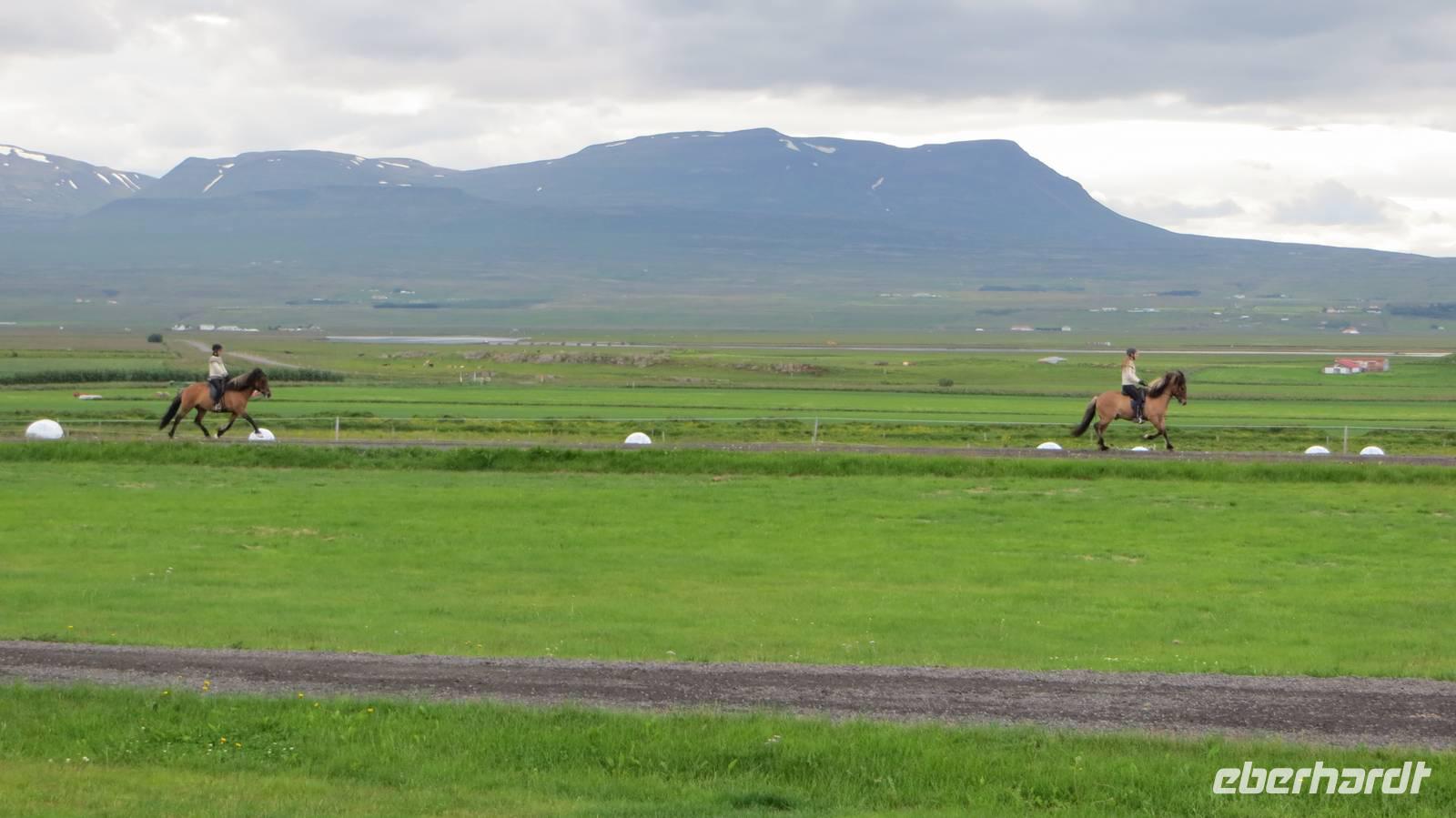 Nach einem reichhaltigen Frühstück starten wir heute leider bei Regen in den Tag. Doch dies sollte sich wohl Dank einer Dame, welche das Wetter besungen hatte, im Laufe des Tages schnell ändern. Von unserem Hotel fahren wir den Berg hinab bis zur Küstenstraße, wo wir noch einen kurzen Stopp an dem Dichterhaus von Jôn Sveinsson einlegen. Dieser hatte hier in den 1860er-Jahren seine Kindheit verbracht und ist dann später durch seine Nonni-Kinderbücher bekannt geworden. Über eine Brücke, die am Flughafen von Akureyri vorbeiführt, erreichen wir die andere Seite des Fjords, welchen wir erst einmal noch Stück entlang fahren. Dann verlassen wir die Küste um zum sagenumwobenen Godafoss zu fahren. Dieser wird auch als Götterwasserfall bezeichnet, da Þorgeir nach seiner Entscheidung, dass die Isländer zum Christentum übertreten sollen, alle seine heidnischen Götterbilder in den Wasserfall geworfen hat. Wir steigen am Wasserfall aus und unternehmen einen kleinen Spaziergang entlang dieses 12 m hohen Sturzes und dem Fluss Skálfandafljót. Über eine Brücke, wo wir nochmals einen herrlichen Blick auf das Gewässer haben, erreichen wir wieder unseren Bus. Weiter führt uns die heutige Reise in das malerische Fischerörtchen Húsavík. Hier gehen wir erst einmal in eine Bank, um uns für die kommenden Tage mit weiteren Isländischen Kronen auszustatten. Da es hier in der Bank auch noch kostenlosen Kaffee gibt, legen wir kurzerhand eine kleine Kaffeepause ein, bevor dann jeder zu seiner individuellen Besichtigungstour aufbricht. Wir bummeln durch die Straßen der Stadt, kaufen uns eine Kleinigkeit für unser Mittagspicknick, besuchen die kleine Holzkirche aus dem Jahre 1907 und spazieren entlang des Hafens, von welchem wir die schneebedeckten Berge im Hintergrund sehen. Ein tolles Bild, das wir mit unseren Fotoapparaten für die Daheimgebliebenen festhalten. Anschließend fahren wir weiter entlang der Küste über die Halbinsel Tjörnes. Wir sind jetzt nur noch ca. 2360 km vom Nordpol entfernt, dennoch herrschen hier auf Island die höchsten Temperaturen. Um unseren Tag mit einer kleinen Überraschung zu versüßen, legen wir einen kurzen Stopp ein, wo wir das erste Mal während unserer Reise die niedlichen Papageitaucher sehen. Diese typisch für die Nordhalbkugel anzutreffenden Vögel werden jedoch immer weniger, was vor allem am Wandel des Klimas und an deren beschaulichem Ausbrüten von nur einem einzigen Ei pro Saison liegt. Mit allerhand tollen Fotos im Kasten setzen wir unsere Fahrt nach Süden zum Nationalpark Asbyrgí fort. Hier machen wir auf der Terrasse des Besucherzentrums mit den eingekauften Snacks aus Húsavík und Blick auf die hufeisenförmige Asbyrgí Schlucht ein Mittagspicknick. Wieder gestärkt, fahren wir weiter in die Schlucht hinein, welche durch einen vom Vatnajökull kommenden Gletscherfluss entstanden ist. Sie ist mit Bäumen bewachsen und lädt somit zu einem kleinen Waldspaziergang ein. Durch den Wald und vorbei an dem See unterhalb des ehemaligen Wasserfalles laufen wir bis zu einem Aussichtpunkt, der uns einen weiten Blick über diese beeindruckende Schlucht und den Botnstjörn See eröffnet. Abschließend laufen wir nochmals zum See. Wir genießen diese traumhafte Natur und beobachten eine kleine Entenfamilie. Nun ist es langsam Zeit die Rückfahrt nach Akureyri anzutreten. Auf unserem Rückweg halten wir auf der gegenüberliegenden Seite von Akureyri. Das Wetter ist im Gegensatz zu heute Morgen sehr freundlich, so dass wir einen fantastischen Blick auf das Städtchen haben. Wieder im Hotel trifft sich ein Teil der Gruppe zu einem gemeinsamen Spaziergang durch den gleich am dem Hotel liegenden Botanischen Garten, welcher mit einer tollen Blumenpracht glänzt. 18:30 Uhr treffen wir uns schließlich im Hotelrestaurant zum gemeinsamen Abendessen. Auch heute hält das Buffet wieder allerhand leckere Speisen und Köstlichkeiten für uns bereit. Damit wir nicht nur die Island-Pferde mal gesehen haben, sondern auch sagen können, dass wir auf einem gegessen haben , bricht ein Großteil der Gruppe zu einem abendlichen Reitausflug auf. Dieser bereitet allen viel Freude, so dass alle gut gelaunt zurück ins Hotel kehren. Bei einem Trink an der Hotelbar lassen wir den Abend mit einer Berichterstattung über das Reiterlebnis ausklingen.