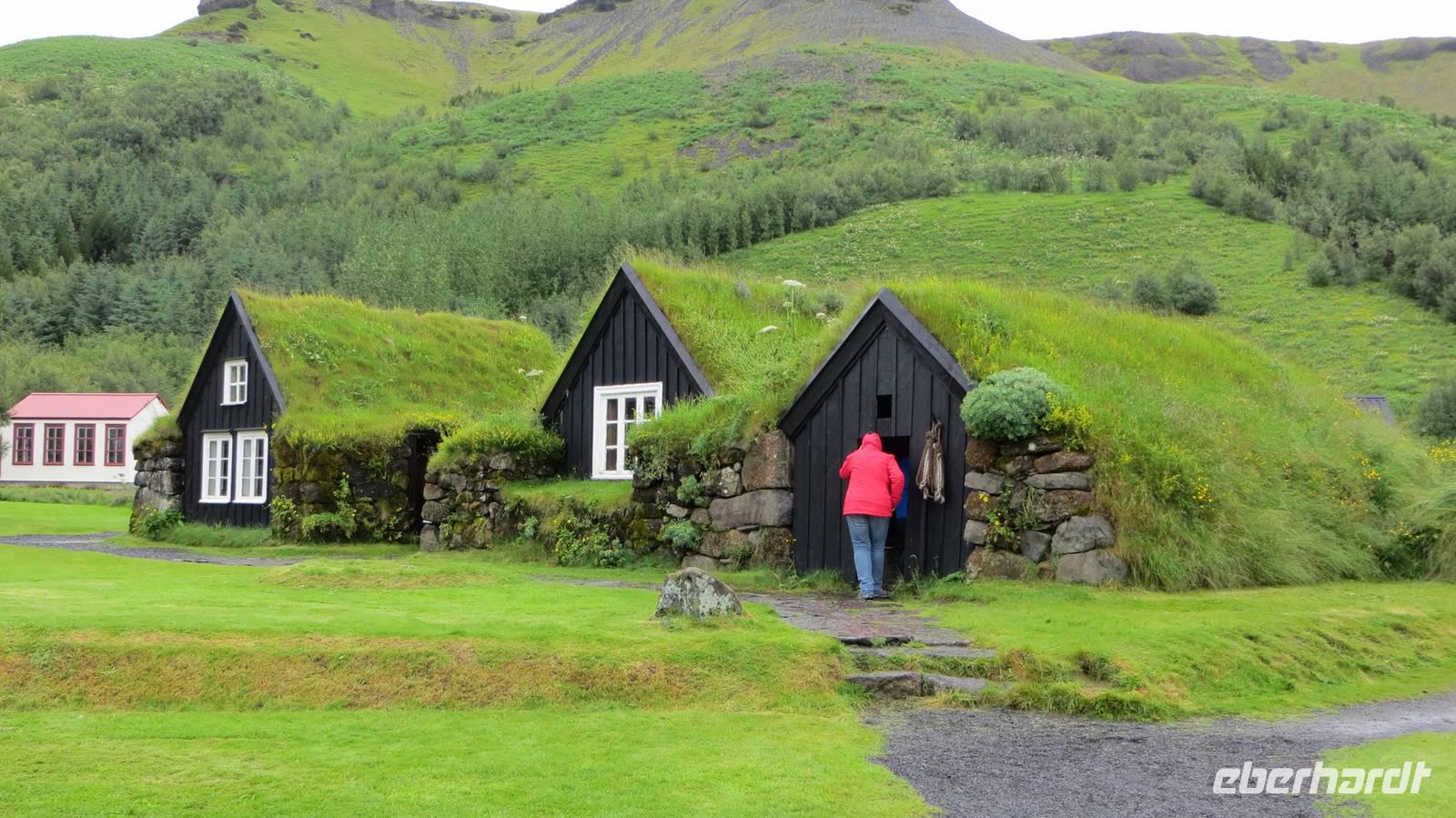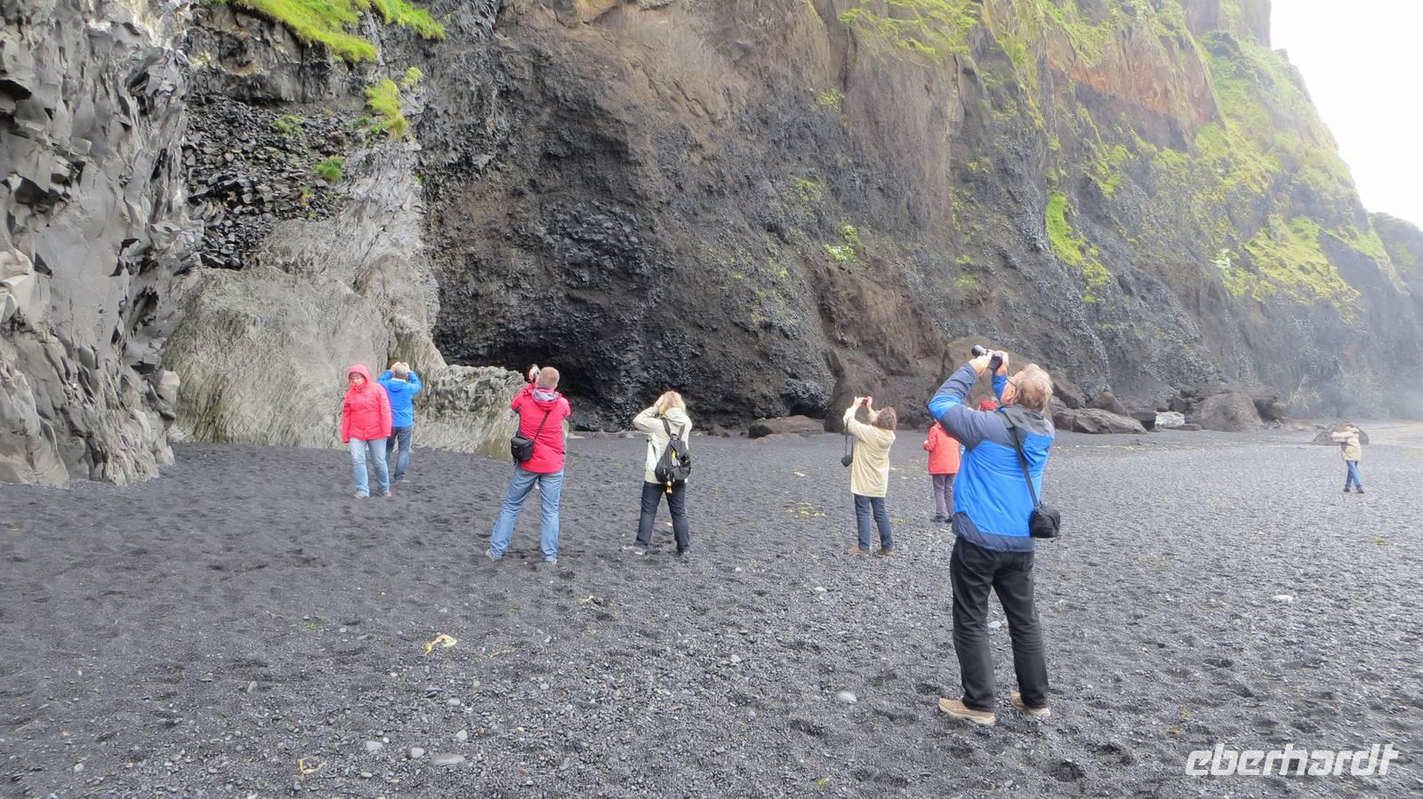 Leider meint es Petrus heute anfangs nicht so gut mit uns, denn als wir in den Bus einsteigen, regnet es, so dass wir schnell einer nach dem anderen unser Gepäck im Bus verstauen müssen. Nach nur kurzer Fahrtzeit kommen wir gleich in der Nähe von Vík - nach dem Berg Reynisfjall - an einem schwarzen Sandstrand an. Von hier sehen wir die Reynisdranger noch einmal von der anderen Seite. Zudem finden wir schön geformte Basaltsäulen vor, die auch eine kleine Höhle bilden. Das Highlight dieses Stück Strandes sind aber wohl die niedlichen Papageitaucher, welche wir hier in Vielzahl antreffen. Sie sitzen auf dem Reynisfjall und lassen sich die Meeresluft um die Ohren blasen. Als Erinnerung schießen wir hier auch ein Gruppenfoto, das uns an die unvergessliche Reise erinnern wird. Nun wird es aber Zeit den Strand zu verlassen, da die Wellen immer höher werden. Weiter geht's zur südlichsten Spitze Islands, der Landspitze Dyrhólaey, die wir bereits schon aus der Ferne gesehen haben. Auch an diesem Kap treffen wir wieder die Papageitaucher. Sie bieten uns reichliche Fotomotive und wir beobachten wie sie aufgeregt durch die Lüfte flattern. Neben den entzückenden Tieren sehen wir uns auch den Dyrhólaey (Torhügelinsel), einen großen Torbogen an. Nachdem alle wieder im Bus sitzen, setzen wir unsere Fahrt entlang der Küste bis nach Skógar fort, wo wir uns zuerst den Skógarfoss, einen 60 m hohen Wasserfall, hinter welchem angeblich der Landnehmer Þrasieine Goldkiste versteckt haben soll, anschauen. Anschließend besuchen wir das Heimatkundemuseum, wo wir auf den Spuren der isländischen Geschichte wandeln und mehr über den Beginn der isländischen Kultur sowie die ersten Bewohner erfahren. Auf eine anschauliche Art und Weise werden wir erst durch das liebevoll gestaltete Museum geführt. Dann ist Zeit vor allem das Freilichtmuseum mit den alten Torfhäusern zu erkunden. Wir schauen uns die unterschiedlichen Gebäude von innen und außen genau an. Dabei haben wir vor allem in der Schule viel Spaß ?. Kurzerhand versuchen wir das frühere Schulerlebnis