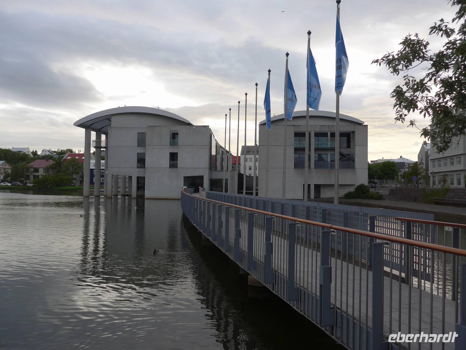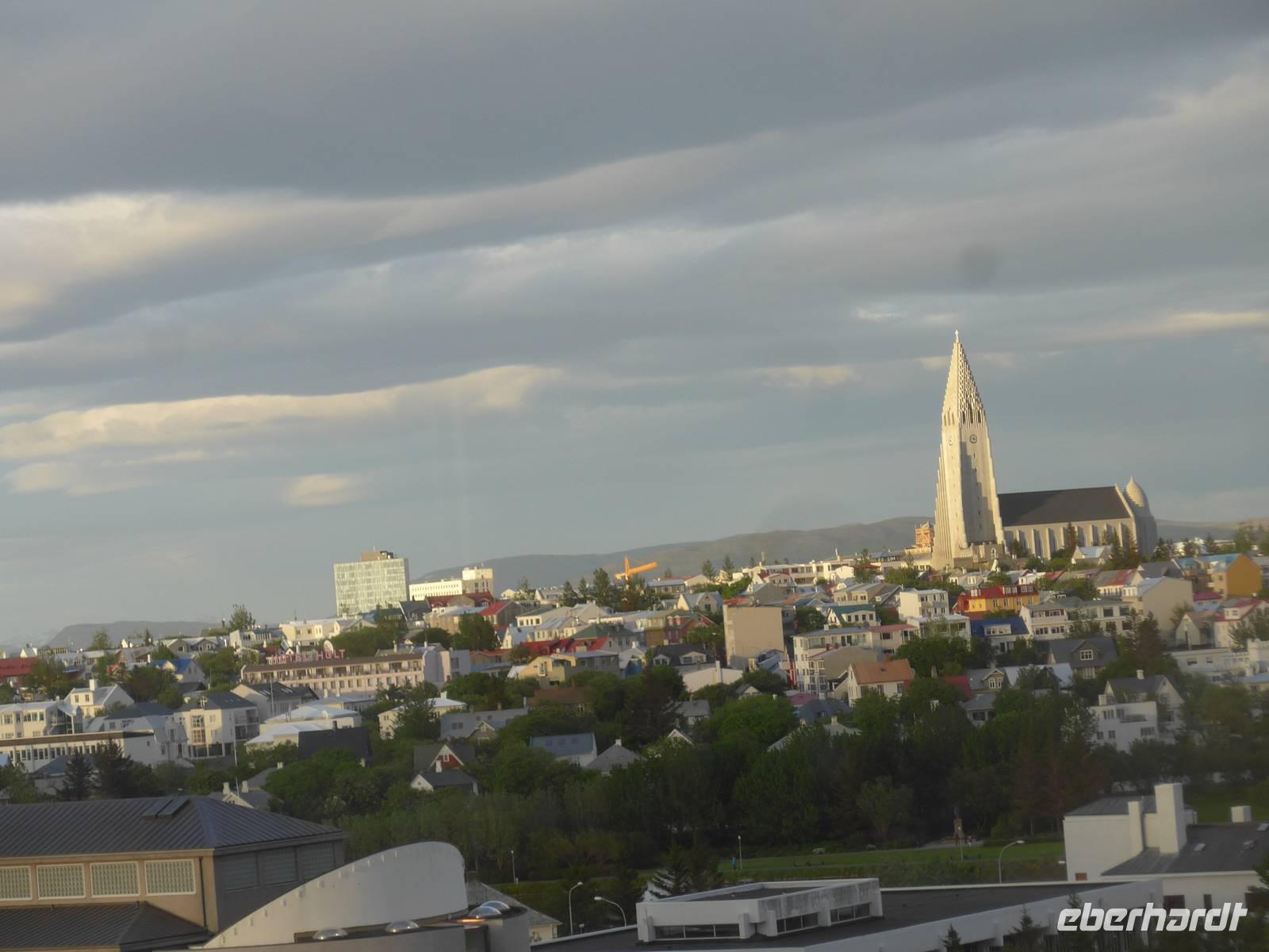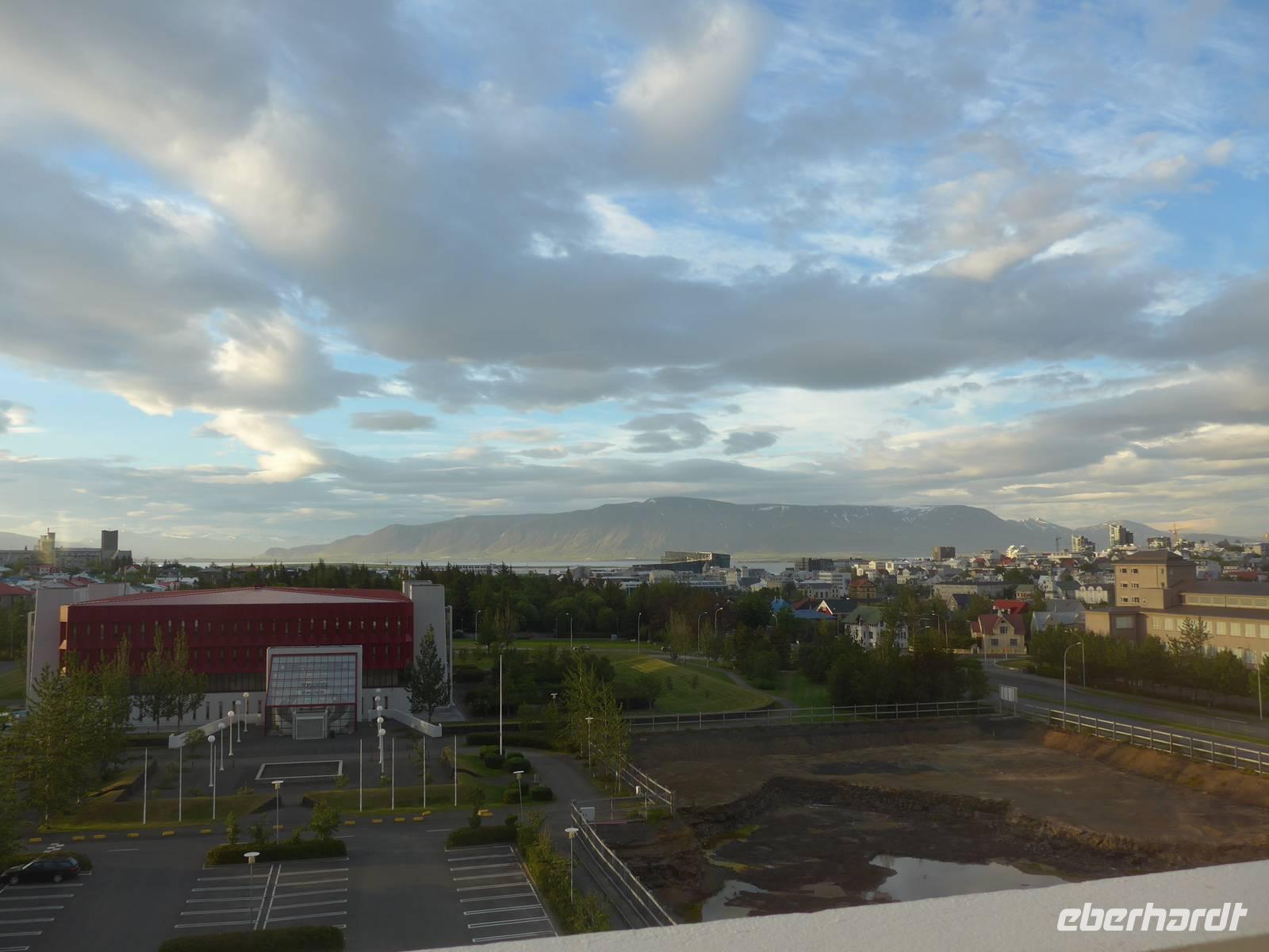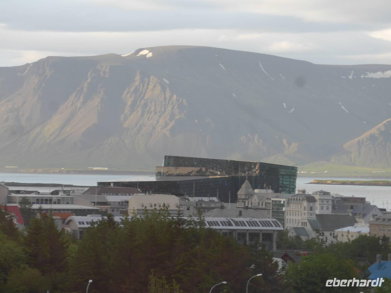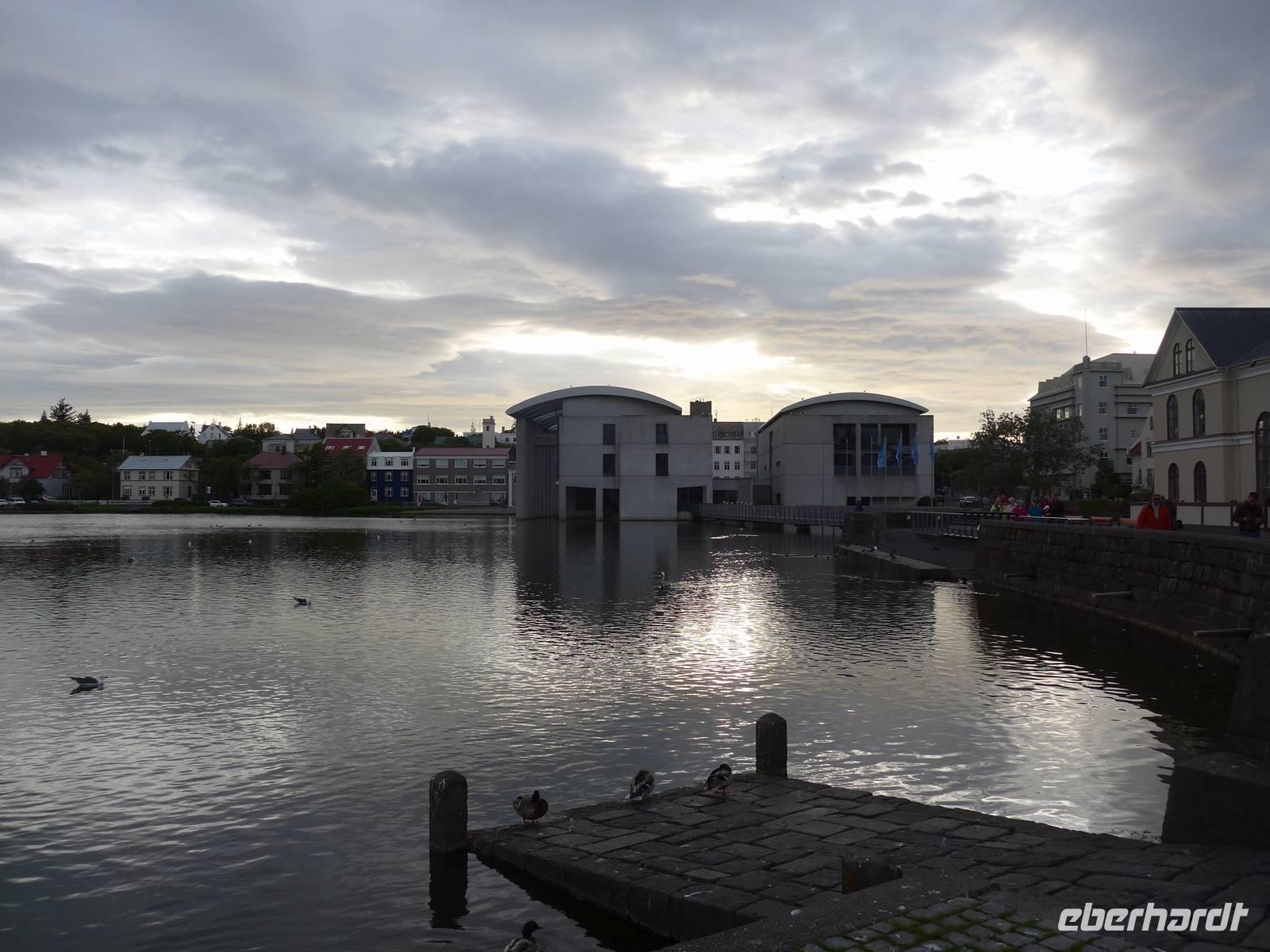 Nun war es Zeit, in unser Hotel Radisson Blue Saga zu fahren und uns für 2 Nächte einzurichten. Wir dankten Jon und trafen uns nach einer halben Stunde wieder, um zu Fuß durch die Stadt zum Abendessen am Hafen zu gehen. Wir nahmen den Weg am Tjörnin, dem See mitten in Reykjavik, vorbei am Rathaus und durch das Stadtzentrum. Das Abendessen gab es im Obergeschgoß eines zauberhaften Lokales mit Blick auf das Hafengeschehen. Das Essen war köstlich und nebenbei konnten wir die Schiffe beobachten. Auf dem Heimweg gingen wir durch das alte Stadtzentrum, sahen das Parlament, die wichtigsten Plätze von Reykjavik, besuchten die Domkirche und spazierten am Ufer des Tjörnin vorbei an der Nationalgalerie und der Nationalbibliothek zurück ins Hotel. Und es war immer noch taghell.