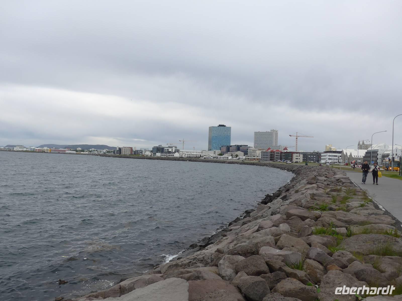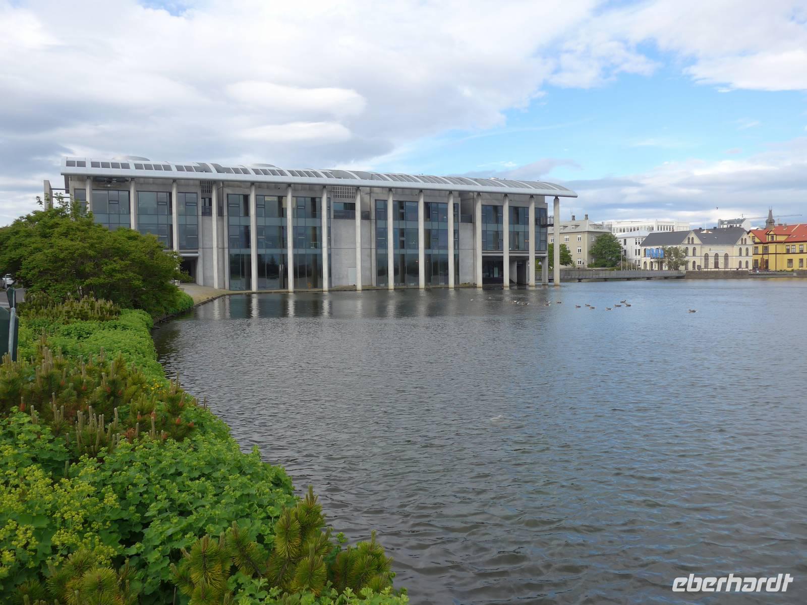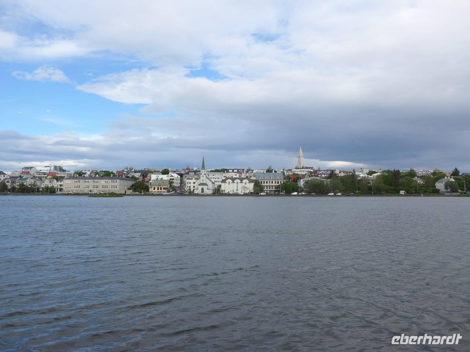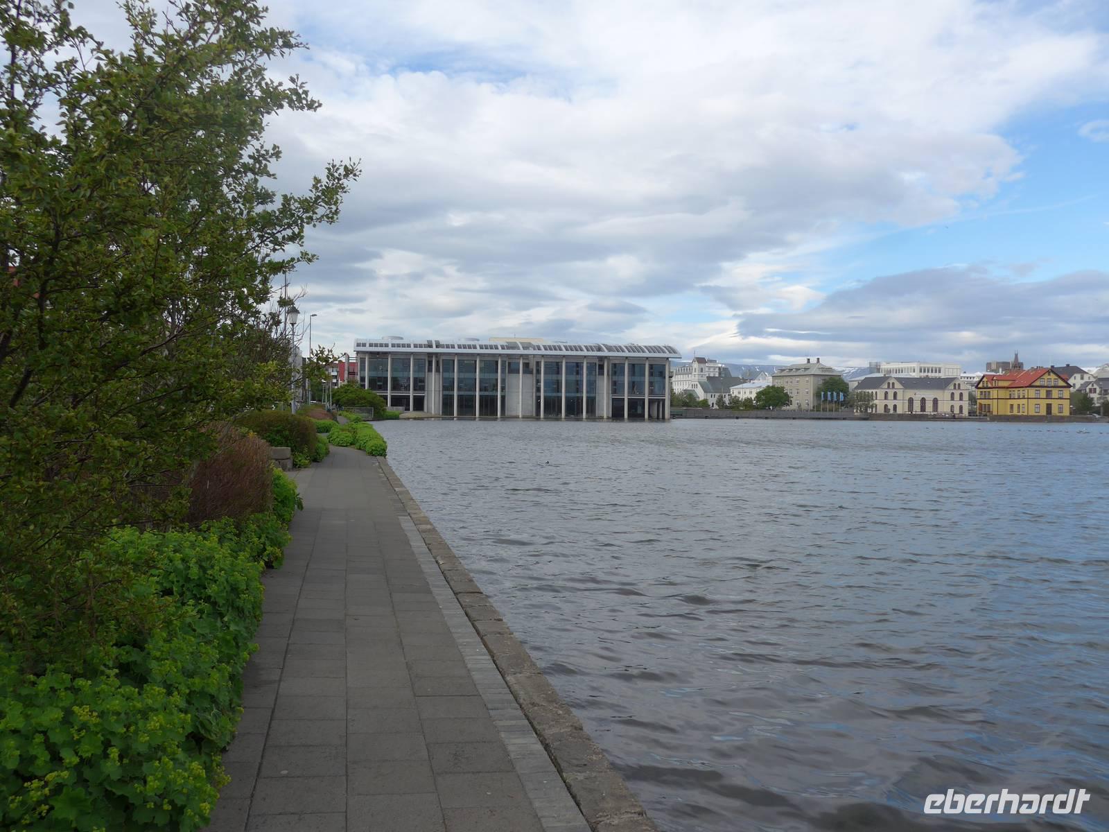 Nun war es Zeit, in unser Hotel Radisson Blue Saga zu fahren und uns für 2 Nächte einzurichten. Wir dankten Jon und trafen uns nach einer halben Stunde wieder, um zu Fuß durch die Stadt zum Abendessen am Hafen zu gehen. Wir nahmen den Weg am Tjörnin, dem See mitten in Reykjavik, vorbei am Rathaus und durch das Stadtzentrum. Das Abendessen gab es im Obergeschgoß eines zauberhaften Lokales mit Blick auf das Hafengeschehen. Das Essen war köstlich und nebenbei konnten wir die Schiffe beobachten. Auf dem Heimweg gingen wir durch das alte Stadtzentrum, sahen das Parlament, die wichtigsten Plätze von Reykjavik, besuchten die Domkirche und spazierten am Ufer des Tjörnin vorbei an der Nationalgalerie und der Nationalbibliothek zurück ins Hotel. Und es war immer noch taghell.