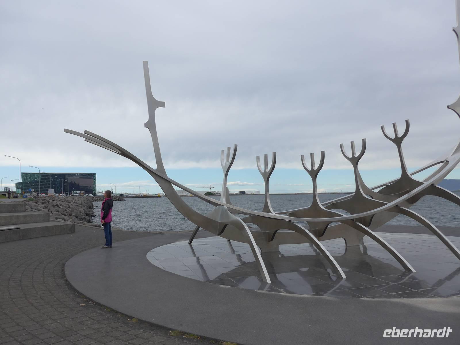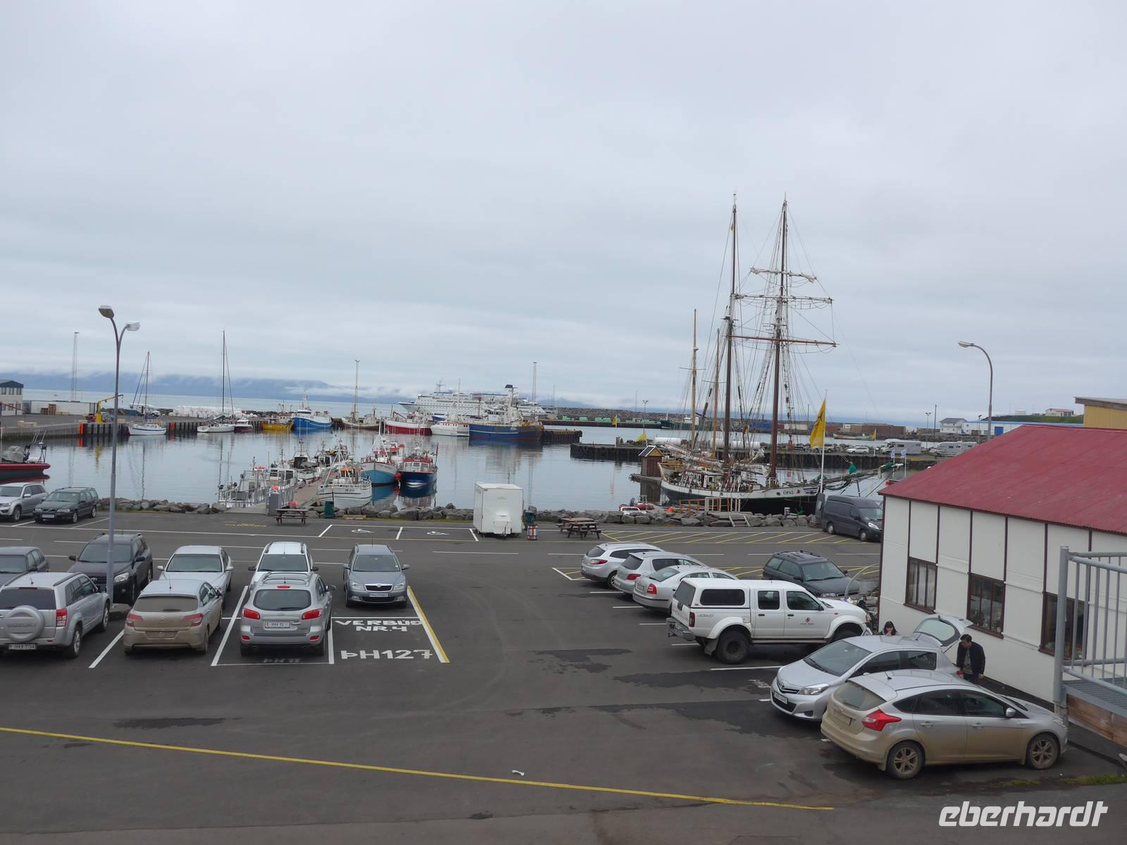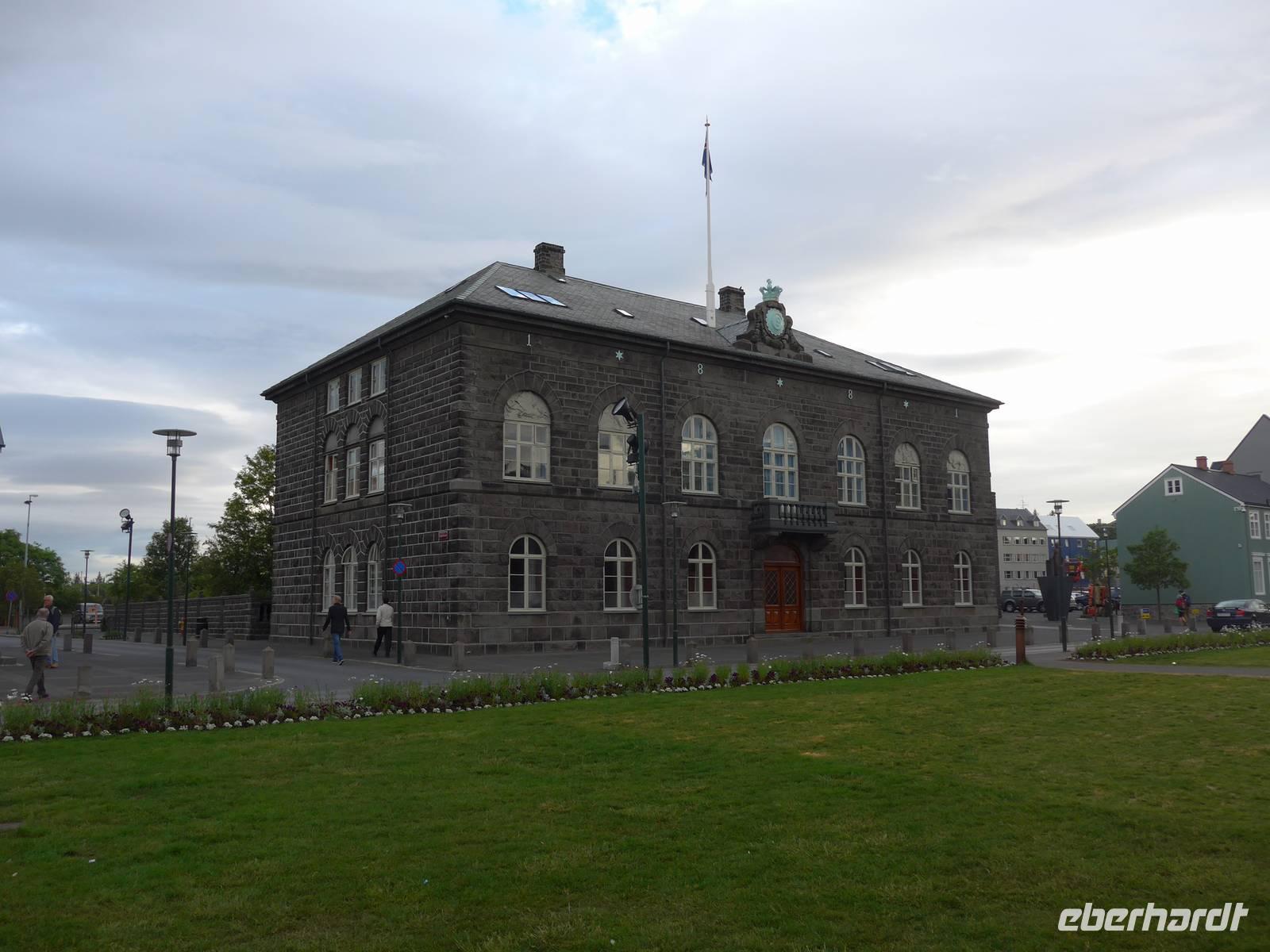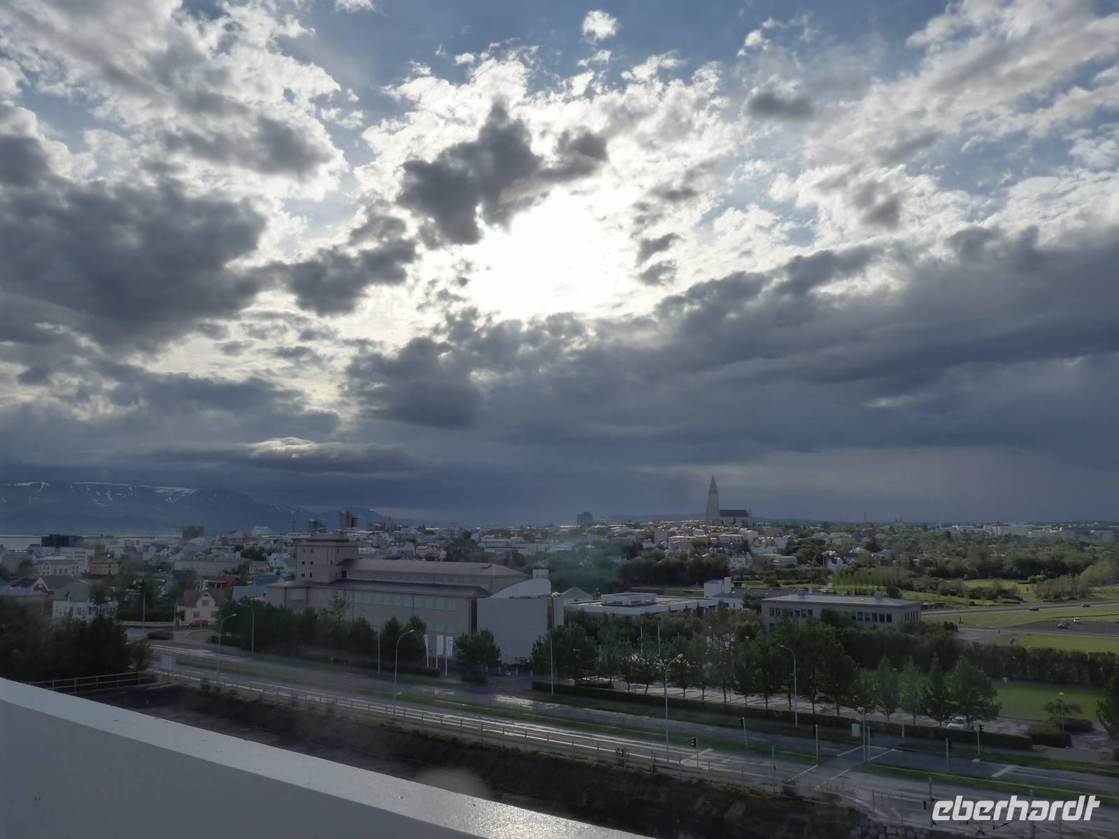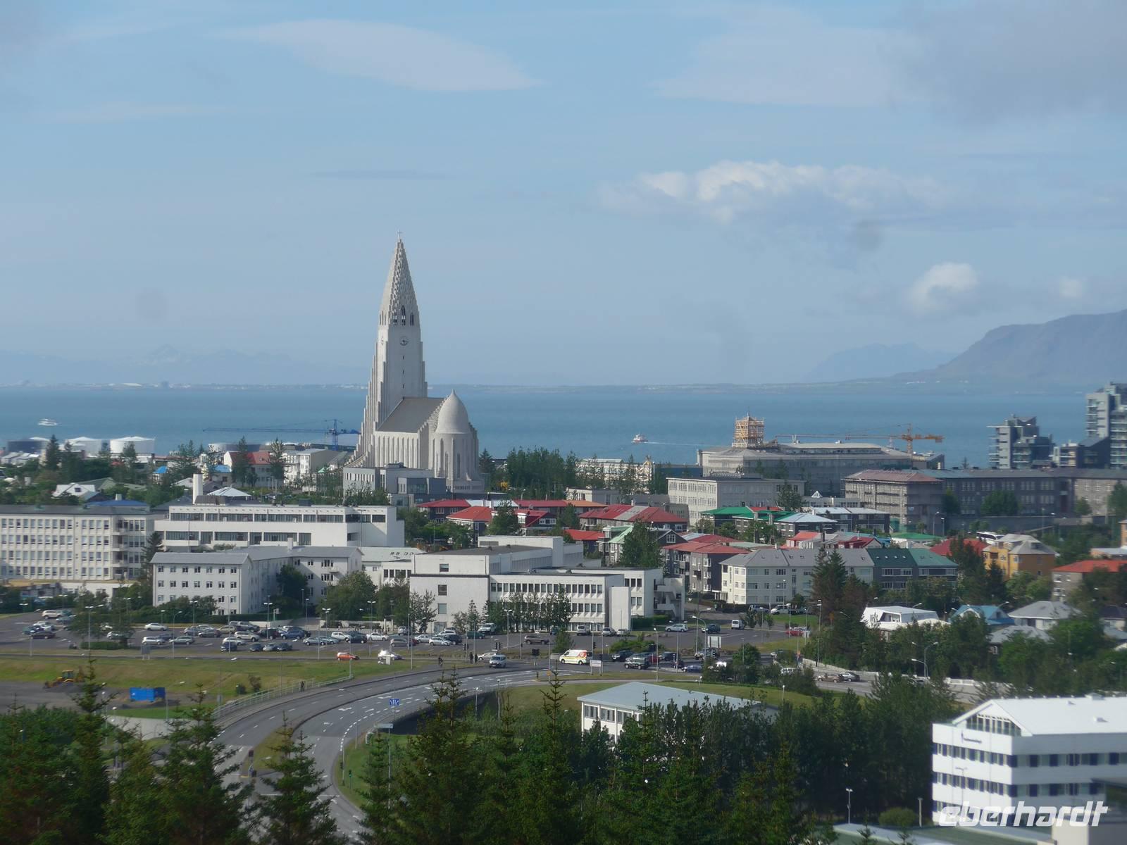 Nun war es Zeit, in unser Hotel Radisson Blue Saga zu fahren und uns für 2 Nächte einzurichten. Wir dankten Jon und trafen uns nach einer halben Stunde wieder, um zu Fuß durch die Stadt zum Abendessen am Hafen zu gehen. Wir nahmen den Weg am Tjörnin, dem See mitten in Reykjavik, vorbei am Rathaus und durch das Stadtzentrum. Das Abendessen gab es im Obergeschgoß eines zauberhaften Lokales mit Blick auf das Hafengeschehen. Das Essen war köstlich und nebenbei konnten wir die Schiffe beobachten. Auf dem Heimweg gingen wir durch das alte Stadtzentrum, sahen das Parlament, die wichtigsten Plätze von Reykjavik, besuchten die Domkirche und spazierten am Ufer des Tjörnin vorbei an der Nationalgalerie und der Nationalbibliothek zurück ins Hotel. Und es war immer noch taghell.