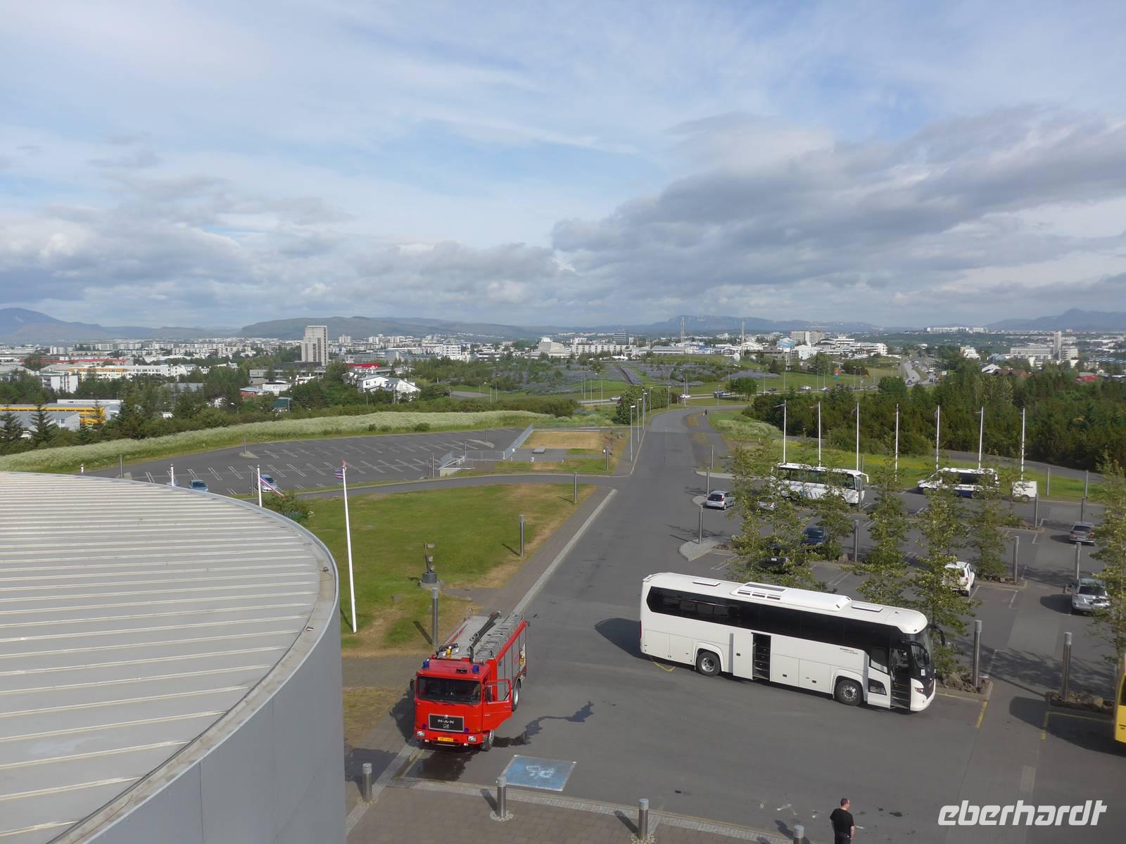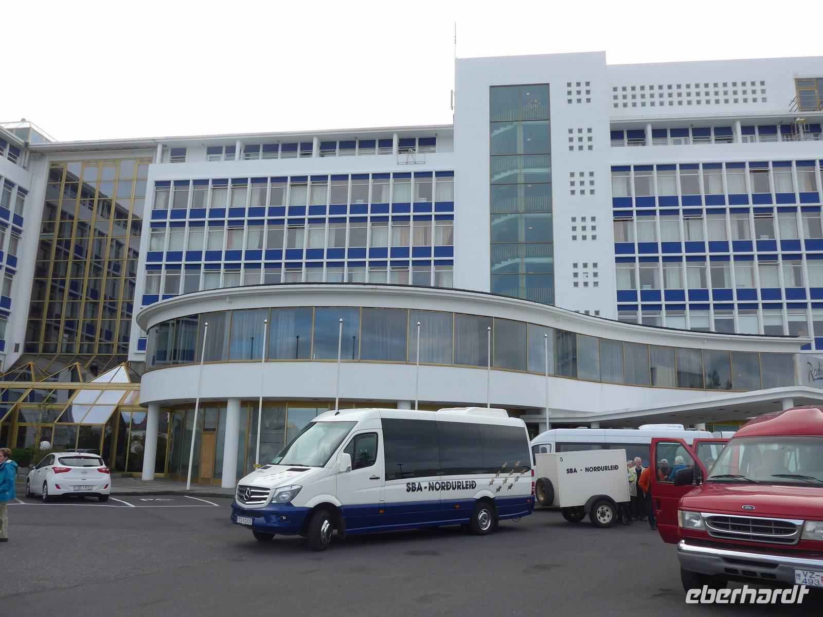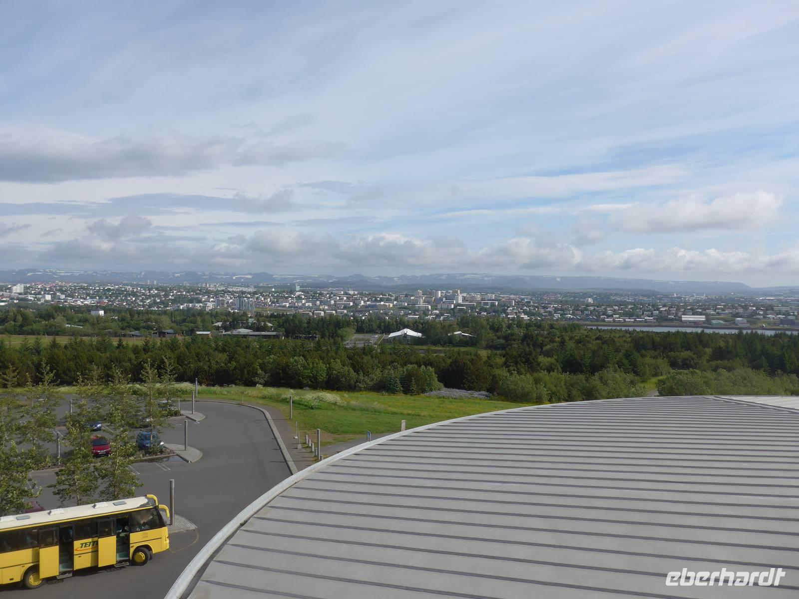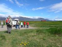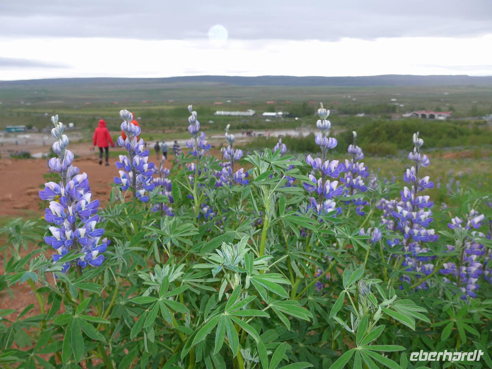 Der internationale Flughafen liegt auf der Halbinsel Keflavik und bis nach Reykjavik waren es 50 km. Noch am Kofferband tauschten wir Geld und draußen trafen wir unsere Gäste aus Frankfurt kommend und unseren Fahrer Jon. Nun waren wir komplett und die Erkundung der Insel konnte beginnen. Jon zeigte uns auf der Fahrt in die Stadt das Wikingerdorf, wo alljährlich Festspiele stattfinden und den Wohnsitz des isländischen Präsidenten. Danach fuhren wir in das Tal der heißen Quellen, wo sich heute die wichtigsten Sportstätten und ein großes Freizeitbad befinden. An der Uferstraße stoppten wir an der "Sonnenfahrt" zu einer Fotopause und weiter ging es vorbei an der Harpa und den neuen Gebäuden im Hafenviertel, um das alte Stadtzentrum herum, hinauf zur Hallgrimskirja-dem Wahrzeichen Reykjaviks. Wir nahmen uns Zeit für eine Innenbesichtigung und staunten über die riesige Orgel, die unten im Kirchenschiff gespielt wird. Danach brachte uns Jon auf den Perlan, zum Heißwasserspeicher für Reykjavik. Von oben hatten wir eine gute Sicht auf die Stadt, den Hausberg Esja und wir konnten endlich die herrlichen Lupinen aus der Nähe betrachten. Die Lupinen wurden aus Alaska eingeführt und dienen dem Schutz von großen Sandflächen.