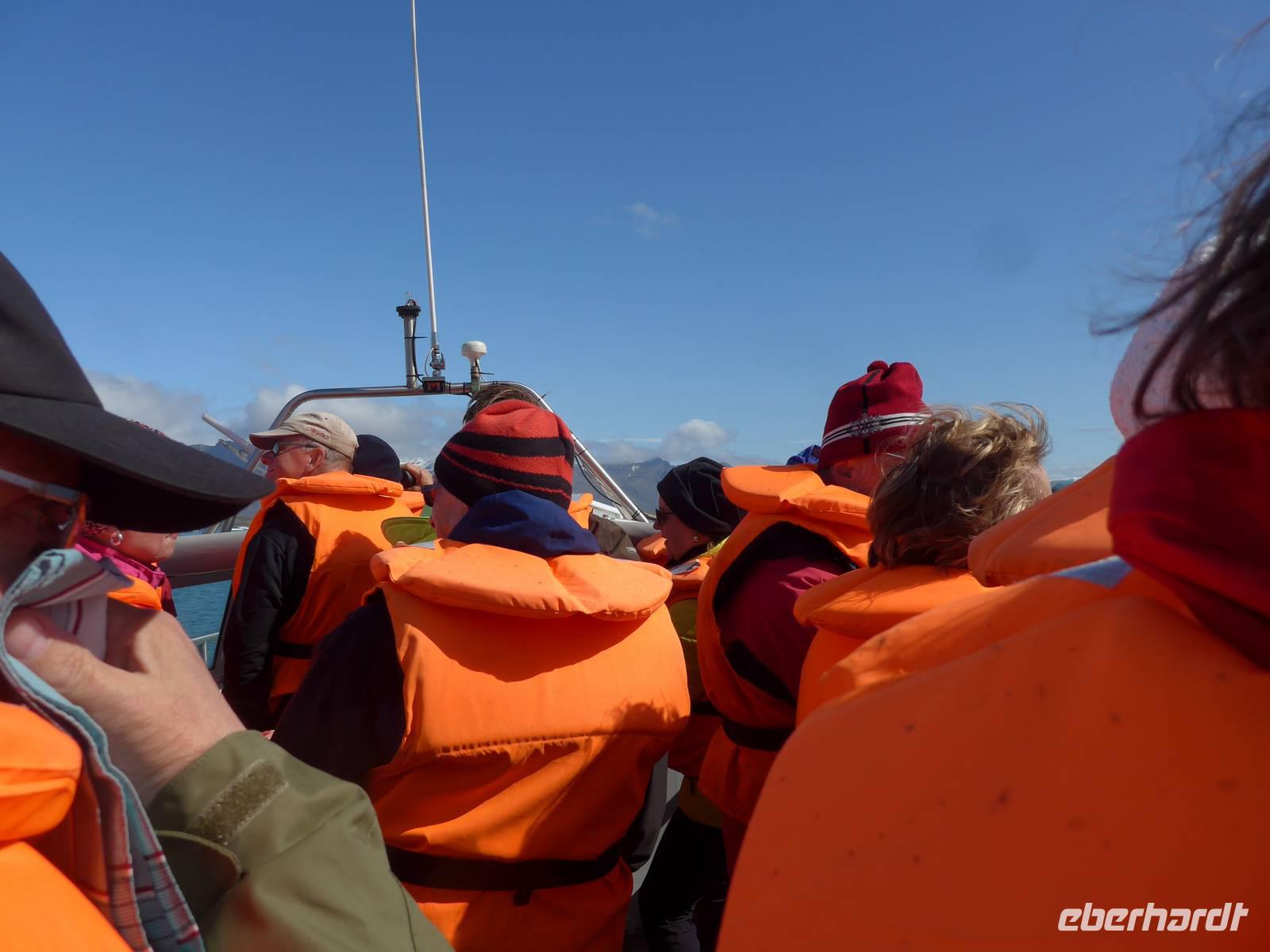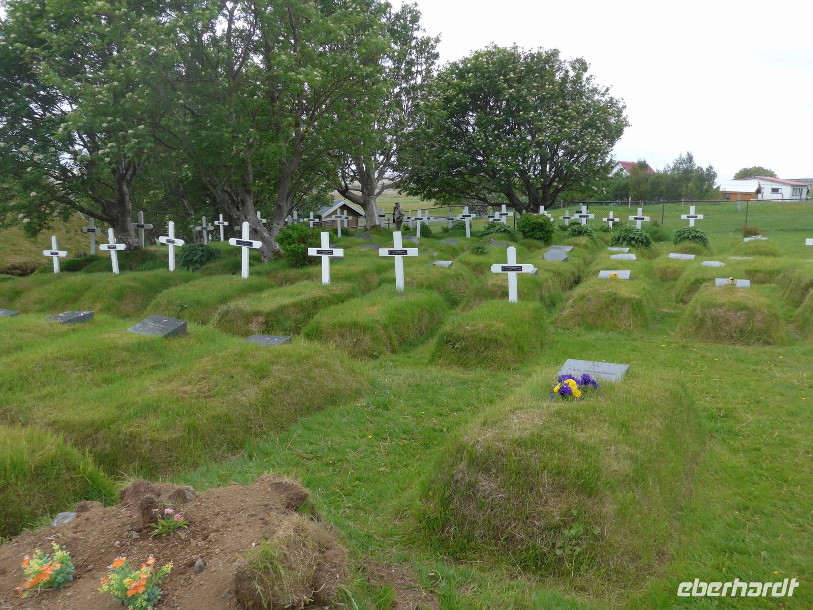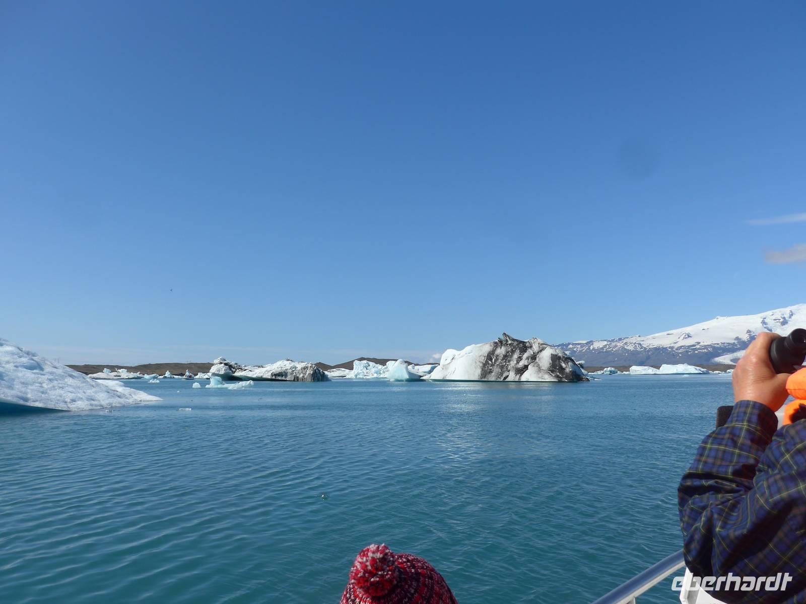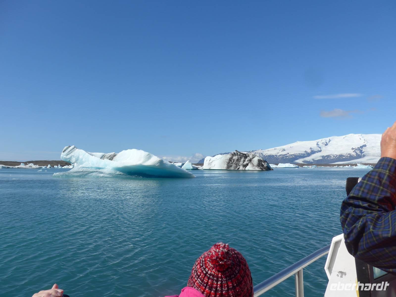 Die heutige Fahrtroute verlief zwischen der Küste und den zahlreichen Gletscherzungen und hielt wieder viele Überraschungen bereit. Der erste Halt war an der Gletscherlagune Jökulsarlon. Wir bestiegen ein Amphibienfahrzeug, legten die Rettungswesten an und erfuhren dann von einem Geologen der Uni München über die Entstehung der Lagune und die verschiedenen Eisarten. Den isländischen Brennevin probierten wir mit 1000 Jahre altem Eis, was der Bootsführer gebrochen hatte. Wir fuhren zwischen den Eisbergen hindurch und hatten vom Boot aus einen tollen Blick auf den Gletscher. Wieder an Land stiegen wir auf einen kleinen Hügel und sahen die Gletscherlagune nochmals von oben. Auf der Weiterfahrt kamen wir noch an einer neuen, kleineren Gletscherlagune vorbei, wo wir einen Fotostopp einlegten. Die von uns befahrene Ringstraße wurde 1974 fertig gestellt und brachte eine große Erleichterung vor allem im Süden. Noch 1914 lebten ca. 73 Prozent der Isländer auf dem Land in Grassodenhäusern und die meisten Kirchen waren Grassodenkirchen. Heute gibt es noch 6 davon und eine besuchten wir mit Aldis. Sie wußte um das Versteck des Schlüssels, schloß die Kirche auf und spielte zu unserer großen Überraschung 2 Psalmen auf dem Harmonium in der Grassodenkirche. Danach besuchten wir den alten Friedhof und Aldis erklärte uns die isländischen Namen anhand der Grabkreuze.