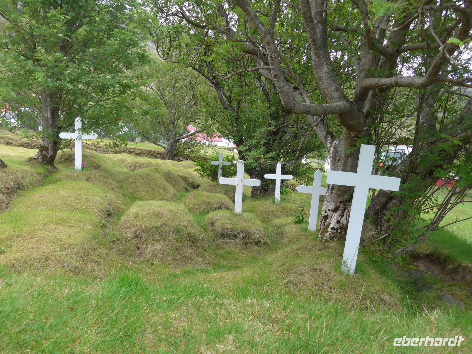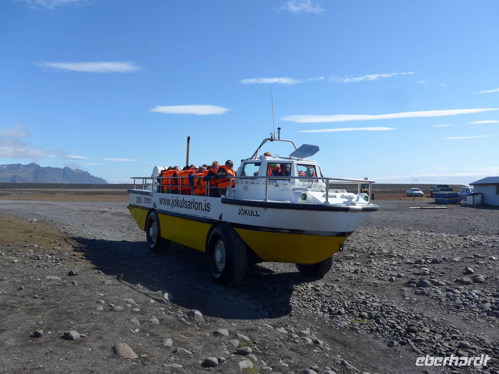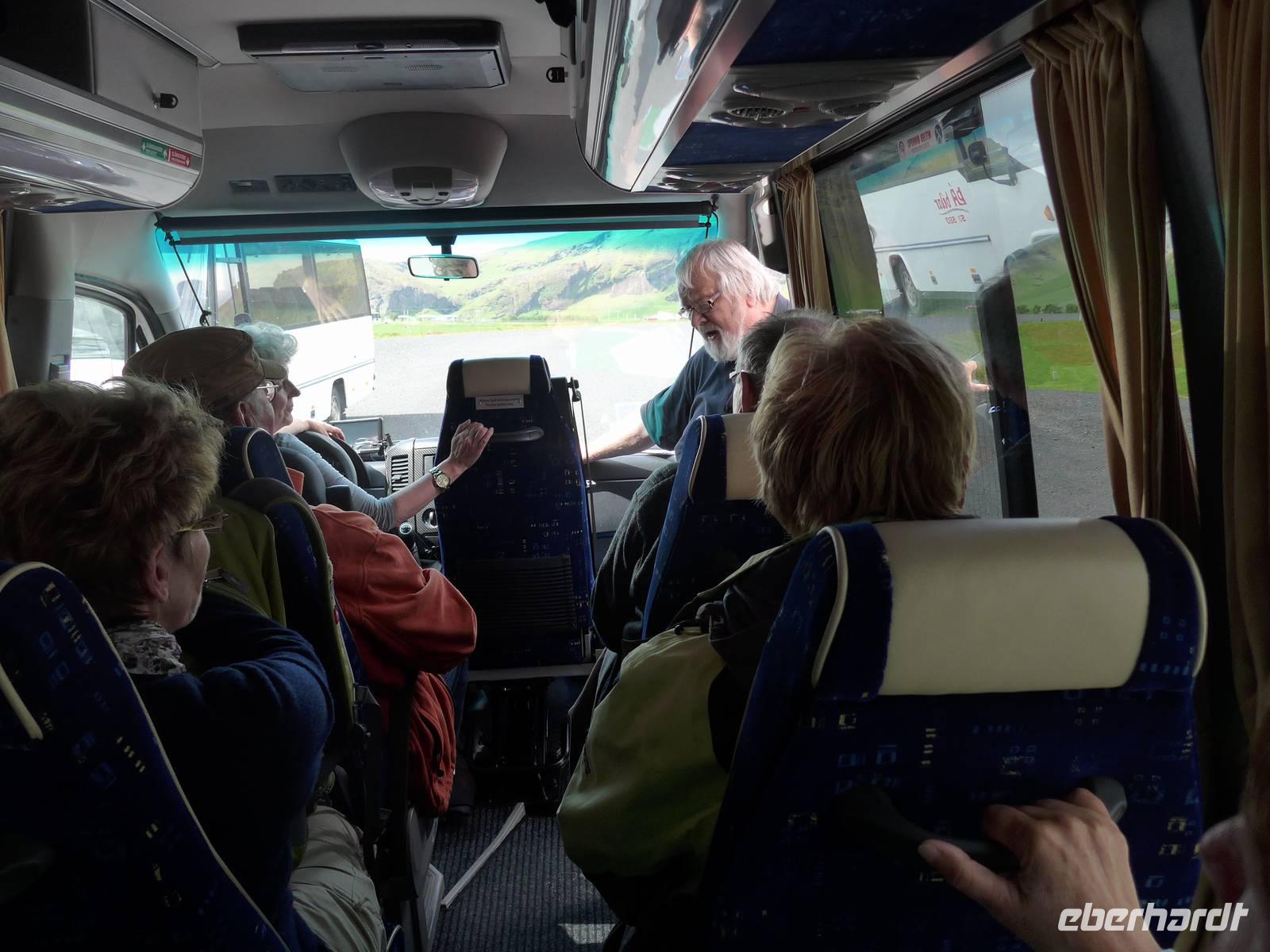 Die heutige Fahrtroute verlief zwischen der Küste und den zahlreichen Gletscherzungen und hielt wieder viele Überraschungen bereit. Der erste Halt war an der Gletscherlagune Jökulsarlon. Wir bestiegen ein Amphibienfahrzeug, legten die Rettungswesten an und erfuhren dann von einem Geologen der Uni München über die Entstehung der Lagune und die verschiedenen Eisarten. Den isländischen Brennevin probierten wir mit 1000 Jahre altem Eis, was der Bootsführer gebrochen hatte. Wir fuhren zwischen den Eisbergen hindurch und hatten vom Boot aus einen tollen Blick auf den Gletscher. Wieder an Land stiegen wir auf einen kleinen Hügel und sahen die Gletscherlagune nochmals von oben. Auf der Weiterfahrt kamen wir noch an einer neuen, kleineren Gletscherlagune vorbei, wo wir einen Fotostopp einlegten. Die von uns befahrene Ringstraße wurde 1974 fertig gestellt und brachte eine große Erleichterung vor allem im Süden. Noch 1914 lebten ca. 73 Prozent der Isländer auf dem Land in Grassodenhäusern und die meisten Kirchen waren Grassodenkirchen. Heute gibt es noch 6 davon und eine besuchten wir mit Aldis. Sie wußte um das Versteck des Schlüssels, schloß die Kirche auf und spielte zu unserer großen Überraschung 2 Psalmen auf dem Harmonium in der Grassodenkirche. Danach besuchten wir den alten Friedhof und Aldis erklärte uns die isländischen Namen anhand der Grabkreuze.