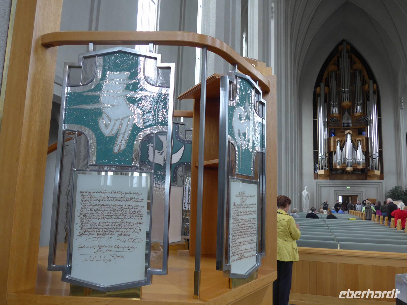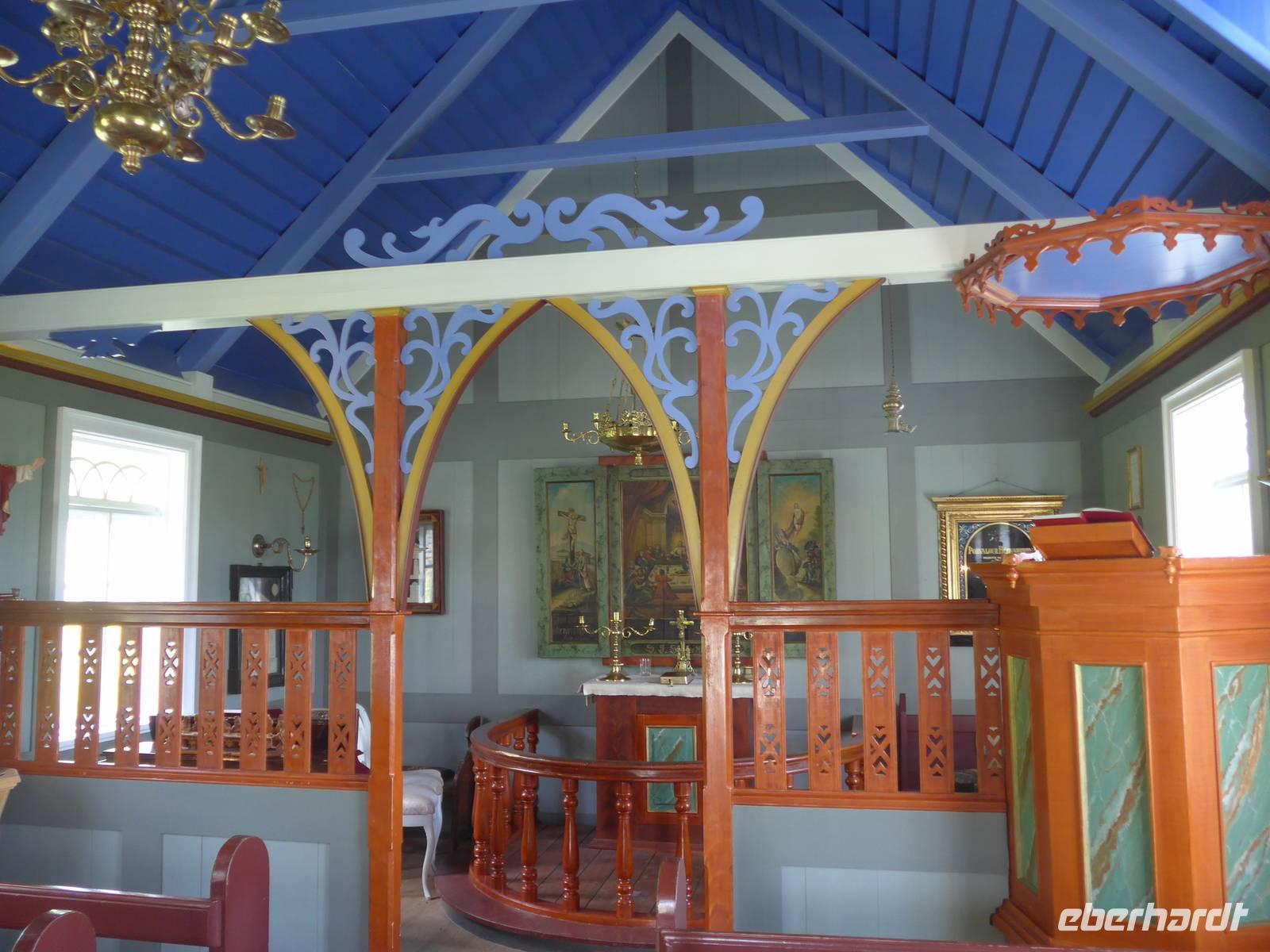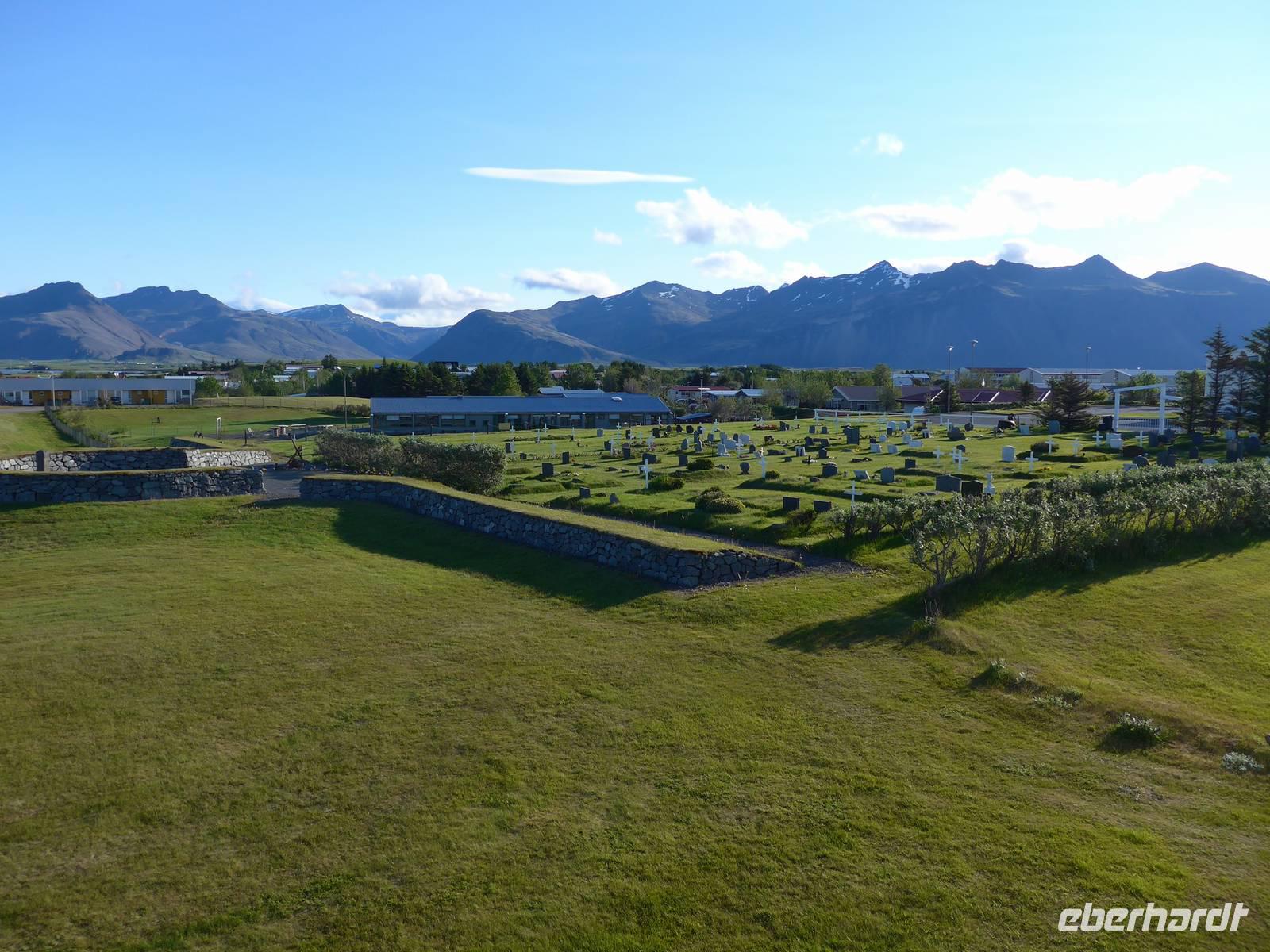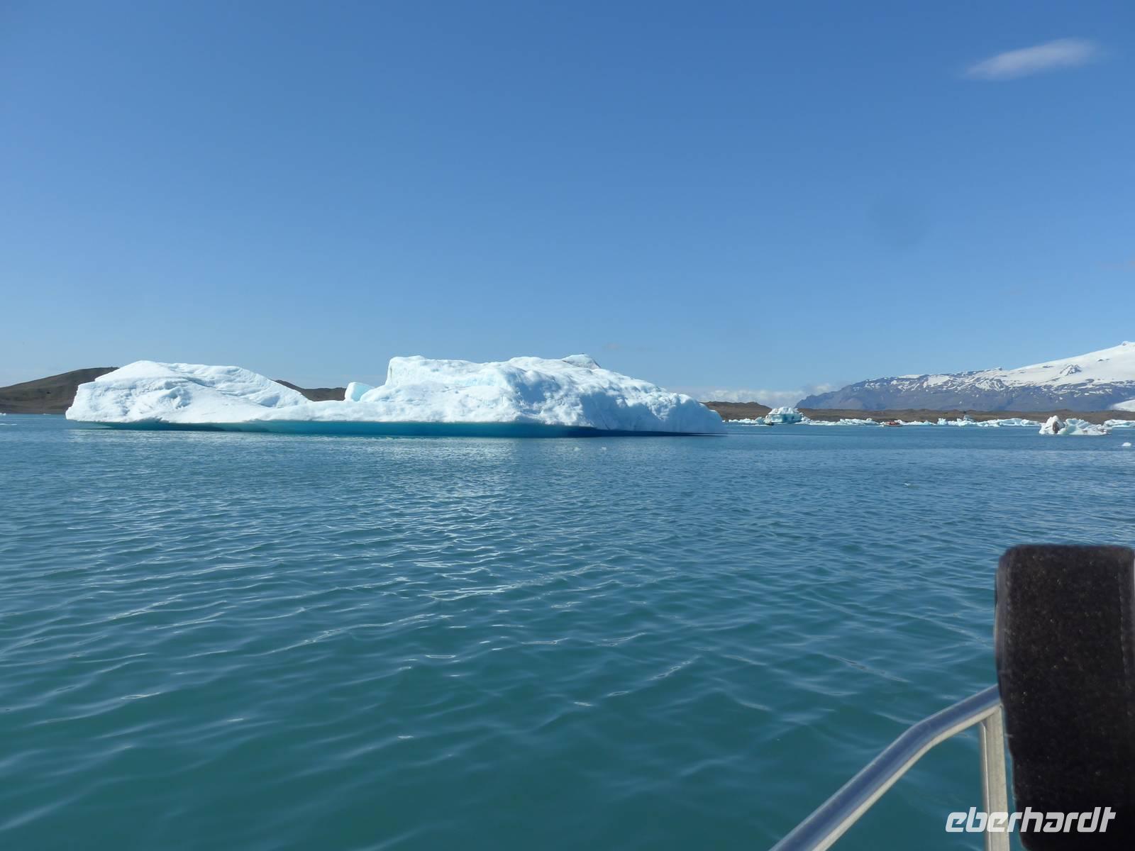 Die heutige Fahrtroute verlief zwischen der Küste und den zahlreichen Gletscherzungen und hielt wieder viele Überraschungen bereit. Der erste Halt war an der Gletscherlagune Jökulsarlon. Wir bestiegen ein Amphibienfahrzeug, legten die Rettungswesten an und erfuhren dann von einem Geologen der Uni München über die Entstehung der Lagune und die verschiedenen Eisarten. Den isländischen Brennevin probierten wir mit 1000 Jahre altem Eis, was der Bootsführer gebrochen hatte. Wir fuhren zwischen den Eisbergen hindurch und hatten vom Boot aus einen tollen Blick auf den Gletscher. Wieder an Land stiegen wir auf einen kleinen Hügel und sahen die Gletscherlagune nochmals von oben. Auf der Weiterfahrt kamen wir noch an einer neuen, kleineren Gletscherlagune vorbei, wo wir einen Fotostopp einlegten. Die von uns befahrene Ringstraße wurde 1974 fertig gestellt und brachte eine große Erleichterung vor allem im Süden. Noch 1914 lebten ca. 73 Prozent der Isländer auf dem Land in Grassodenhäusern und die meisten Kirchen waren Grassodenkirchen. Heute gibt es noch 6 davon und eine besuchten wir mit Aldis. Sie wußte um das Versteck des Schlüssels, schloß die Kirche auf und spielte zu unserer großen Überraschung 2 Psalmen auf dem Harmonium in der Grassodenkirche. Danach besuchten wir den alten Friedhof und Aldis erklärte uns die isländischen Namen anhand der Grabkreuze.