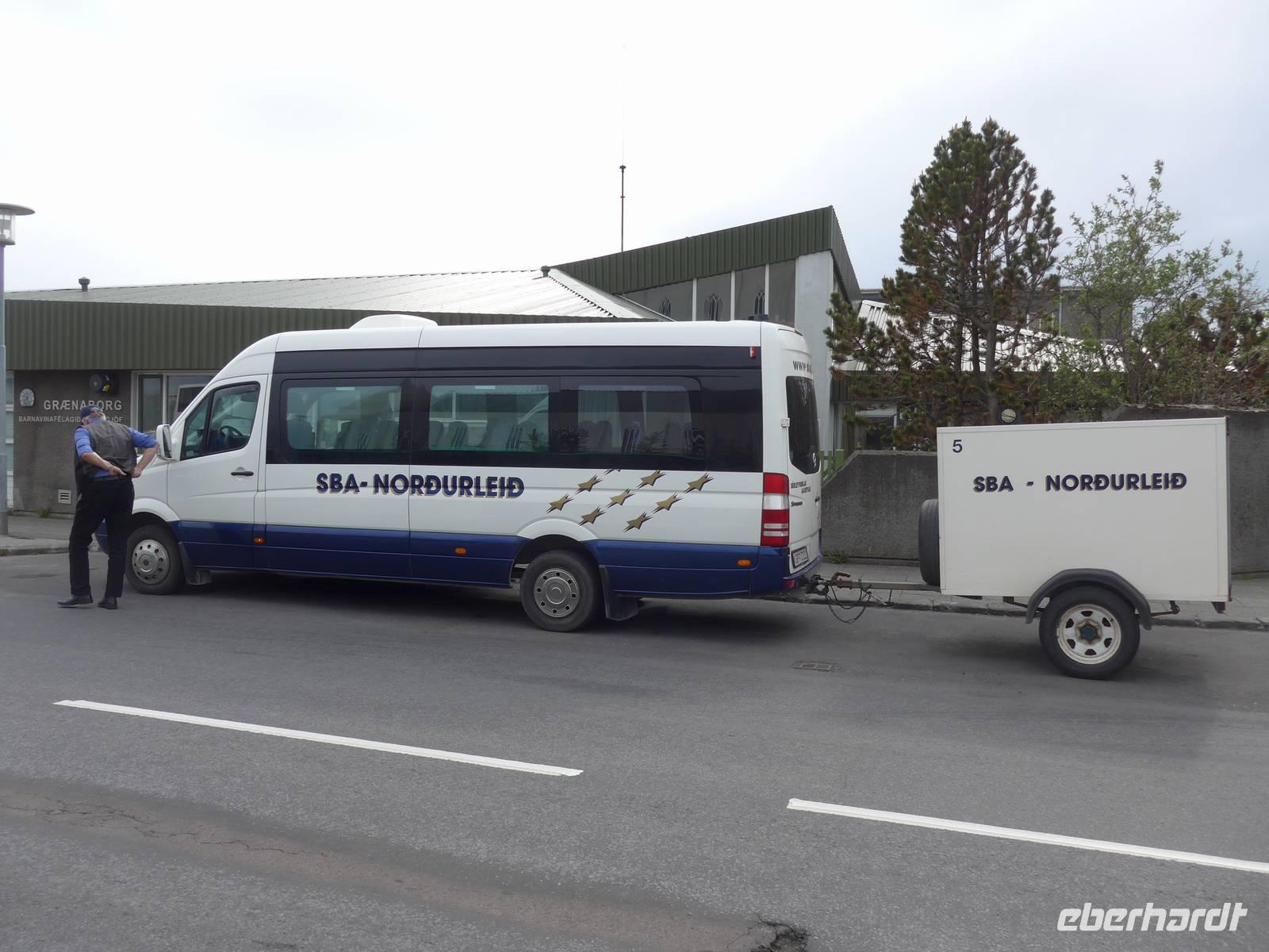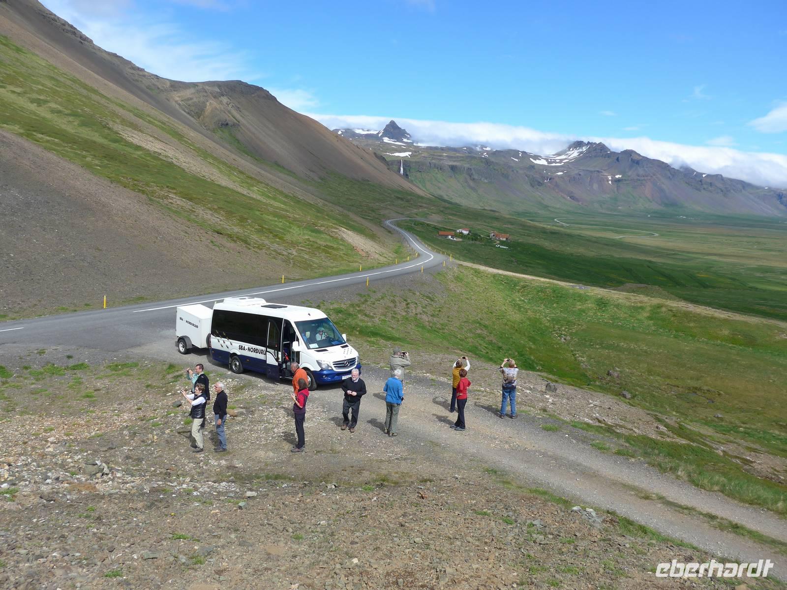Noch einmal genossen wir das tolle Frühstück im Hotel und dann hieß es Koffer laden im Anhänger unseres Kleinbusses und Abfahrt. Aldis begrüßte uns mit "Godan daginn" und von nunan gab es auch immer wieder Sprachunterricht in isländisch mit mehr und weniger Erfolg bei den Gästen. Da es an den nächsten beiden Tagen keine Möglichkeiten für eine Mittagsverpflegung gab, besuchten wir einen Supermarkt und kauften Picknick für 2 Tage ein. Aldis gab uns dabei wichtige Hinweise und wir entdeckten den guten Skyr, eine Mischung aus Yoghurt und Quark zum Trinken oder zum Löffeln. Unsere Fahrtroute führte an der Küste entlang und dann durch den Walfjordtunnel. Aldis berichtete ausführlich über den Walfang in Island früher und heute. In Borganes machten wir eine WC-Pause. Auf der Weiterfahrt wurde das Versicherungssystem Islands, Arztkosten, Friseurkosten und das Thema Wohnungen besprochen. Unsere Picknick-Pause verbrachten wir an einem einsamen Strand, wo wir viele Vögel beobachten konnten - Berkasine, Küstenseeschwalbe, Regenbrachvogel und Eiderenten zeigte uns Aldis. Das Massiv des Snaefellsjökull sahen wir im Sonnenschein immer vor uns und auf der Straße waren wir fast allein.