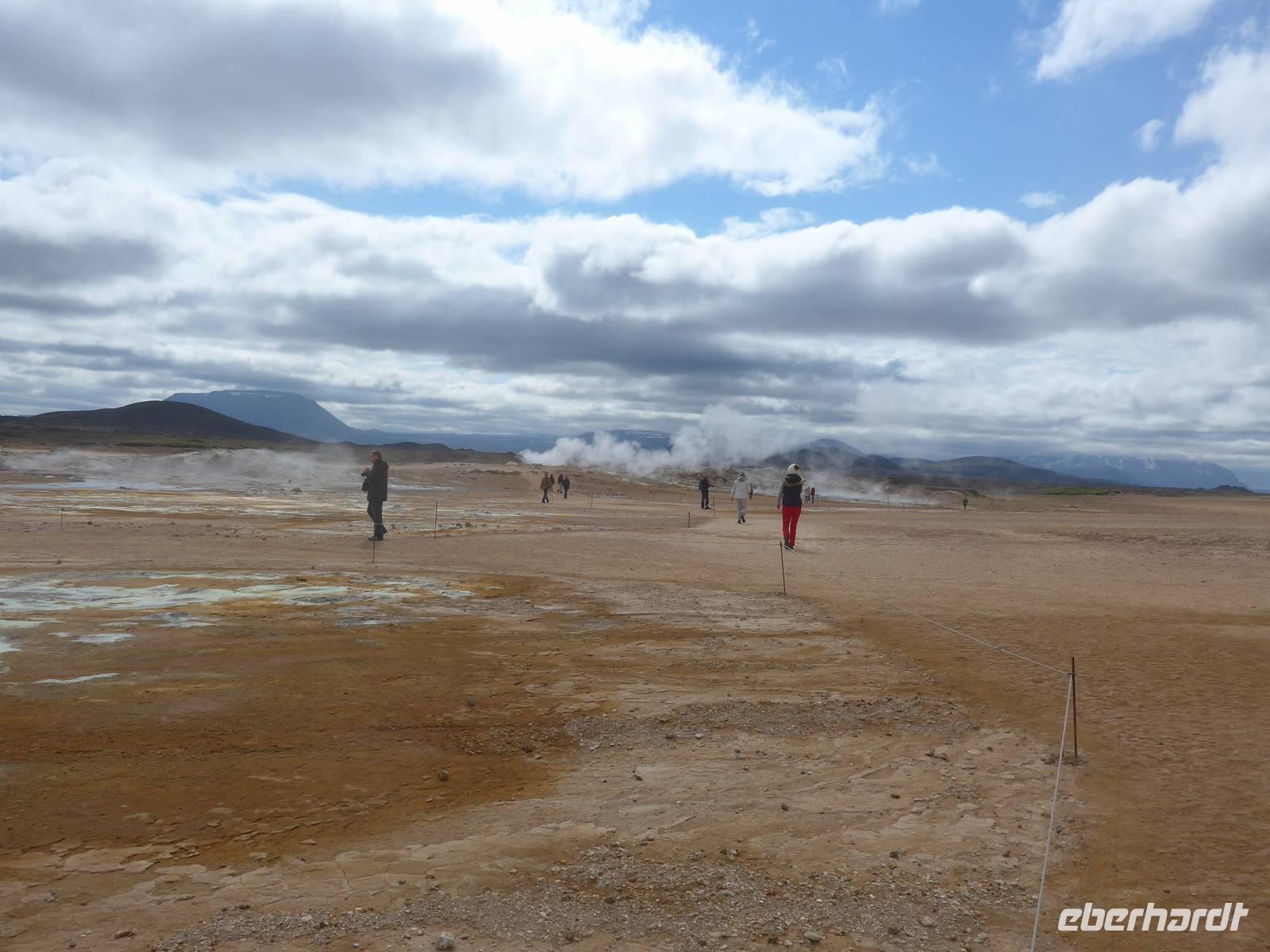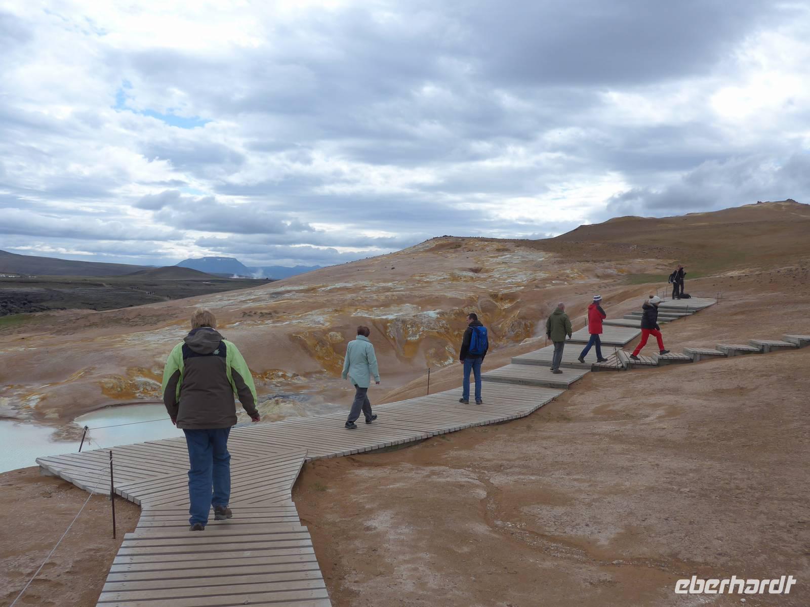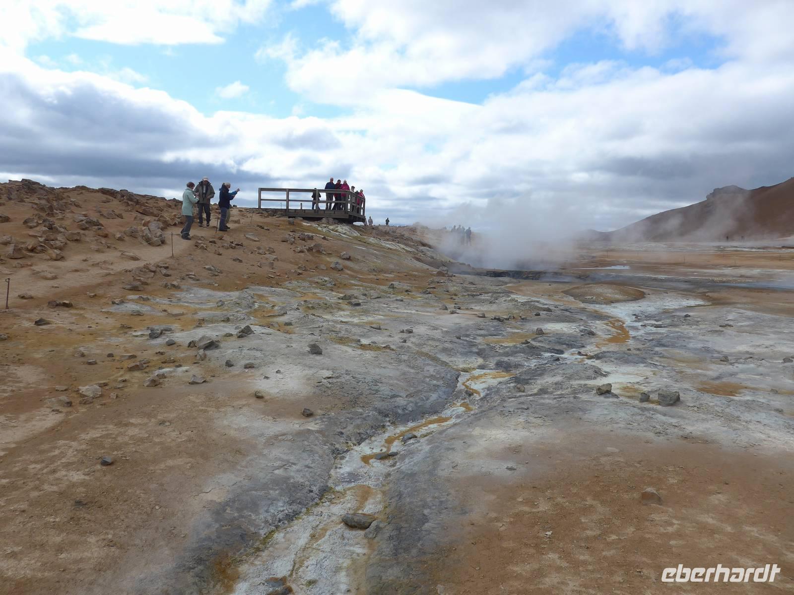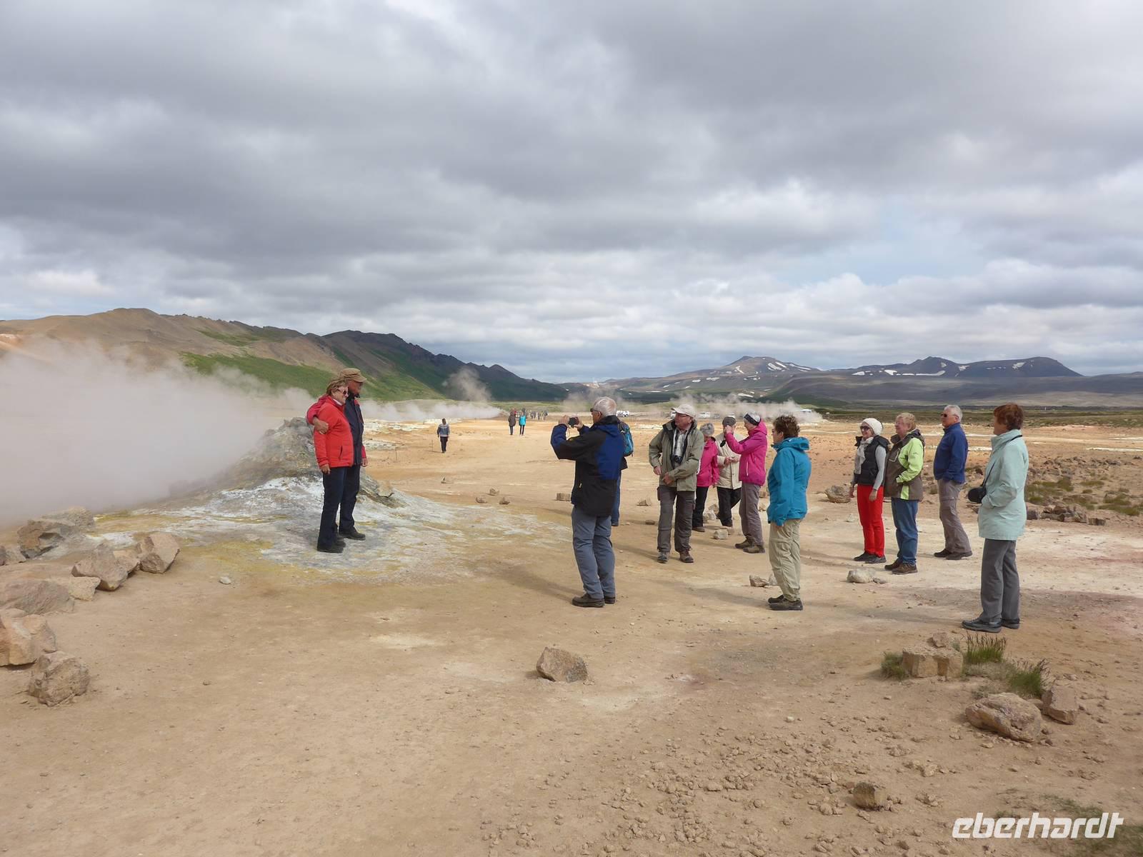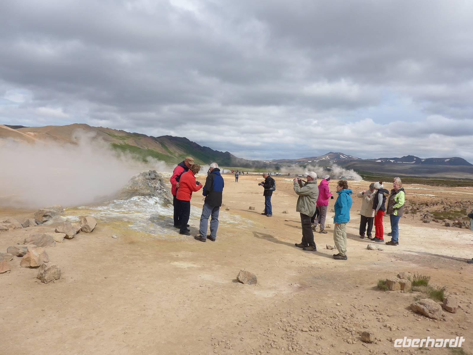 Der Nebel lag noch am Fjord in Akureyri. Aber bereits oben am Godafoss waren wir wieder in der Sonne. Im Jahre 1000, als das Christentum angenommen wurde, warf der hier ansässige Gode seine alten Götterstatuen in die tosenden Fluten des Wasserfalls und so entstand der Name Götterwasserfall. Der Wasserfall, ist nicht sehr hoch, besticht aber durch seine Wassermassen, die in Hufeisenform herab stürzen. Am Mückensee machten wir dann eine WC Pause und wanderten zu den Pseudokratern, begleitet von vielen Mücken, die aber nicht stachen. Das nächste Ziel war das Hochtemperaturgebiet Namaskard mit vielen Schlammtöpfen und Bohrlöchern, wo Dampf entwich. Das Gebiet war gut gesichert, so daß wir ohne Probleme hindurch spazieren konnten. Auf dem Weg zum Vulkan Krafla kamen wir am Geothermal-Kraftwerk vorbei, wo Dampf in elektrischen Strom umgewandelt wird. Am Krafla-Parkplatz verließen wir unseren Bus und wanderten an kleineren Schlammtöpfen vorbei den Hügel hinauf, wo verschieden farbige Lava zu bestaunen war. Danach machten wir Mittagspause am Informationszentrum.