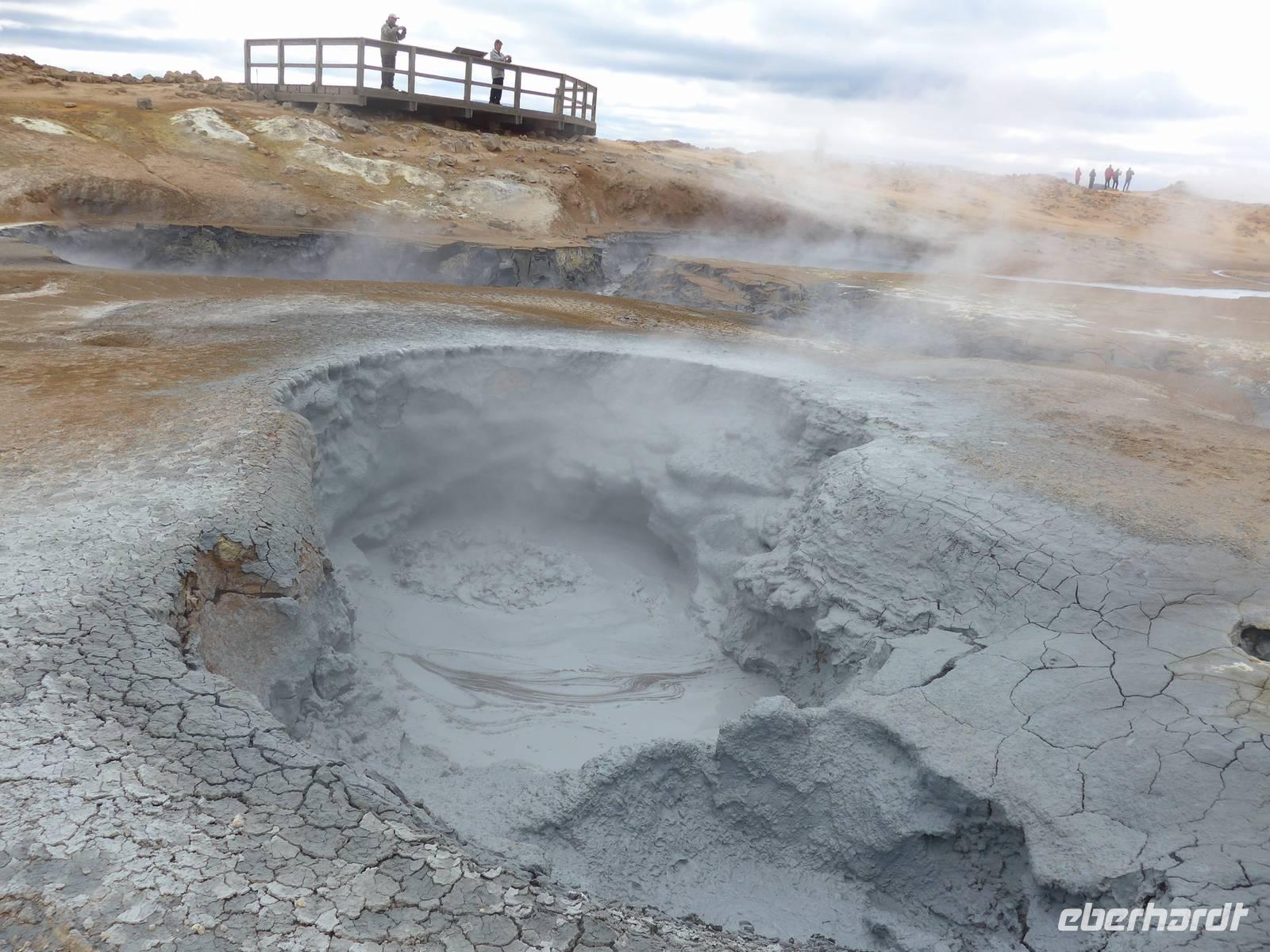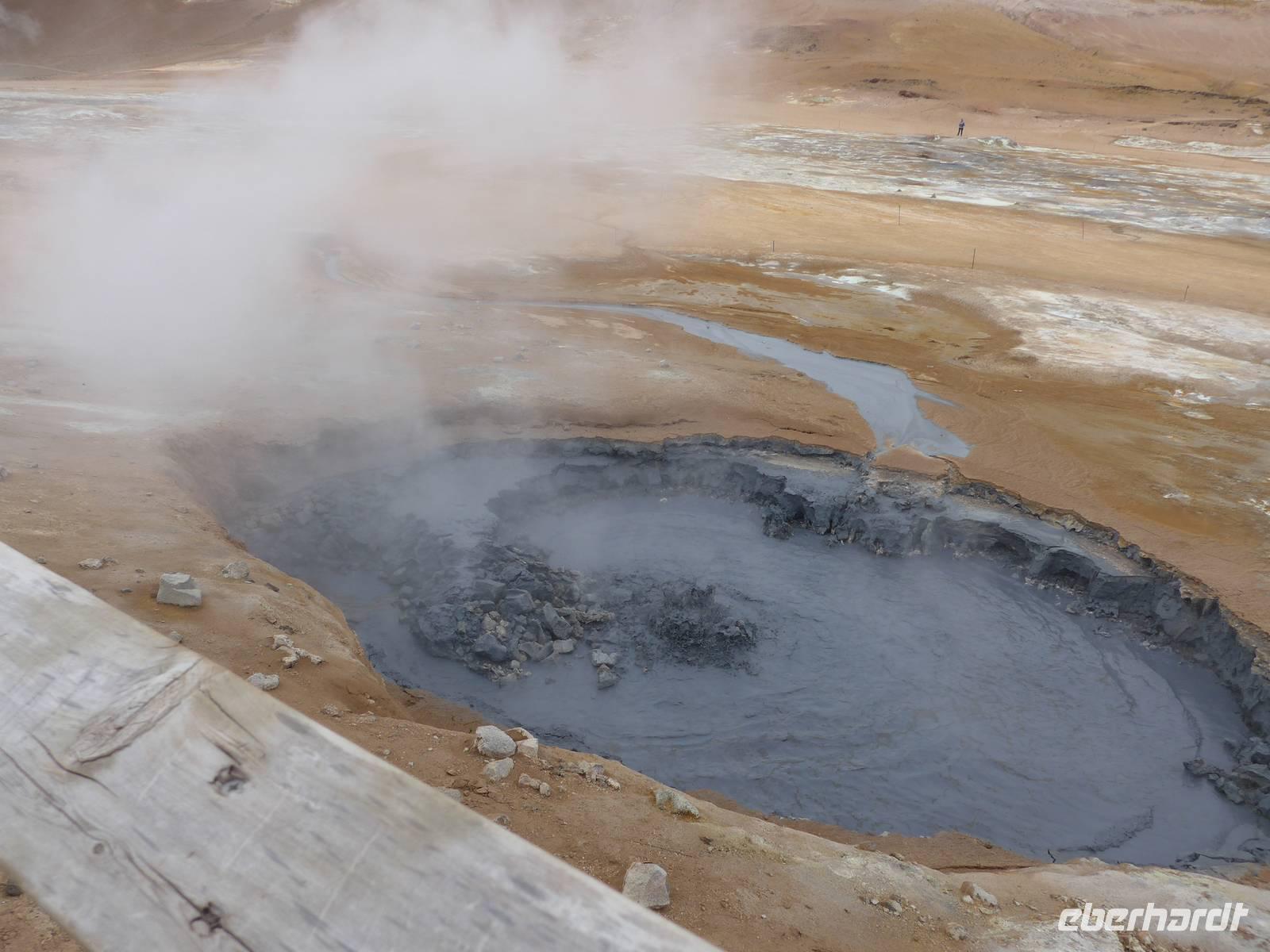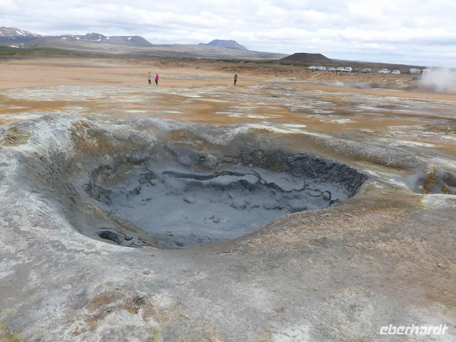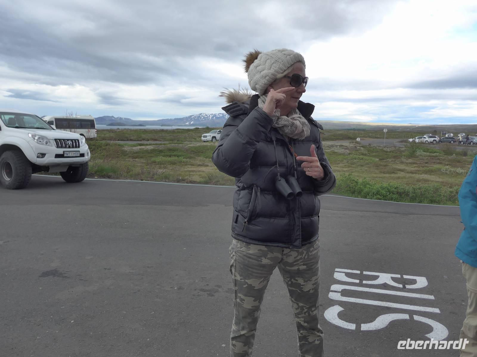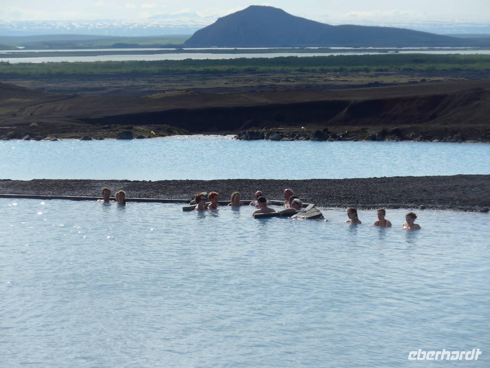 Der Nebel lag noch am Fjord in Akureyri. Aber bereits oben am Godafoss waren wir wieder in der Sonne. Im Jahre 1000, als das Christentum angenommen wurde, warf der hier ansässige Gode seine alten Götterstatuen in die tosenden Fluten des Wasserfalls und so entstand der Name Götterwasserfall. Der Wasserfall, ist nicht sehr hoch, besticht aber durch seine Wassermassen, die in Hufeisenform herab stürzen. Am Mückensee machten wir dann eine WC Pause und wanderten zu den Pseudokratern, begleitet von vielen Mücken, die aber nicht stachen. Das nächste Ziel war das Hochtemperaturgebiet Namaskard mit vielen Schlammtöpfen und Bohrlöchern, wo Dampf entwich. Das Gebiet war gut gesichert, so daß wir ohne Probleme hindurch spazieren konnten. Auf dem Weg zum Vulkan Krafla kamen wir am Geothermal-Kraftwerk vorbei, wo Dampf in elektrischen Strom umgewandelt wird. Am Krafla-Parkplatz verließen wir unseren Bus und wanderten an kleineren Schlammtöpfen vorbei den Hügel hinauf, wo verschieden farbige Lava zu bestaunen war. Danach machten wir Mittagspause am Informationszentrum.