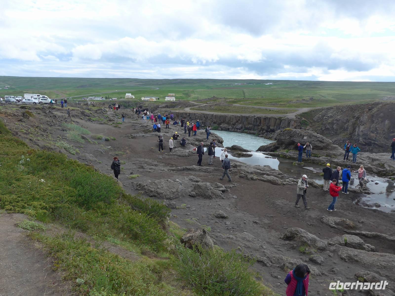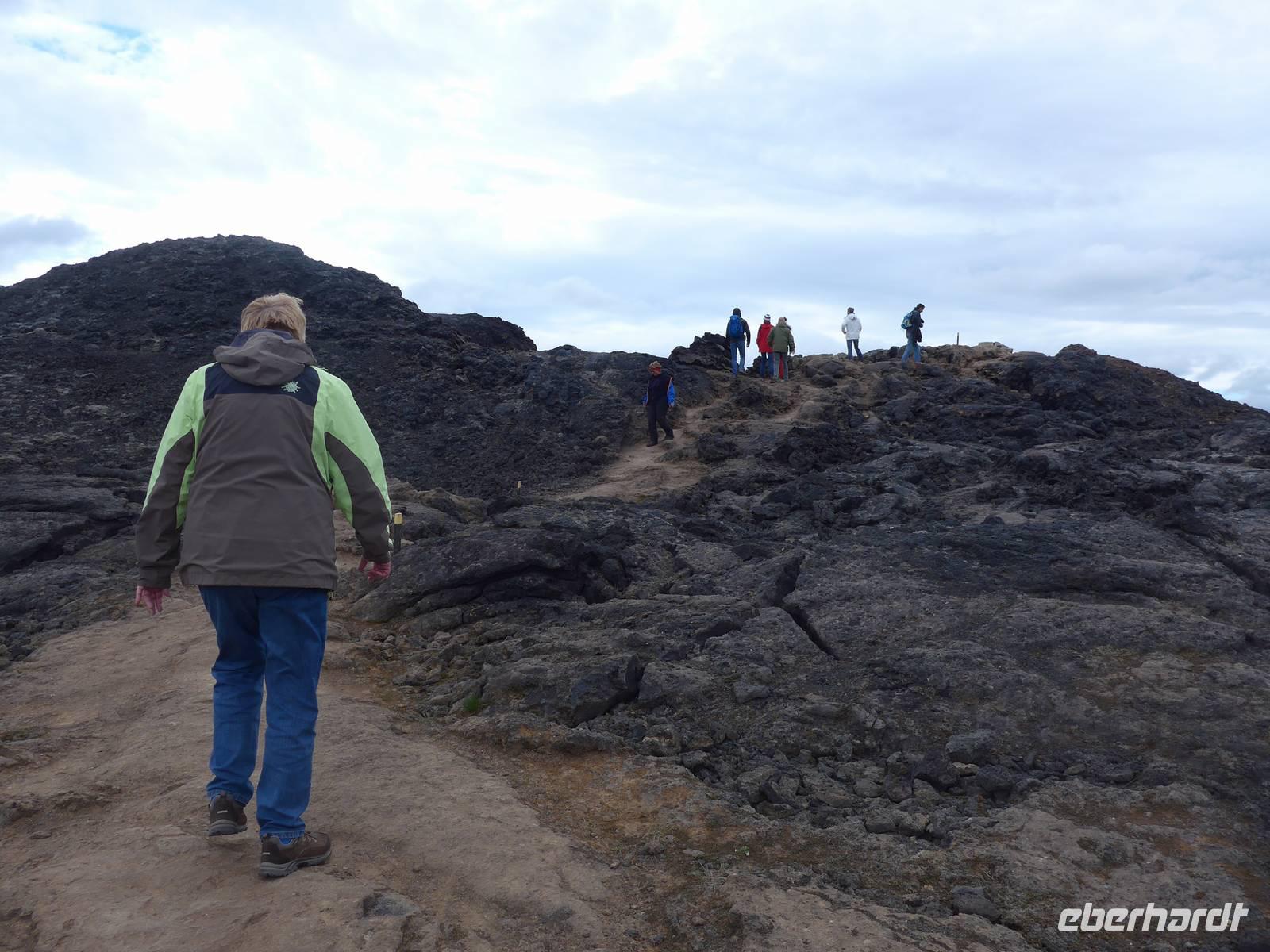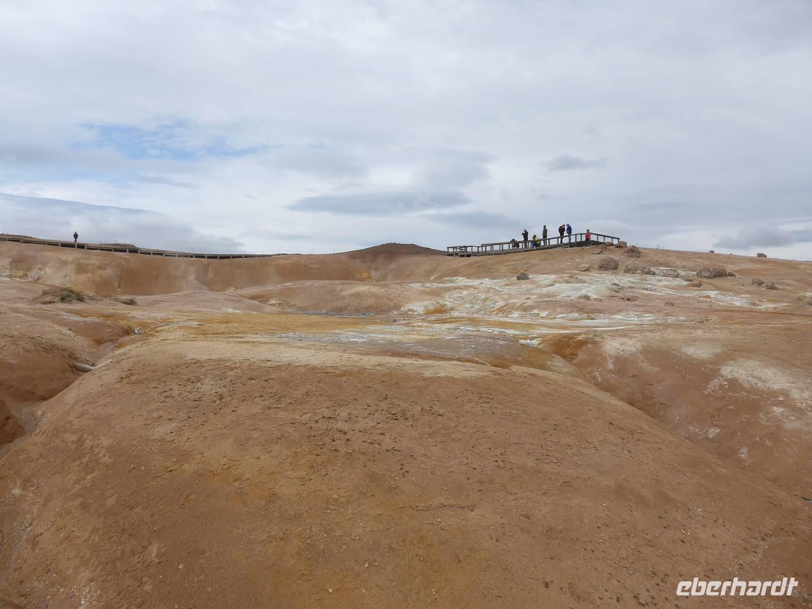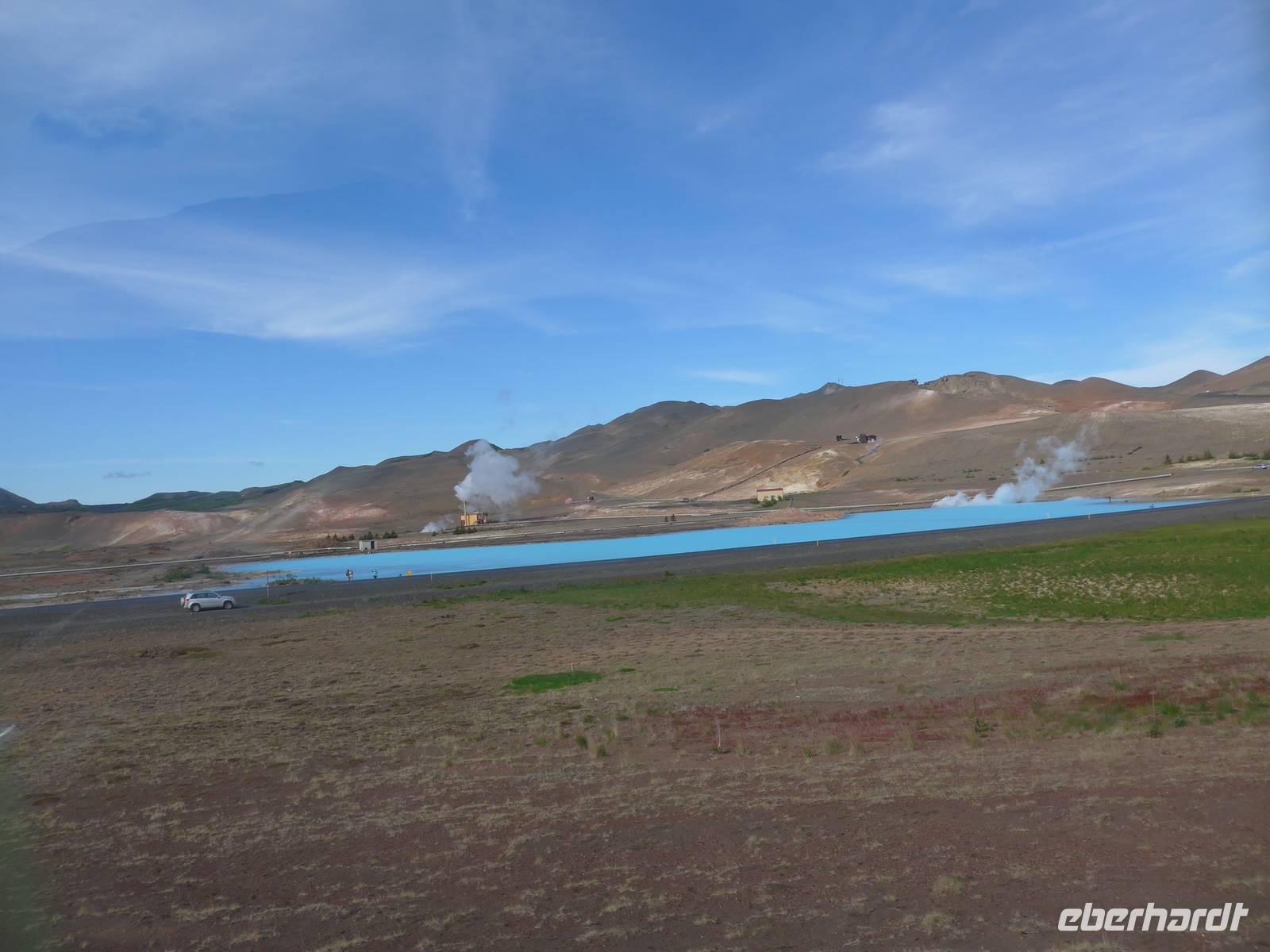Der Nebel lag noch am Fjord in Akureyri. Aber bereits oben am Godafoss waren wir wieder in der Sonne. Im Jahre 1000, als das Christentum angenommen wurde, warf der hier ansässige Gode seine alten Götterstatuen in die tosenden Fluten des Wasserfalls und so entstand der Name Götterwasserfall. Der Wasserfall, ist nicht sehr hoch, besticht aber durch seine Wassermassen, die in Hufeisenform herab stürzen. Am Mückensee machten wir dann eine WC Pause und wanderten zu den Pseudokratern, begleitet von vielen Mücken, die aber nicht stachen. Das nächste Ziel war das Hochtemperaturgebiet Namaskard mit vielen Schlammtöpfen und Bohrlöchern, wo Dampf entwich. Das Gebiet war gut gesichert, so daß wir ohne Probleme hindurch spazieren konnten. Auf dem Weg zum Vulkan Krafla kamen wir am Geothermal-Kraftwerk vorbei, wo Dampf in elektrischen Strom umgewandelt wird. Am Krafla-Parkplatz verließen wir unseren Bus und wanderten an kleineren Schlammtöpfen vorbei den Hügel hinauf, wo verschieden farbige Lava zu bestaunen war. Danach machten wir Mittagspause am Informationszentrum.