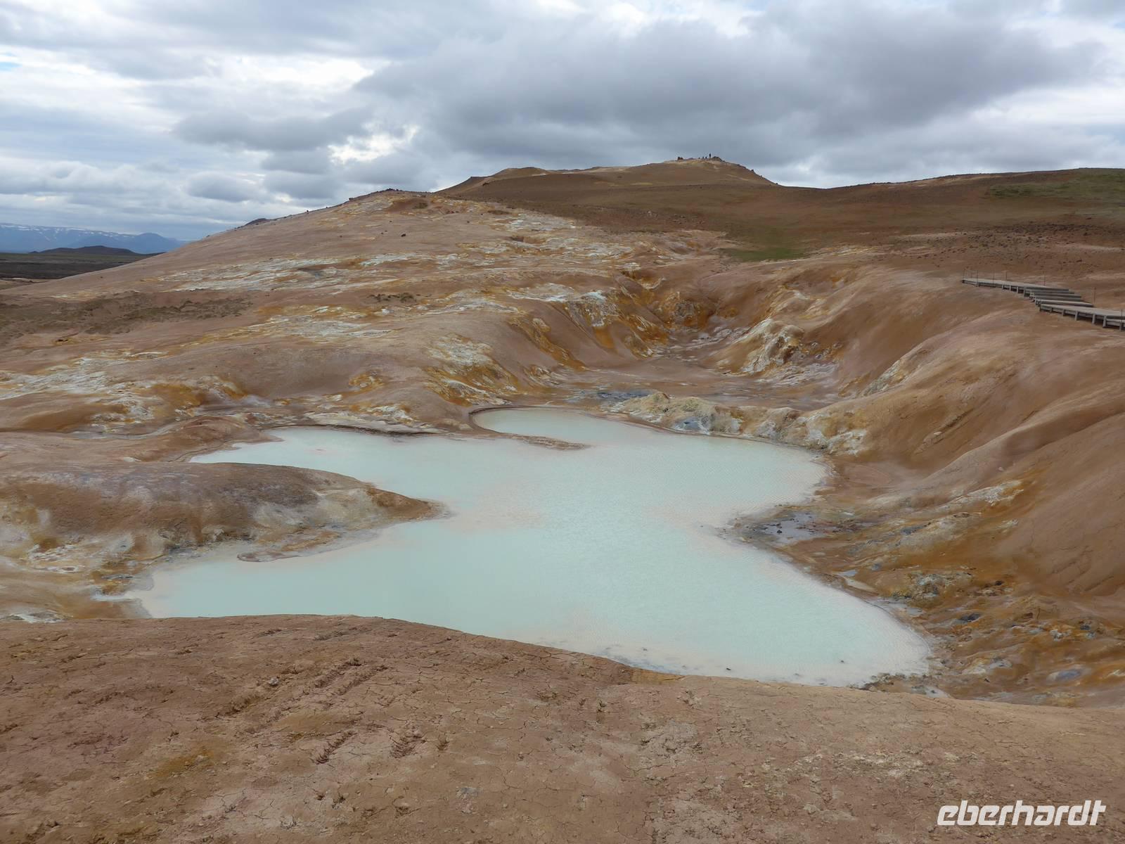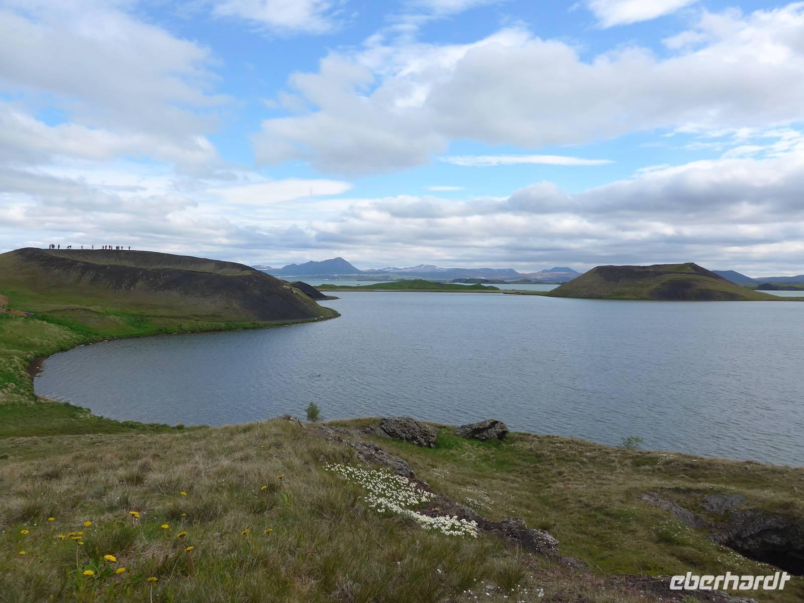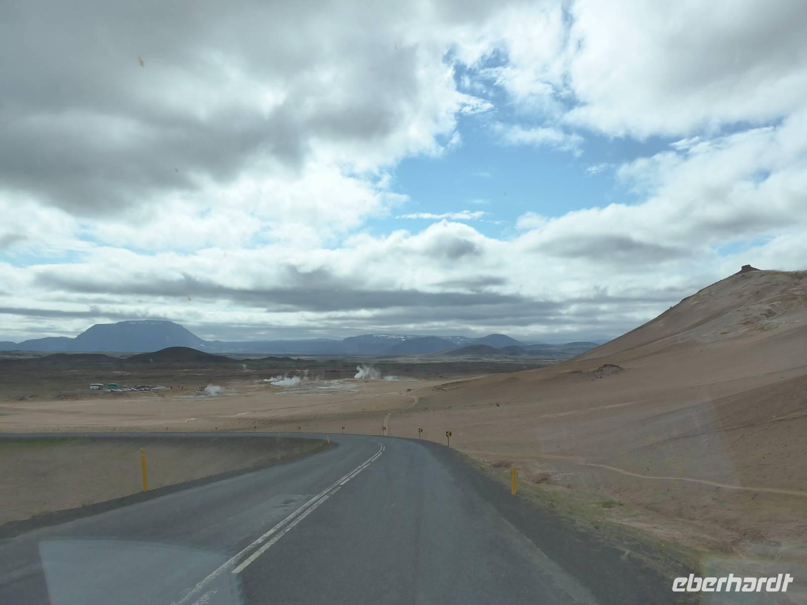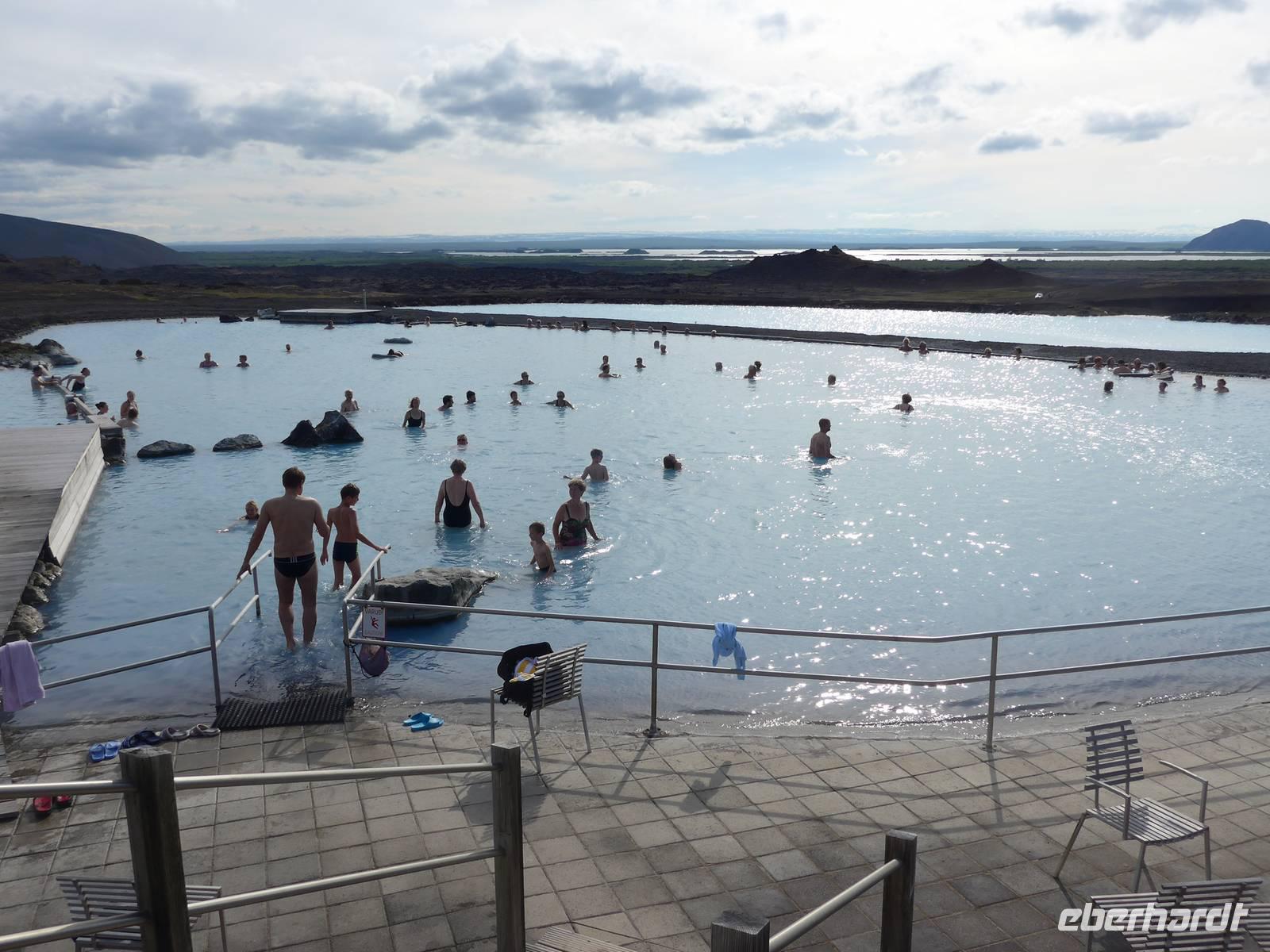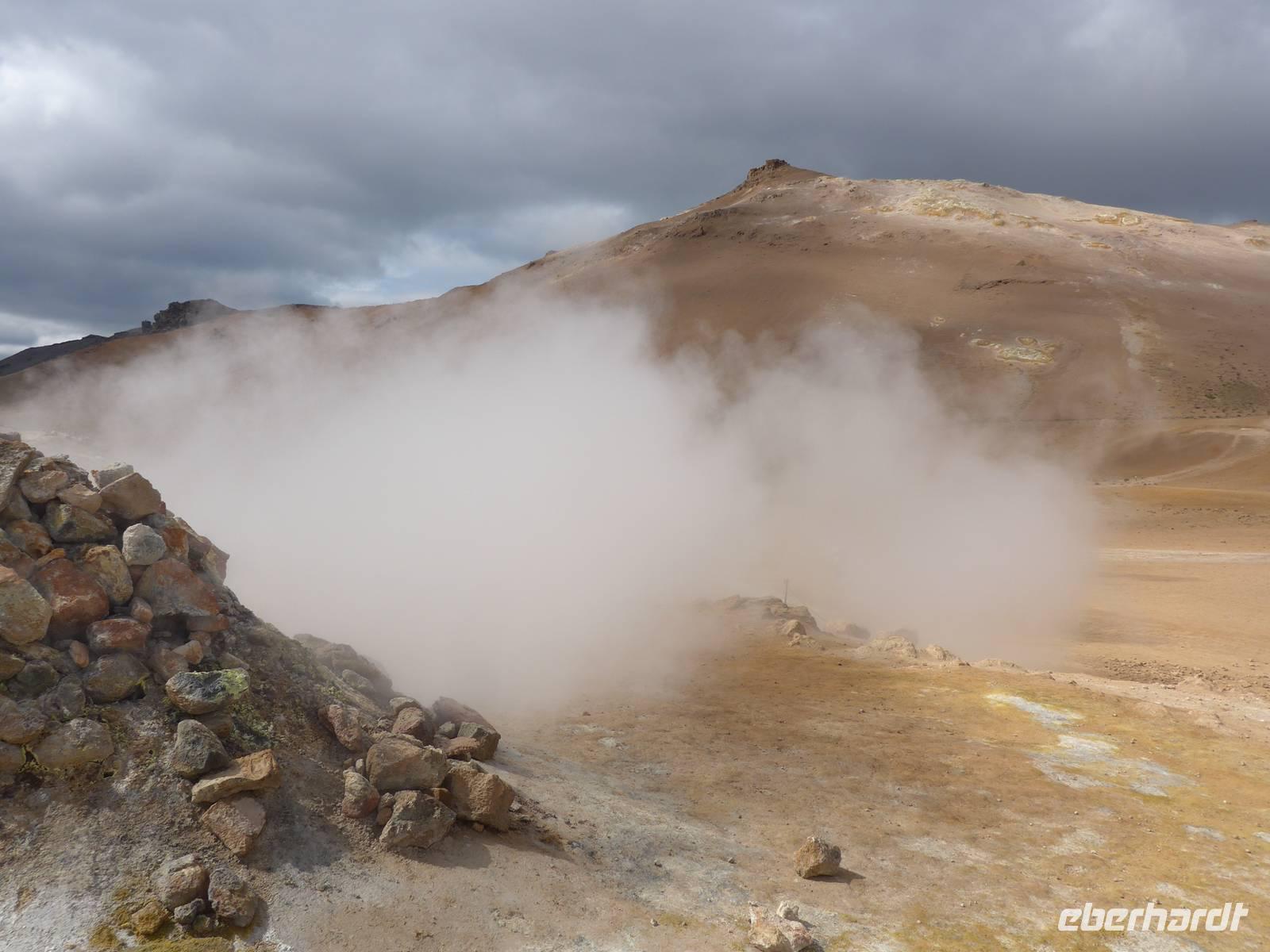 Der Nebel lag noch am Fjord in Akureyri. Aber bereits oben am Godafoss waren wir wieder in der Sonne. Im Jahre 1000, als das Christentum angenommen wurde, warf der hier ansässige Gode seine alten Götterstatuen in die tosenden Fluten des Wasserfalls und so entstand der Name Götterwasserfall. Der Wasserfall, ist nicht sehr hoch, besticht aber durch seine Wassermassen, die in Hufeisenform herab stürzen. Am Mückensee machten wir dann eine WC Pause und wanderten zu den Pseudokratern, begleitet von vielen Mücken, die aber nicht stachen. Das nächste Ziel war das Hochtemperaturgebiet Namaskard mit vielen Schlammtöpfen und Bohrlöchern, wo Dampf entwich. Das Gebiet war gut gesichert, so daß wir ohne Probleme hindurch spazieren konnten. Auf dem Weg zum Vulkan Krafla kamen wir am Geothermal-Kraftwerk vorbei, wo Dampf in elektrischen Strom umgewandelt wird. Am Krafla-Parkplatz verließen wir unseren Bus und wanderten an kleineren Schlammtöpfen vorbei den Hügel hinauf, wo verschieden farbige Lava zu bestaunen war. Danach machten wir Mittagspause am Informationszentrum.