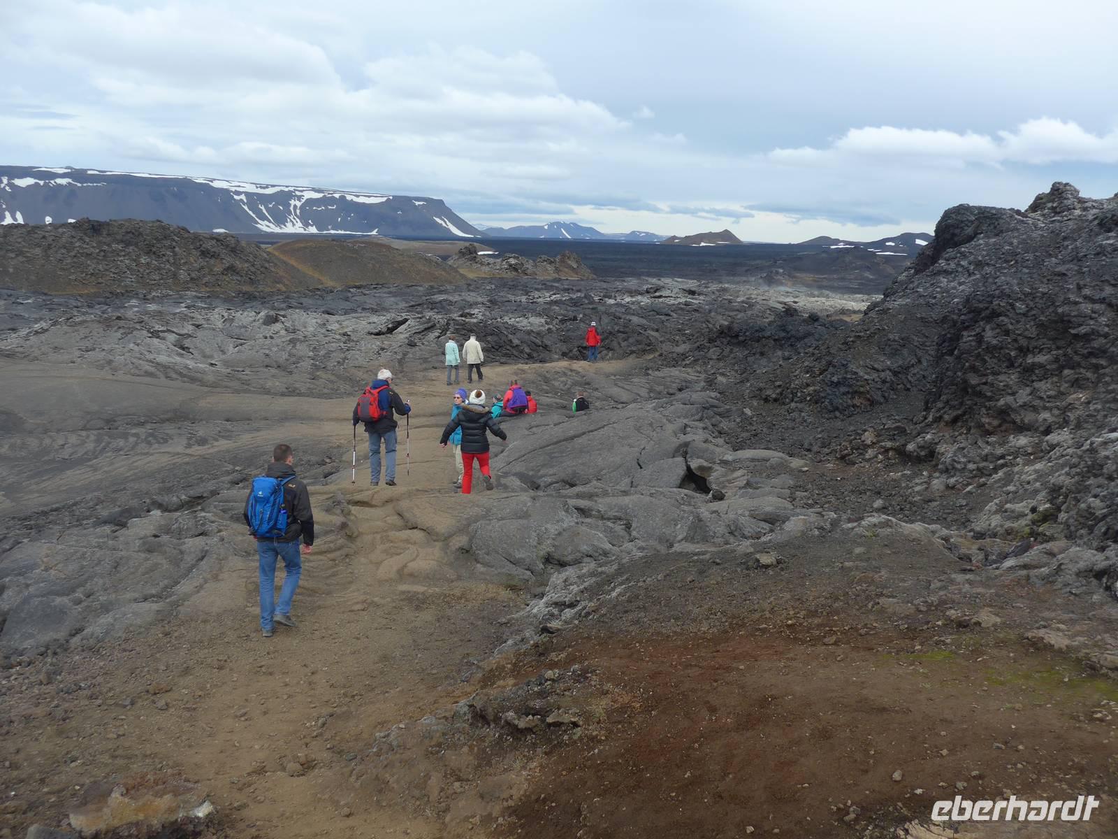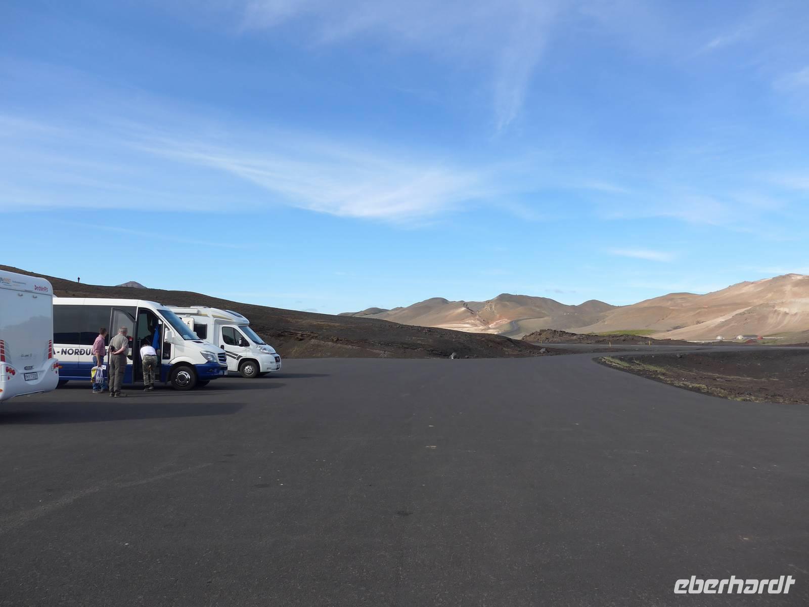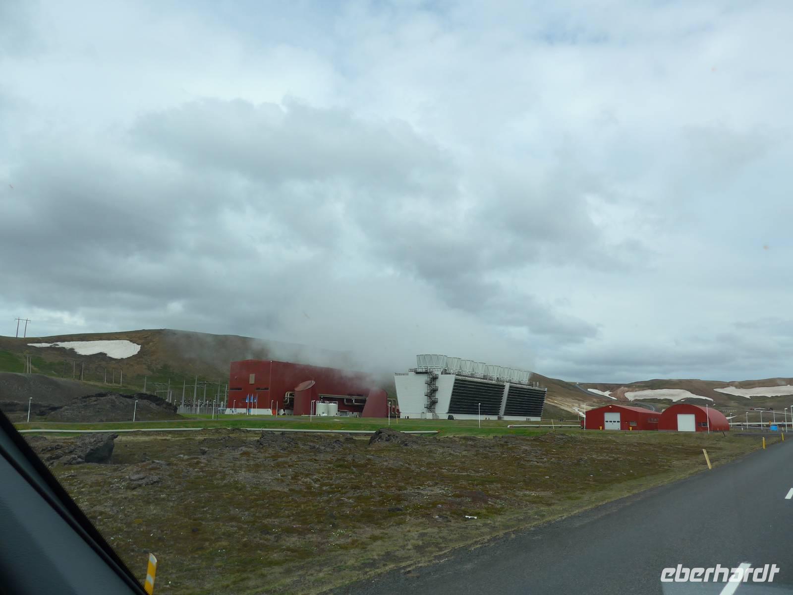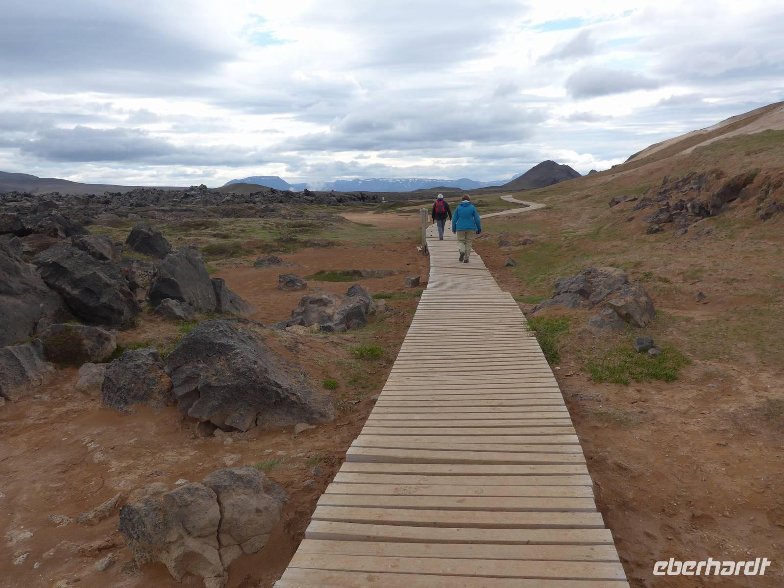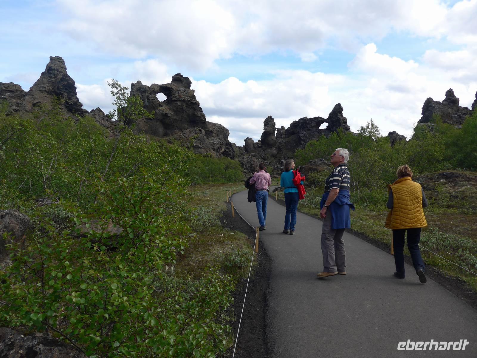 Der Nebel lag noch am Fjord in Akureyri. Aber bereits oben am Godafoss waren wir wieder in der Sonne. Im Jahre 1000, als das Christentum angenommen wurde, warf der hier ansässige Gode seine alten Götterstatuen in die tosenden Fluten des Wasserfalls und so entstand der Name Götterwasserfall. Der Wasserfall, ist nicht sehr hoch, besticht aber durch seine Wassermassen, die in Hufeisenform herab stürzen. Am Mückensee machten wir dann eine WC Pause und wanderten zu den Pseudokratern, begleitet von vielen Mücken, die aber nicht stachen. Das nächste Ziel war das Hochtemperaturgebiet Namaskard mit vielen Schlammtöpfen und Bohrlöchern, wo Dampf entwich. Das Gebiet war gut gesichert, so daß wir ohne Probleme hindurch spazieren konnten. Auf dem Weg zum Vulkan Krafla kamen wir am Geothermal-Kraftwerk vorbei, wo Dampf in elektrischen Strom umgewandelt wird. Am Krafla-Parkplatz verließen wir unseren Bus und wanderten an kleineren Schlammtöpfen vorbei den Hügel hinauf, wo verschieden farbige Lava zu bestaunen war. Danach machten wir Mittagspause am Informationszentrum.