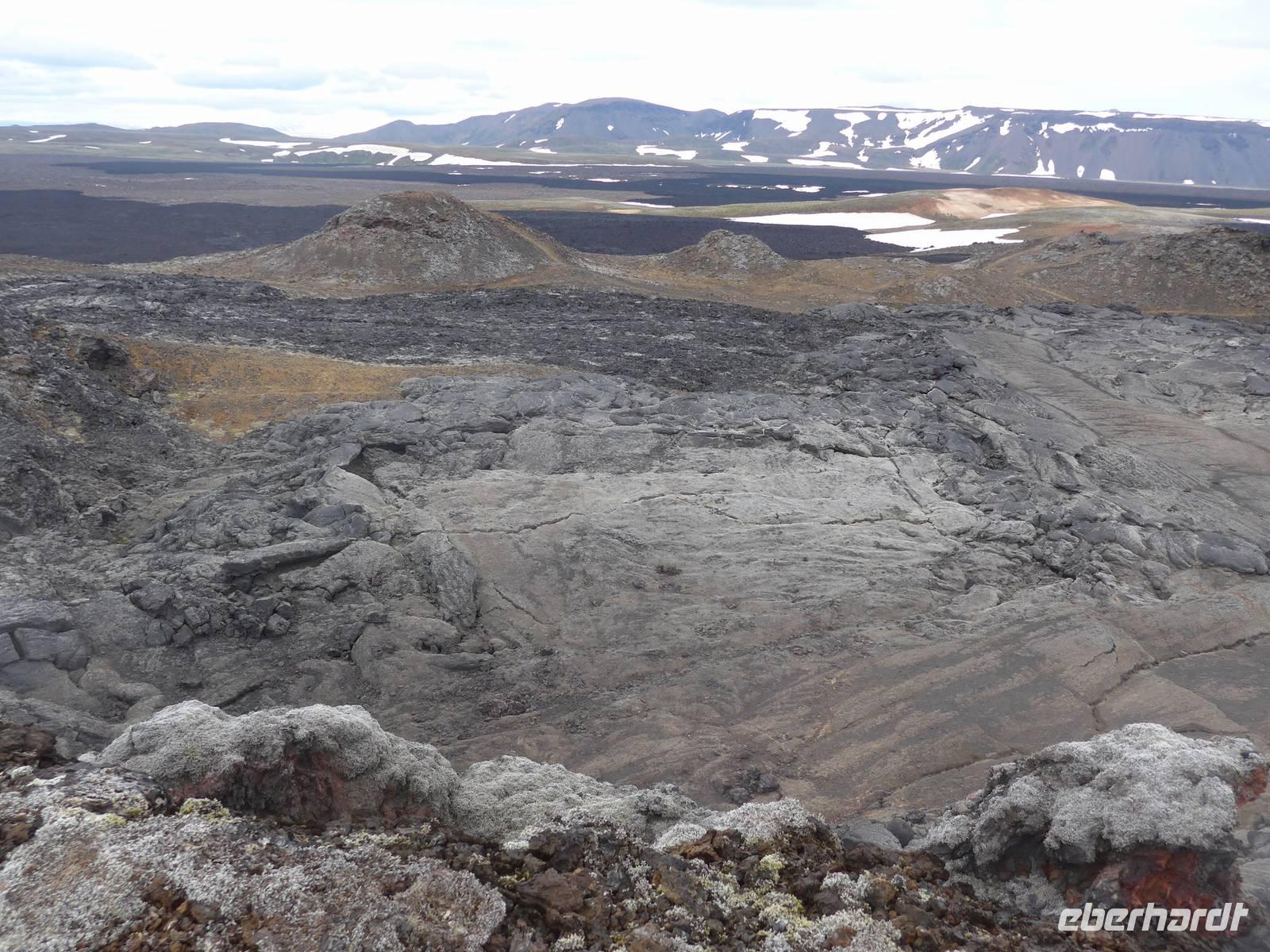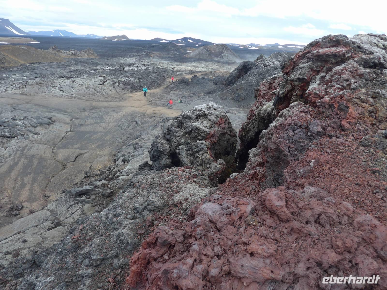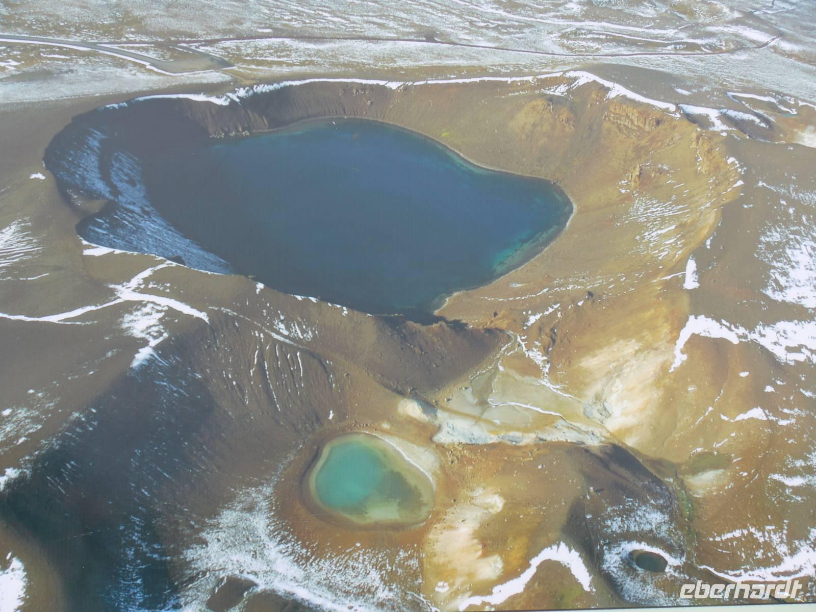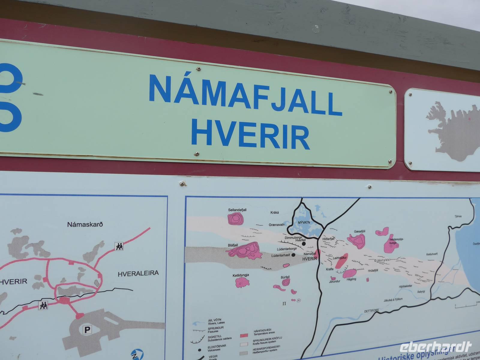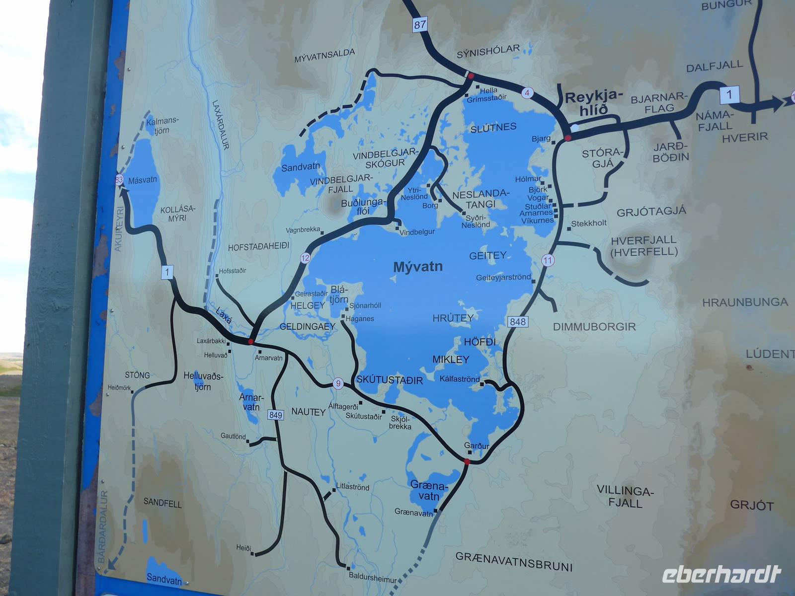 Der Nebel lag noch am Fjord in Akureyri. Aber bereits oben am Godafoss waren wir wieder in der Sonne. Im Jahre 1000, als das Christentum angenommen wurde, warf der hier ansässige Gode seine alten Götterstatuen in die tosenden Fluten des Wasserfalls und so entstand der Name Götterwasserfall. Der Wasserfall, ist nicht sehr hoch, besticht aber durch seine Wassermassen, die in Hufeisenform herab stürzen. Am Mückensee machten wir dann eine WC Pause und wanderten zu den Pseudokratern, begleitet von vielen Mücken, die aber nicht stachen. Das nächste Ziel war das Hochtemperaturgebiet Namaskard mit vielen Schlammtöpfen und Bohrlöchern, wo Dampf entwich. Das Gebiet war gut gesichert, so daß wir ohne Probleme hindurch spazieren konnten. Auf dem Weg zum Vulkan Krafla kamen wir am Geothermal-Kraftwerk vorbei, wo Dampf in elektrischen Strom umgewandelt wird. Am Krafla-Parkplatz verließen wir unseren Bus und wanderten an kleineren Schlammtöpfen vorbei den Hügel hinauf, wo verschieden farbige Lava zu bestaunen war. Danach machten wir Mittagspause am Informationszentrum.