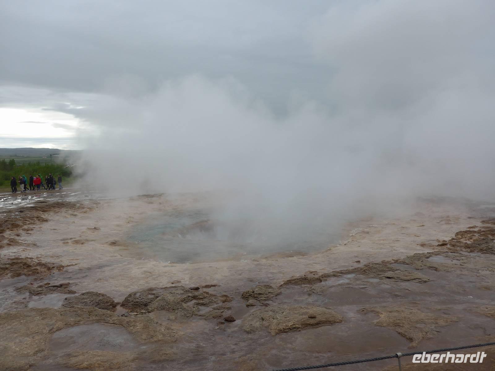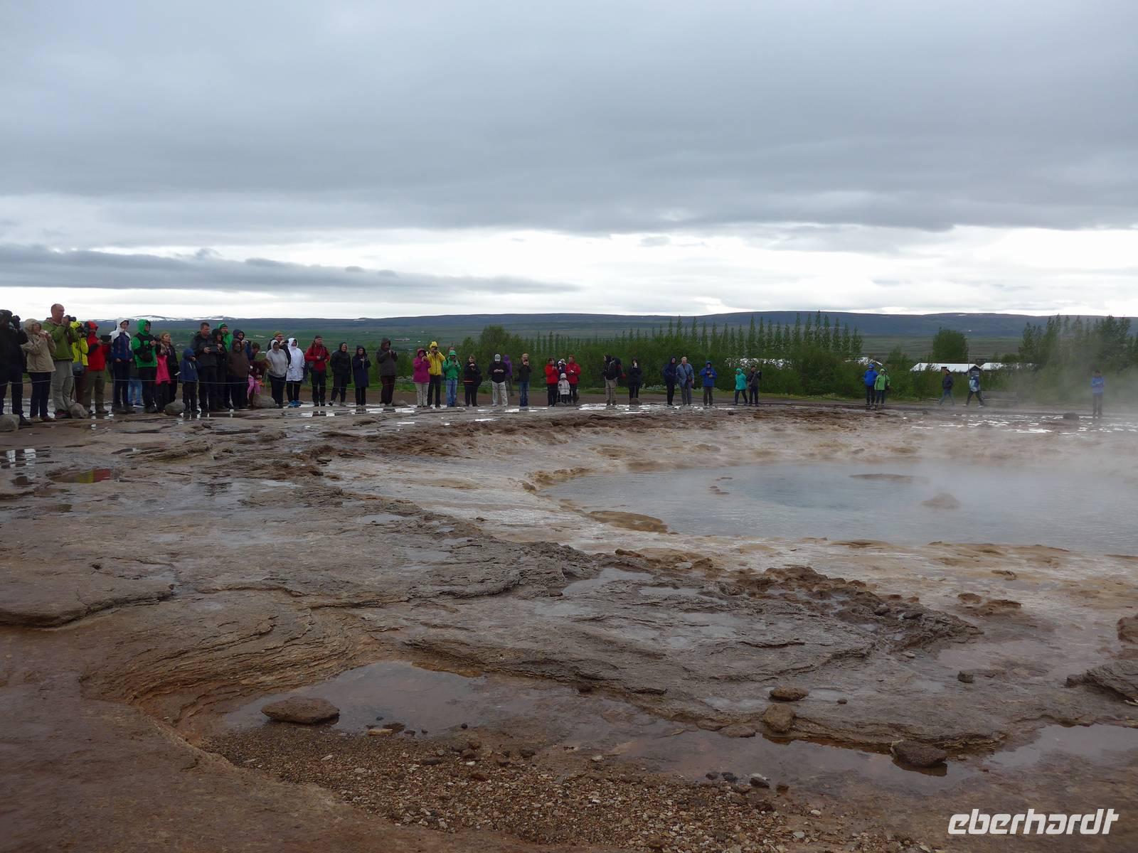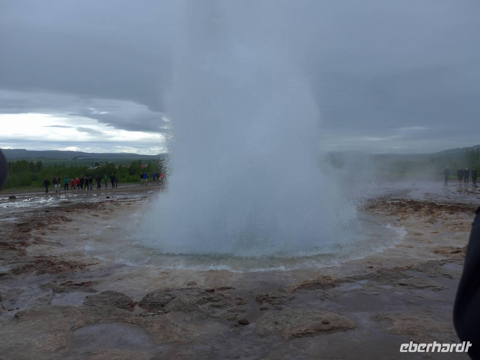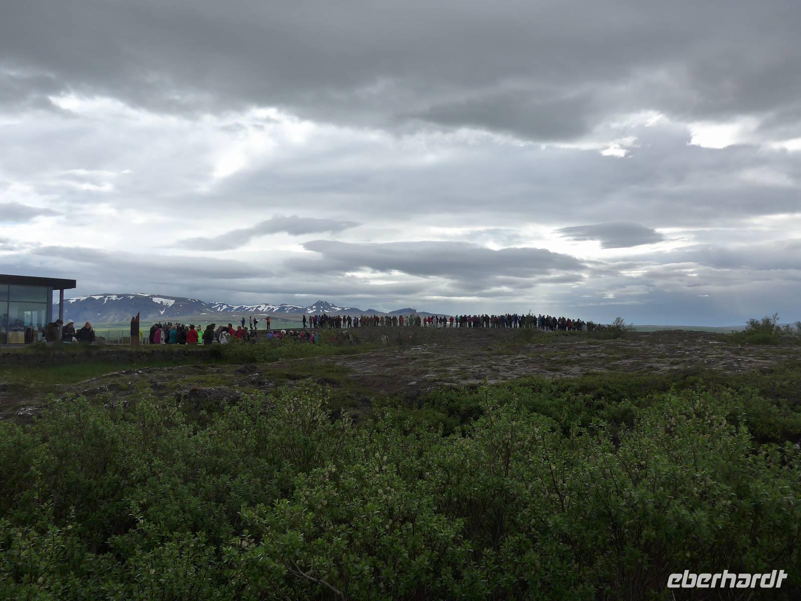 Die erste Überraschung des Tages war das tolle Frühstück im Hotel. Kurz vor 9 Uhr trafen wir dann Aldis, die perfekte Kombination aus Fahrerin und Reiseleiterin - auch Driverguide genannt. Aldis machte uns zuerst mit den isländischen Gegebenheiten vertraut und fragte nach allen Vornamen. Nach 10 Minuten kannte sie alle unsere Namen und der Ausflug konnte beginnen. Beim Verlassen von Reykjavik zeigte sie uns noch wichtige Gebäude und den einzigen Lachsfluß, der eine Hauptstadt durchfließt. Dann ging es hinaus in die Weite Islands. Unterwegs erzählte uns Aldis über das Leben vor der Unabhängigkeit, den Fischfang und die Rolle der Amerikaner nach 1944. Unser erster Stopp war im Nationalpark Thingvellir. Mitten durch den Park verläuft die geotektonische Grenze zwischen Europa und Amerika. An der "Spalte" war ein großes Gedränge. In Thingvellir wurde 930 das erste demokratische Parlament der Welt ausgerufen und Aldis demonstrierte uns sehr anschaulich, wie die Abstimmung funktionierte. Danach fuhren wir weiter zu den Geysiren. Der Geysir mit 70 Metern Höhe ist nicht mehr aktiv, aber der kleinere Bruder "Butterfaß" war zu bestaunen. Es dampfte an vielen Stellen und roch nach Schwefel. Im Informationszentrum machten wir unsere Mittagspause.