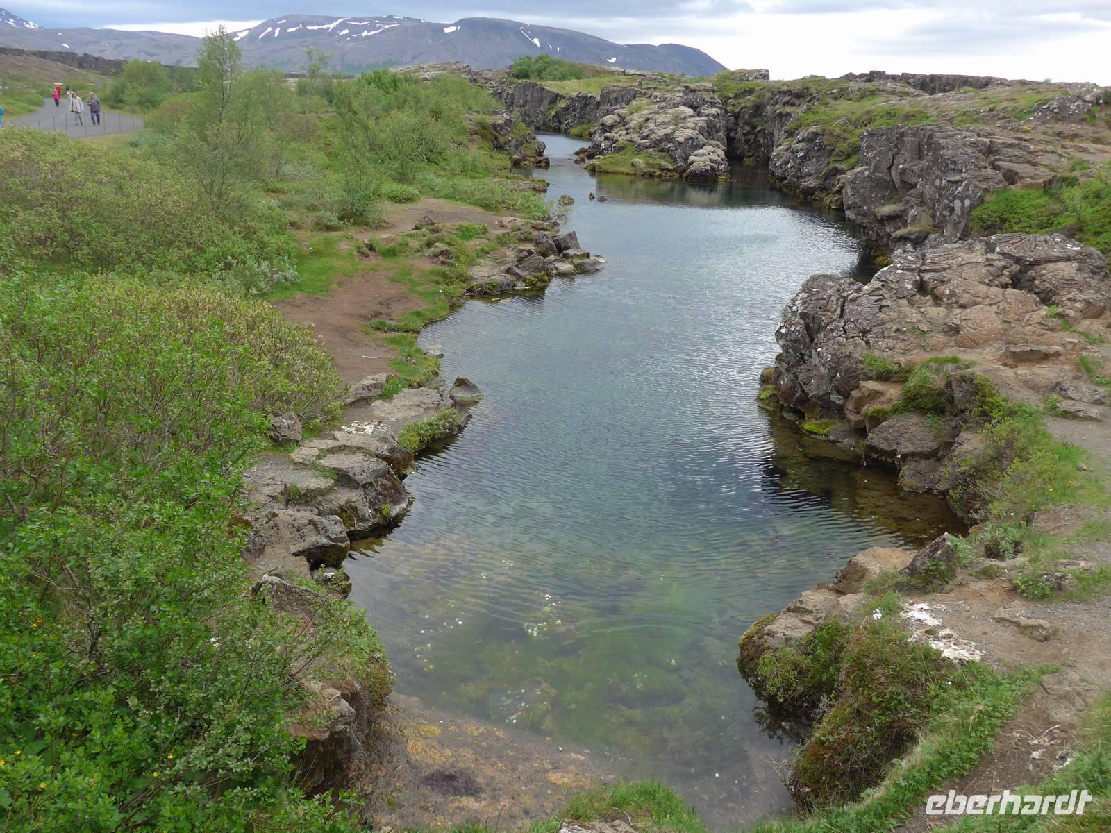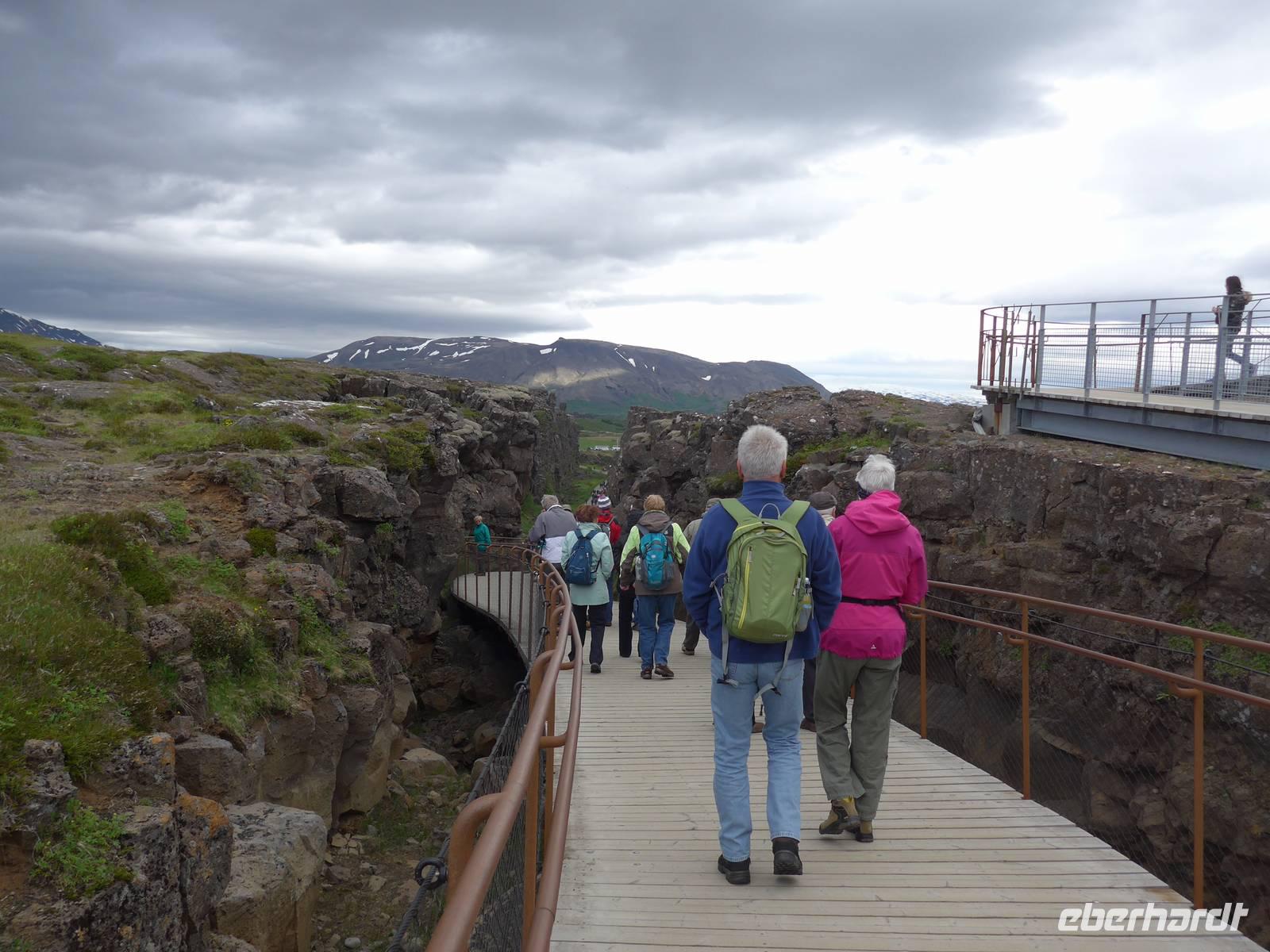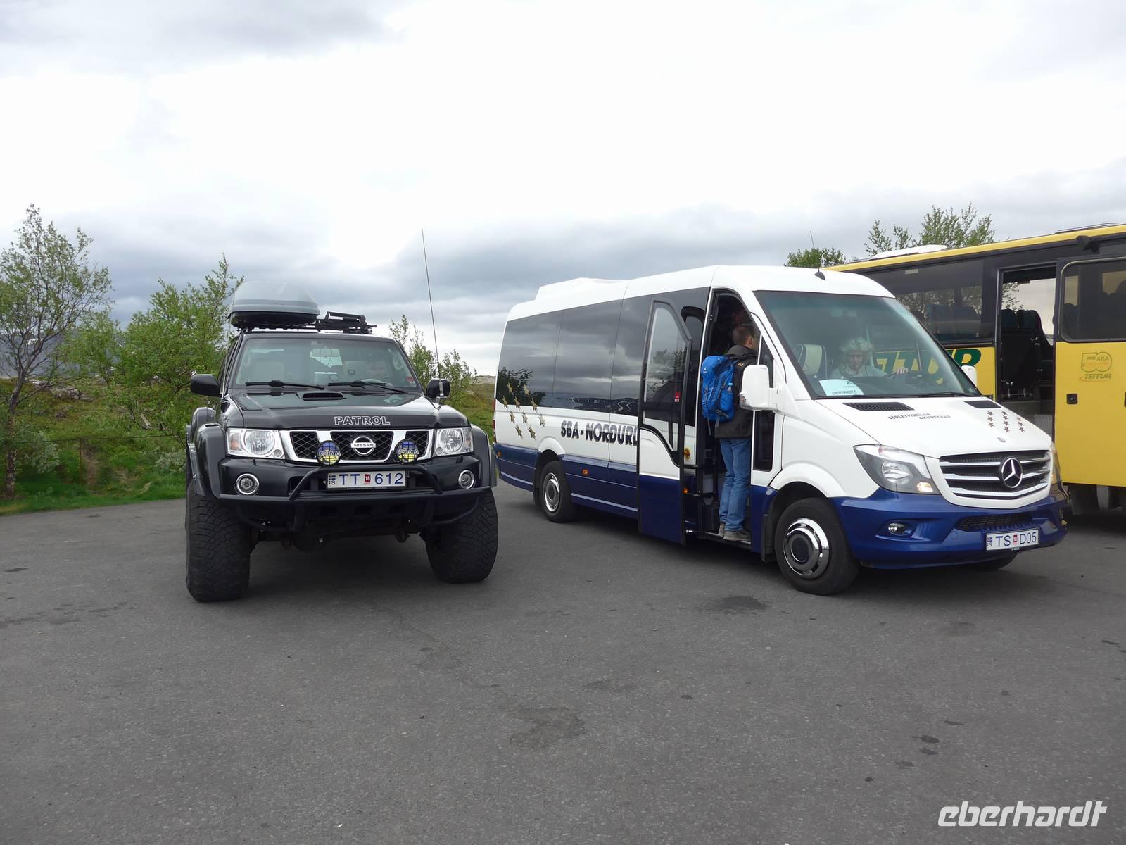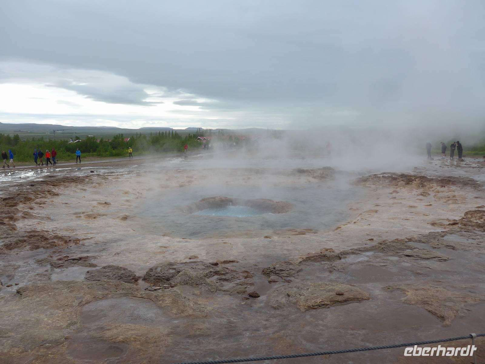 Die erste Überraschung des Tages war das tolle Frühstück im Hotel. Kurz vor 9 Uhr trafen wir dann Aldis, die perfekte Kombination aus Fahrerin und Reiseleiterin - auch Driverguide genannt. Aldis machte uns zuerst mit den isländischen Gegebenheiten vertraut und fragte nach allen Vornamen. Nach 10 Minuten kannte sie alle unsere Namen und der Ausflug konnte beginnen. Beim Verlassen von Reykjavik zeigte sie uns noch wichtige Gebäude und den einzigen Lachsfluß, der eine Hauptstadt durchfließt. Dann ging es hinaus in die Weite Islands. Unterwegs erzählte uns Aldis über das Leben vor der Unabhängigkeit, den Fischfang und die Rolle der Amerikaner nach 1944. Unser erster Stopp war im Nationalpark Thingvellir. Mitten durch den Park verläuft die geotektonische Grenze zwischen Europa und Amerika. An der "Spalte" war ein großes Gedränge. In Thingvellir wurde 930 das erste demokratische Parlament der Welt ausgerufen und Aldis demonstrierte uns sehr anschaulich, wie die Abstimmung funktionierte. Danach fuhren wir weiter zu den Geysiren. Der Geysir mit 70 Metern Höhe ist nicht mehr aktiv, aber der kleinere Bruder "Butterfaß" war zu bestaunen. Es dampfte an vielen Stellen und roch nach Schwefel. Im Informationszentrum machten wir unsere Mittagspause.
