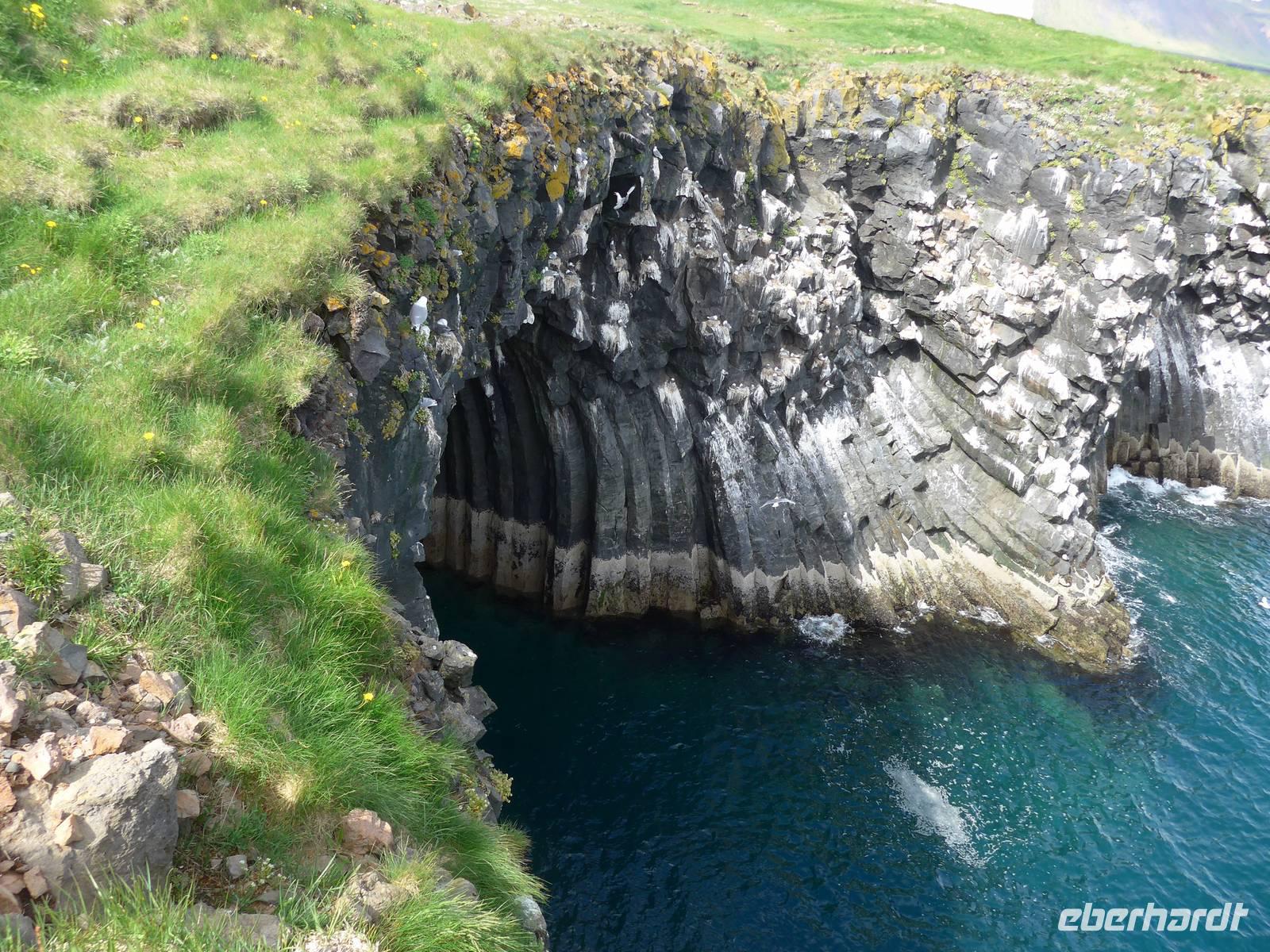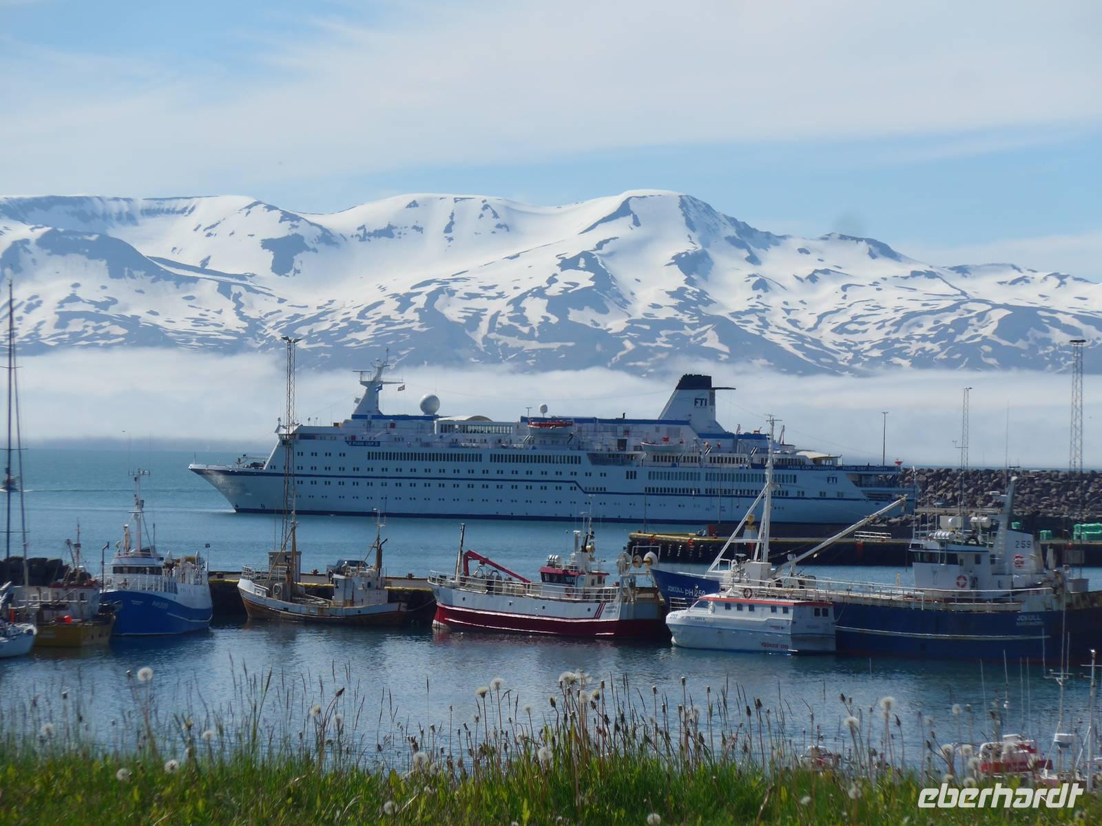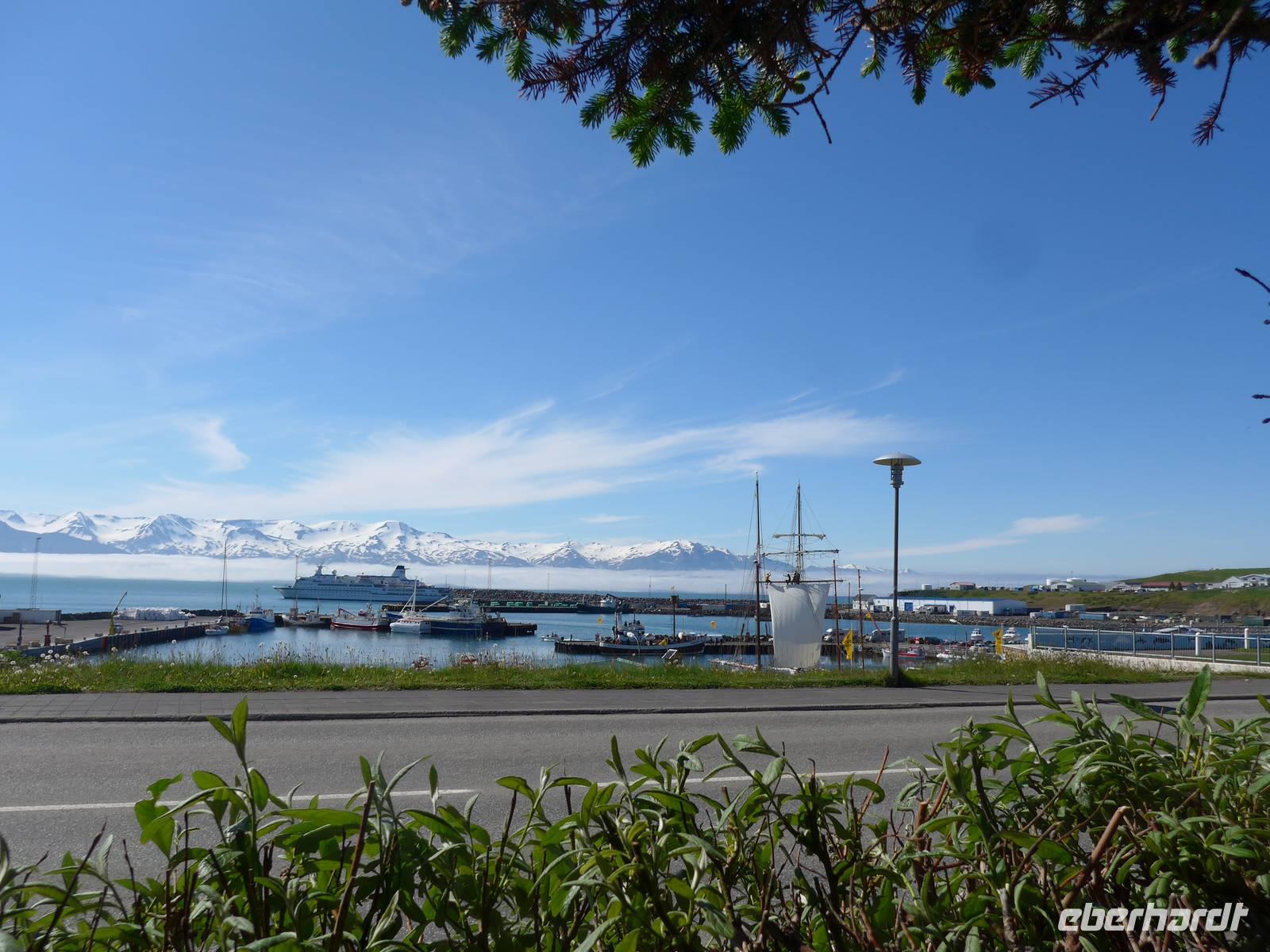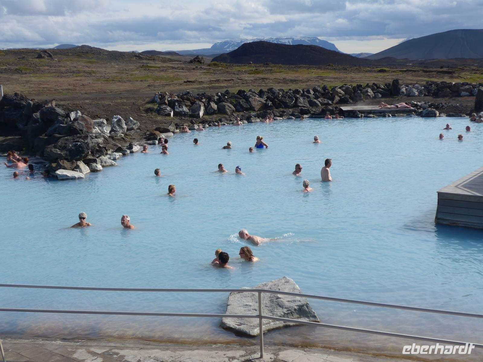 Nach einem guten und reichlichen Frühstück fuhren wir nach Husavik. Wir besuchten dort den Hafen und die Holzkirche mit einer wunderschönen Innenausstattung. Von Husavik starten mehrere Firmen zur Walbeobachtung. In Island gibt es 12 Walarten, 7 Zahnwalarten, die sich von Fischen ernähren und 5 Bartwalarten, die Plankton fressen und in Husavik ein interessantes Walfangmuseum. Im Hafen lag neben der MS Berlin auch ein historisches Segelschiff. Auf unserer Weiterfahrt sahen wir die kalte Wange und umrundeten die Halbinsel Tjörnes. An einer Steilküste hielt Aldis und zeigte uns Brutplätze der Papageitaucher und den weißen Silberwurz - die Nationalblume Islands. Die hufeisenförmige Schlucht Asbyrgi war unser nächstes Ziel. Am kleinen See am Ende der Schlucht konnten wir viele Wasservögel beobachten und auf einer großen Wiese machten wir Picknick. Da die Straße nach Süden durch einen Erdrutsch gesperrt war, mußten wir die Strecke über Husavik wieder zurück fahren und besuchten dann noch die dunklen Burgen, den Mückensee und die Badelandschaft. Jardbödin wird auch die Blaue Lagune des Nordens genannt mit Badetemperaturen von 36 - 39 Grad Celsius. Nach gründlicher Reinigung stiegen wir in die Badebecken und genossen das warme Wasser.