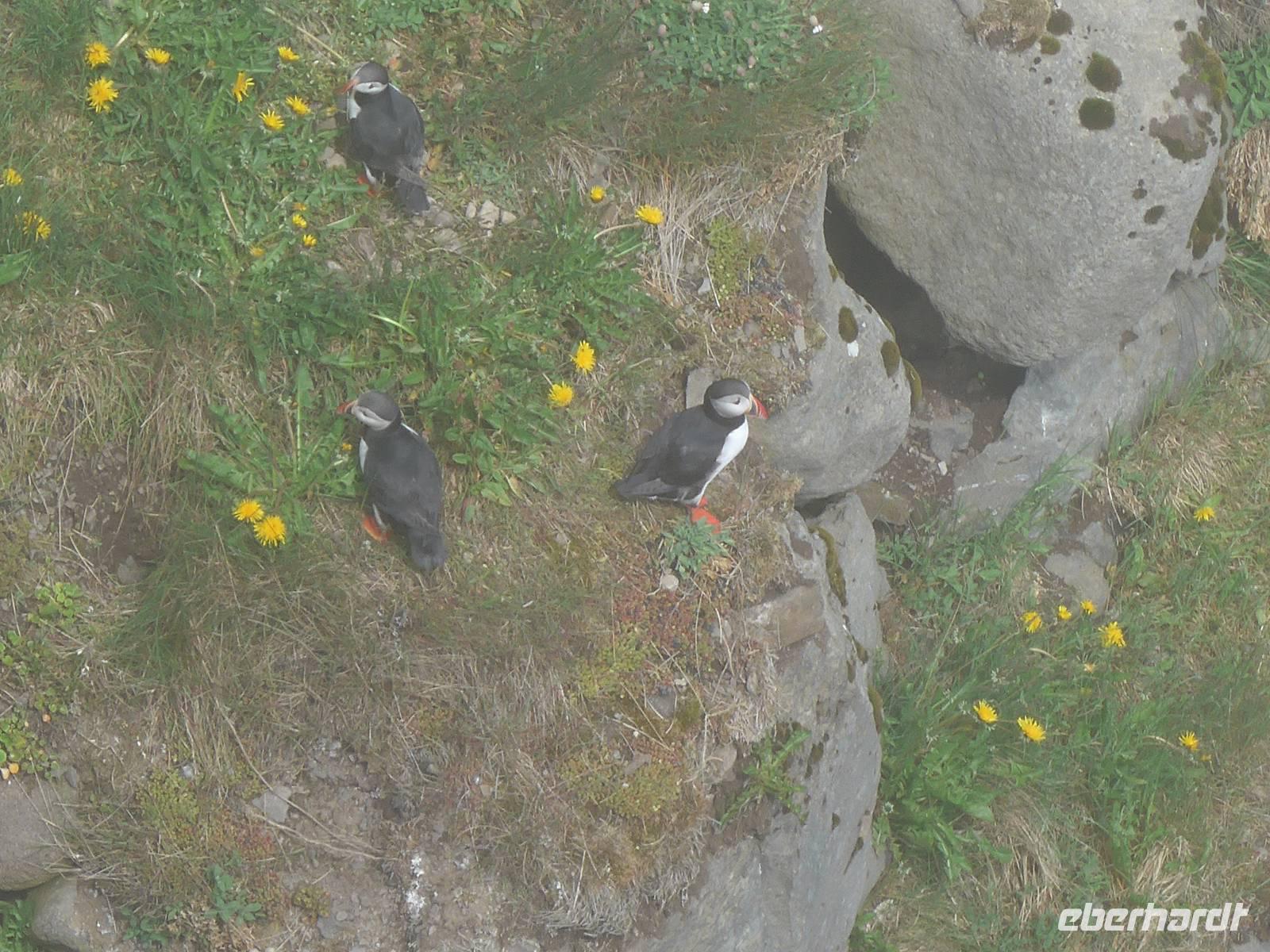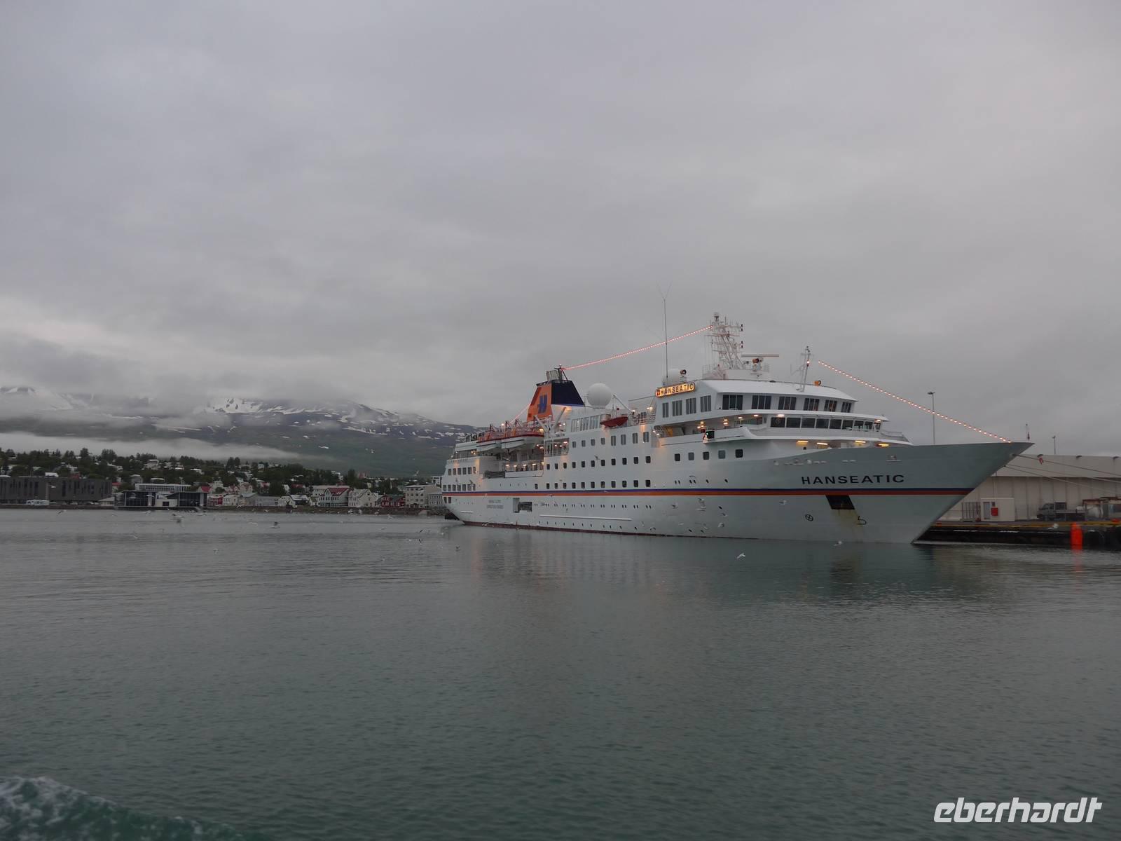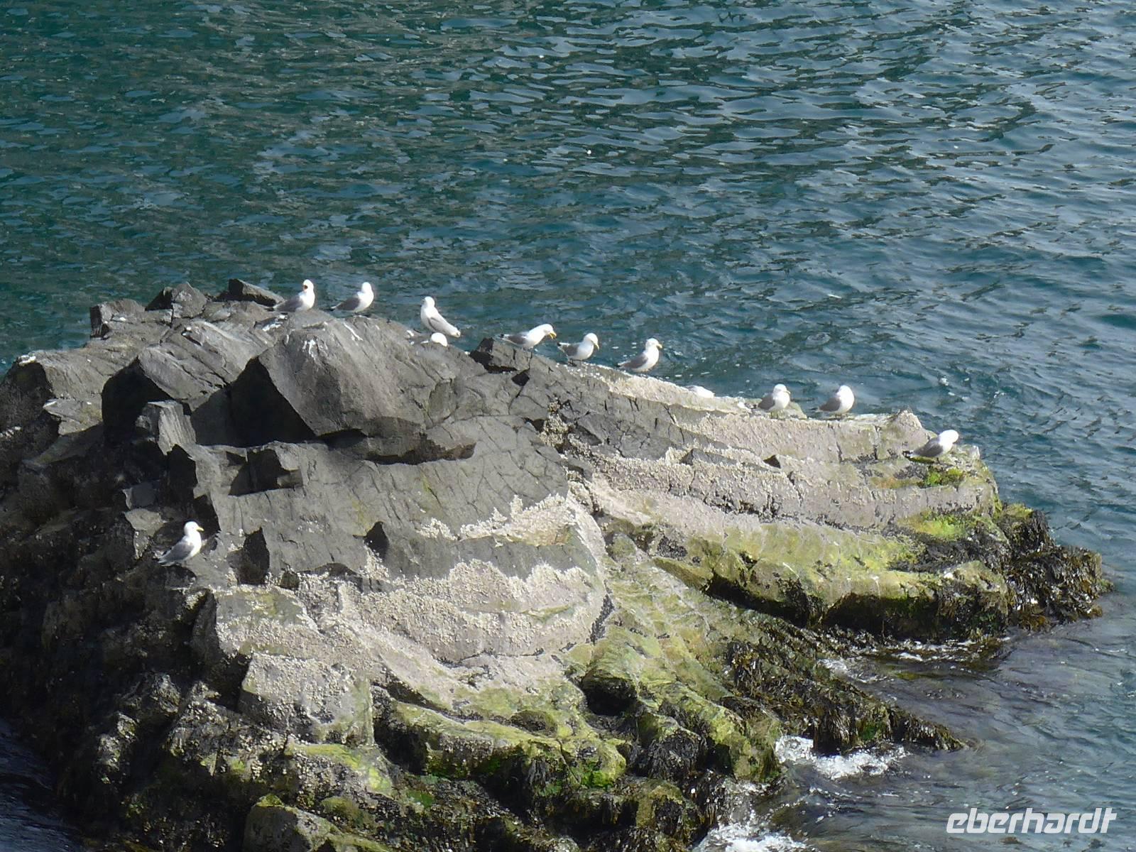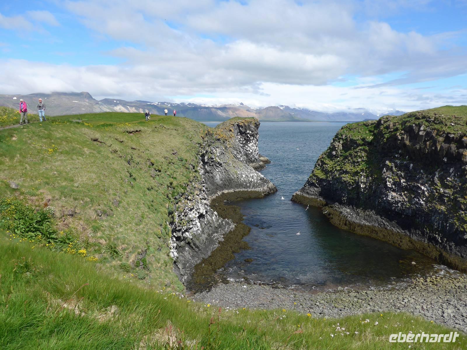 Nach einem guten und reichlichen Frühstück fuhren wir nach Husavik. Wir besuchten dort den Hafen und die Holzkirche mit einer wunderschönen Innenausstattung. Von Husavik starten mehrere Firmen zur Walbeobachtung. In Island gibt es 12 Walarten, 7 Zahnwalarten, die sich von Fischen ernähren und 5 Bartwalarten, die Plankton fressen und in Husavik ein interessantes Walfangmuseum. Im Hafen lag neben der MS Berlin auch ein historisches Segelschiff. Auf unserer Weiterfahrt sahen wir die kalte Wange und umrundeten die Halbinsel Tjörnes. An einer Steilküste hielt Aldis und zeigte uns Brutplätze der Papageitaucher und den weißen Silberwurz - die Nationalblume Islands. Die hufeisenförmige Schlucht Asbyrgi war unser nächstes Ziel. Am kleinen See am Ende der Schlucht konnten wir viele Wasservögel beobachten und auf einer großen Wiese machten wir Picknick. Da die Straße nach Süden durch einen Erdrutsch gesperrt war, mußten wir die Strecke über Husavik wieder zurück fahren und besuchten dann noch die dunklen Burgen, den Mückensee und die Badelandschaft. Jardbödin wird auch die Blaue Lagune des Nordens genannt mit Badetemperaturen von 36 - 39 Grad Celsius. Nach gründlicher Reinigung stiegen wir in die Badebecken und genossen das warme Wasser.