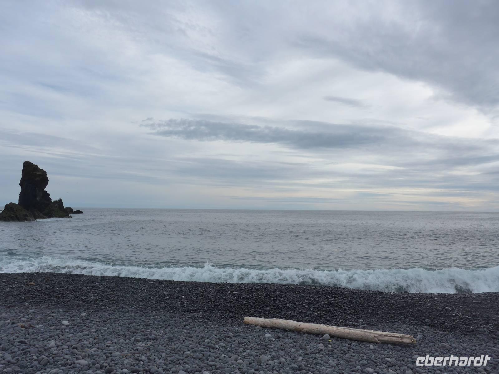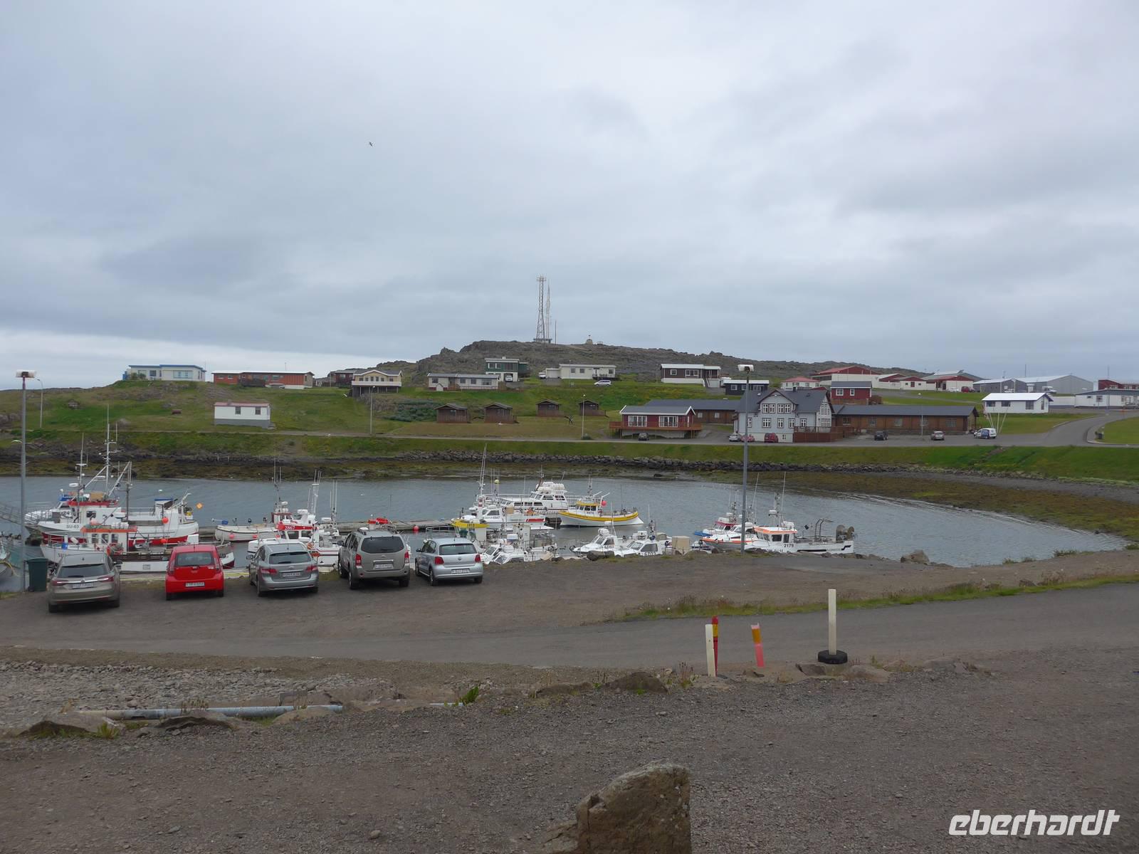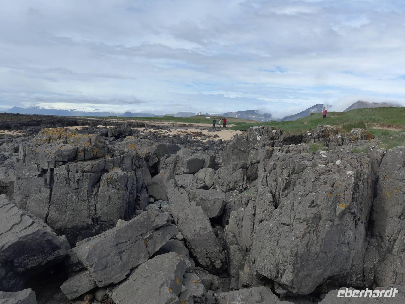 In Arnastapi verließen wir unseren Bus und gingen auf Wanderschaft. Ein schmaler Weg führte an der Küste entlang und wir konnten viele brütende Vögel sehen und eine zerklüfftete Küstenlandschaft. Wir machten 2 Gruppenfotos und danach ging Aldis zurück, um den Bus zum Endpunkt unserer Wanderung zu fahren. Wir genossen diesen abwechslungreichen Weg und sahen das Zackenmützenmoos erstmals aus der Nähe. An einem kleinen Cafe in Hellnar trafen wir Aldis wieder und probierten den Kuchen und Kaffee von 2 Isländerinnen. Auf der Weiterfahrt umrundeten wir die Westspitze von Snaefellsnes und fuhren dann eine Stichstraße Richtung Meer, wo viele Schiffswracks lagen. Von oben gingen wir hinunter an den Strand vorbei an der "Elfenkirche". Die starke Brandung hatte viele kleine schwarze Steine rund geschliffen. Nach 19 Uhr erreichten wir unser Hotel Stykkisholmur im gleichnamigen Ort. Man wartete mit dem Abendessen schon auf uns. Es war draußen kalt geworden, aber 9 Grad hielten uns nicht ab, noch einen Abendspaziergang zu machen.