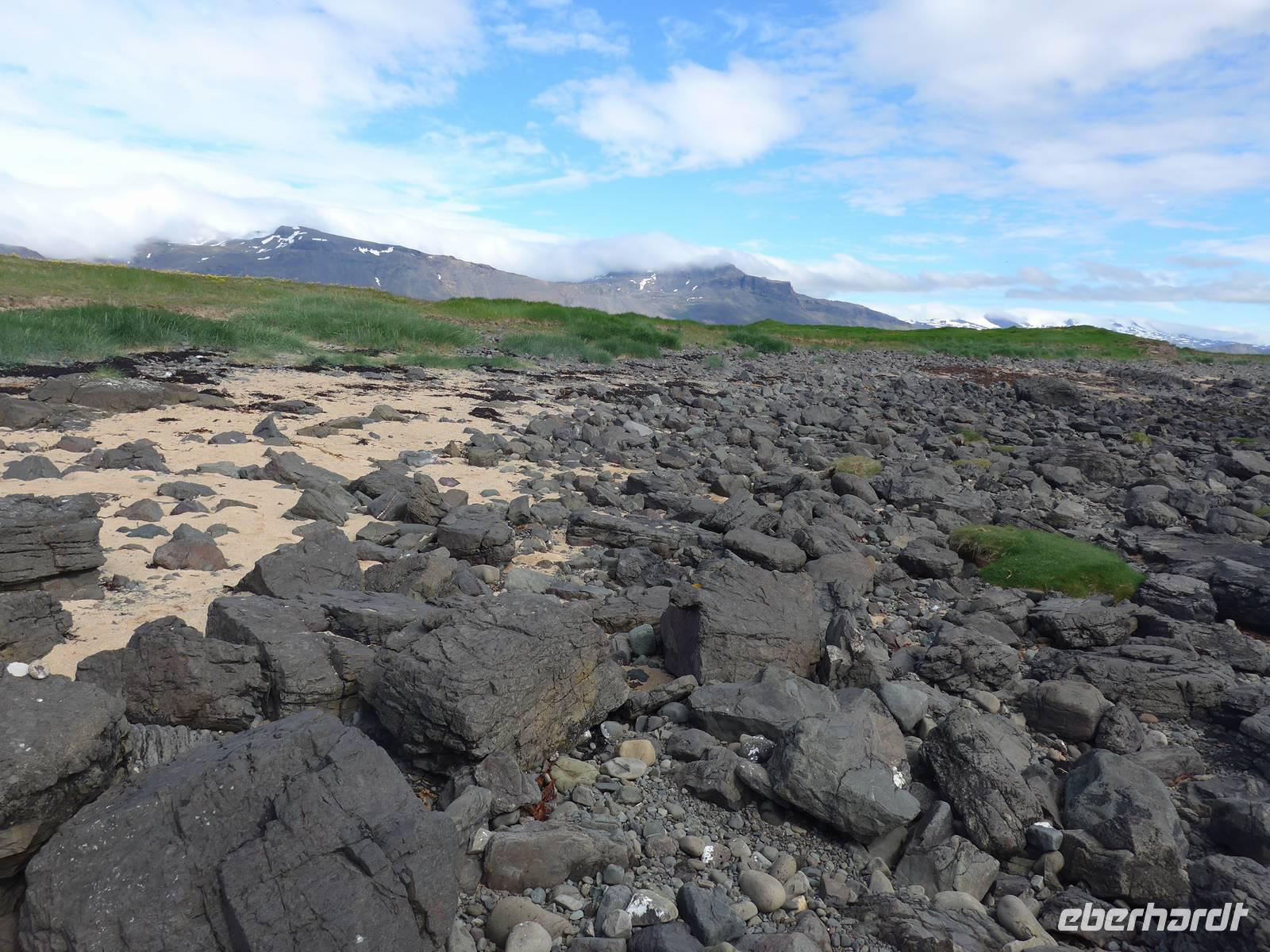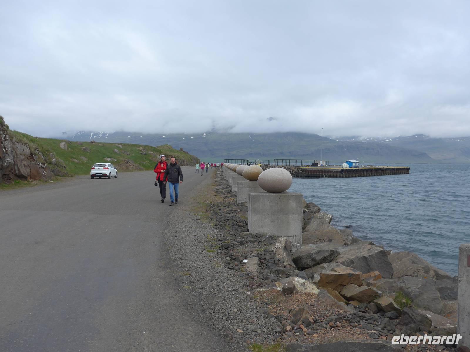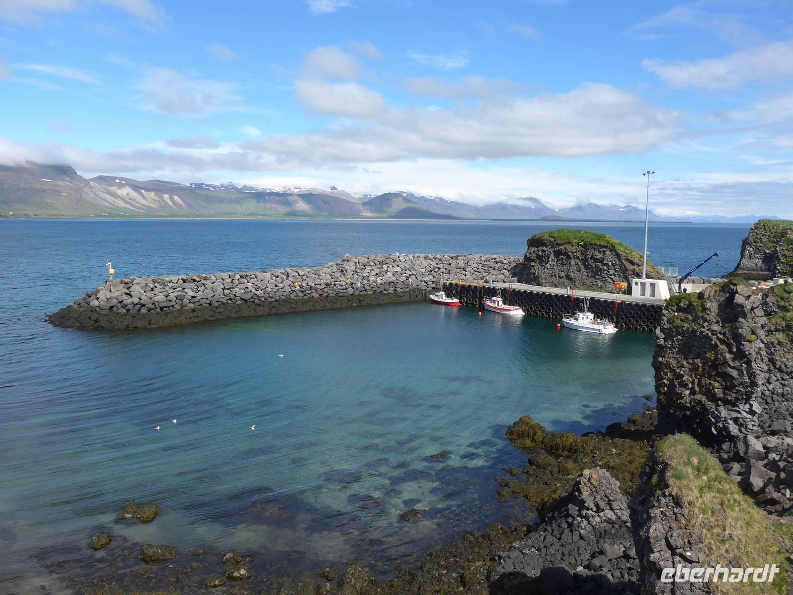 In Arnastapi verließen wir unseren Bus und gingen auf Wanderschaft. Ein schmaler Weg führte an der Küste entlang und wir konnten viele brütende Vögel sehen und eine zerklüfftete Küstenlandschaft. Wir machten 2 Gruppenfotos und danach ging Aldis zurück, um den Bus zum Endpunkt unserer Wanderung zu fahren. Wir genossen diesen abwechslungreichen Weg und sahen das Zackenmützenmoos erstmals aus der Nähe. An einem kleinen Cafe in Hellnar trafen wir Aldis wieder und probierten den Kuchen und Kaffee von 2 Isländerinnen. Auf der Weiterfahrt umrundeten wir die Westspitze von Snaefellsnes und fuhren dann eine Stichstraße Richtung Meer, wo viele Schiffswracks lagen. Von oben gingen wir hinunter an den Strand vorbei an der "Elfenkirche". Die starke Brandung hatte viele kleine schwarze Steine rund geschliffen. Nach 19 Uhr erreichten wir unser Hotel Stykkisholmur im gleichnamigen Ort. Man wartete mit dem Abendessen schon auf uns. Es war draußen kalt geworden, aber 9 Grad hielten uns nicht ab, noch einen Abendspaziergang zu machen.
