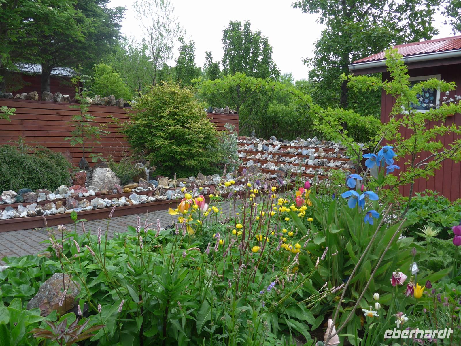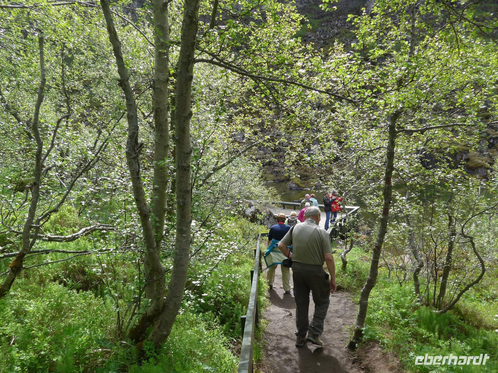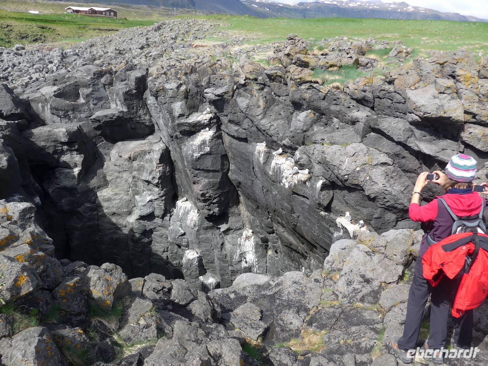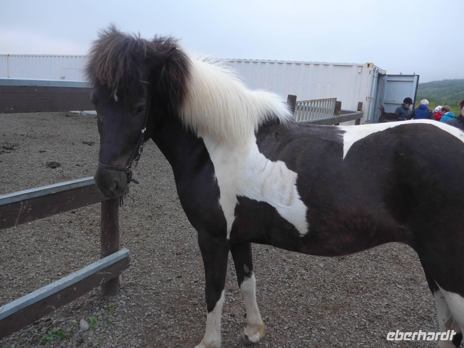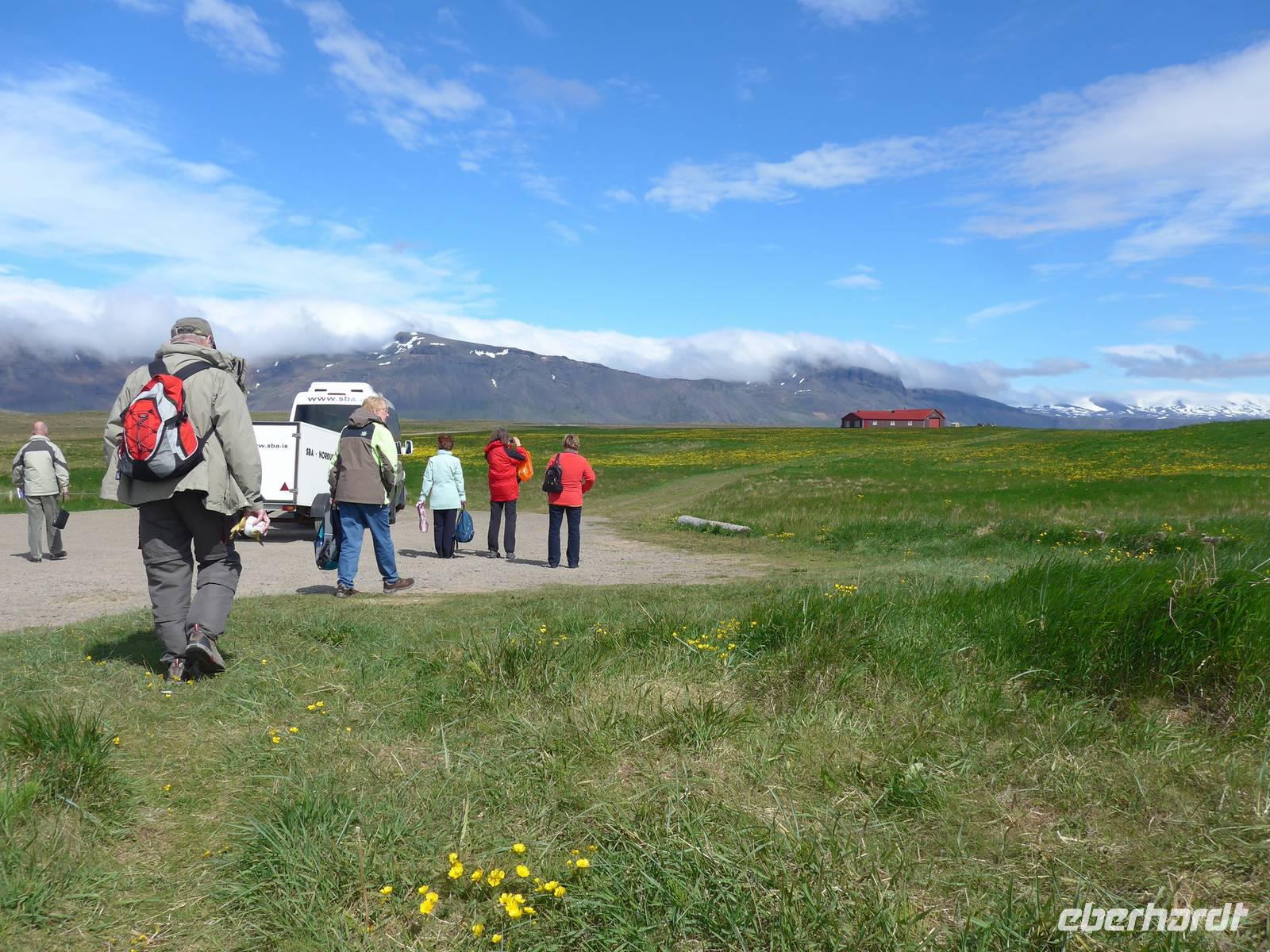 Auf der Fahrt zu unserem ersten Tagesziel erfuhren wir von den Island-Sagas und Elfengeschichten. Aldis, ausgebildet als Lehrerin, kannte unzählige dieser Geschichten und erzählte uns täglich mindestens eine davon. Vor der Besteigung der Kraters Grabrok ging Aldis noch mit uns zum Glavini-Wasserfall, wo oft die springenden Lachse zu sehen sind. Wir sahen zwar keine Lachse, dafür aber eine interessante Natur mit einem kleinen Birkenwäldchen. Dann folgte der Krater Grabrok, der mit Treppen und Wegen vorbildlich für die Touristen hergerichtet wurde. Am Fuße des Kraters verzehrten wir unser Picknick. Auf der Weiterfahrt wurde das Schulsystem Islands näher beleuchtet und über die Zucht der Islandpferde gesprochen. In einem idyllisch gelegenen Pferdehof besuchten wir zunächst die Stallungen, erfuhren alles wichtige zu den 4 Gangarten und sahen danach bei Kaffee/Tee und Kuchen die 4 Gangarten - Schritt, Trab, Galopp und Tölt - in der Praxis. Nun hatten wir schon mal eine Vorstellung von unserem Reitausflug am übernächsten Abend.