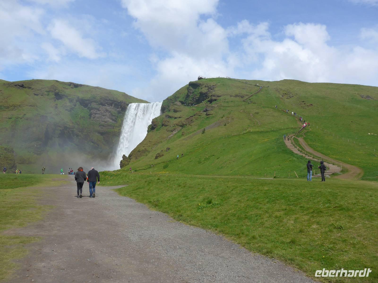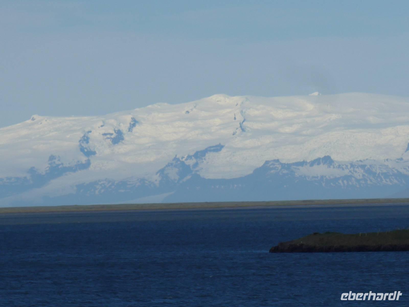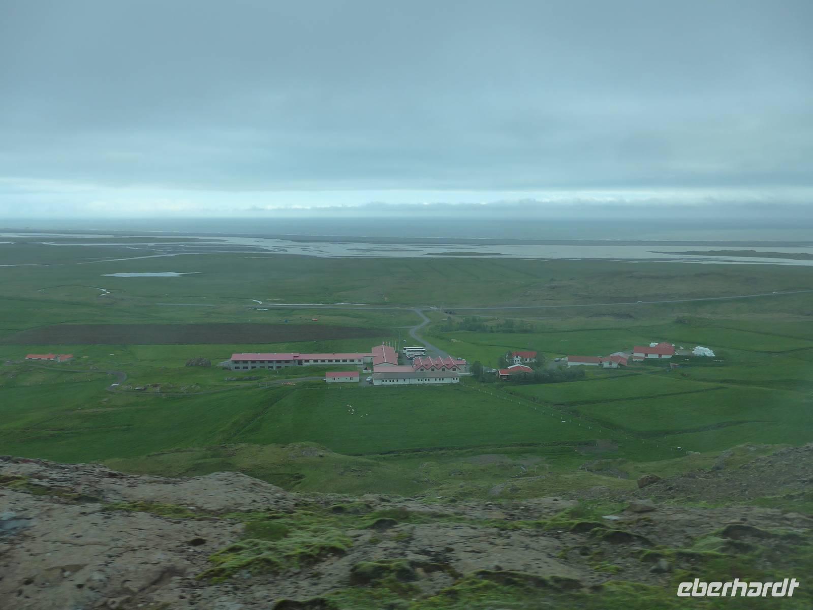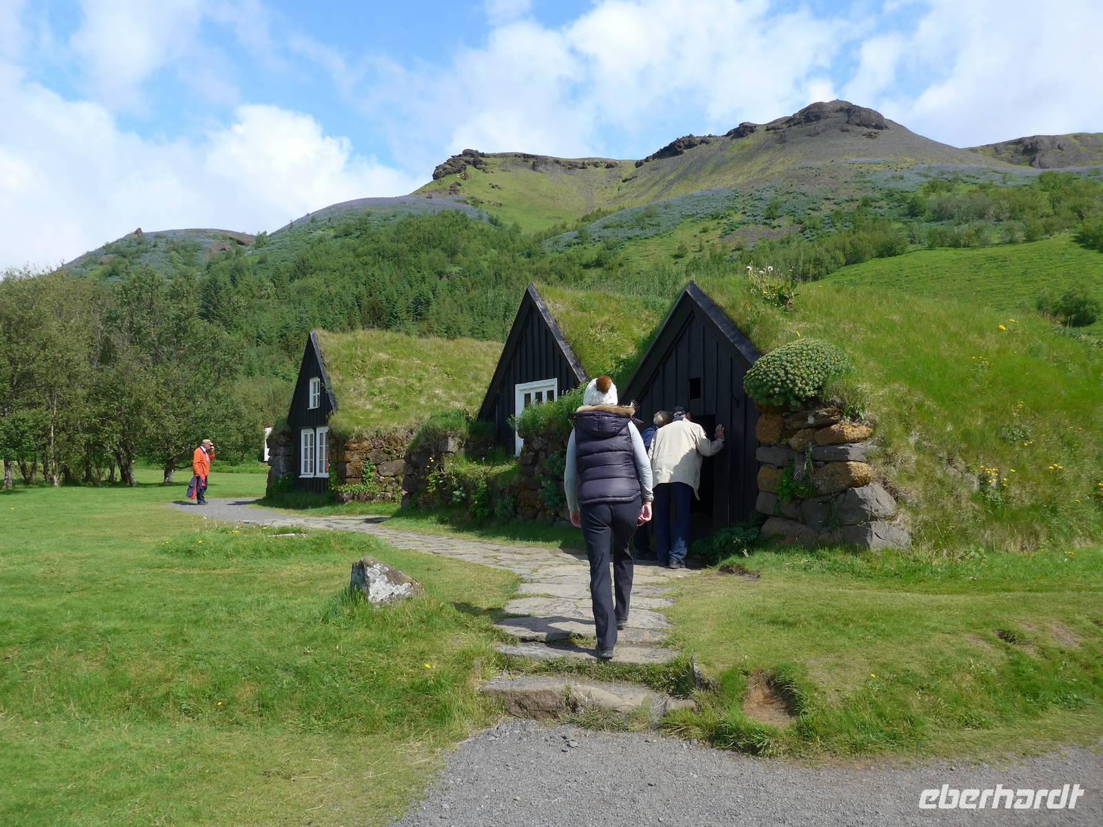 Unsere Reise war fast zu Ende und jeder hatte noch allerhand isländische Kronen. So besuchten wir in Vik ein Geschäft mit typisch isländischen Produkten. Danach gings zu einer der schönsten Küsten der Welt an die Landspitze Dyrholaey. Tausende Seevögel brüten dort und wir sahen wieder Papageitaucher und eine brütende Eiderente ganz aus der Nähe. Schroffe Felsgebilde säumten die Küste und auf der Rückfahrt bekamen wir noch unsere fehlenden Fotos von Islandschafen. Gegen Mittag erreichten wir Skoga und besuchten zunächst das interessante Heimat- und Freilicht-Museum. Es war beeindruckt, in ein Grassodenhaus hineinzukriechen und für uns unvorstellbar, wie Menschen dort Sommer wie Winter leben konnten. Am nahe gelegenen Skogar-Wasserfall stiegen wir die vielen Stufen hinauf, um das Schauspiel auch von oben zu betrachten. Der berühmte Eyjafjallajökull, der mit seinem Ausbruch 2010 Europas Flugverkehr lahm legte, war ganz in der Nähe und wir sahen im neu errichteten Informationszentrum sahen wir den Film über den Ausbruch und das Erlebte eben dieser Familie. Es war sehr beeindruckend und ging unter die Haut.