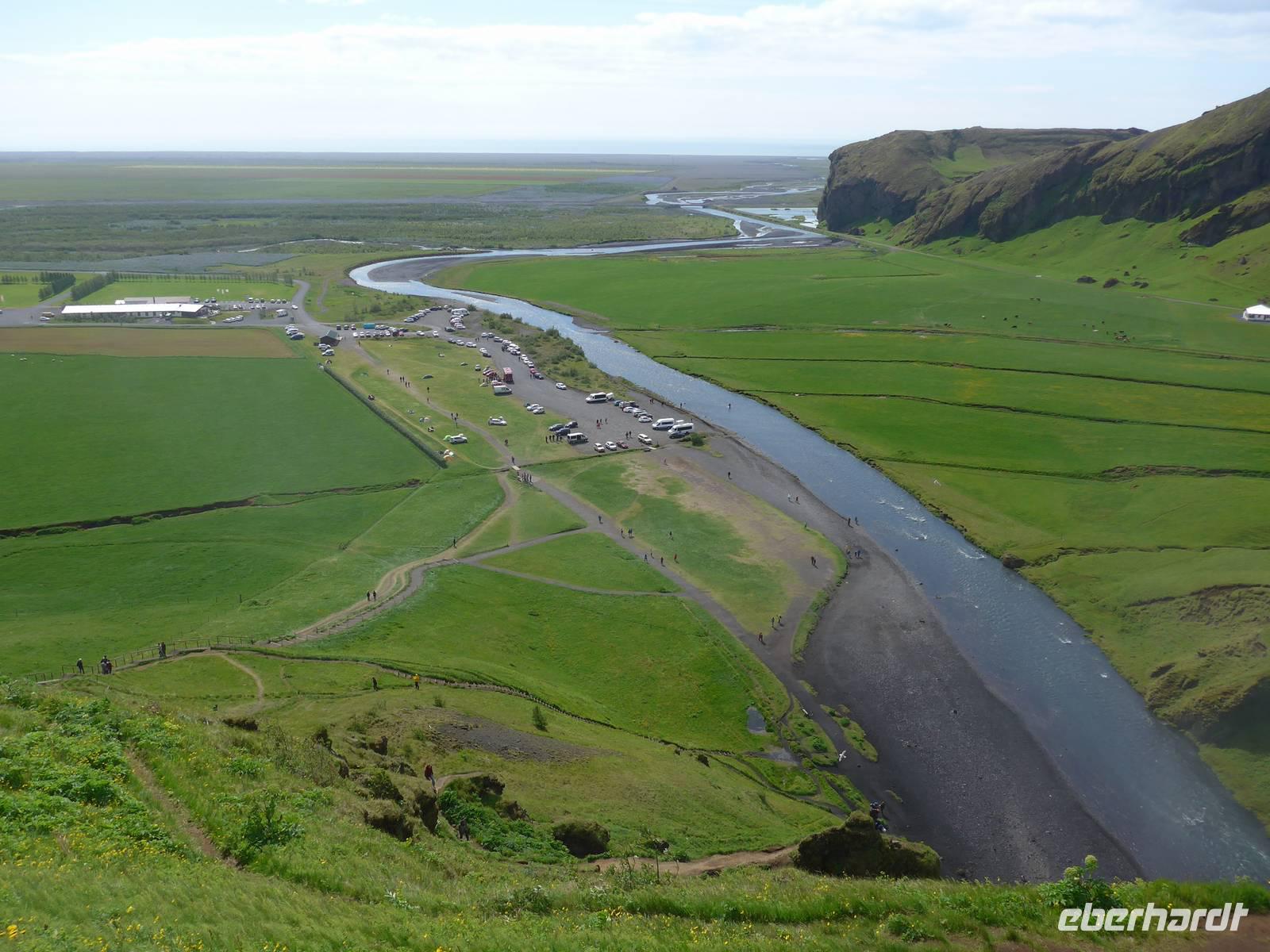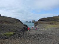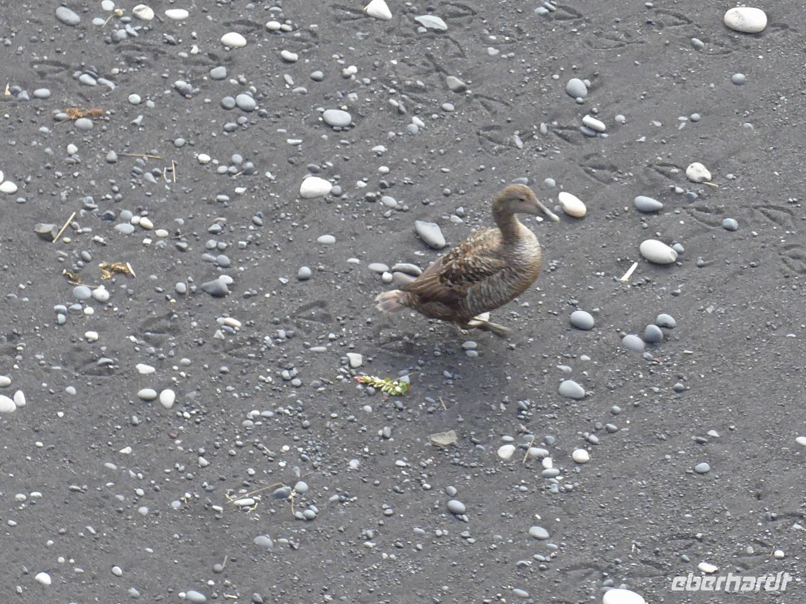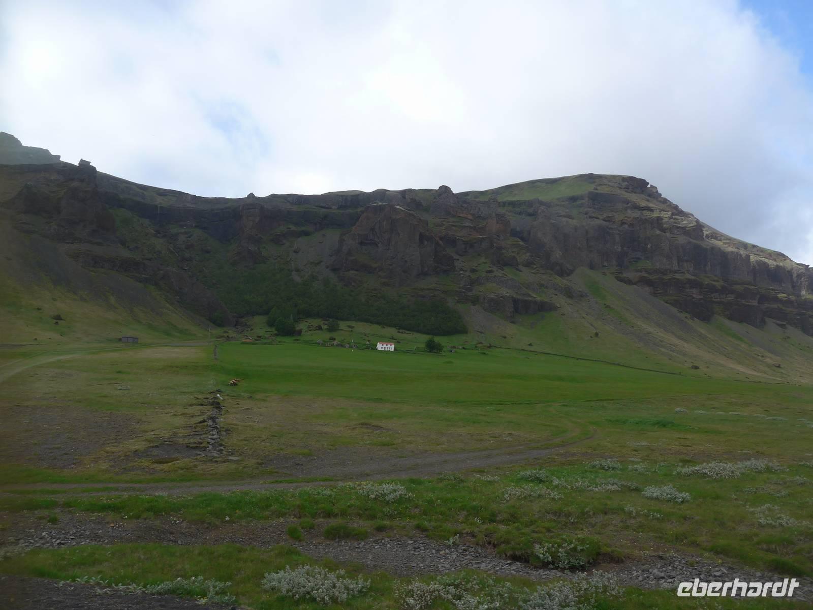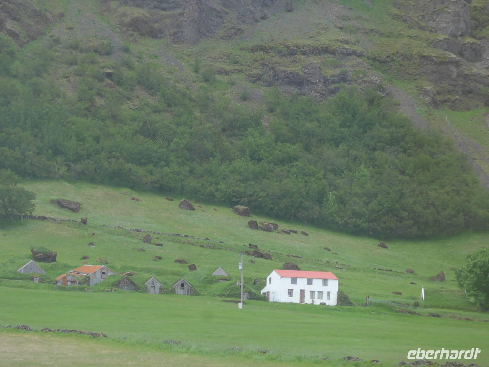 Unsere Reise war fast zu Ende und jeder hatte noch allerhand isländische Kronen. So besuchten wir in Vik ein Geschäft mit typisch isländischen Produkten. Danach gings zu einer der schönsten Küsten der Welt an die Landspitze Dyrholaey. Tausende Seevögel brüten dort und wir sahen wieder Papageitaucher und eine brütende Eiderente ganz aus der Nähe. Schroffe Felsgebilde säumten die Küste und auf der Rückfahrt bekamen wir noch unsere fehlenden Fotos von Islandschafen. Gegen Mittag erreichten wir Skoga und besuchten zunächst das interessante Heimat- und Freilicht-Museum. Es war beeindruckt, in ein Grassodenhaus hineinzukriechen und für uns unvorstellbar, wie Menschen dort Sommer wie Winter leben konnten. Am nahe gelegenen Skogar-Wasserfall stiegen wir die vielen Stufen hinauf, um das Schauspiel auch von oben zu betrachten. Der berühmte Eyjafjallajökull, der mit seinem Ausbruch 2010 Europas Flugverkehr lahm legte, war ganz in der Nähe und wir sahen im neu errichteten Informationszentrum sahen wir den Film über den Ausbruch und das Erlebte eben dieser Familie. Es war sehr beeindruckend und ging unter die Haut.