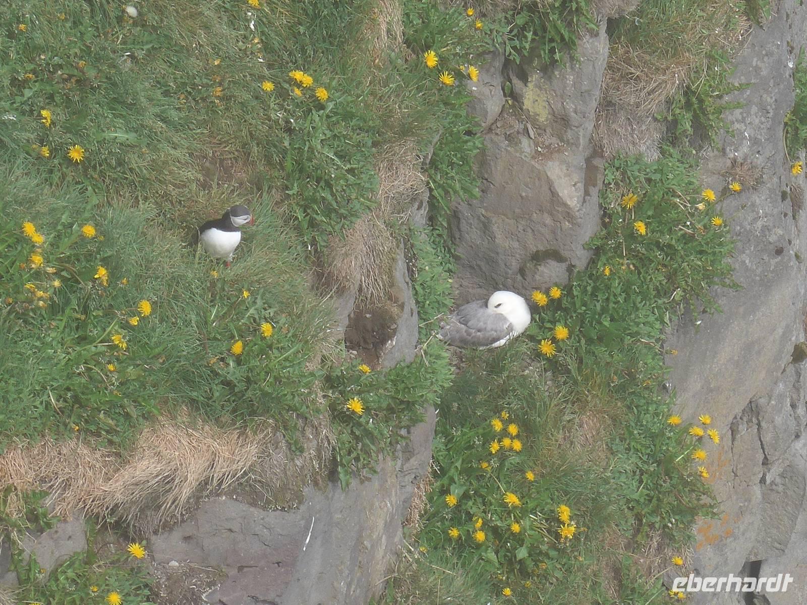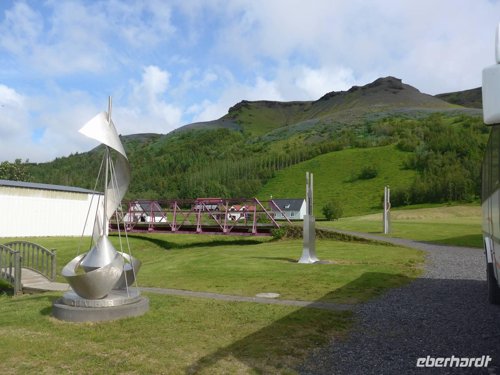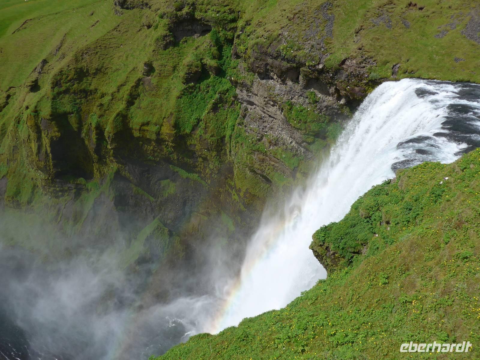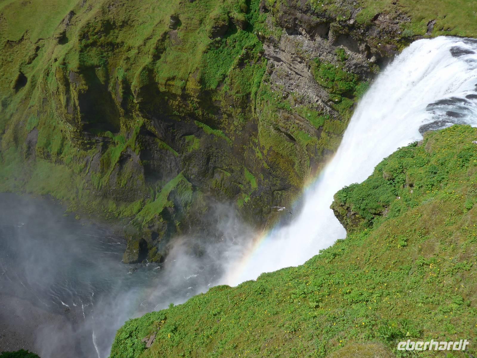 Unsere Reise war fast zu Ende und jeder hatte noch allerhand isländische Kronen. So besuchten wir in Vik ein Geschäft mit typisch isländischen Produkten. Danach gings zu einer der schönsten Küsten der Welt an die Landspitze Dyrholaey. Tausende Seevögel brüten dort und wir sahen wieder Papageitaucher und eine brütende Eiderente ganz aus der Nähe. Schroffe Felsgebilde säumten die Küste und auf der Rückfahrt bekamen wir noch unsere fehlenden Fotos von Islandschafen. Gegen Mittag erreichten wir Skoga und besuchten zunächst das interessante Heimat- und Freilicht-Museum. Es war beeindruckt, in ein Grassodenhaus hineinzukriechen und für uns unvorstellbar, wie Menschen dort Sommer wie Winter leben konnten. Am nahe gelegenen Skogar-Wasserfall stiegen wir die vielen Stufen hinauf, um das Schauspiel auch von oben zu betrachten. Der berühmte Eyjafjallajökull, der mit seinem Ausbruch 2010 Europas Flugverkehr lahm legte, war ganz in der Nähe und wir sahen im neu errichteten Informationszentrum sahen wir den Film über den Ausbruch und das Erlebte eben dieser Familie. Es war sehr beeindruckend und ging unter die Haut.