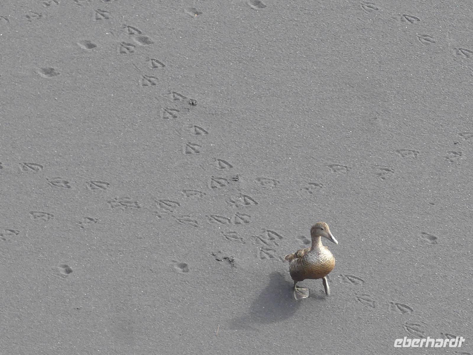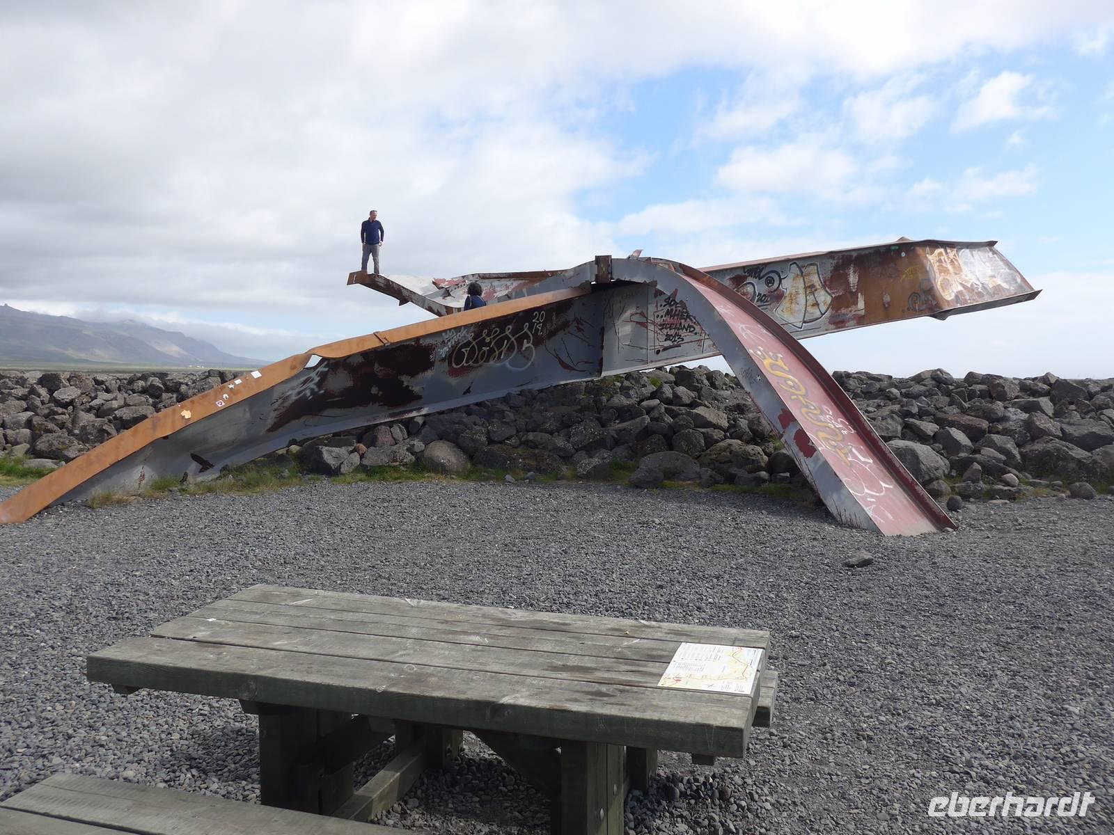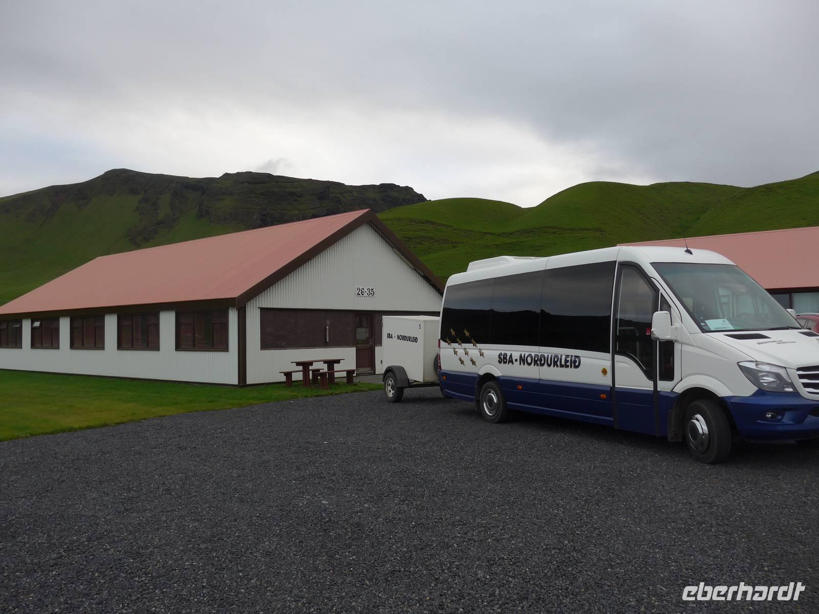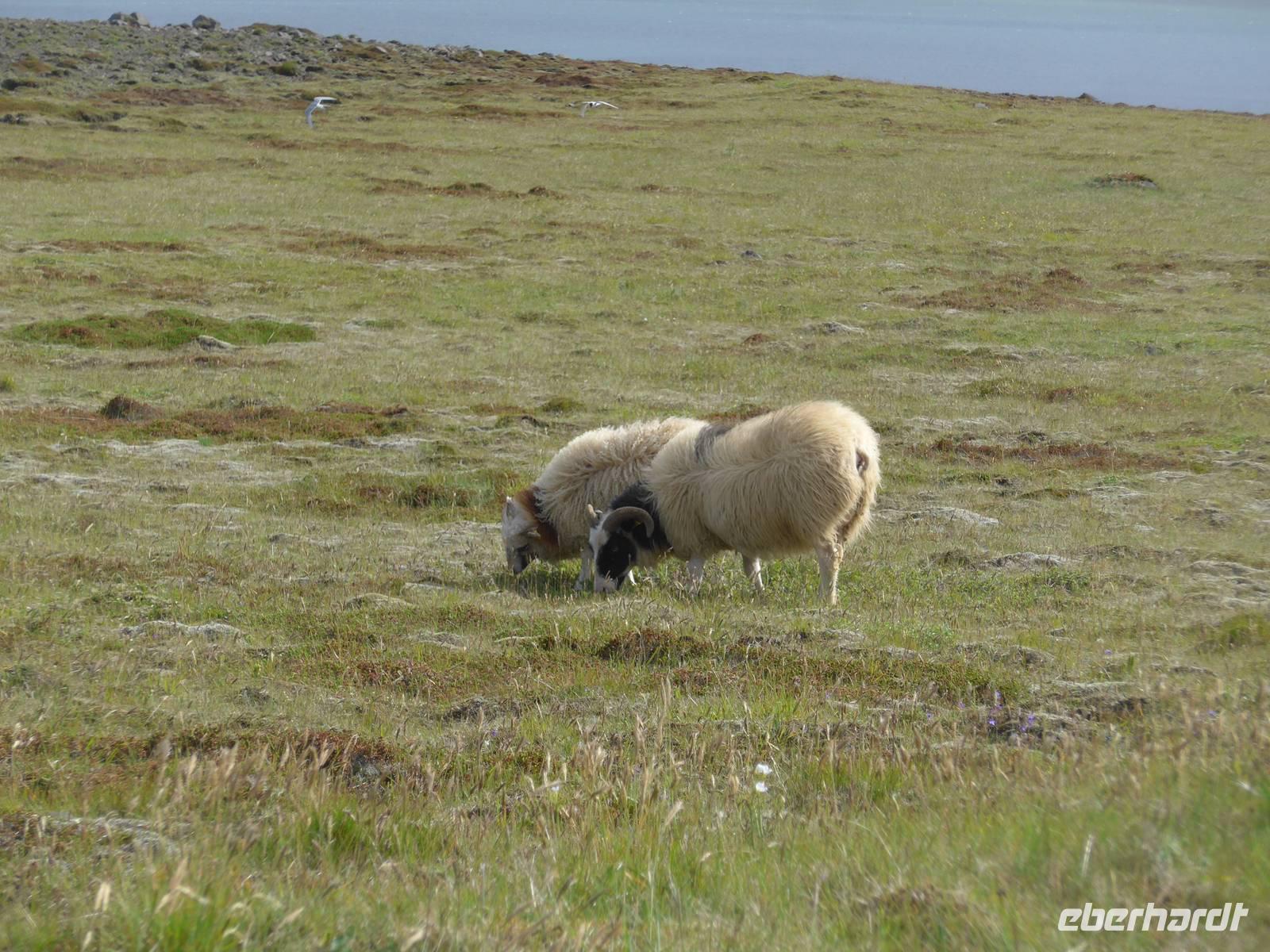 Unsere Reise war fast zu Ende und jeder hatte noch allerhand isländische Kronen. So besuchten wir in Vik ein Geschäft mit typisch isländischen Produkten. Danach gings zu einer der schönsten Küsten der Welt an die Landspitze Dyrholaey. Tausende Seevögel brüten dort und wir sahen wieder Papageitaucher und eine brütende Eiderente ganz aus der Nähe. Schroffe Felsgebilde säumten die Küste und auf der Rückfahrt bekamen wir noch unsere fehlenden Fotos von Islandschafen. Gegen Mittag erreichten wir Skoga und besuchten zunächst das interessante Heimat- und Freilicht-Museum. Es war beeindruckt, in ein Grassodenhaus hineinzukriechen und für uns unvorstellbar, wie Menschen dort Sommer wie Winter leben konnten. Am nahe gelegenen Skogar-Wasserfall stiegen wir die vielen Stufen hinauf, um das Schauspiel auch von oben zu betrachten. Der berühmte Eyjafjallajökull, der mit seinem Ausbruch 2010 Europas Flugverkehr lahm legte, war ganz in der Nähe und wir sahen im neu errichteten Informationszentrum sahen wir den Film über den Ausbruch und das Erlebte eben dieser Familie. Es war sehr beeindruckend und ging unter die Haut.