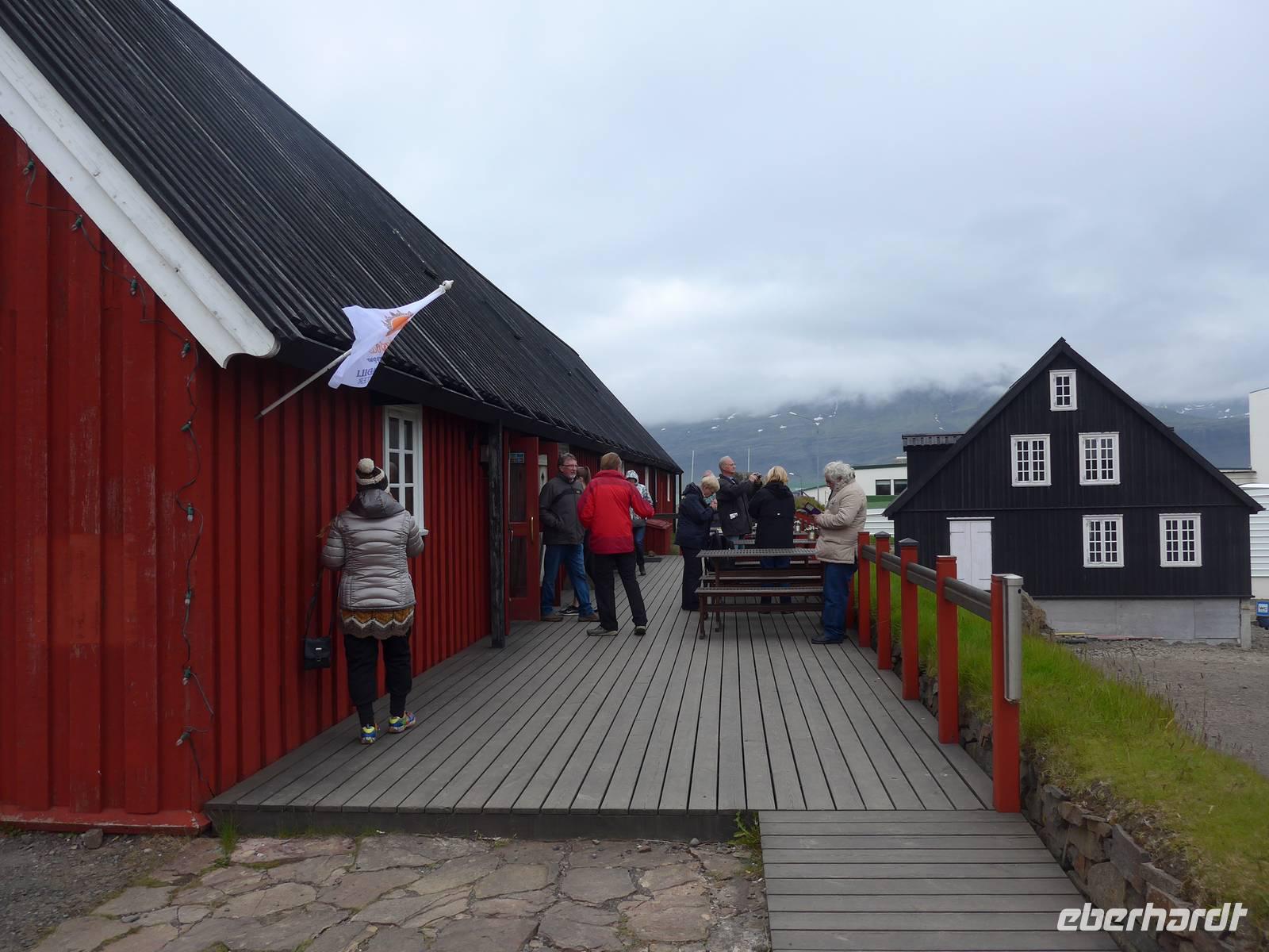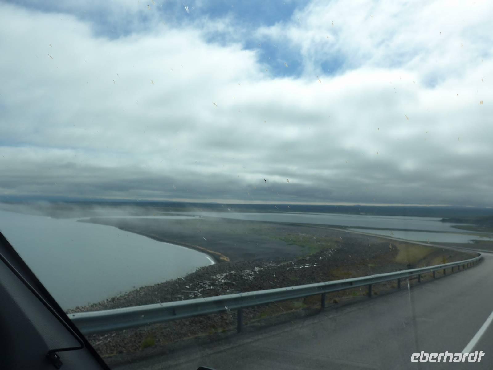 Am Nachmittag fuhren wir gen Norden zum größten Canyon Islands. Vom Parkplatz führte ein unscheinbarer Weg durch die Lava-Landschaft und plötzlich standen wir vor einem riesigen Abbruch und sahen den Canyon mit dem Wasserfall Dettifoss. Diese gewaltigen Wassermassen erinnerten mich an die Victoria-Fälle in Afrika. Wir stiegen hinab, um dem Wasser ganz nah zu sein und machten tolle Fotos. Der 25 km lange Canyon entstand einst in 2 Tagen, als unvorstellbare Wassermassen vom Gletscher sich den Weg nach Norden bahnten. Auf dem Rückweg machten wir einen Abstecher zum in der Nähe befindlichen Selfoss-Wasserfall. Beide Wasserfälle liegen am Jökulsa, dem zeitlängsten Fluß Islands, der die Wassermassen vom Vatnajökull nach Norden transportiert. Diesen Fluß überquerten wir auf unserer Weiterfahrt zu den Ostfjorden. Unsere Fahrtroute führte durch ein unbewohntes Gebiet und so waren wir froh, auf einem völlig abgelegenen Bauernhof einkehren zu können. Es gab Kaffe/Tee und dazu Liebeshoden (Krapfen) und Eheglück (Kuchen mit Früchten). Zum Hof gehörte eine Kirche, die der Bauer einst selbst gebaut hatte, und eine "Tankstelle". Weiter fuhren wir wieder durch unbewohntes Gebiet bis hinunter nach Egilsstadir. Dort querten wir einen Gletschersee und erreichten kurze Zeit später unser Hotel Hallorsstadur. Es war spät und wir sehr hungrig und so freuten wir uns auf das Abendbuffet.