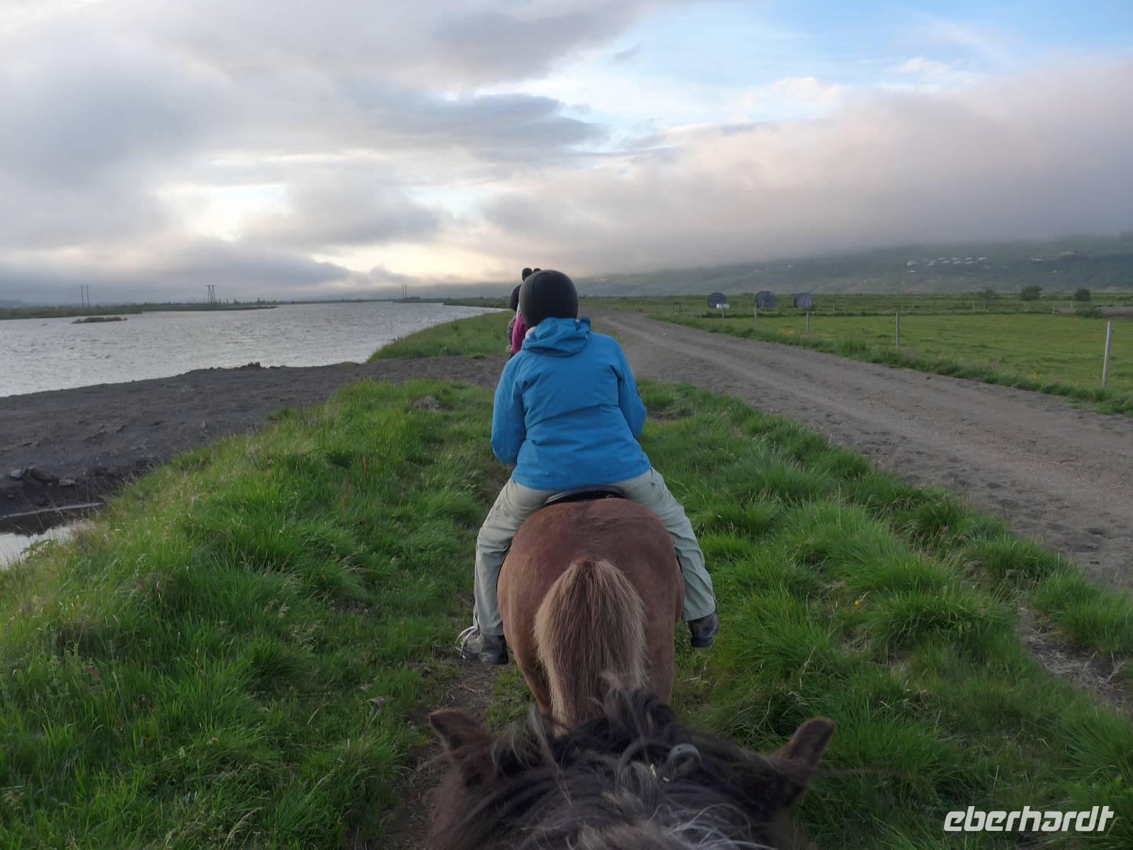 Im EDDA Hotel nahmen wir unser Abendessen ein und dann wurden wir abgeholt zum Reitausflug. Am Reiterhof gab es eine ausfühliche Belehrung, dann die Reithelme und schließlich die Pferde. Klaus war sehr traurig, daß er keine "Schecke" reiten durfte. Dann ging es los durch eine zauberhafte Landschaft am Fluß auf dem Rücken der Pferde. Die Tiere hatten unterschiedliche Tempramente und man mußte schon aufmerksam sein, um nicht vorzeitig "Abzusteigen". Es war herrlich und wir genossen die Abendstimmung mit aufziehenden Wolken. Die Jeeps brachten uns dann wieder zurück zum Hotel.