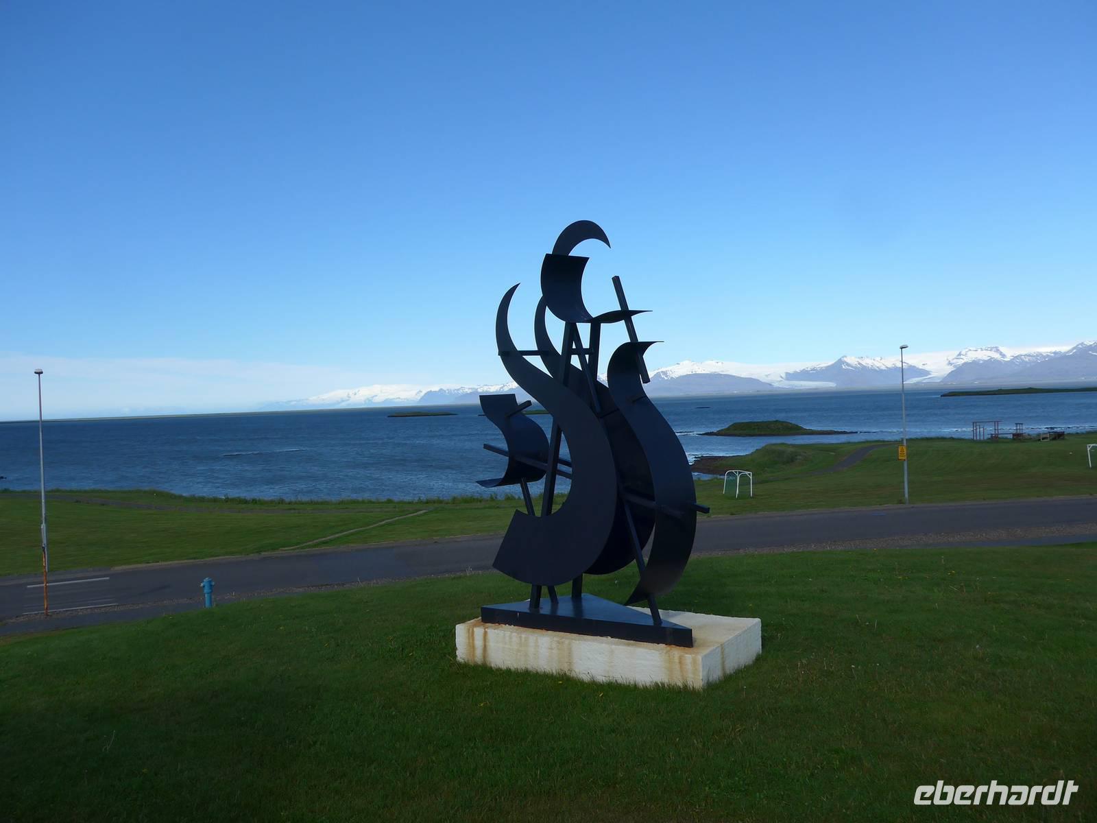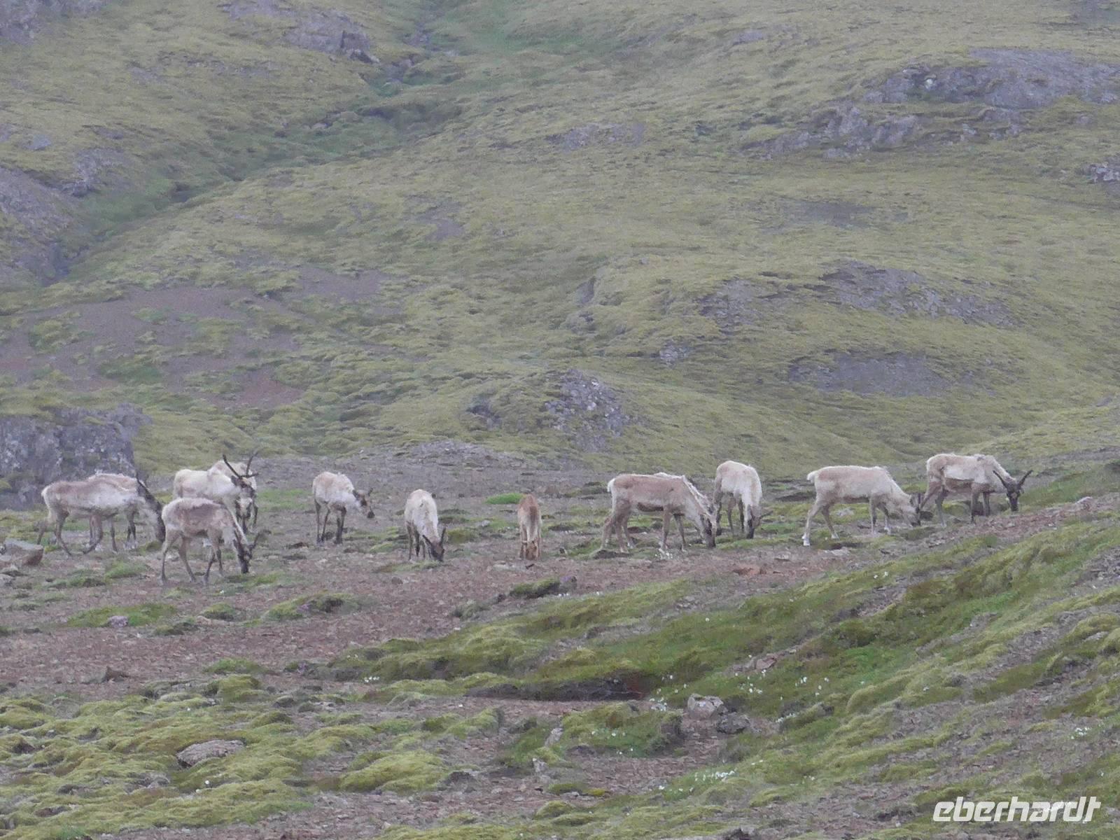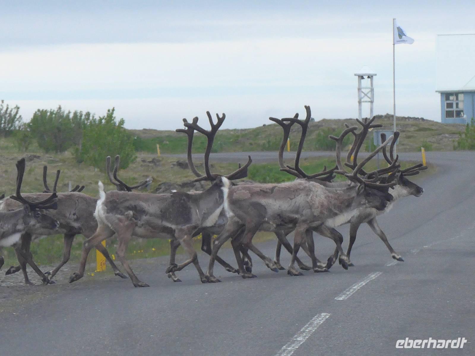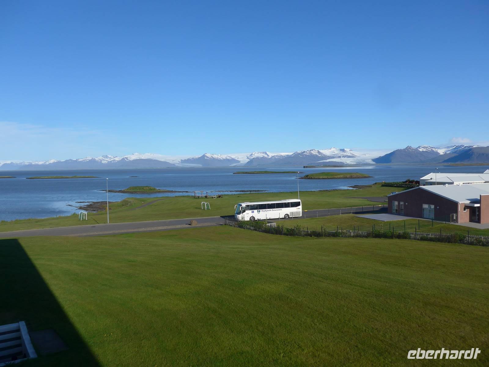 Unser Hotel lag in einem Wald, etwas ungewöhnlich für Island. Aber man ist in den letzten Jahren sehr um eine Aufforstung bemüht an verschiedenen Stellen der Insel. Nach dem Frühstück fuhren wir wieder mit unserem gesamten Gepäck los zur nächsten Unterkunft in Höfn. Die Route führte entlang der Ostfjorde durch eine sehr abwechslungsreiche und wunderschöne Landschaft immer an der Küste entlang. Wir sahen ein Aluminium-Werk direkt am Fjord und Aldis informierte uns über die umstrittene Politik zum Kraftwerksbau auf Island. In Petras Stein, einem botanischen Garten mit unzähligen Steinen - alle auf Island gefunden - machten wir unsere erste Besichtigungspause. Es war faszinierend, was doch alles auf Island zu finden ist. Sogar die Lava vom jüngsten Ausbruch war ausgestellt. In Djupivogur, einem der ältesten Handelsplätze auf Island, gab es Mittagessen mit heißer Suppe, Kuchen, Kaffee und Tee. Gleich nebenan, wo einst eine Fischfabrik war, hatte ein Künstler an der Hafenmauer 34 Rieseneier aus Granit ausgestellt. Es war interessant die unterschiedlichen Formen der Vogeleier zu sehen. Auf der Weiterfahrt erfuhren wir alles Wissenswerte zum einstigen dänischen Handelsmonopol auf Island und den daraus entstandenen katastrophalen Lebensbedingungen für die Bevölkerung. Nach einer Tunneldurchfahrt kurz vor Höfn war der Blick frei auf den riesigen Gletscher und eine völlig neuartige Landschaft war zu bestaunen. Zur Überraschung querte eine Rentierherde vor uns die Straße und wir konnte diese imposanten großen Tiere ganz aus der Nähe betrachten.