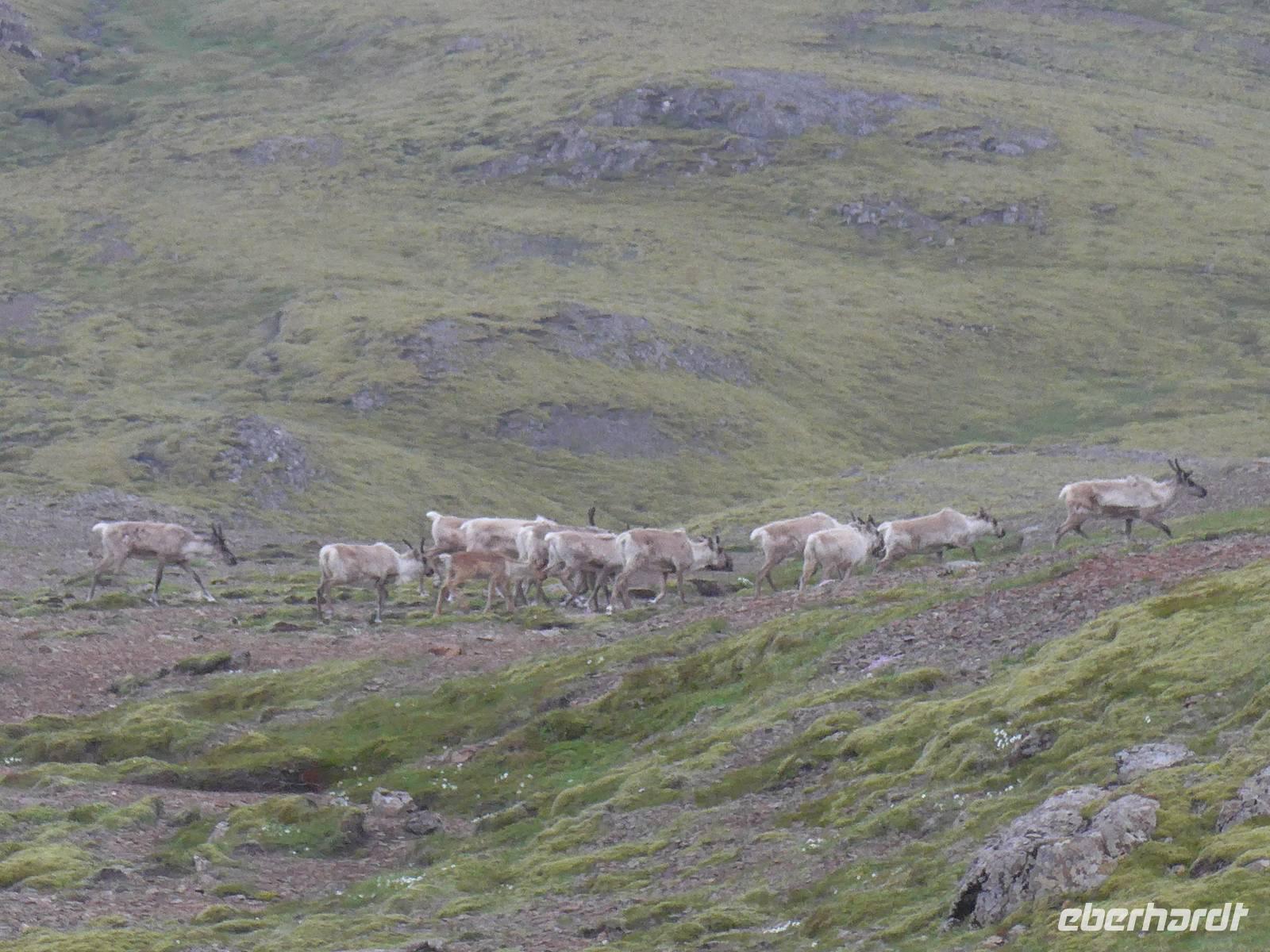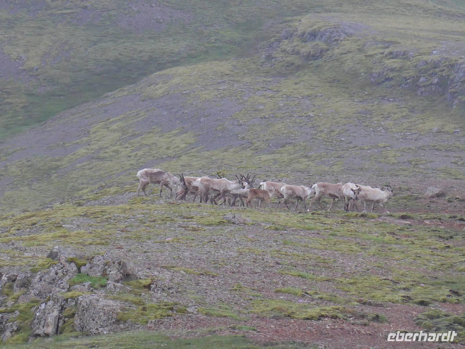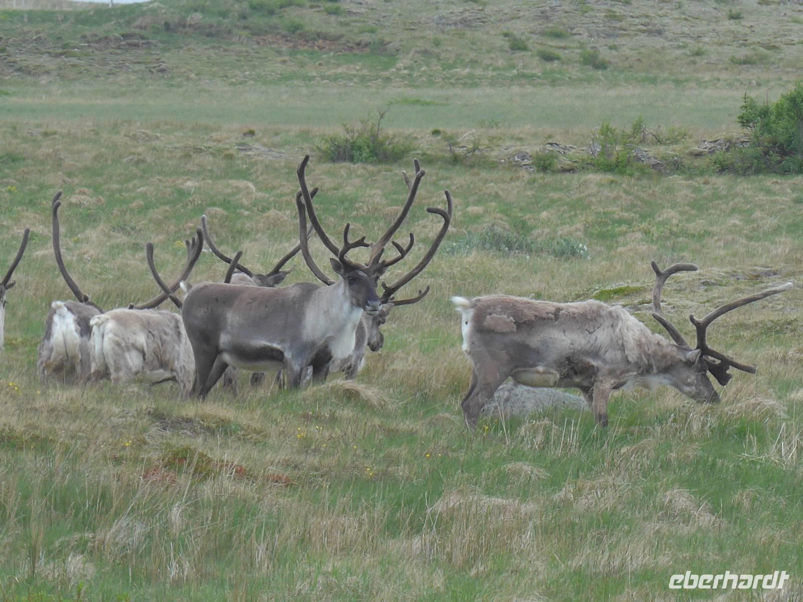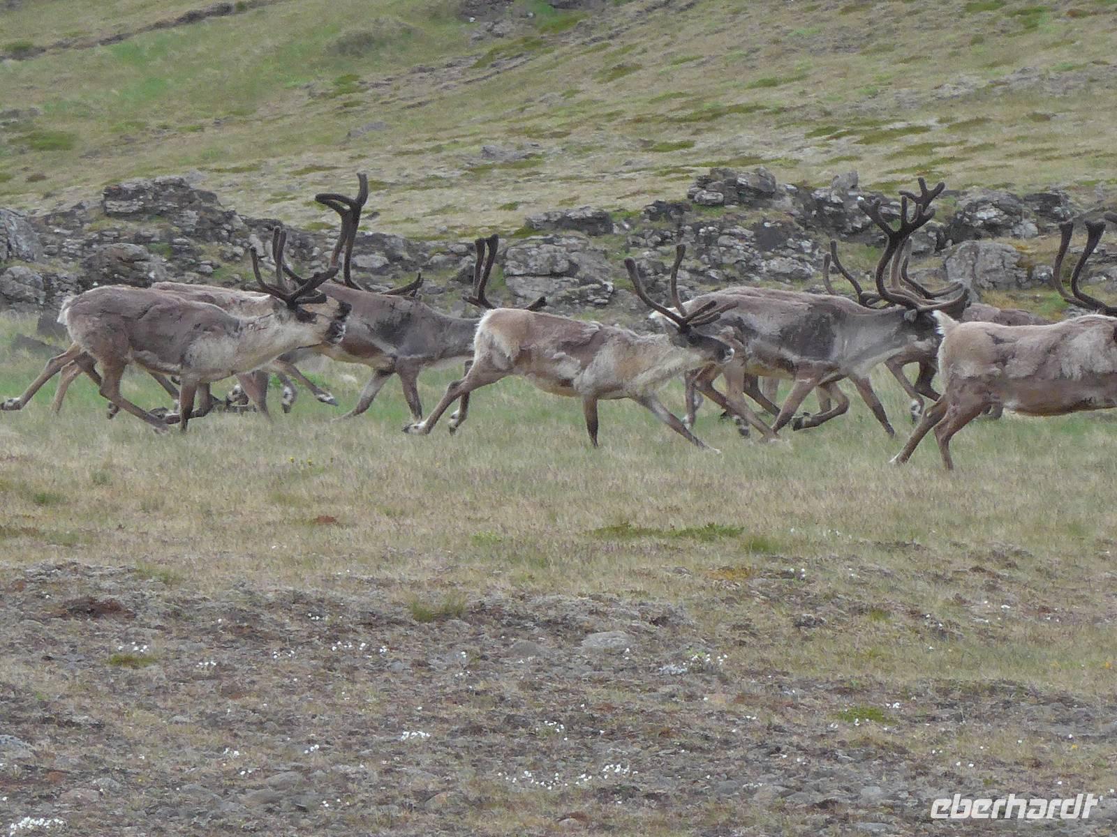 Unser Hotel lag in einem Wald, etwas ungewöhnlich für Island. Aber man ist in den letzten Jahren sehr um eine Aufforstung bemüht an verschiedenen Stellen der Insel. Nach dem Frühstück fuhren wir wieder mit unserem gesamten Gepäck los zur nächsten Unterkunft in Höfn. Die Route führte entlang der Ostfjorde durch eine sehr abwechslungsreiche und wunderschöne Landschaft immer an der Küste entlang. Wir sahen ein Aluminium-Werk direkt am Fjord und Aldis informierte uns über die umstrittene Politik zum Kraftwerksbau auf Island. In Petras Stein, einem botanischen Garten mit unzähligen Steinen - alle auf Island gefunden - machten wir unsere erste Besichtigungspause. Es war faszinierend, was doch alles auf Island zu finden ist. Sogar die Lava vom jüngsten Ausbruch war ausgestellt. In Djupivogur, einem der ältesten Handelsplätze auf Island, gab es Mittagessen mit heißer Suppe, Kuchen, Kaffee und Tee. Gleich nebenan, wo einst eine Fischfabrik war, hatte ein Künstler an der Hafenmauer 34 Rieseneier aus Granit ausgestellt. Es war interessant die unterschiedlichen Formen der Vogeleier zu sehen. Auf der Weiterfahrt erfuhren wir alles Wissenswerte zum einstigen dänischen Handelsmonopol auf Island und den daraus entstandenen katastrophalen Lebensbedingungen für die Bevölkerung. Nach einer Tunneldurchfahrt kurz vor Höfn war der Blick frei auf den riesigen Gletscher und eine völlig neuartige Landschaft war zu bestaunen. Zur Überraschung querte eine Rentierherde vor uns die Straße und wir konnte diese imposanten großen Tiere ganz aus der Nähe betrachten.