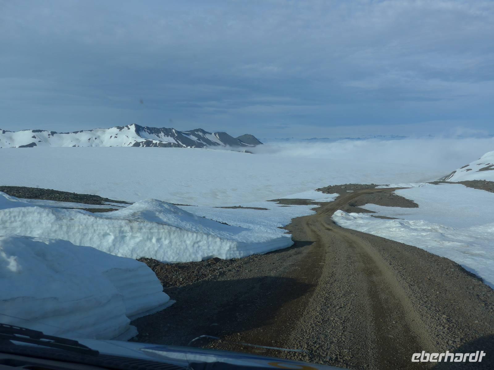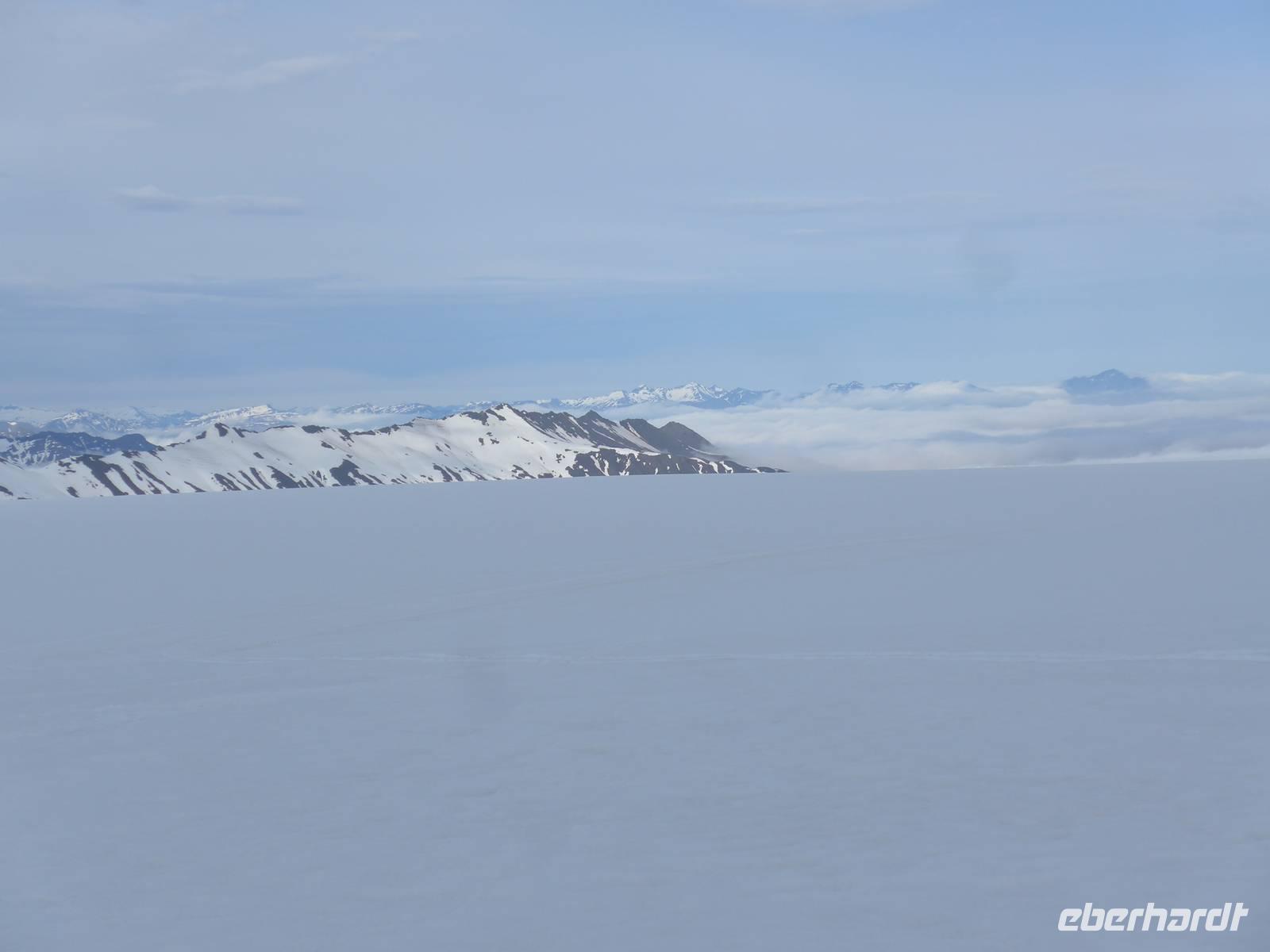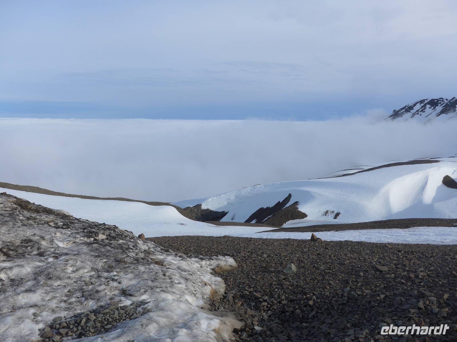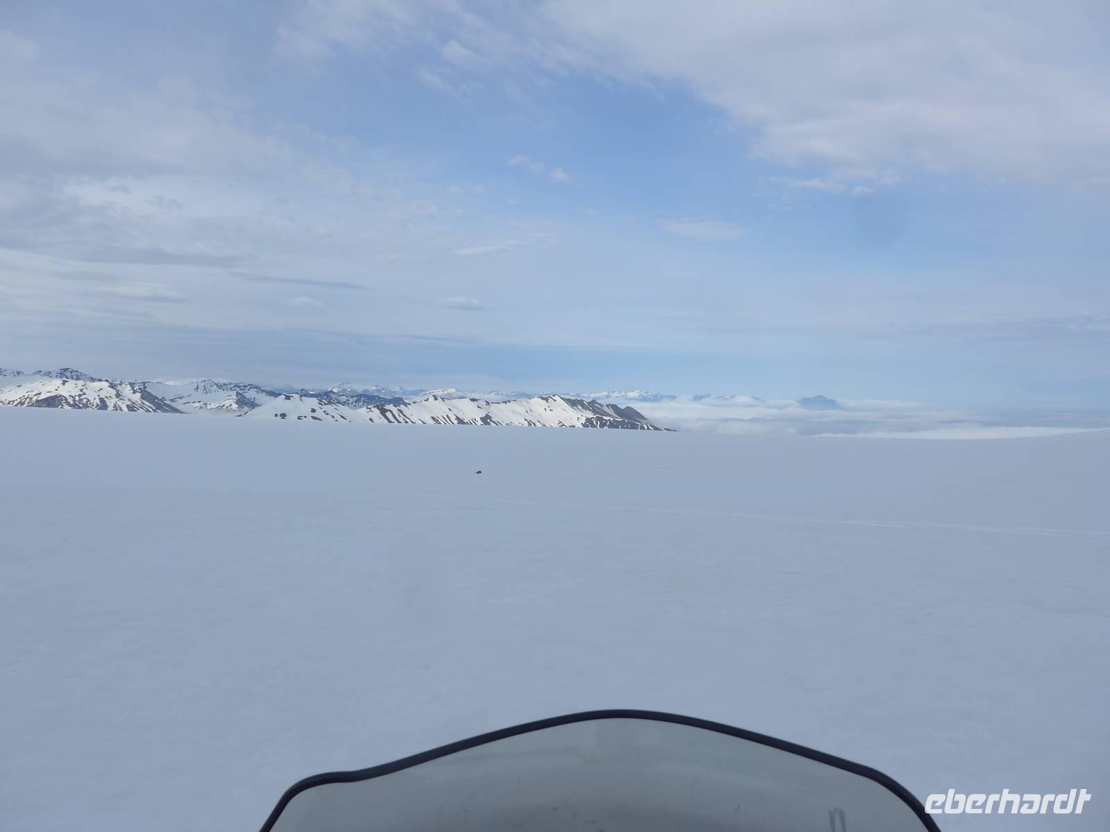 Am Nachmittag erreichten wir unser Hotel Höfn in Höfn, bezogen die Zimmer, kleideten uns warm ein und starteten dann gleich zu unserem Gletscherausflug. Wir waren alle sehr gespannt und neugierig. Ein geländegängiger Bus holte uns am Hotel ab und brachte uns hinauf zur Station am Rande des Gletschers. Die Fahrt hinauf ging durch eine dicke Wolkenschicht und kurz vor der Station empfing uns die Sonne. Wir erhielten Gummistiefel, einen Overal und einen Helm und danach die Einweisung für die Schneemobile. 6 Gäste fuhren mit dem Jeep auf den Gletscher. Es ging gleich steil bergan und man hatte Mühe, den Motorschlitten in der Spur zu halten. Aber es machte unglaublich viel Spaß und oben auf dem Gletscher hatten wir eine fantastische Sicht auf die weiter entfernten, schneebedeckten Bergketten. Zweimal machten wir Fotostopps mit Jeep und Motorschlitten und dann ging es leider schon wieder zurück zur Station. Mit dem Bus fuhren wir zurück ins Tal und sahen unterwegs am Berg nochmals eine Rentierherde. Nach 20 Uhr waren wir im Hotel und hatten beim Abendessen viel zu erzählen. Vom Hotel aus konnte man den Gletscher mit seinen Zungen sehr gut sehen und da es nicht dunkel wurde, war er ständig in ein anderes Licht getaucht.