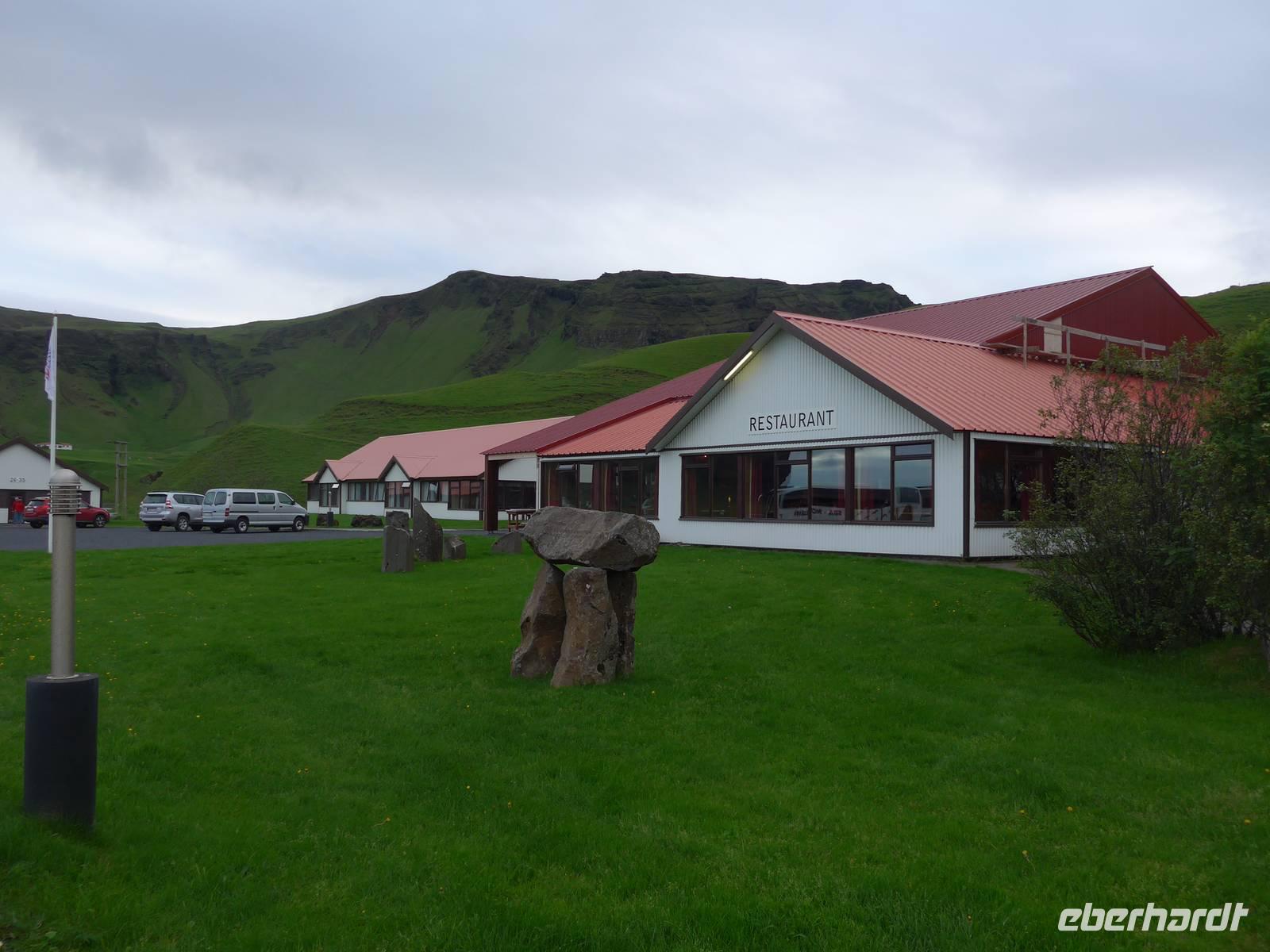 Gut gestärkt brachte uns Aldis mit dem Bus zum Svinafellsjökull, wo man einen schmalen Weg ganz dicht am zerklüffteten Gletscher hinauf gehen konnte und so den Gletscher aus nächster Nähe bewundern durfte. Wir waren beeindruckt von den riesigen Gletscherspalten, die so groß wie Täler aussahen. Am Nachmittag stand noch das Besucherzentrum Skaftafell auf dem Programm, wo wir einen Film über Island sahen. Das arktische Weidenröschen sahen wir dort auch auf der Wiese und ich pflückte eines für unseren Bus. Die Landschaft war mystisch, mal dunkel, mal hell und wir durchfuhren eine riesige Sandwüste, wo einst die längste Brück im Süden stand. Bei einem Vulkanausbruch wurde sie von den Wassermassen weggerissen und heute ist nur noch ein Brückenfragment als Denkmal zu sehen. Wir kamen am Hof des ehemaligen Postreiters vorbei und Aldis erzählte von seiner gefährlichen Arbeit. In Kirkjubaejarklaustur machten wir eine Pause und Aldis spendierte Eis. Wir kamen der Katla immer näher und um sie friedlich zu stimmen, baute jeder von uns ein Steinmännchen am Straßenrand. Kurz darauf erreichten wir unser Hotel Katla-Höfdabrekka. Es war urgemütlich mit viel Holz und wir stärkten uns beim köstlichen Abendbuffet.