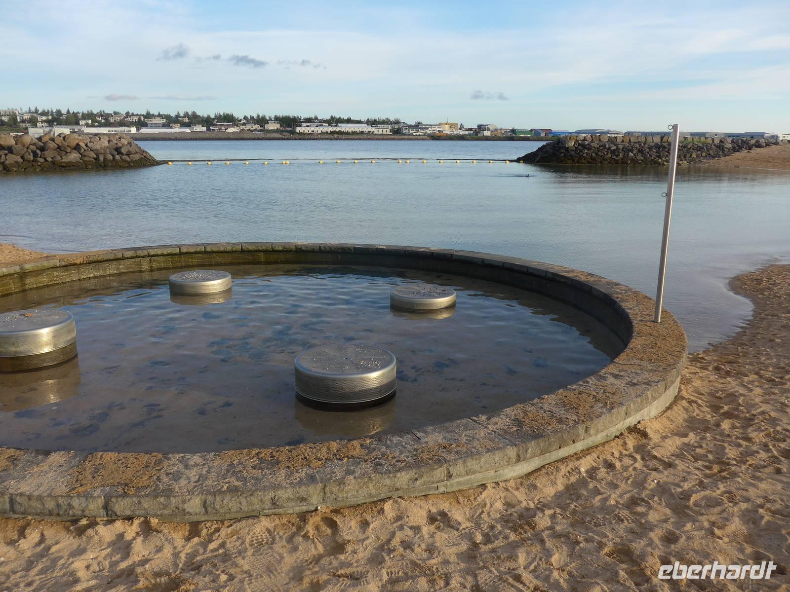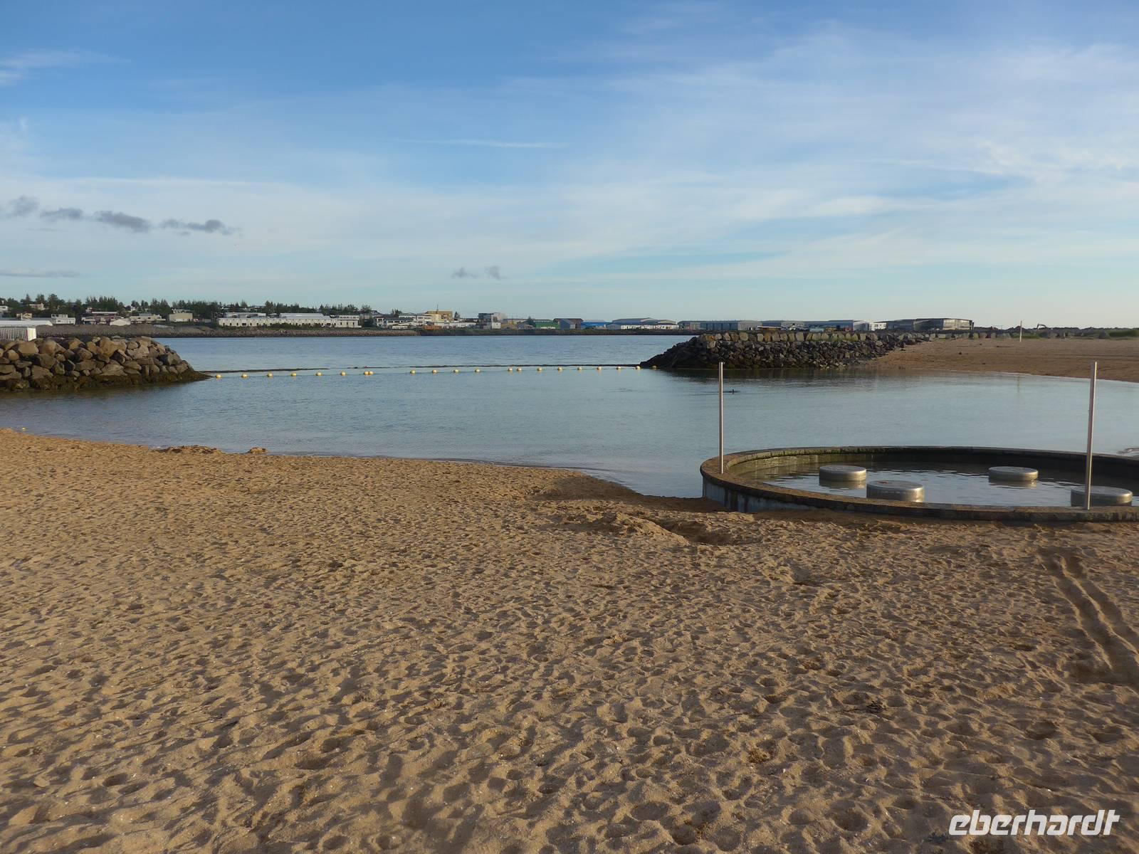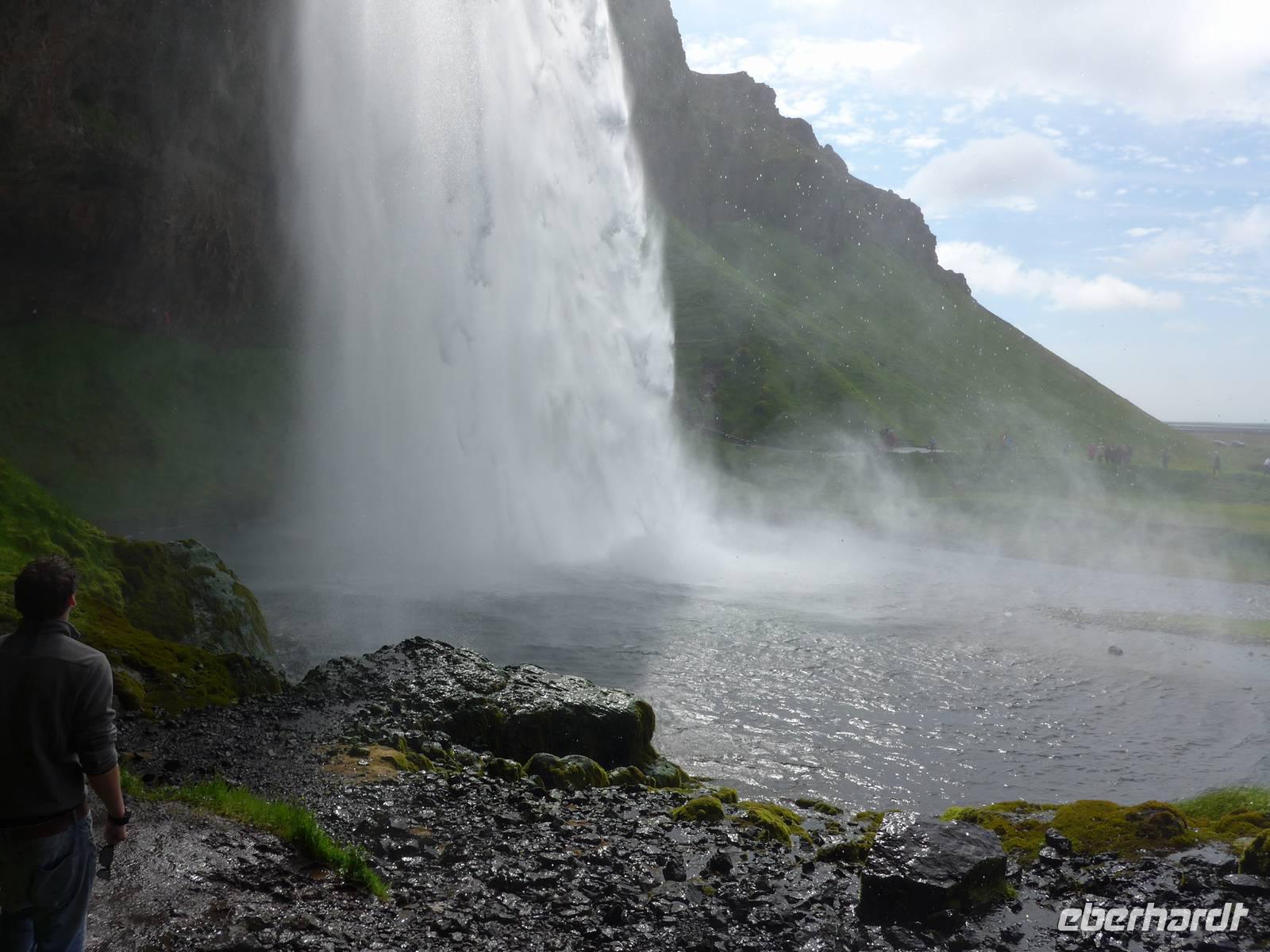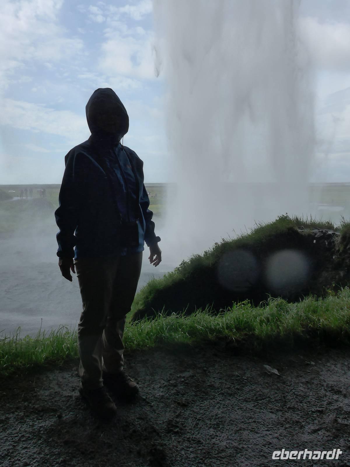 Aber das war noch nicht genug, denn unweit gab es noch den Seljaland Wasserfall zu erkunden. Ein Weg führte hinter dem Wasserfall entlang und das war ein ganz besonderes und feuchtes Erlebnis. Die Weiterfahrt ging nun direkt nach Reykjavik. Wir kamen vorbei an einem der teuersten Hotels Islands , dem Ranga-Hotel und überquerten den längsten Fluß der Insel. In Reykjavik nahmen wir Abschied am Perlan, wo vor 8 Tagen unsere unvergeßliche Reise begonnen hatte. Wir gingen mit Aldis auf der Plattform eine Runde und genossen die Aussicht auf Reykjavik bei herrlichem Sonnenschein. Aldis brachte uns zum Icelandair Hotel Natura und dort verabschiedeten wir uns von ihr mit einem großen Dankeschön. Im Restaurant "SATT" aßen wir zum letzten Mal gemeinsam und sagten ade unsere Teilnehmer, die nach Frankfurt flogen. Nach dem Essen erkundeten wir den Stadtstrand von Reykjavik. Dort fließt das überschüssige heiße Wasser ins Meer und die Badetemperatur ist das ganze Jahr über im Atlantik an dieser Stelle sehr angenehm.
