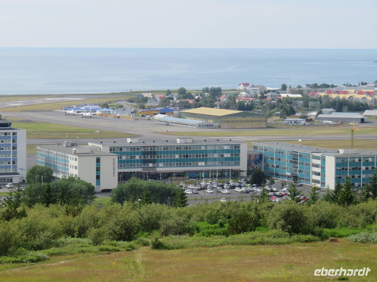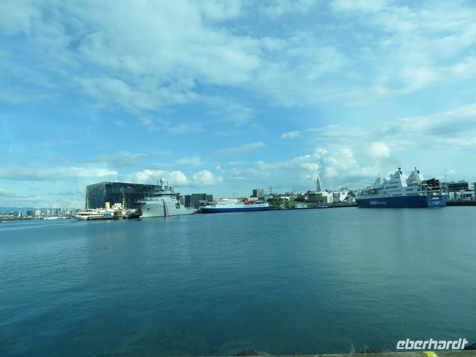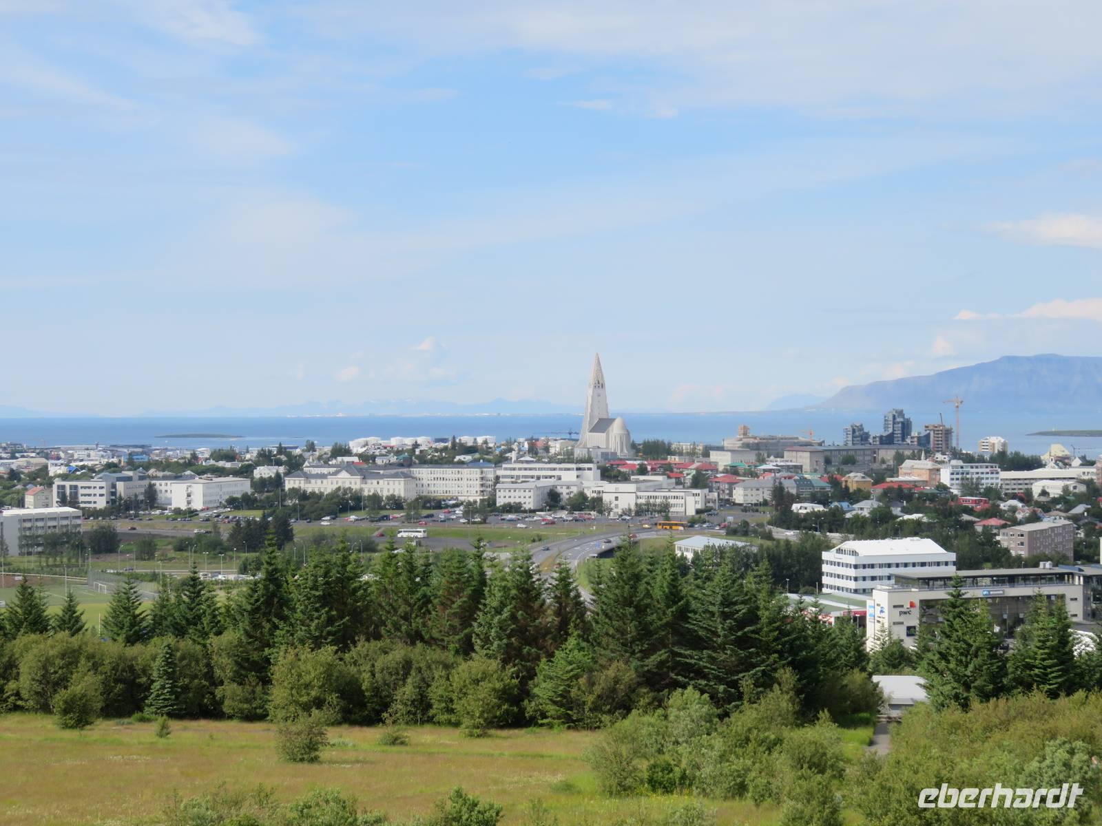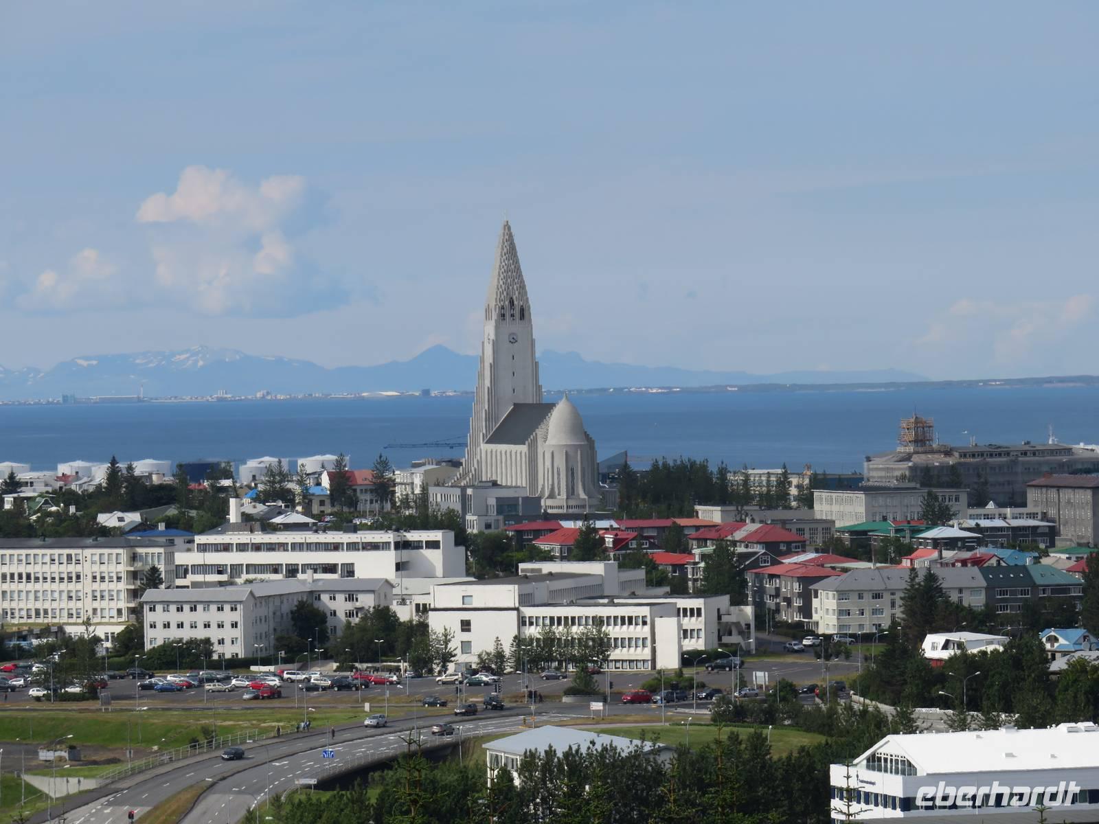 Unser Haustür-Transfer-Service brachte uns pünktlich nach Berlin-Schönefeld, wo wir auf die Gäste trafen, die individuell nach Berlin angereist waren. Gemeinsam gingen wir zum Check In der WOW Air. Jetzt heiß es für uns erst mal Geduld zeigen, denn der Check In verlief zwar problemlos aber sehr langsam. Nachdem wir die Sicherheitskontrolle passiert hatten ging es direkt zum Gate und in das Flugzeug. Der Flug verlief sehr angenehm und teilweise hatten wir bereits aus der Luft einen schönen Blick auf Island und die faszinierende Landschaft mit Gletschern, Schneefeldern, Vulkanen und Lagunen. In Keflavík am Flughafen erwartete uns bereits Rosa, unsere Reiseleiterin für unsere Reise. Wir fuhren zunächst zu einer Bank, um uns mit Isländischen Kronen zu versorgen. Dann ging es durch die Landschaft, die vom Vulkanismus geprägt ist, und eine ganz eigene Faszination ausstrahlt, nach Reykjavík. Unser erstes Ziel war der Perlan, ursprünglich als Thermalwasserspeicher erbaut, thront das architektonisch sehr interessante Bauwerk über der Stadt und beherbergt heute ein Restaurant, ein Cafe und verschiedene Ausstellungen. Wir gingen auf die Aussichtsplattform und hatten einen fantastischen Blick über die Stadt und die sie umgebende Landschaft. Wir ließen unsere Blicke schweifen und anschließend musste natürlich noch das Eis, welches uns von Kollegen bereits angepriesen wurde, probiert werden. Wir kauften uns fast alle eine Kugel Eis. Man hatte uns nicht zu viel versprochen und das Eis war sehr lecker - es gab neben uns bekannten Sorten, aber auch ungewöhnliche, wie zum Beispiel Lakritz-Eis. Wir hatten bereits die Hallgrimskirkja gesehen. Sie war unser nächstes Ziel. Die Kirche dominiert die Stadt und ist von überall zu sehen. Der Betonbau erinnert an die Basaltsäulen der Vulkanregion und wurde nach 40jähriger Bauzeit 1986 geweiht. Der lichtdurchflutete Innenraum der evangelischen Kirche ist ganz schlicht gestaltet und wird von der Orgel mit 5275 Pfeifen und 72 Registern dominiert. Es finden regelmäßig Orgelkonzerte statt, da die Kirche über eine ausgezeichnete Akustik verfügt. Vor der Kirche befindet sich das Denkmal von Leifur Eriksson auf einem Granitsockel. Er gilt ebenfalls als Entdecker Amerikas. Anschließend fuhren wir durch die Innenstadt von Reykjavík. Wir sahen das Rathaus, die typischen aus Wellblech gebauten Häuser, das neue Konzerthaus am Hafen und den Hafen. Am frühen Abend erreichten wir unser Hotel, welches sich am Inlandsflughafen befand unterhalb des Perlan. Nach dem wir unsere Zimmer bezogen, wurden wir mit einem sehr schmackhaften Abendessen im Hotelrestaurant verwöhnt. Es war bereits nach 21.00 Uhr als wir mit dem Essen fertig waren und die Sonne stand immer noch sehr hoch. In dieser Nacht - wie wohl in den nächsten auch - sollte es nie richtig dunkel werden.