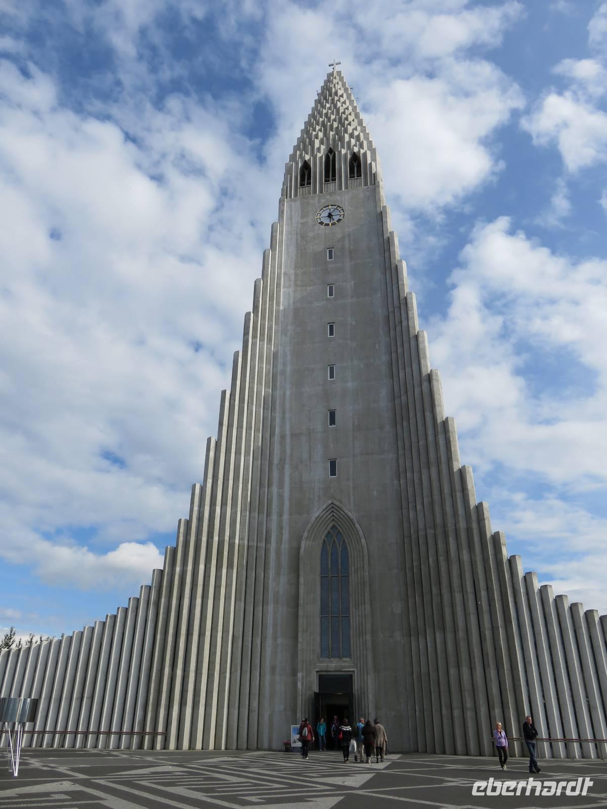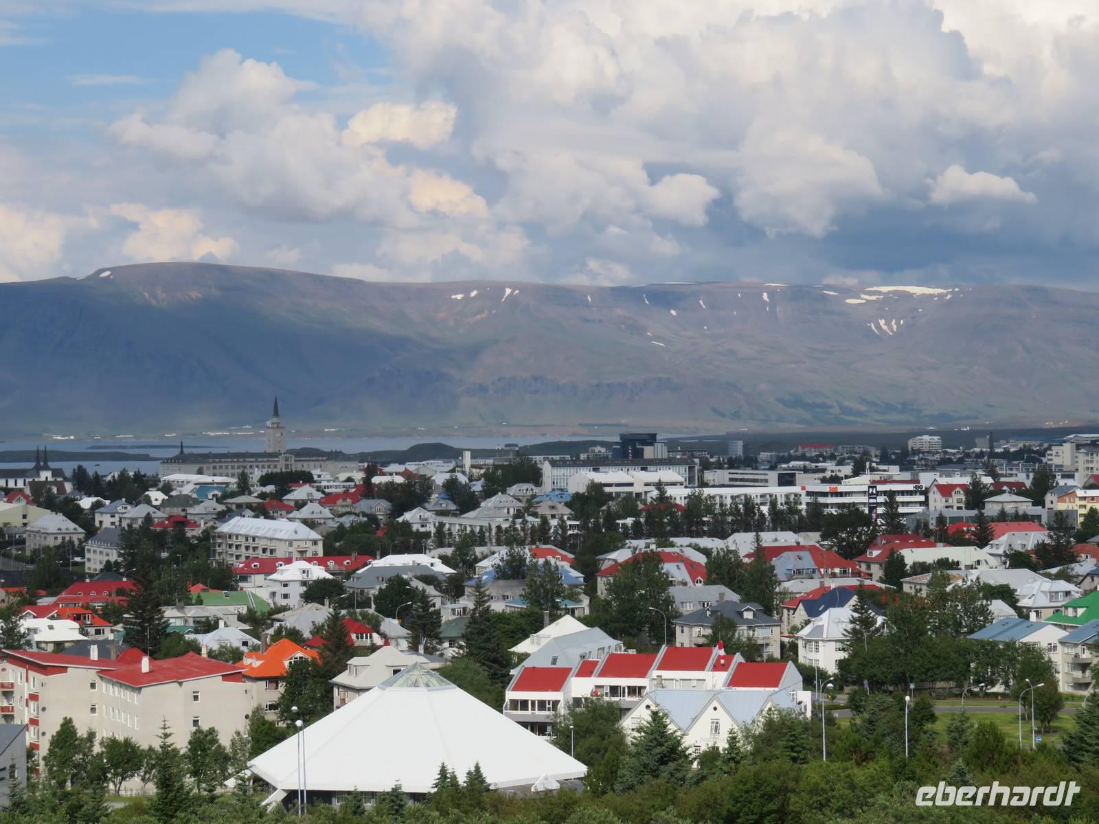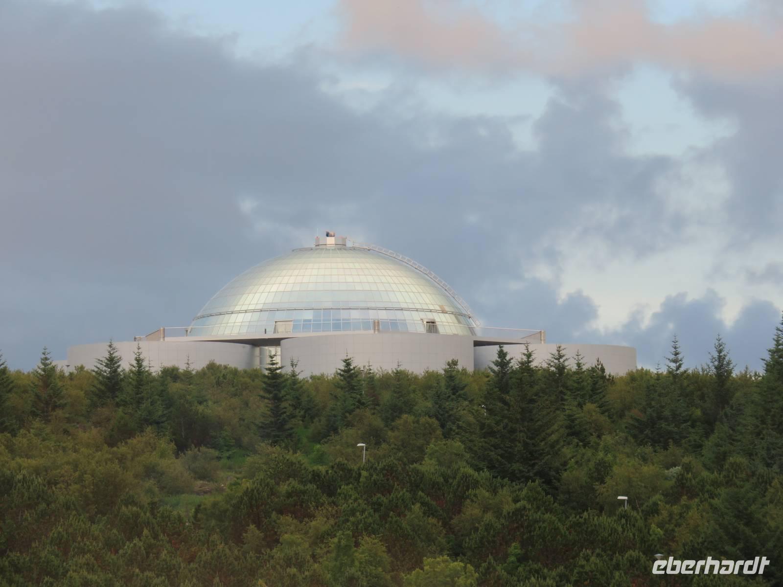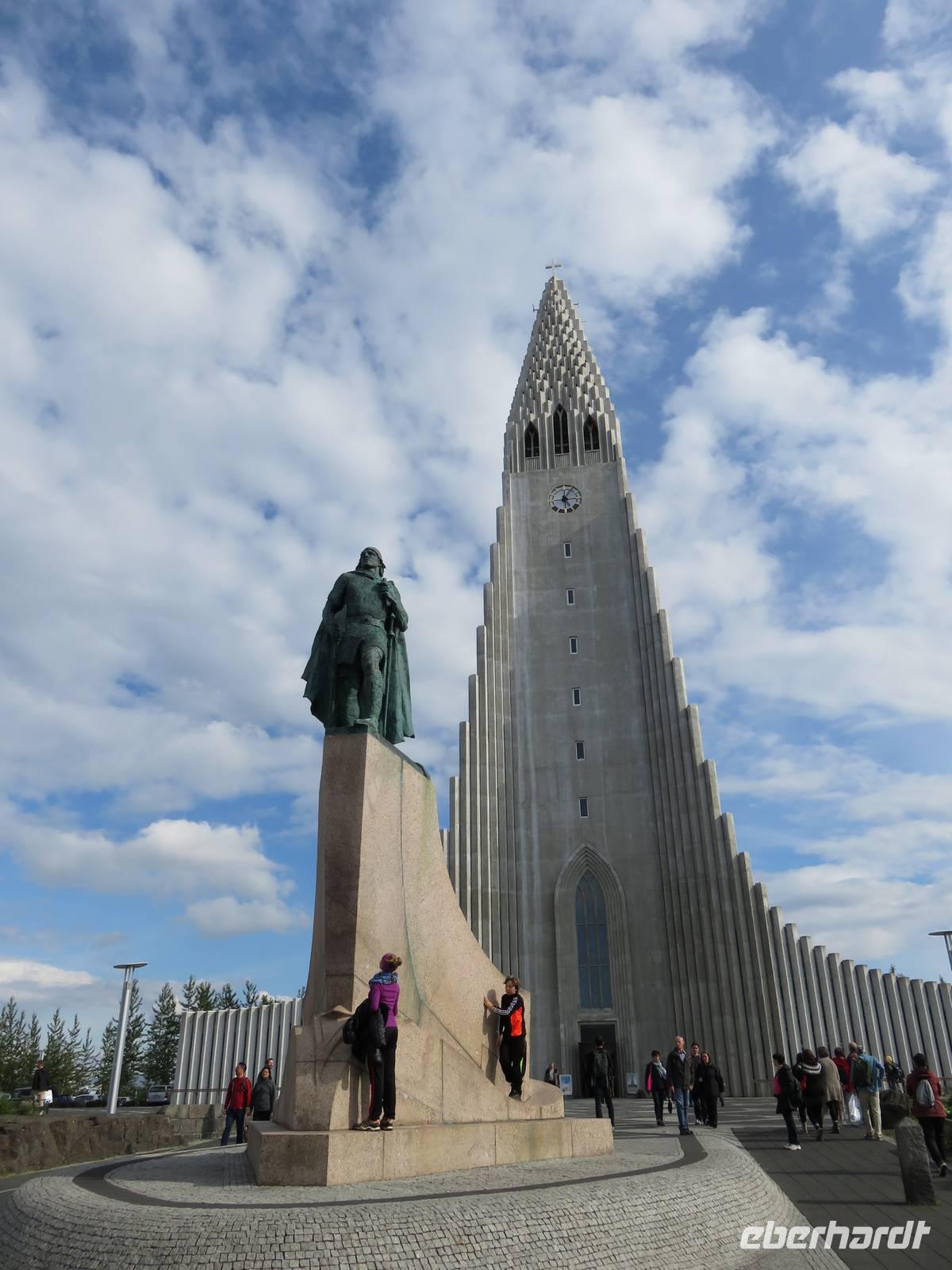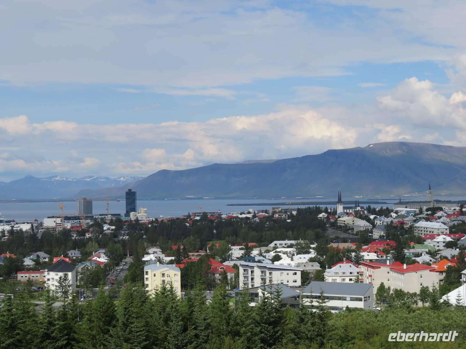 Unser Haustür-Transfer-Service brachte uns pünktlich nach Berlin-Schönefeld, wo wir auf die Gäste trafen, die individuell nach Berlin angereist waren. Gemeinsam gingen wir zum Check In der WOW Air. Jetzt heiß es für uns erst mal Geduld zeigen, denn der Check In verlief zwar problemlos aber sehr langsam. Nachdem wir die Sicherheitskontrolle passiert hatten ging es direkt zum Gate und in das Flugzeug. Der Flug verlief sehr angenehm und teilweise hatten wir bereits aus der Luft einen schönen Blick auf Island und die faszinierende Landschaft mit Gletschern, Schneefeldern, Vulkanen und Lagunen. In Keflavík am Flughafen erwartete uns bereits Rosa, unsere Reiseleiterin für unsere Reise. Wir fuhren zunächst zu einer Bank, um uns mit Isländischen Kronen zu versorgen. Dann ging es durch die Landschaft, die vom Vulkanismus geprägt ist, und eine ganz eigene Faszination ausstrahlt, nach Reykjavík. Unser erstes Ziel war der Perlan, ursprünglich als Thermalwasserspeicher erbaut, thront das architektonisch sehr interessante Bauwerk über der Stadt und beherbergt heute ein Restaurant, ein Cafe und verschiedene Ausstellungen. Wir gingen auf die Aussichtsplattform und hatten einen fantastischen Blick über die Stadt und die sie umgebende Landschaft. Wir ließen unsere Blicke schweifen und anschließend musste natürlich noch das Eis, welches uns von Kollegen bereits angepriesen wurde, probiert werden. Wir kauften uns fast alle eine Kugel Eis. Man hatte uns nicht zu viel versprochen und das Eis war sehr lecker - es gab neben uns bekannten Sorten, aber auch ungewöhnliche, wie zum Beispiel Lakritz-Eis. Wir hatten bereits die Hallgrimskirkja gesehen. Sie war unser nächstes Ziel. Die Kirche dominiert die Stadt und ist von überall zu sehen. Der Betonbau erinnert an die Basaltsäulen der Vulkanregion und wurde nach 40jähriger Bauzeit 1986 geweiht. Der lichtdurchflutete Innenraum der evangelischen Kirche ist ganz schlicht gestaltet und wird von der Orgel mit 5275 Pfeifen und 72 Registern dominiert. Es finden regelmäßig Orgelkonzerte statt, da die Kirche über eine ausgezeichnete Akustik verfügt. Vor der Kirche befindet sich das Denkmal von Leifur Eriksson auf einem Granitsockel. Er gilt ebenfalls als Entdecker Amerikas. Anschließend fuhren wir durch die Innenstadt von Reykjavík. Wir sahen das Rathaus, die typischen aus Wellblech gebauten Häuser, das neue Konzerthaus am Hafen und den Hafen. Am frühen Abend erreichten wir unser Hotel, welches sich am Inlandsflughafen befand unterhalb des Perlan. Nach dem wir unsere Zimmer bezogen, wurden wir mit einem sehr schmackhaften Abendessen im Hotelrestaurant verwöhnt. Es war bereits nach 21.00 Uhr als wir mit dem Essen fertig waren und die Sonne stand immer noch sehr hoch. In dieser Nacht - wie wohl in den nächsten auch - sollte es nie richtig dunkel werden.