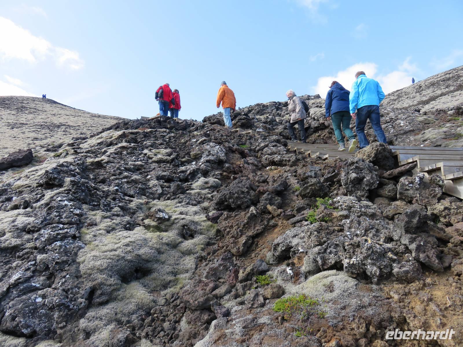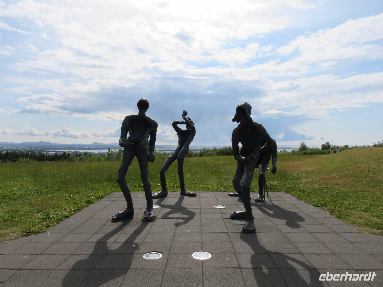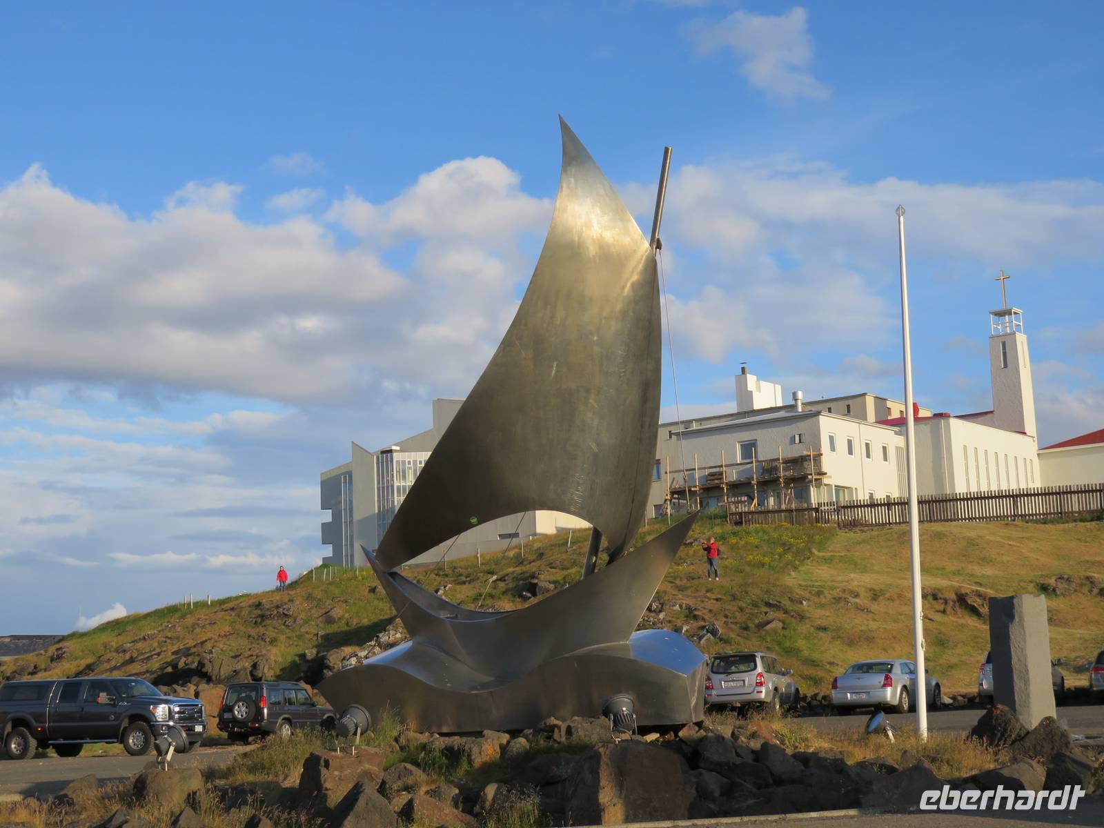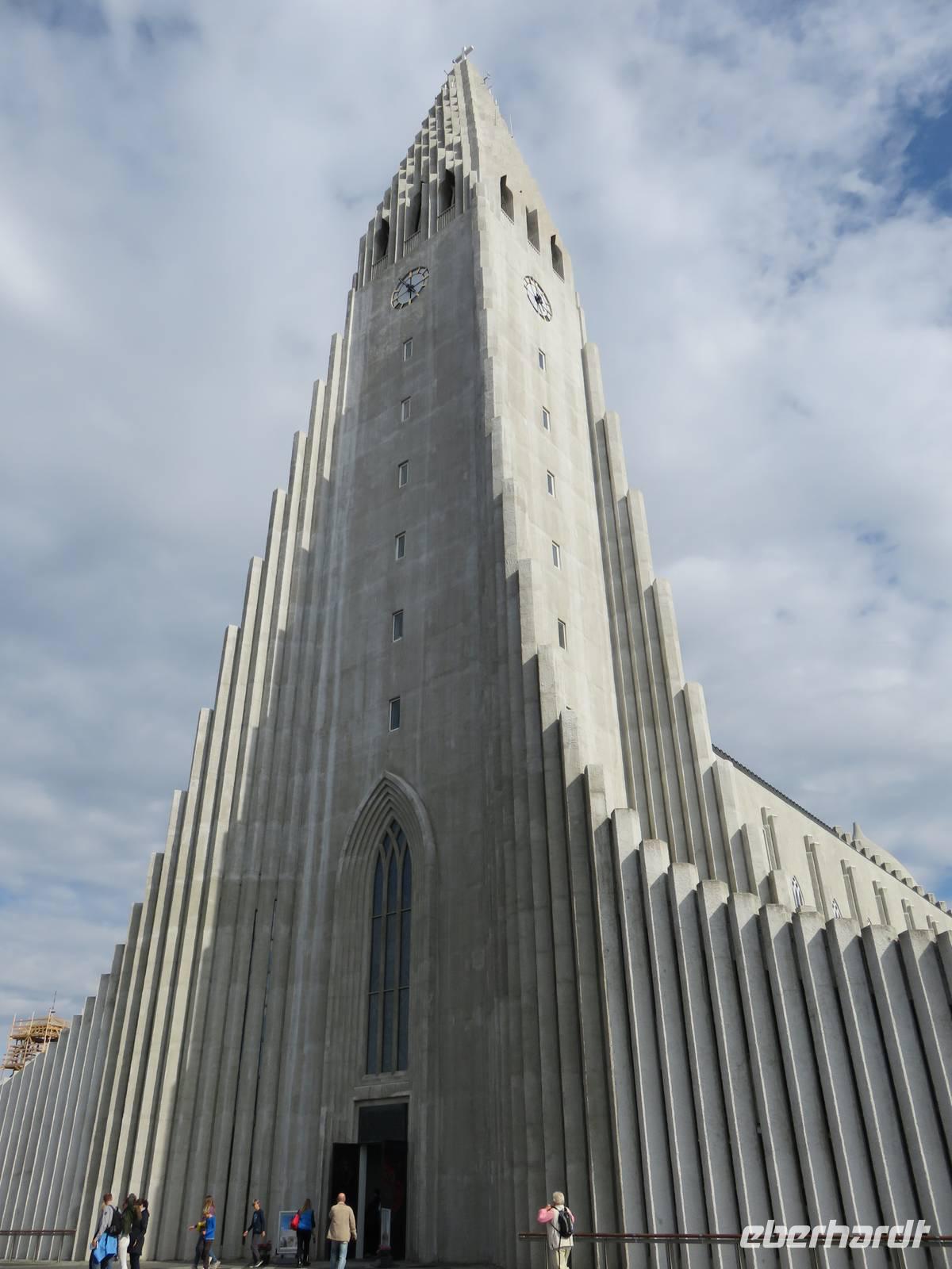 Unser Haustür-Transfer-Service brachte uns pünktlich nach Berlin-Schönefeld, wo wir auf die Gäste trafen, die individuell nach Berlin angereist waren. Gemeinsam gingen wir zum Check In der WOW Air. Jetzt heiß es für uns erst mal Geduld zeigen, denn der Check In verlief zwar problemlos aber sehr langsam. Nachdem wir die Sicherheitskontrolle passiert hatten ging es direkt zum Gate und in das Flugzeug. Der Flug verlief sehr angenehm und teilweise hatten wir bereits aus der Luft einen schönen Blick auf Island und die faszinierende Landschaft mit Gletschern, Schneefeldern, Vulkanen und Lagunen. In Keflavík am Flughafen erwartete uns bereits Rosa, unsere Reiseleiterin für unsere Reise. Wir fuhren zunächst zu einer Bank, um uns mit Isländischen Kronen zu versorgen. Dann ging es durch die Landschaft, die vom Vulkanismus geprägt ist, und eine ganz eigene Faszination ausstrahlt, nach Reykjavík. Unser erstes Ziel war der Perlan, ursprünglich als Thermalwasserspeicher erbaut, thront das architektonisch sehr interessante Bauwerk über der Stadt und beherbergt heute ein Restaurant, ein Cafe und verschiedene Ausstellungen. Wir gingen auf die Aussichtsplattform und hatten einen fantastischen Blick über die Stadt und die sie umgebende Landschaft. Wir ließen unsere Blicke schweifen und anschließend musste natürlich noch das Eis, welches uns von Kollegen bereits angepriesen wurde, probiert werden. Wir kauften uns fast alle eine Kugel Eis. Man hatte uns nicht zu viel versprochen und das Eis war sehr lecker - es gab neben uns bekannten Sorten, aber auch ungewöhnliche, wie zum Beispiel Lakritz-Eis. Wir hatten bereits die Hallgrimskirkja gesehen. Sie war unser nächstes Ziel. Die Kirche dominiert die Stadt und ist von überall zu sehen. Der Betonbau erinnert an die Basaltsäulen der Vulkanregion und wurde nach 40jähriger Bauzeit 1986 geweiht. Der lichtdurchflutete Innenraum der evangelischen Kirche ist ganz schlicht gestaltet und wird von der Orgel mit 5275 Pfeifen und 72 Registern dominiert. Es finden regelmäßig Orgelkonzerte statt, da die Kirche über eine ausgezeichnete Akustik verfügt. Vor der Kirche befindet sich das Denkmal von Leifur Eriksson auf einem Granitsockel. Er gilt ebenfalls als Entdecker Amerikas. Anschließend fuhren wir durch die Innenstadt von Reykjavík. Wir sahen das Rathaus, die typischen aus Wellblech gebauten Häuser, das neue Konzerthaus am Hafen und den Hafen. Am frühen Abend erreichten wir unser Hotel, welches sich am Inlandsflughafen befand unterhalb des Perlan. Nach dem wir unsere Zimmer bezogen, wurden wir mit einem sehr schmackhaften Abendessen im Hotelrestaurant verwöhnt. Es war bereits nach 21.00 Uhr als wir mit dem Essen fertig waren und die Sonne stand immer noch sehr hoch. In dieser Nacht - wie wohl in den nächsten auch - sollte es nie richtig dunkel werden.