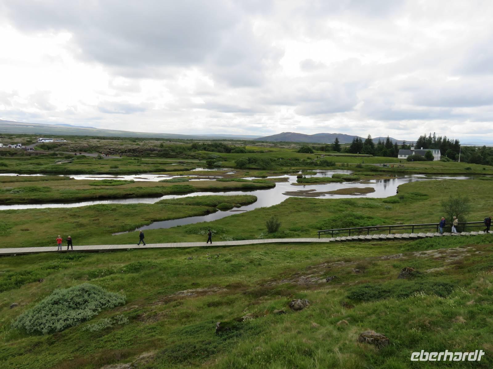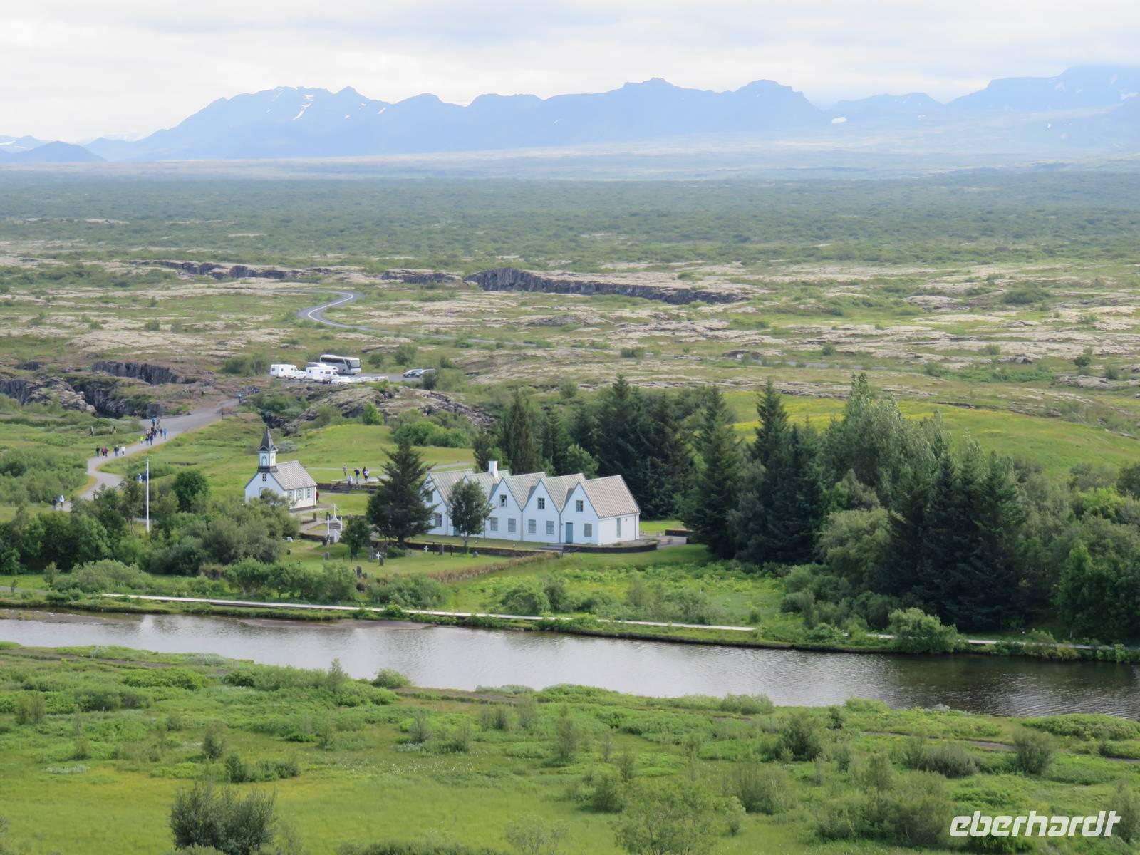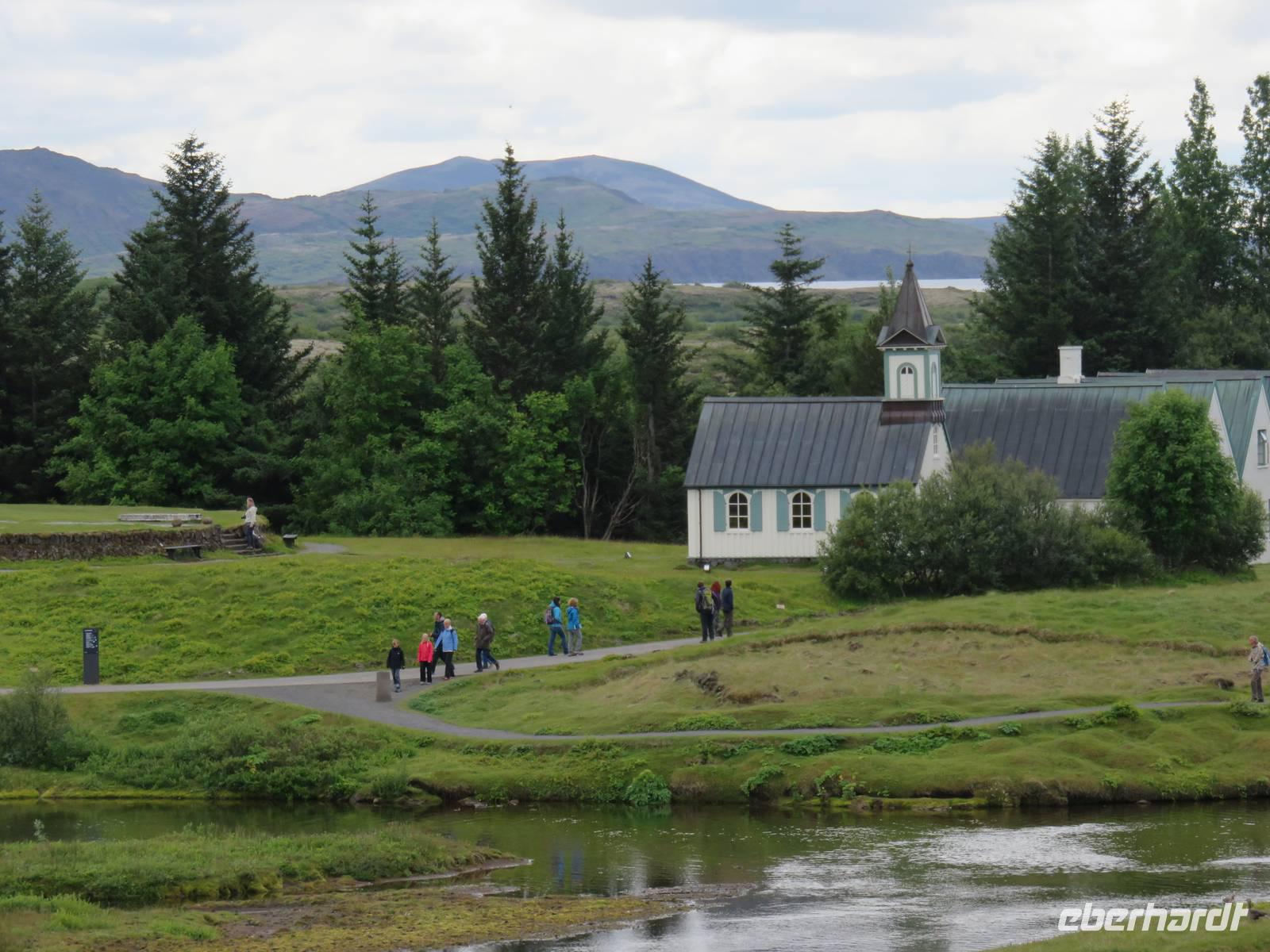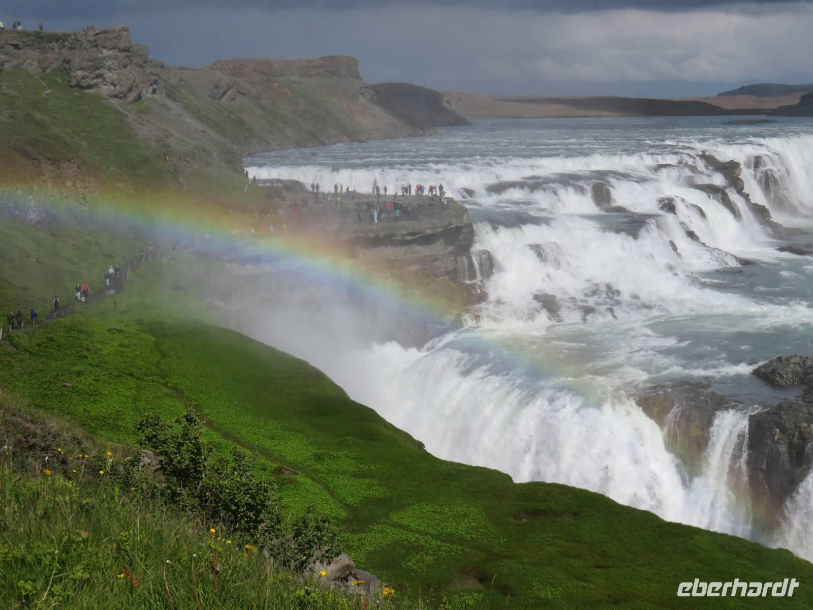 Nach dem Frühstück fuhren wir zunächst ans Meer. Hier befindet sich ein hübsches Holzhaus, in dem 1986 ein Treffen zwischen Michael Gorbatschow und Ronald Reagan stattfand. Nach dem kurzen Fotostopp führte uns unsere Reise weiter zum Pingvellir-Nationalpark. Dies war der Ort, seit 930 die freien Männer Island zum Althing einmal im Jahr zu Mittsommer trafen. Die Versammlung war gesetzesgebende und rechtssprechendes Gremium, in dessen direkter Nachfolge sich das isländische Parlament bis heute sieht. Noch aus einem anderen Grund interessant, denn auf Island triften die eurasische und die amerikanische Platte auseinander. Wir standen auf der amerikanischen Platte und sahen in 7 Kilometern Entfernung die eurasische Platte. Nach einem Spaziergang durch den Nationalpark setzten wir unsere Fahrt fort. Unser nächstes Ziel sollten die Geysire sein. Wir fuhren durch weite Lavafelder und erreichten das Geothermalgebiet. Hier stärkten wir uns zunächst mit einem kleinen Imbiss. Nun waren wir gespannt auf die Aktivitäten des Geysirs. Bereits von weitem sahen wir schon die Dampfsäulen und ein leichter Schwefelgeruch lag auch in der Luft. Wir sahen ganz kleine Geysire, die nur leicht brodelten und verschiedene Stellen, wo Dampf aus der Erdoberfläche drang. Dann kamen wir zum Strokkur, dem Geysir, der aller paar Minuten sein Wasser in die Höhe von ca. 10 bis 20 Metern schießen lässt. Es war sehr beeindruckend, diesem Naturschauspiel zuzuschauen. Uns blieb genügend Zeit, mehrere Wasserfontänen beobachten zu können. In diesem Geothermalfeld befindet sich der Namensgeber aller Springquellen, der große Geysir. Er ist jedoch nicht mehr aktiv. Nach unserem Aufenthalt bei den Geysiren ging es weiter über den Goldenen Kreis zum Gullfosswasserfall. Wir spazierten zunächst an der oberen Kante entlang und ließen unsere Blicke über den 70 Meter tiefen Wasserfall schweifen. Petrus war uns hold und schickte uns sogar einen wunderschönen Regenbogen am Rand des beeindruckenden und größten Wasserfalls Islands. Natürlich gingen wir die Treppen hinunter und ganz nah an die tosenden Wasser heran. Nach einem ausgiebigen Aufenthalt brachte uns dann unser Bus wieder nach Reykjavík zurück. Am Abend gingen wir in kleineren Gruppen nochmals in die Stadt und aßen zu Abend. Ein sehr erlebnisreicher Tag ging zu Ende.