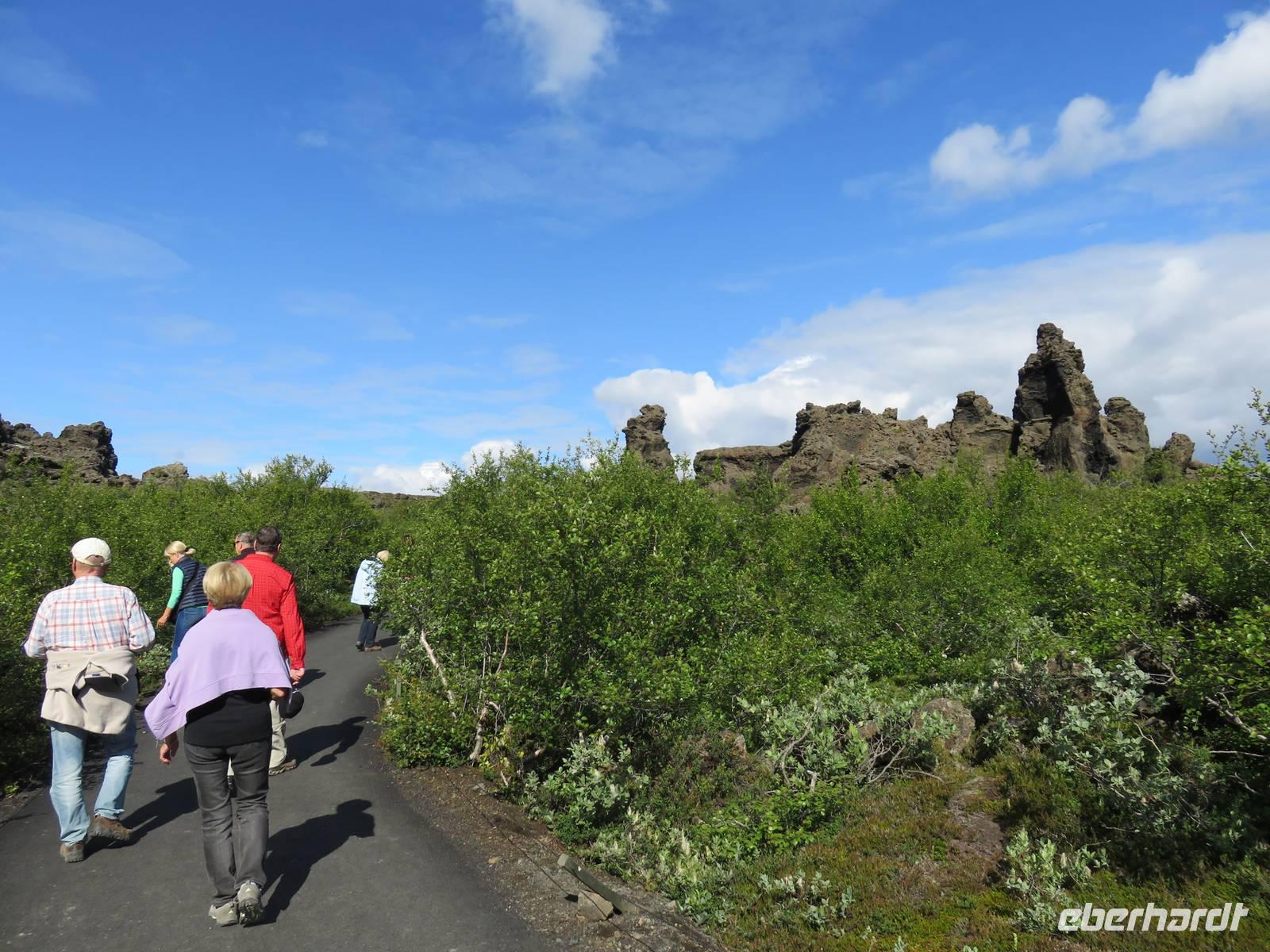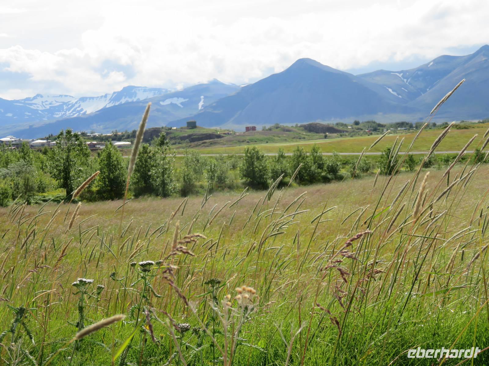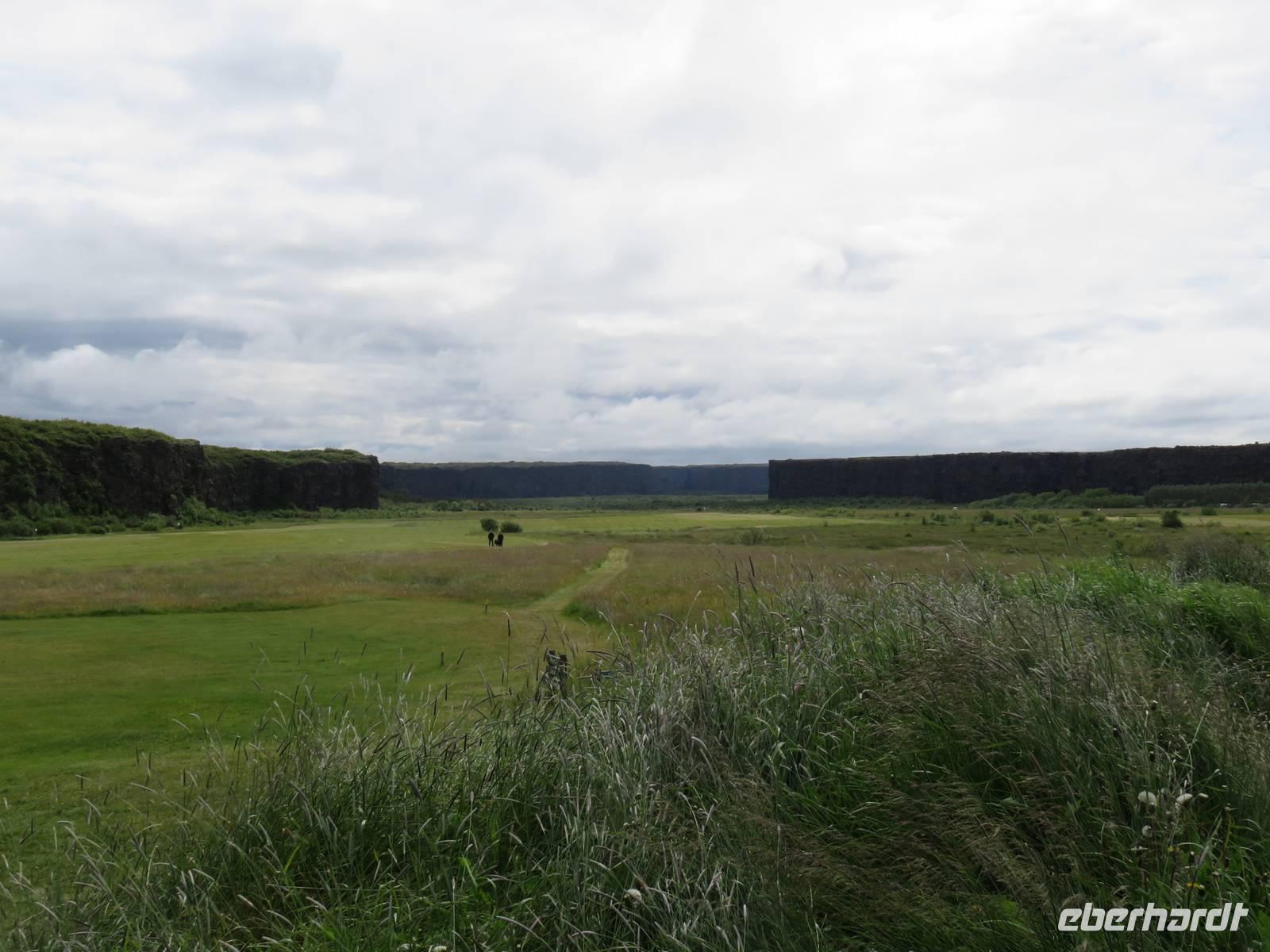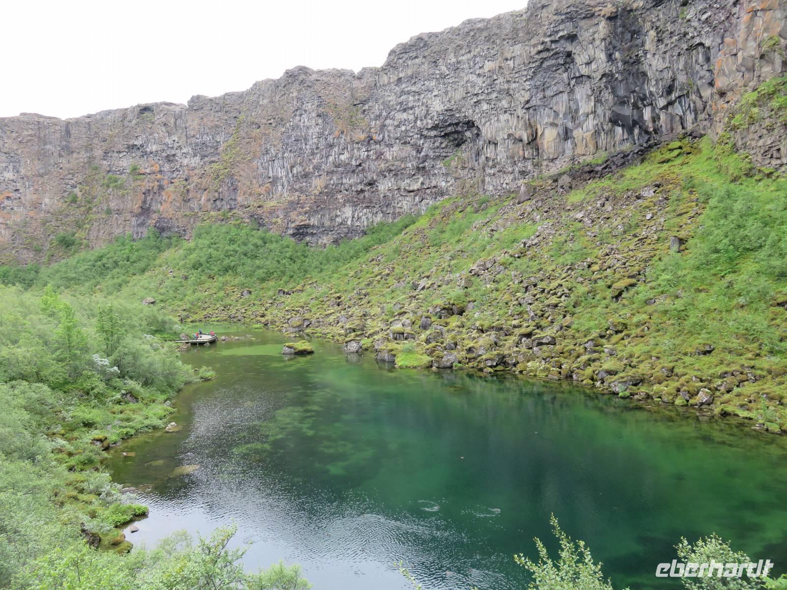 Anschließend umrundeten wir die Halbinsel Tjörnes und uns boten sich schöne Blicke in die Landschaft, die wieder ganz anders als an den letzten Tagen war. Viel mehr Vegetation zeigte sich in diesem Gebiet. Am Nachmittag erreichten wir Asbyrgi. Diese Schlucht mit den imposanten Felswänden ist 3,5 Kilometer lang, 1 Kilometer breit und 100 Meter tief. Von Norden ragt ein Keil in die Schlucht und bekam so die Form eines Hufeisens. Der Überlieferung nach, soll die Schlucht durch einen Hufabdruck von Odins achtbeinigem Pferd Sleipnir entstanden sein. Lange rätselten Wissenschaftler, wie diese Schlucht entstanden sein könnte. Wahrscheinlich lagen einst zwei Wasserfälle dicht beieinander, deren Fallkanten durch die Erosion vereinigt wurden und übrig blieb nur der Keil. Wir spazierten zum See Botnstjörn und zum Aussichtspunkt, von wo wir einen tollen Blick in die Schlucht hatten. Anschließend fuhren wir über Husavik zurück nach Akureyri.