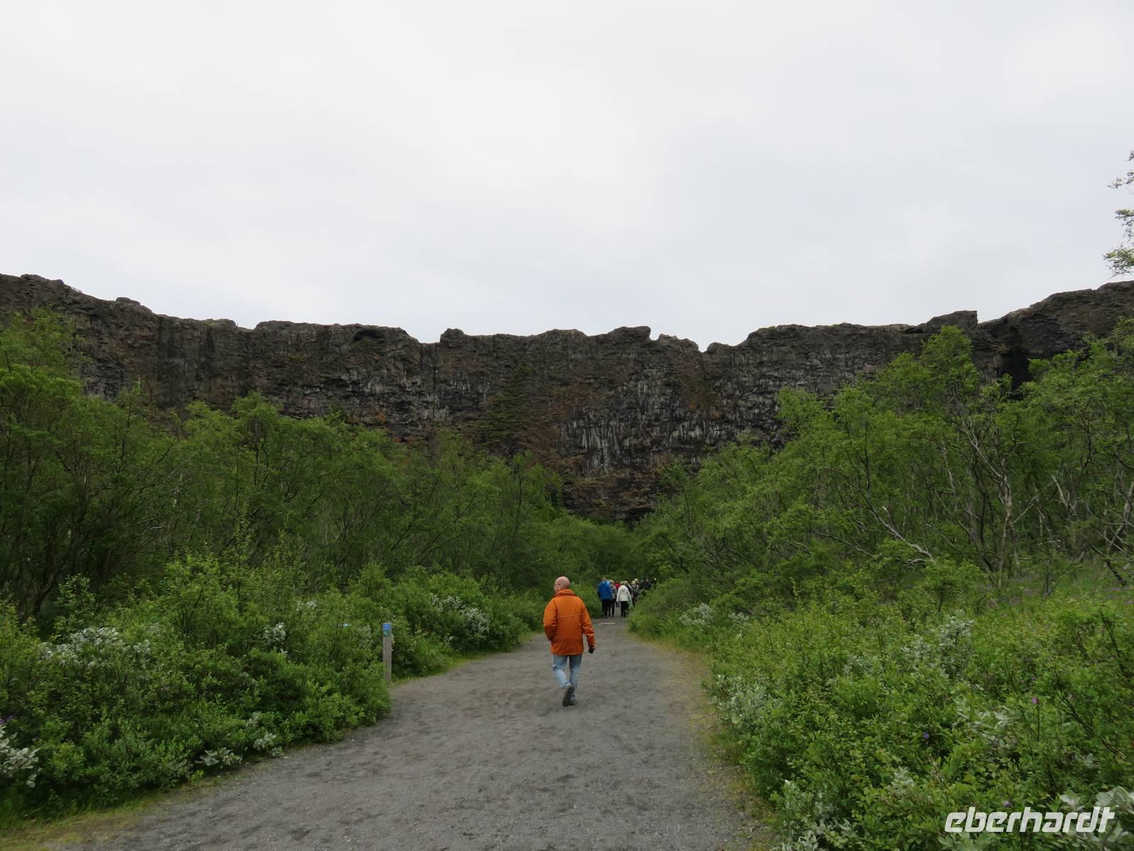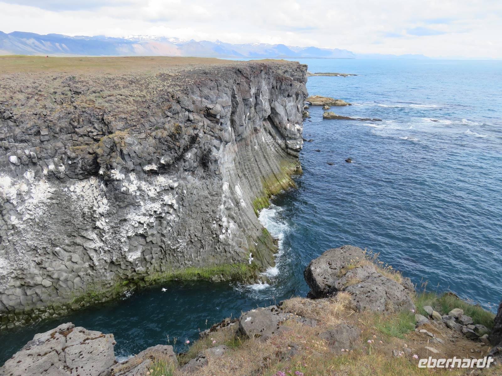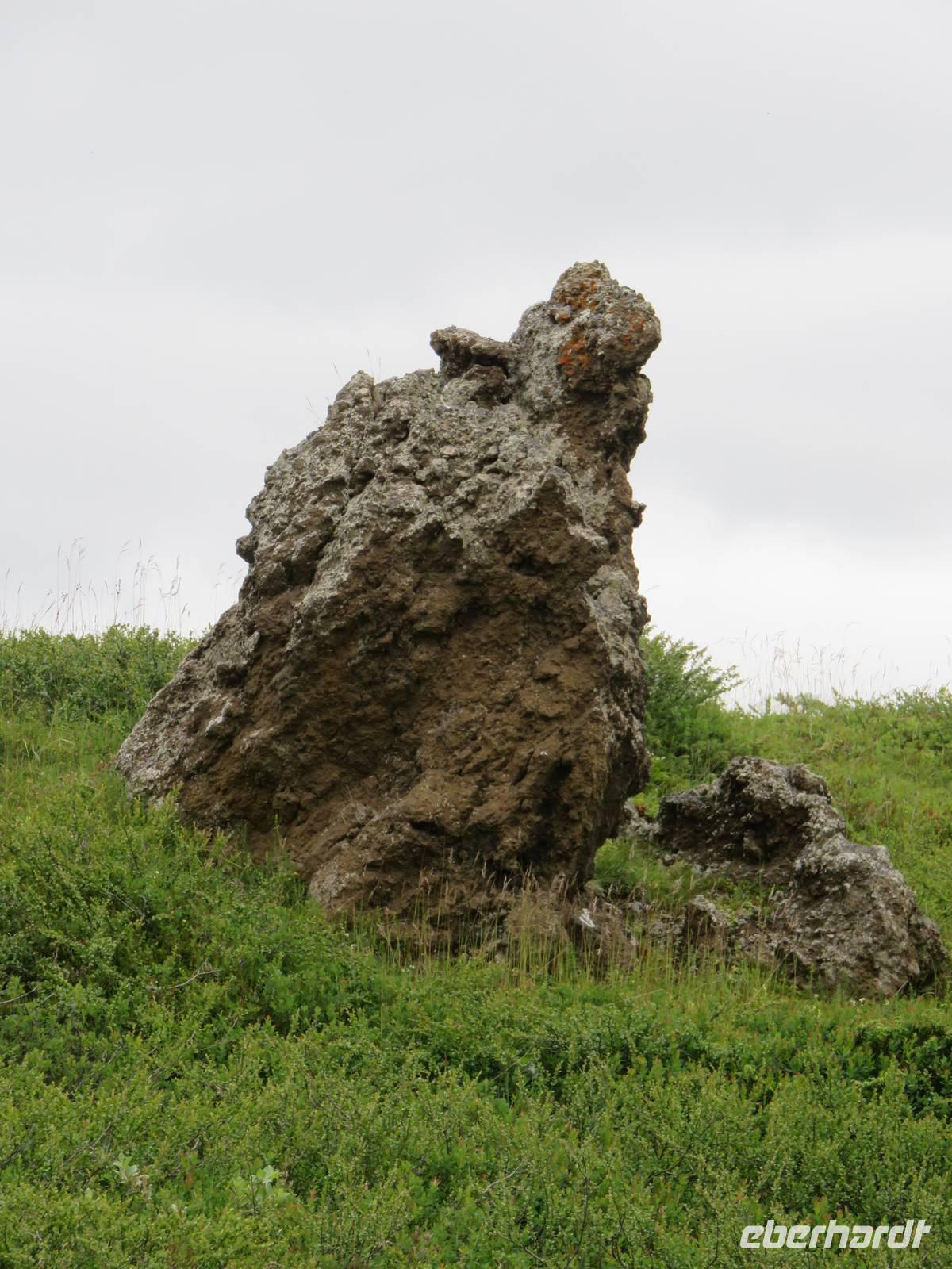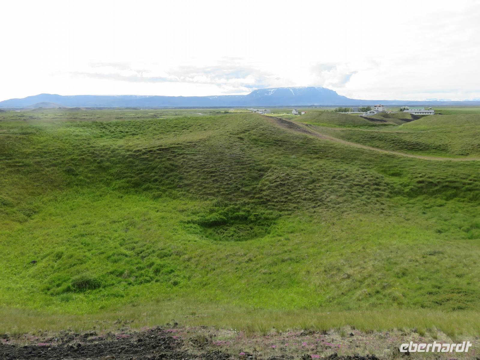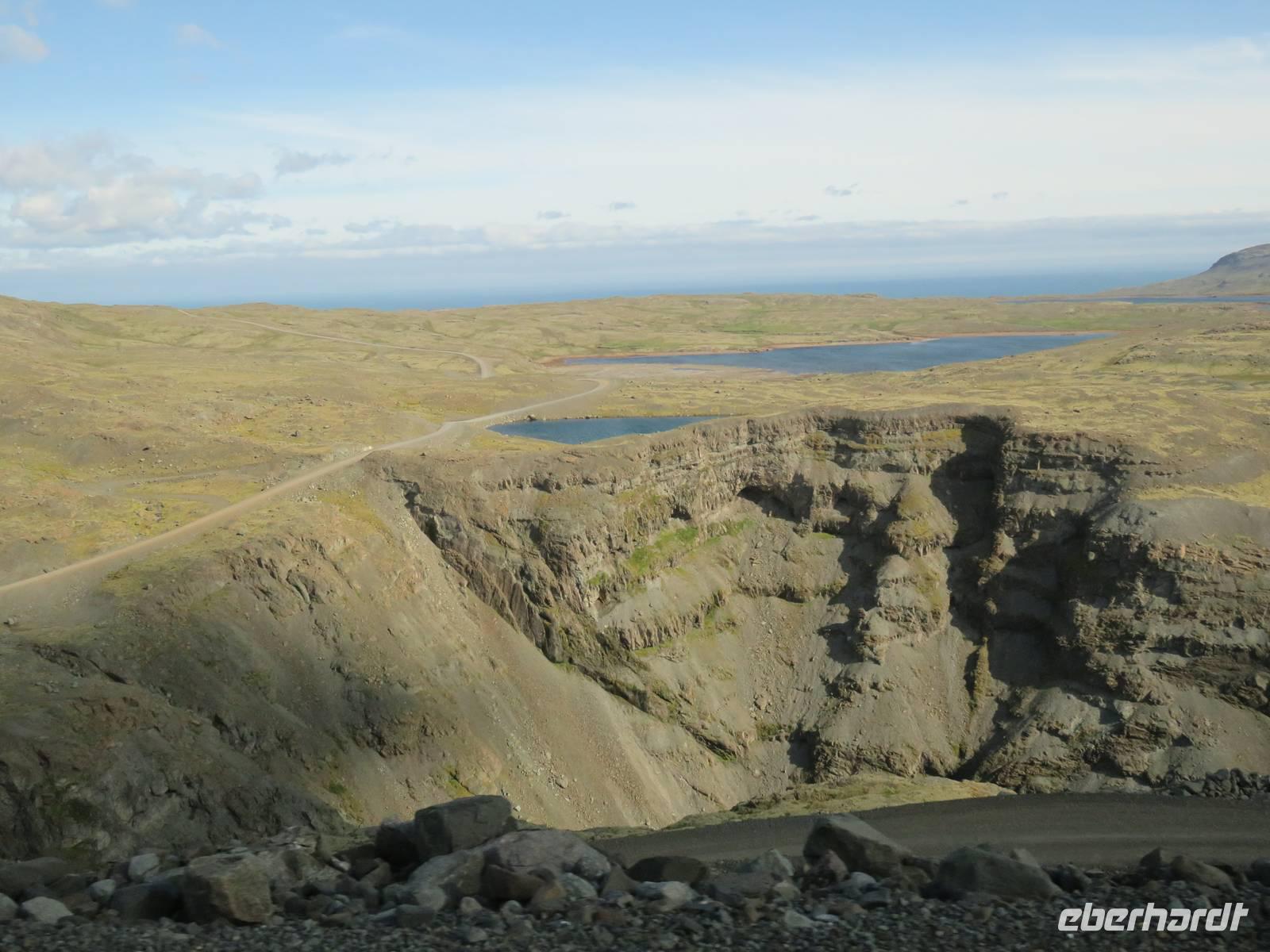 Anschließend umrundeten wir die Halbinsel Tjörnes und uns boten sich schöne Blicke in die Landschaft, die wieder ganz anders als an den letzten Tagen war. Viel mehr Vegetation zeigte sich in diesem Gebiet. Am Nachmittag erreichten wir Asbyrgi. Diese Schlucht mit den imposanten Felswänden ist 3,5 Kilometer lang, 1 Kilometer breit und 100 Meter tief. Von Norden ragt ein Keil in die Schlucht und bekam so die Form eines Hufeisens. Der Überlieferung nach, soll die Schlucht durch einen Hufabdruck von Odins achtbeinigem Pferd Sleipnir entstanden sein. Lange rätselten Wissenschaftler, wie diese Schlucht entstanden sein könnte. Wahrscheinlich lagen einst zwei Wasserfälle dicht beieinander, deren Fallkanten durch die Erosion vereinigt wurden und übrig blieb nur der Keil. Wir spazierten zum See Botnstjörn und zum Aussichtspunkt, von wo wir einen tollen Blick in die Schlucht hatten. Anschließend fuhren wir über Husavik zurück nach Akureyri.