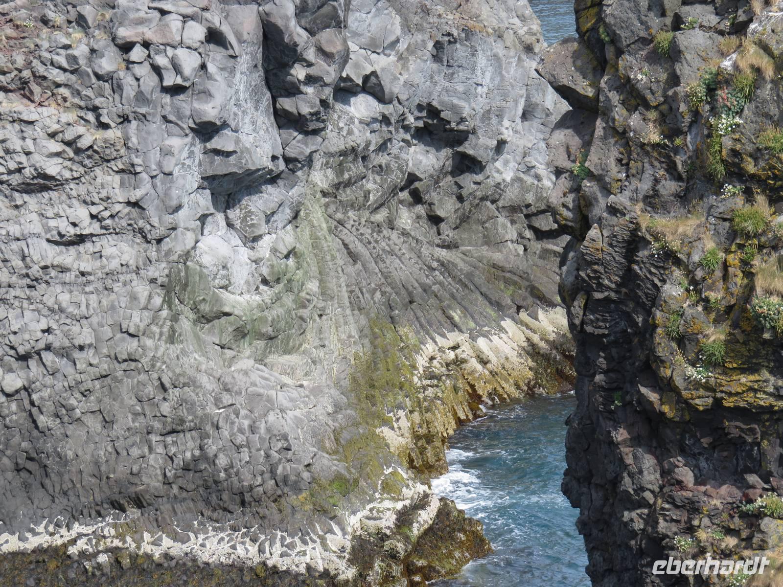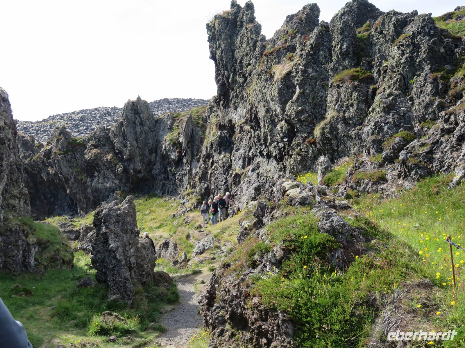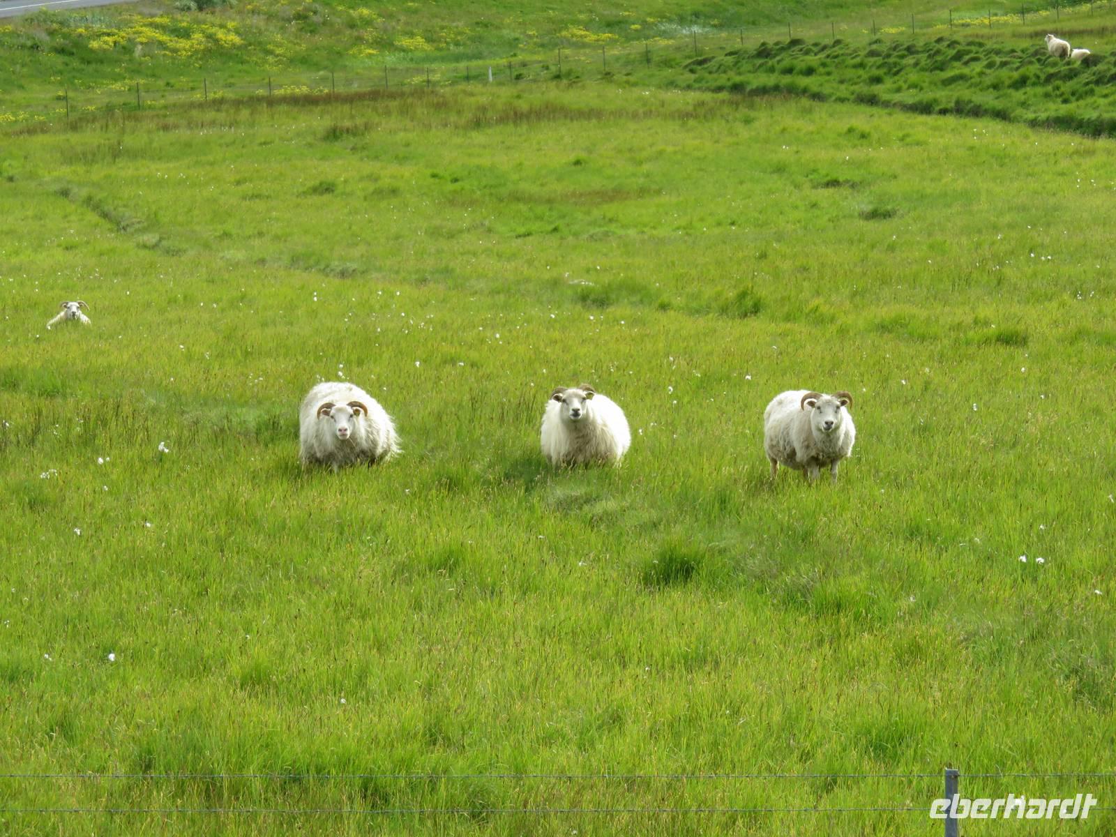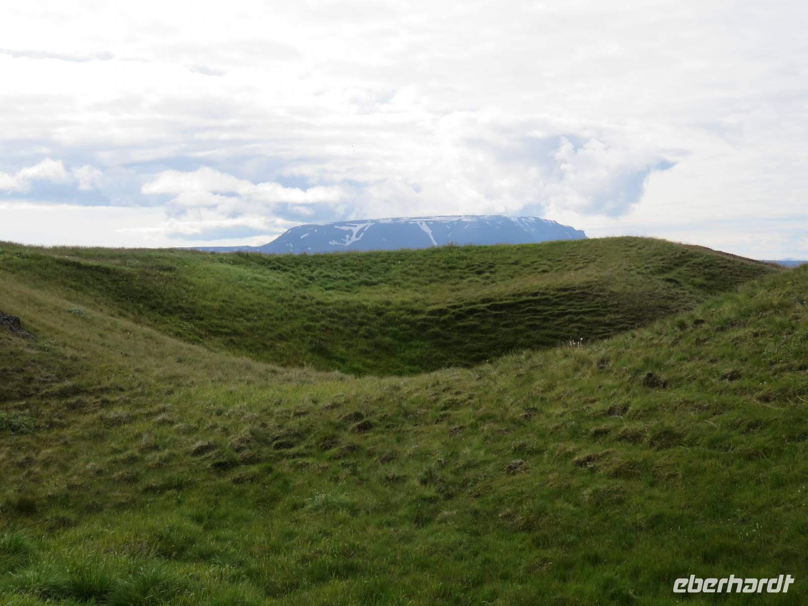 Anschließend umrundeten wir die Halbinsel Tjörnes und uns boten sich schöne Blicke in die Landschaft, die wieder ganz anders als an den letzten Tagen war. Viel mehr Vegetation zeigte sich in diesem Gebiet. Am Nachmittag erreichten wir Asbyrgi. Diese Schlucht mit den imposanten Felswänden ist 3,5 Kilometer lang, 1 Kilometer breit und 100 Meter tief. Von Norden ragt ein Keil in die Schlucht und bekam so die Form eines Hufeisens. Der Überlieferung nach, soll die Schlucht durch einen Hufabdruck von Odins achtbeinigem Pferd Sleipnir entstanden sein. Lange rätselten Wissenschaftler, wie diese Schlucht entstanden sein könnte. Wahrscheinlich lagen einst zwei Wasserfälle dicht beieinander, deren Fallkanten durch die Erosion vereinigt wurden und übrig blieb nur der Keil. Wir spazierten zum See Botnstjörn und zum Aussichtspunkt, von wo wir einen tollen Blick in die Schlucht hatten. Anschließend fuhren wir über Husavik zurück nach Akureyri.
