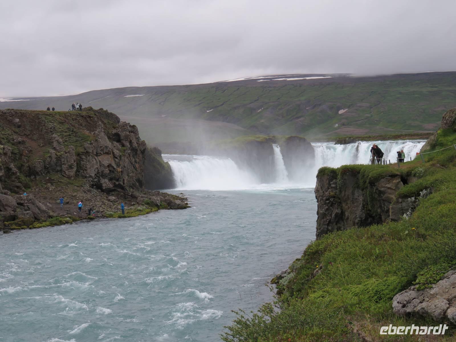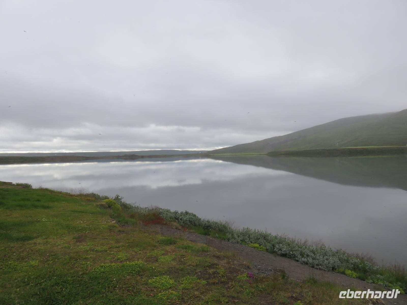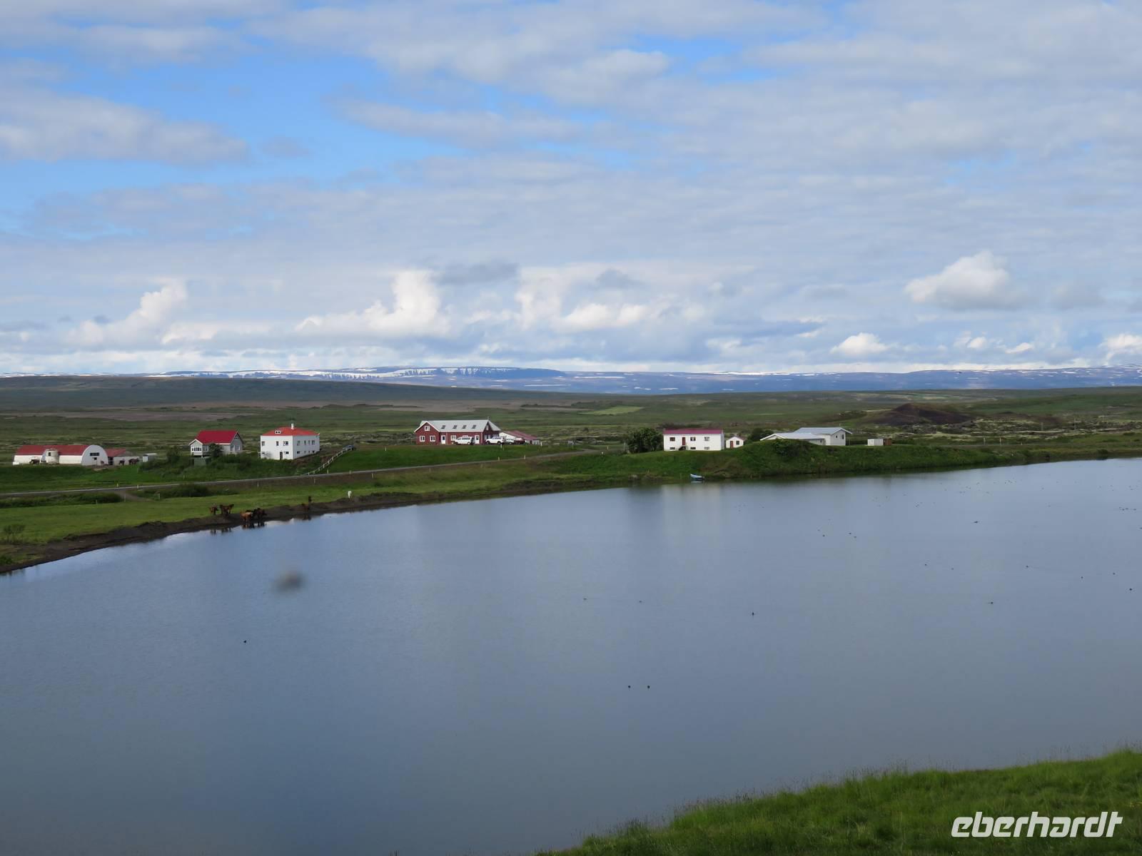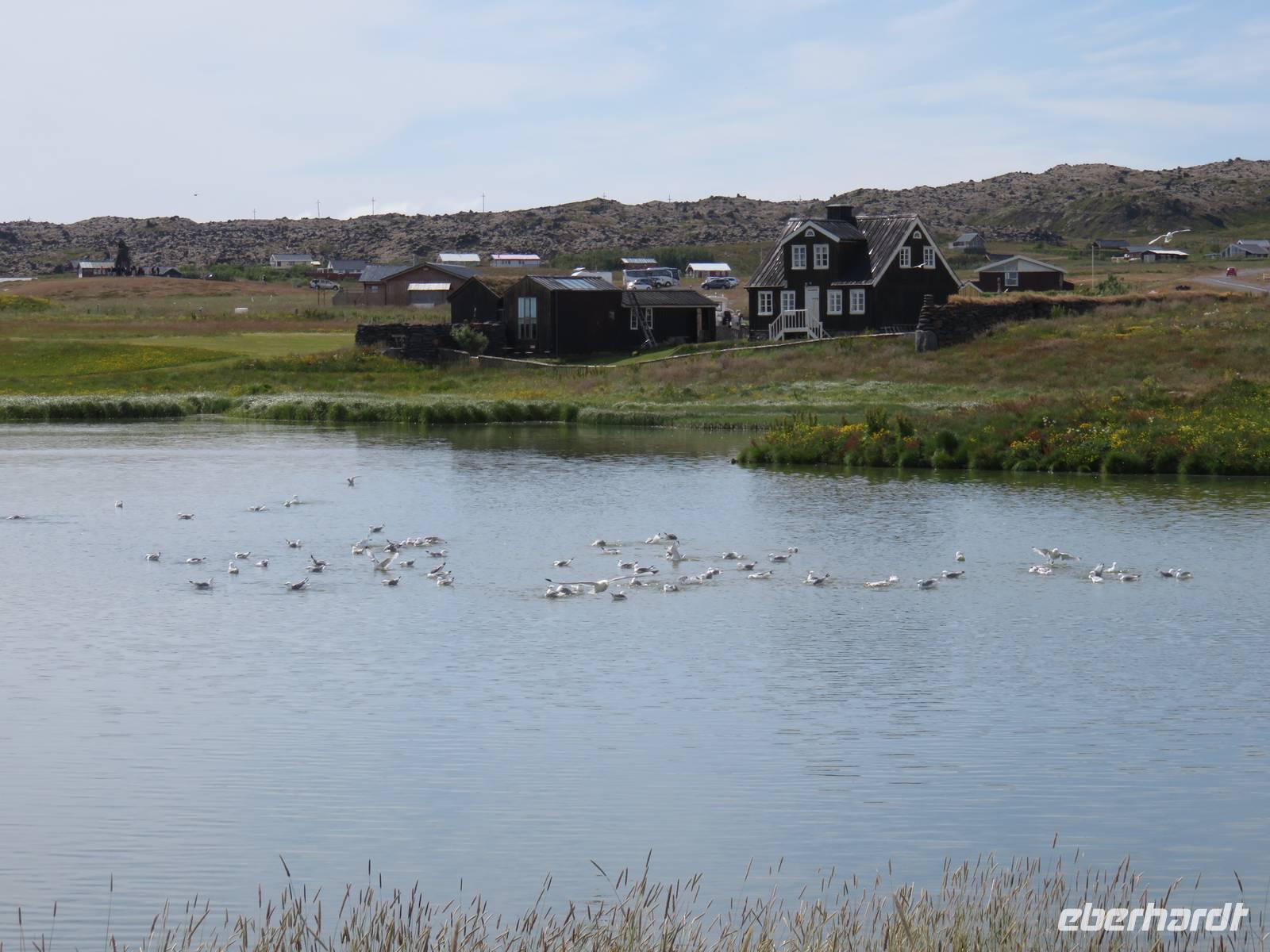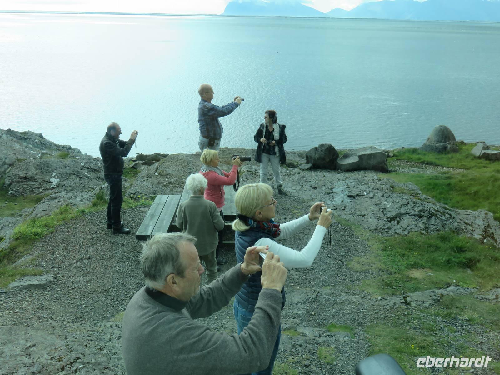 Nach dem Frühstück starteten wir zu unserem heutigen Ausflug. Wir fuhren Richtung Norden und legten zunächst einen Stopp am Fjord gegenüber von Akureyri ein. Uns boten sich wunderbare Fotomotive der Stadt mit Spiegelung im Fjord, denn auch heute meinte es Petrus wieder sehr gut mit dem Wetter mit uns. Die Straße schlängelte sich hinauf auf die Hochebene. Am Licht- oder hellen See mussten wir nochmals stoppen, denn auch hier war eine wunderschöne Stimmung, die wir unbedingt mit unseren Fotoapparaten festhalten wollten. Weiter ging es zum Godafoss - dem Götterwasserfall. Der Fluss Skjáfandafljót bildet den imposanten Wasserfall. Die Wassermassen stürzen zwar nur auf eine Höhe von 10 Metern, aber in breiter Front in die Tiefe der Schlucht. Sein Name geht auf den Goden Porgeir zurück, der sich im Jahr 100 in Pingvellir zum Christentum bekannte und die heidnischen Götterstatuen in den Wasserfall warf. Nachdem wir genügend Zeit hatten zum Schauen und Fotografieren, war Husavik unser nächstes Ziel. Die kleine Hafenstadt liegt am Beginn der Halbinsel Tjörnes. Wir spazierten durch den Ort, besuchten die hübsche Holzkirche und stärkten uns in der guten Bäckerei. Husavik ist ebenfalls Ausgangspunkt für viele Walbeobachtungstouren.