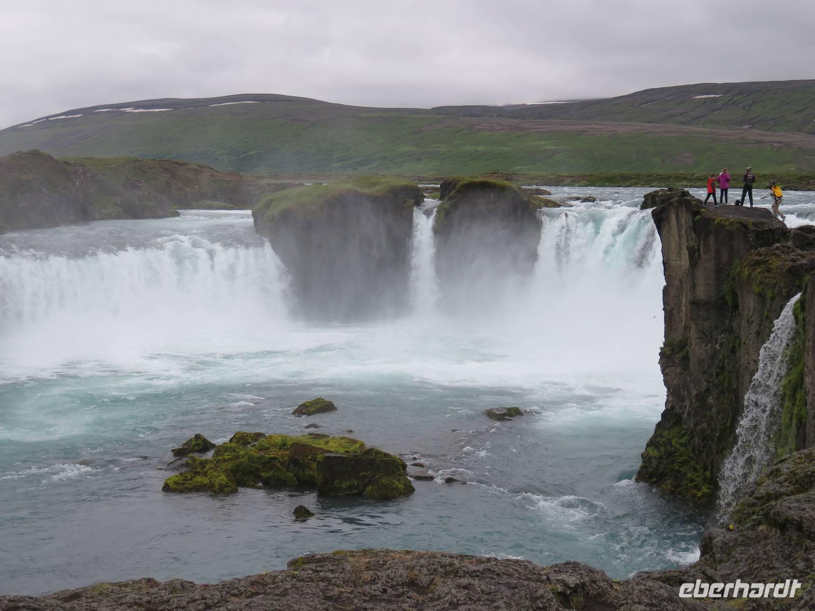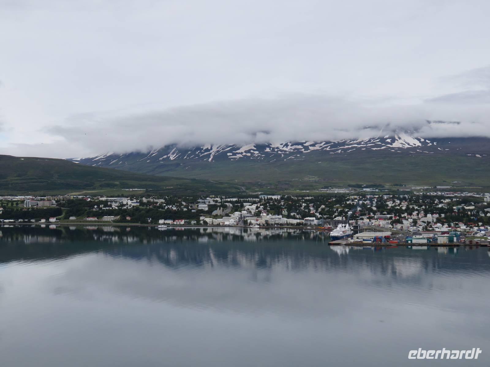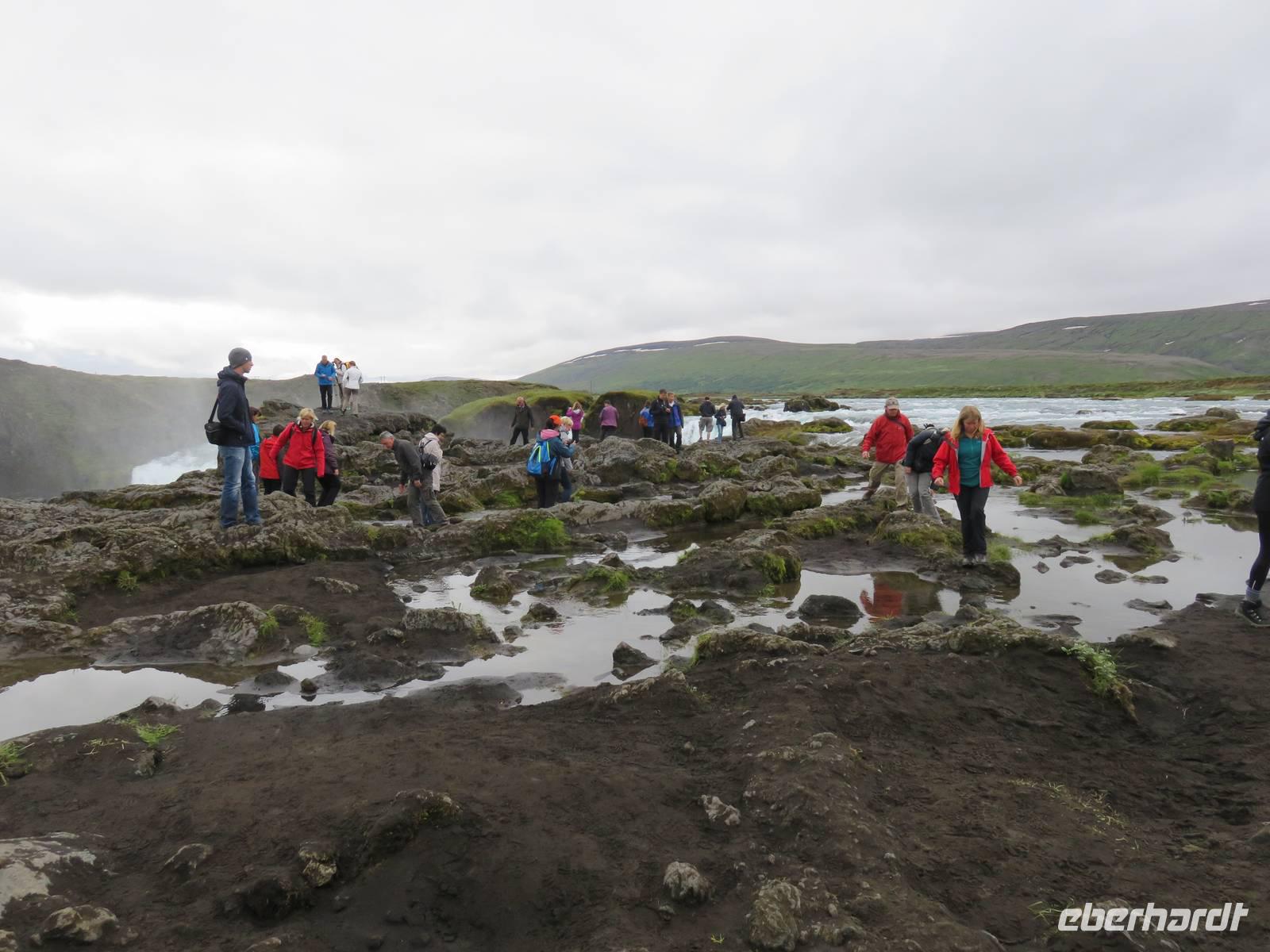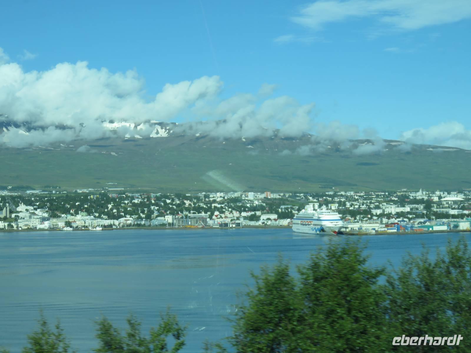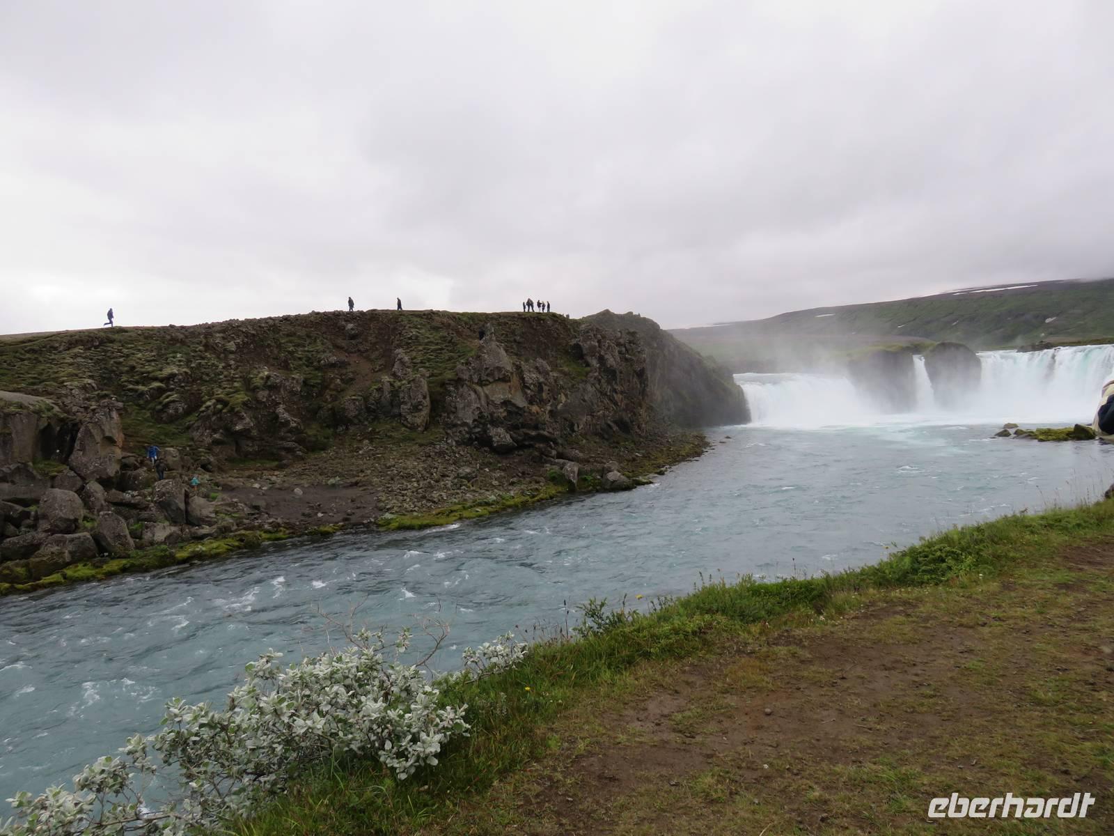 Nach dem Frühstück starteten wir zu unserem heutigen Ausflug. Wir fuhren Richtung Norden und legten zunächst einen Stopp am Fjord gegenüber von Akureyri ein. Uns boten sich wunderbare Fotomotive der Stadt mit Spiegelung im Fjord, denn auch heute meinte es Petrus wieder sehr gut mit dem Wetter mit uns. Die Straße schlängelte sich hinauf auf die Hochebene. Am Licht- oder hellen See mussten wir nochmals stoppen, denn auch hier war eine wunderschöne Stimmung, die wir unbedingt mit unseren Fotoapparaten festhalten wollten. Weiter ging es zum Godafoss - dem Götterwasserfall. Der Fluss Skjáfandafljót bildet den imposanten Wasserfall. Die Wassermassen stürzen zwar nur auf eine Höhe von 10 Metern, aber in breiter Front in die Tiefe der Schlucht. Sein Name geht auf den Goden Porgeir zurück, der sich im Jahr 100 in Pingvellir zum Christentum bekannte und die heidnischen Götterstatuen in den Wasserfall warf. Nachdem wir genügend Zeit hatten zum Schauen und Fotografieren, war Husavik unser nächstes Ziel. Die kleine Hafenstadt liegt am Beginn der Halbinsel Tjörnes. Wir spazierten durch den Ort, besuchten die hübsche Holzkirche und stärkten uns in der guten Bäckerei. Husavik ist ebenfalls Ausgangspunkt für viele Walbeobachtungstouren.