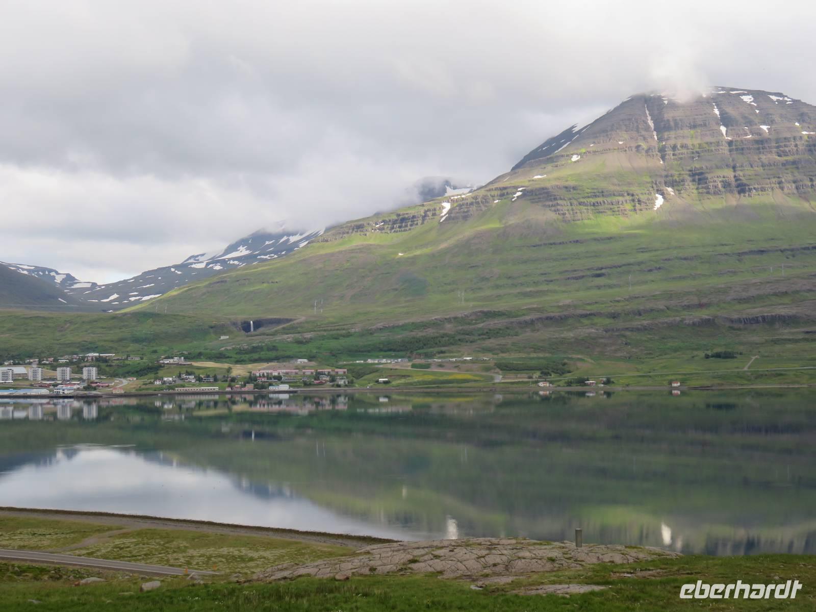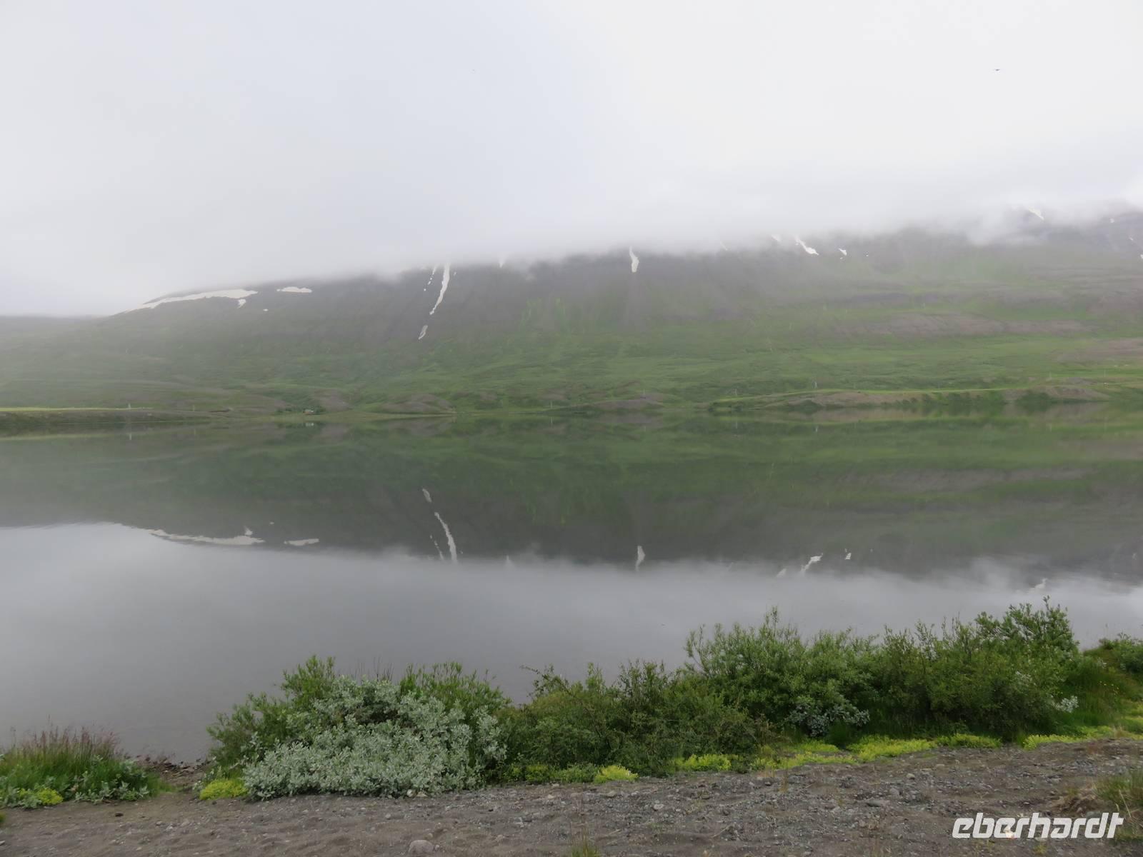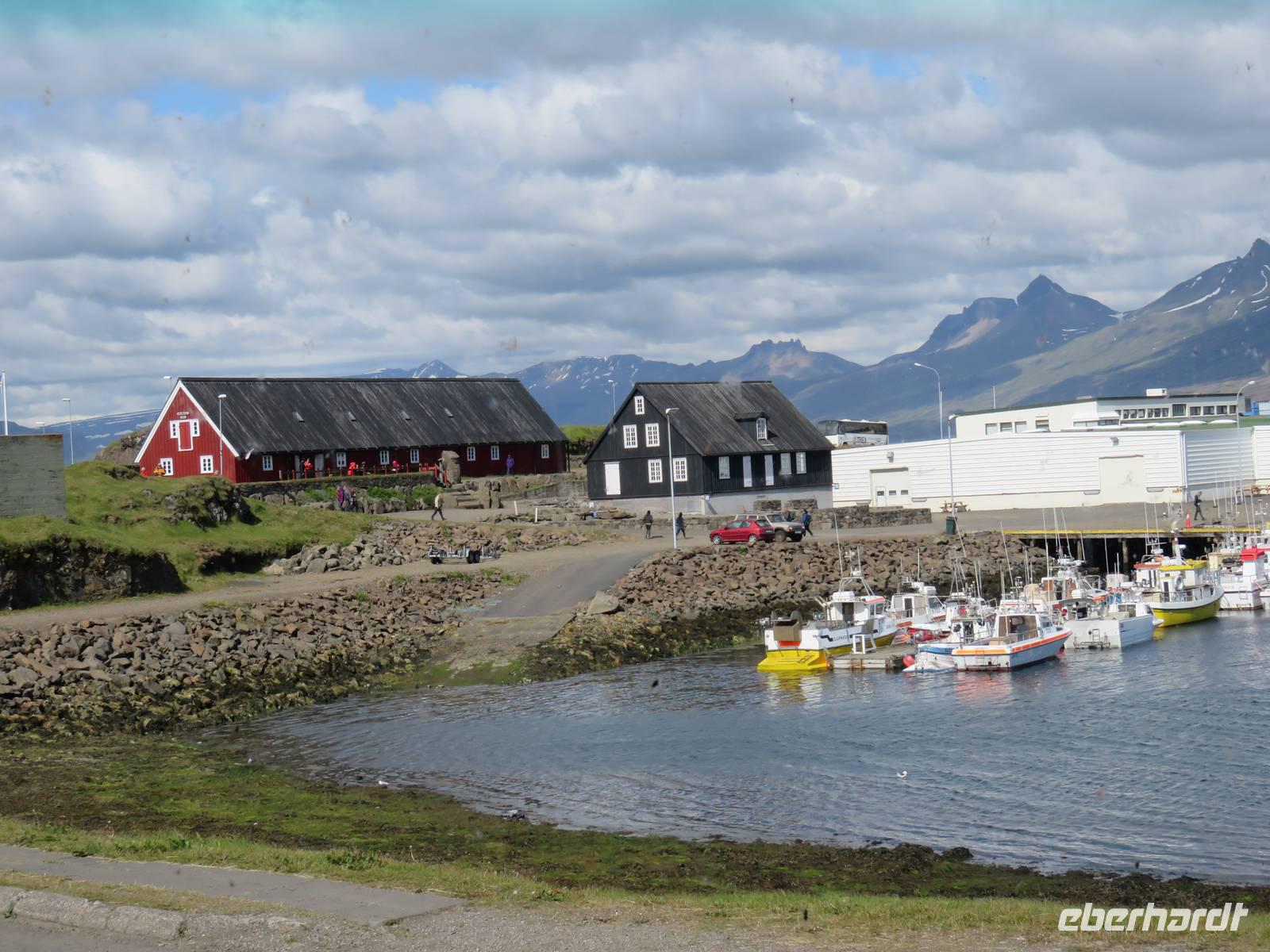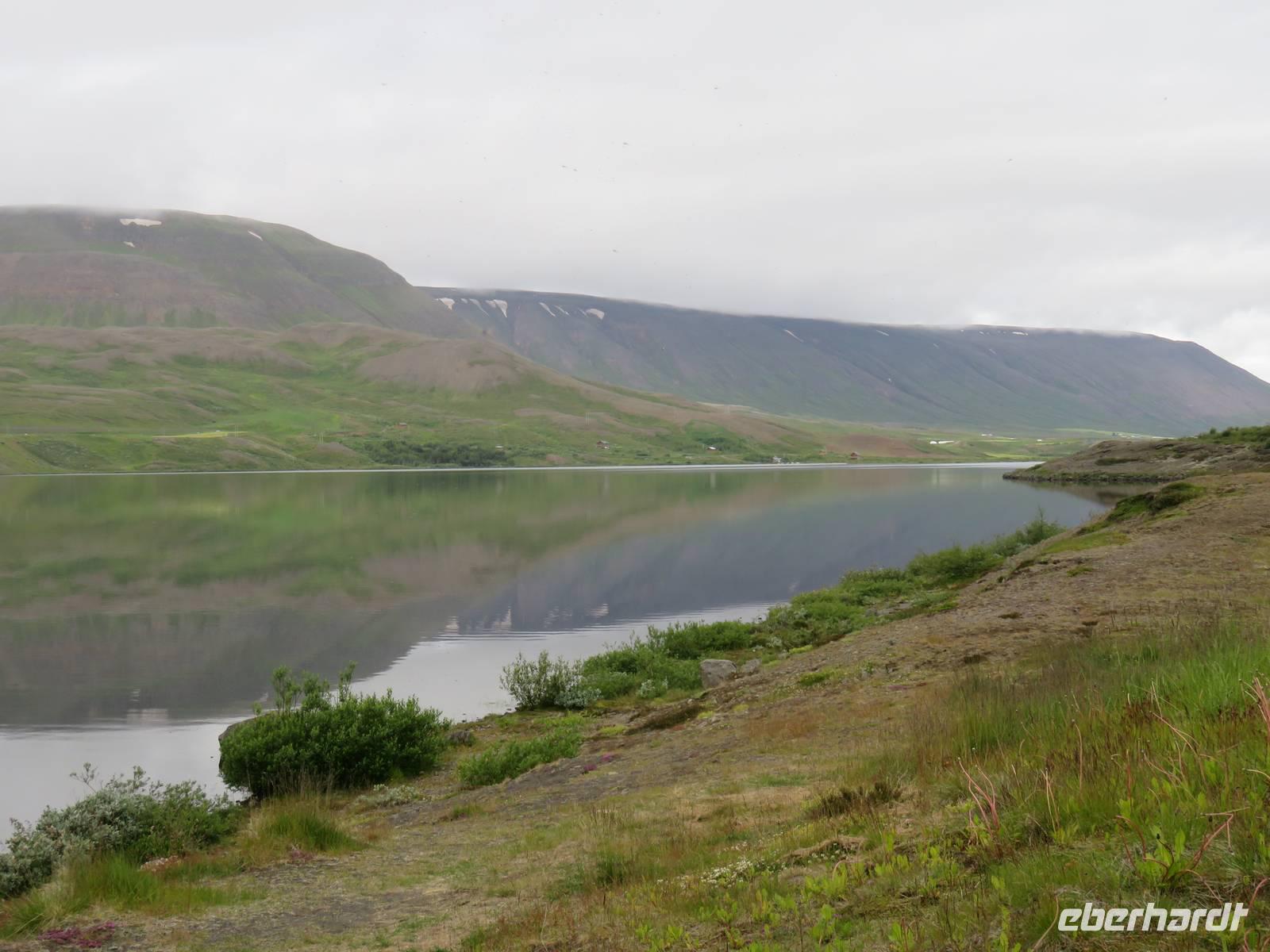 Nach dem Frühstück starteten wir zu unserem heutigen Ausflug. Wir fuhren Richtung Norden und legten zunächst einen Stopp am Fjord gegenüber von Akureyri ein. Uns boten sich wunderbare Fotomotive der Stadt mit Spiegelung im Fjord, denn auch heute meinte es Petrus wieder sehr gut mit dem Wetter mit uns. Die Straße schlängelte sich hinauf auf die Hochebene. Am Licht- oder hellen See mussten wir nochmals stoppen, denn auch hier war eine wunderschöne Stimmung, die wir unbedingt mit unseren Fotoapparaten festhalten wollten. Weiter ging es zum Godafoss - dem Götterwasserfall. Der Fluss Skjáfandafljót bildet den imposanten Wasserfall. Die Wassermassen stürzen zwar nur auf eine Höhe von 10 Metern, aber in breiter Front in die Tiefe der Schlucht. Sein Name geht auf den Goden Porgeir zurück, der sich im Jahr 100 in Pingvellir zum Christentum bekannte und die heidnischen Götterstatuen in den Wasserfall warf. Nachdem wir genügend Zeit hatten zum Schauen und Fotografieren, war Husavik unser nächstes Ziel. Die kleine Hafenstadt liegt am Beginn der Halbinsel Tjörnes. Wir spazierten durch den Ort, besuchten die hübsche Holzkirche und stärkten uns in der guten Bäckerei. Husavik ist ebenfalls Ausgangspunkt für viele Walbeobachtungstouren.