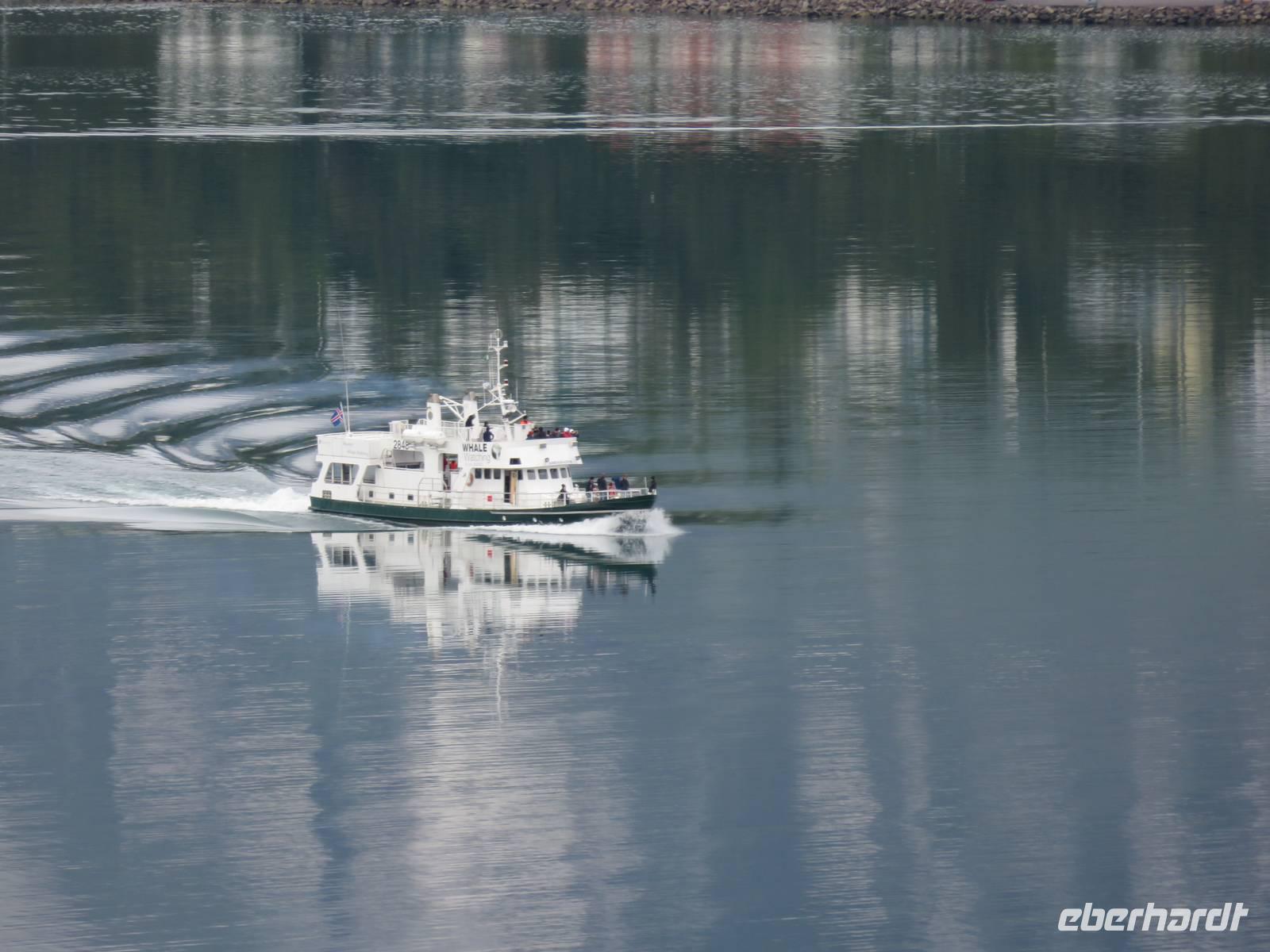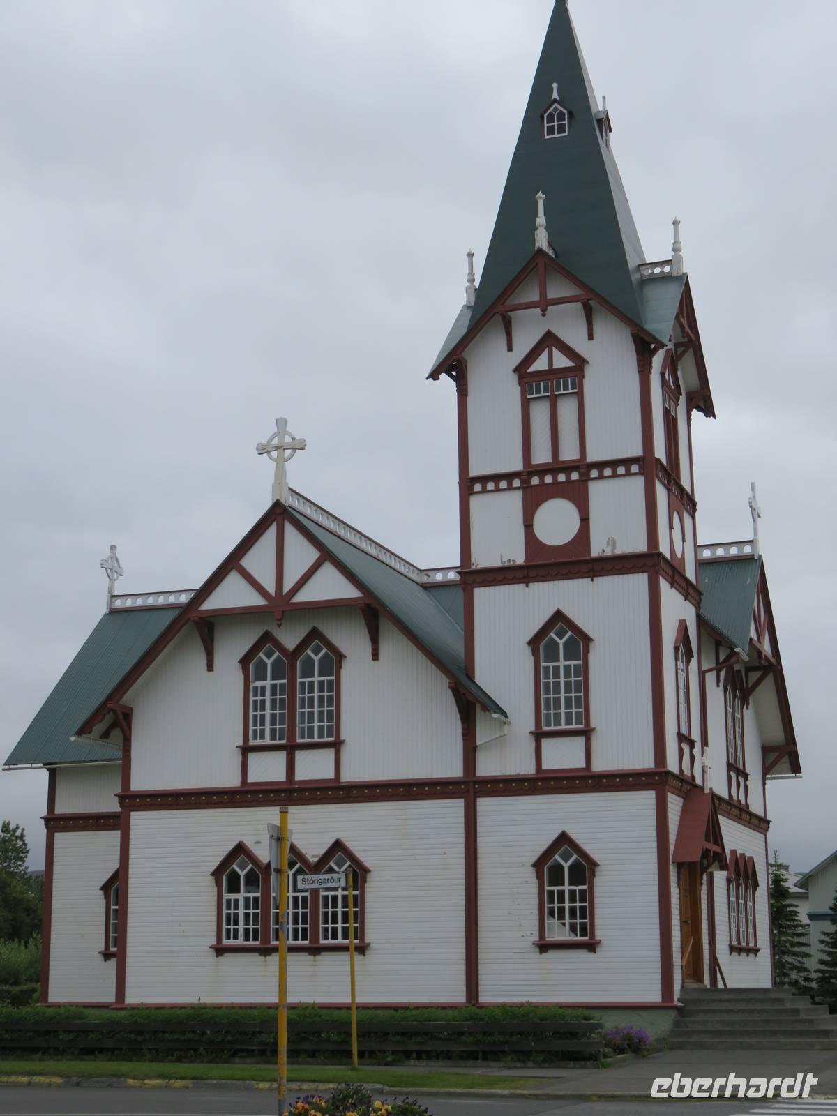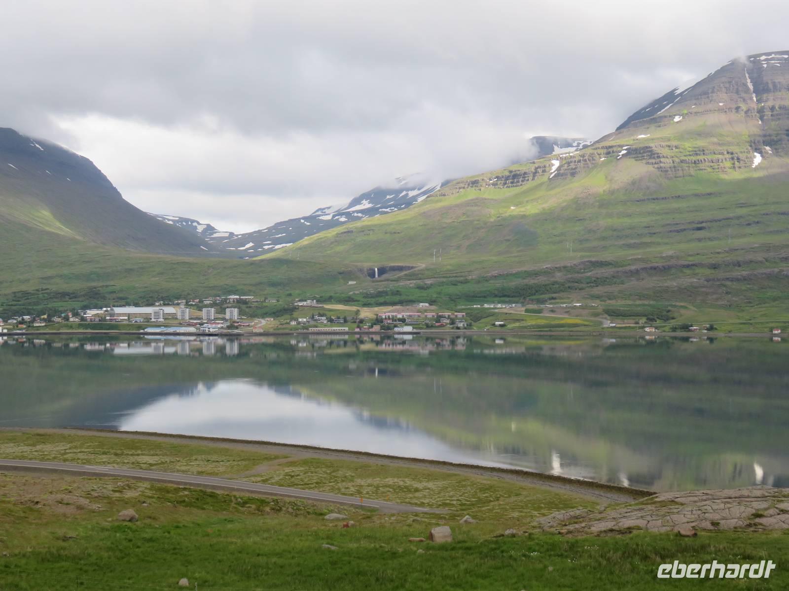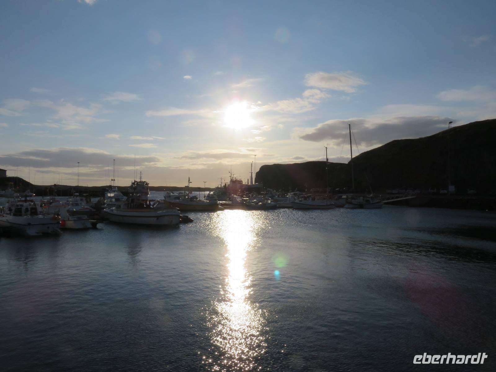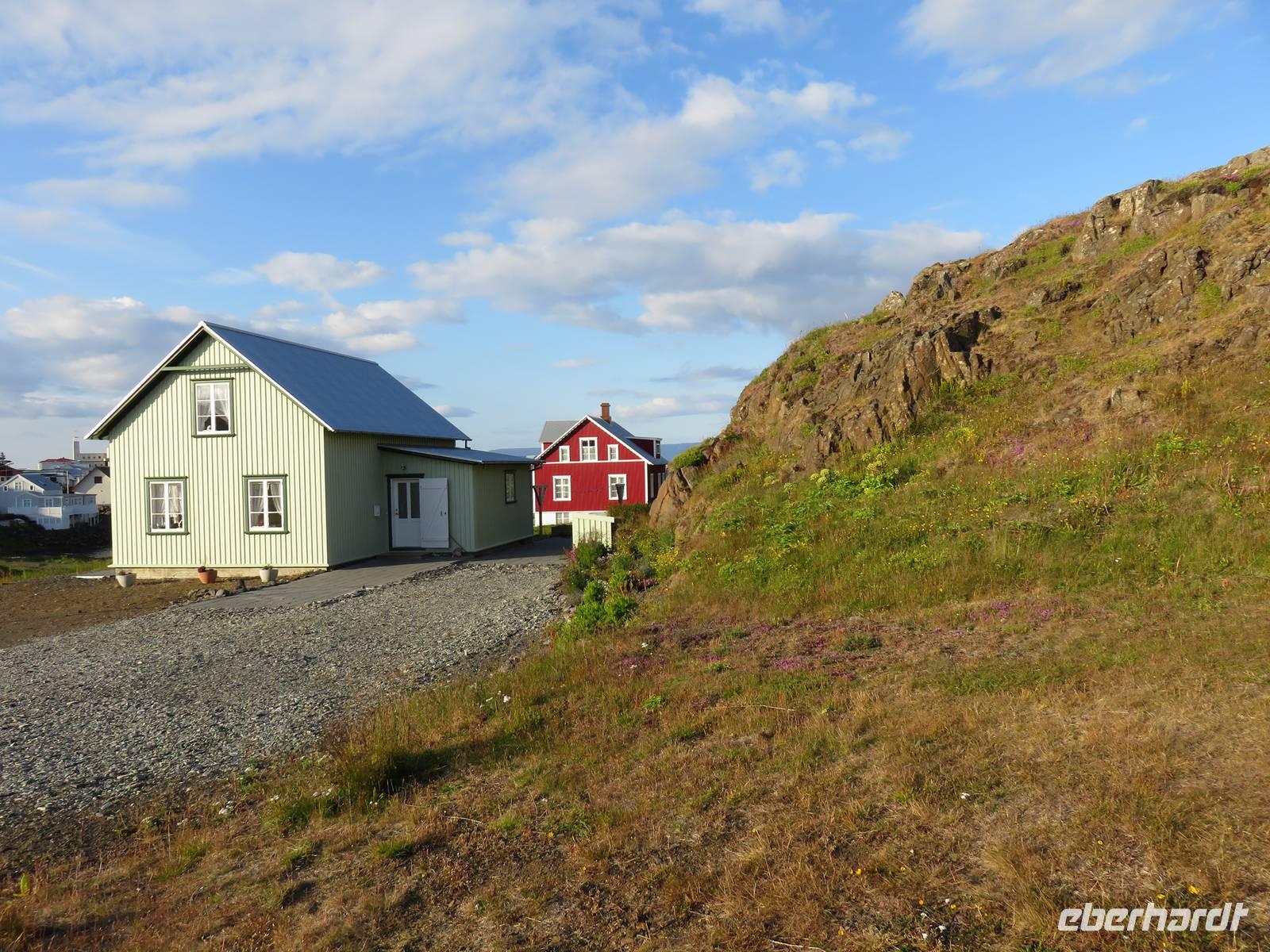 Nach dem Frühstück starteten wir zu unserem heutigen Ausflug. Wir fuhren Richtung Norden und legten zunächst einen Stopp am Fjord gegenüber von Akureyri ein. Uns boten sich wunderbare Fotomotive der Stadt mit Spiegelung im Fjord, denn auch heute meinte es Petrus wieder sehr gut mit dem Wetter mit uns. Die Straße schlängelte sich hinauf auf die Hochebene. Am Licht- oder hellen See mussten wir nochmals stoppen, denn auch hier war eine wunderschöne Stimmung, die wir unbedingt mit unseren Fotoapparaten festhalten wollten. Weiter ging es zum Godafoss - dem Götterwasserfall. Der Fluss Skjáfandafljót bildet den imposanten Wasserfall. Die Wassermassen stürzen zwar nur auf eine Höhe von 10 Metern, aber in breiter Front in die Tiefe der Schlucht. Sein Name geht auf den Goden Porgeir zurück, der sich im Jahr 100 in Pingvellir zum Christentum bekannte und die heidnischen Götterstatuen in den Wasserfall warf. Nachdem wir genügend Zeit hatten zum Schauen und Fotografieren, war Husavik unser nächstes Ziel. Die kleine Hafenstadt liegt am Beginn der Halbinsel Tjörnes. Wir spazierten durch den Ort, besuchten die hübsche Holzkirche und stärkten uns in der guten Bäckerei. Husavik ist ebenfalls Ausgangspunkt für viele Walbeobachtungstouren.