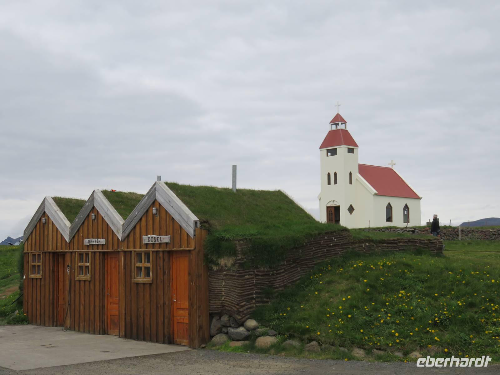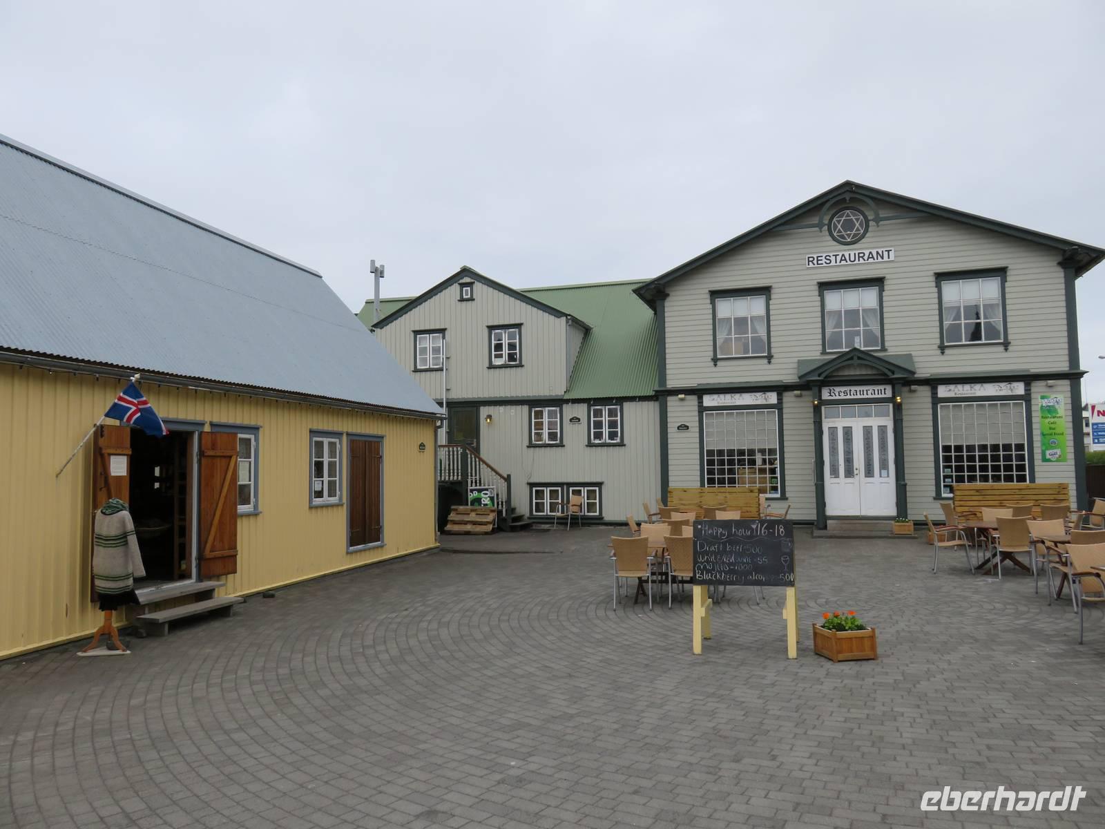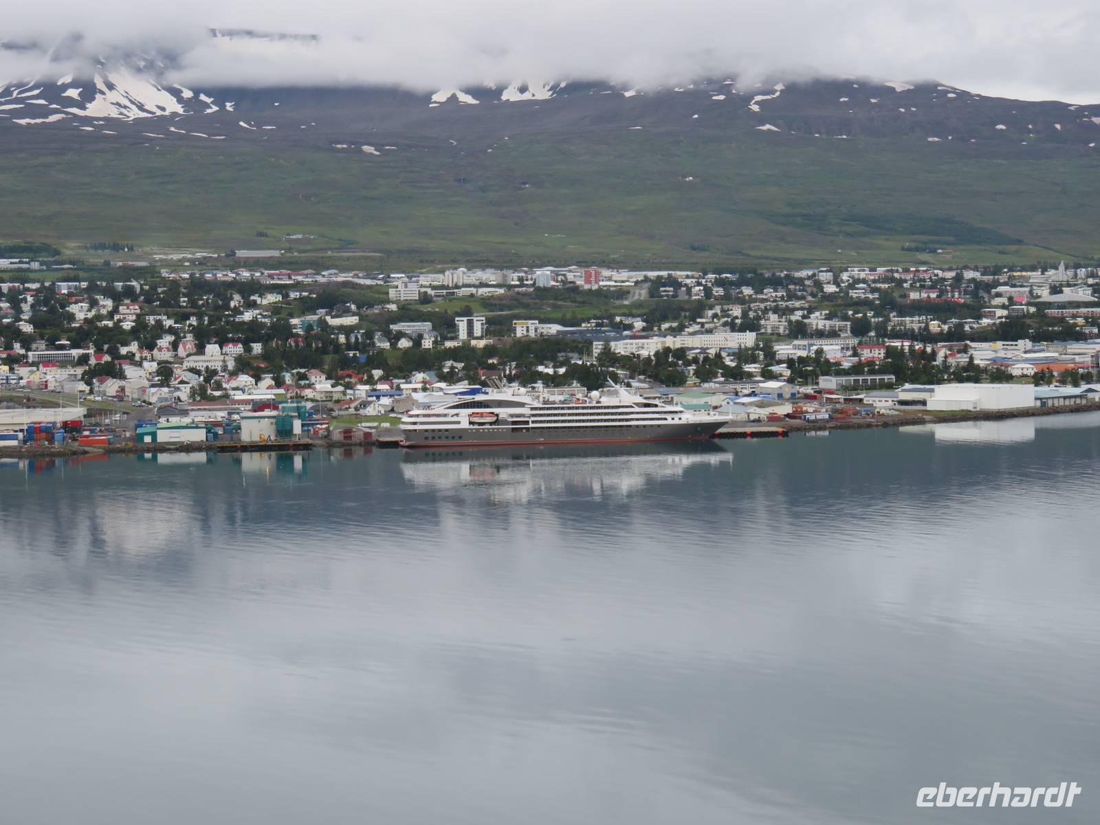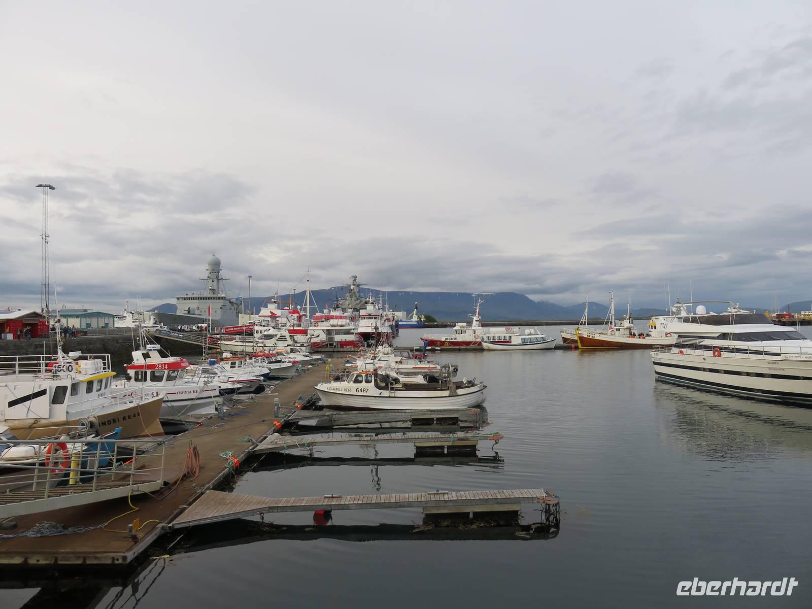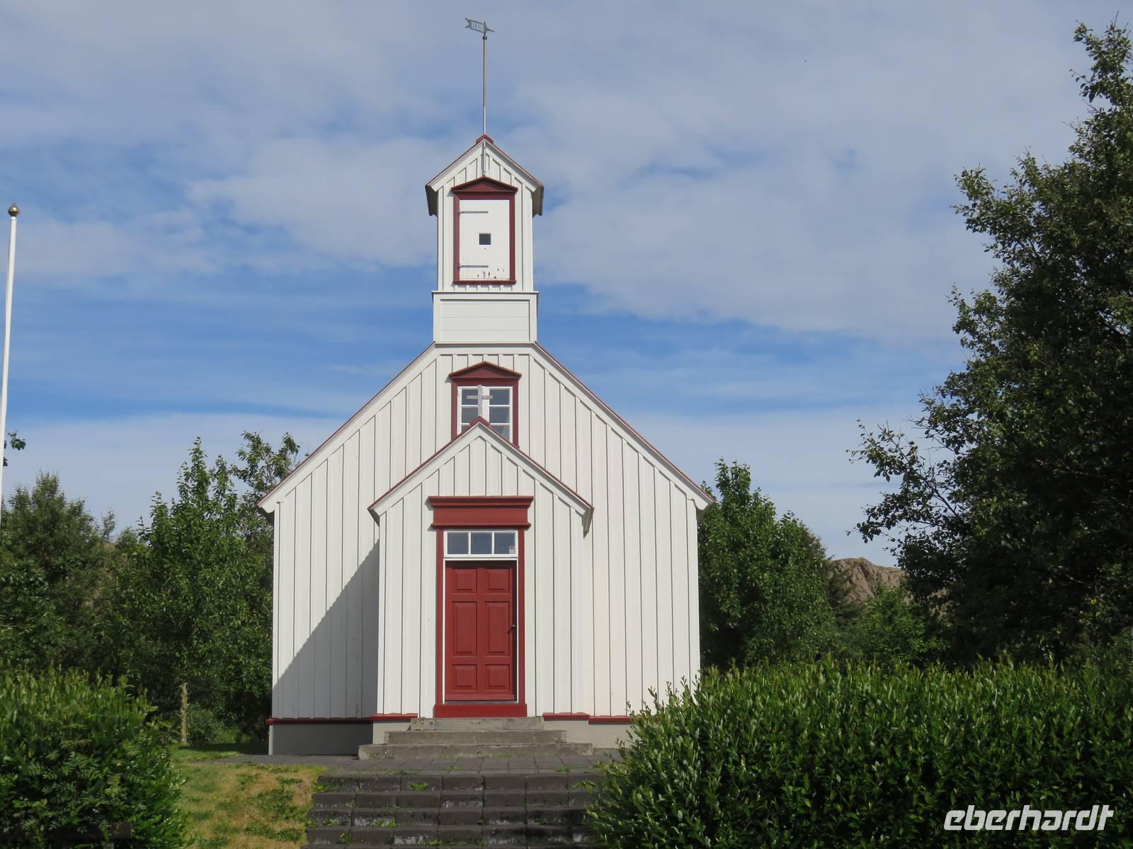 Nach dem Frühstück starteten wir zu unserem heutigen Ausflug. Wir fuhren Richtung Norden und legten zunächst einen Stopp am Fjord gegenüber von Akureyri ein. Uns boten sich wunderbare Fotomotive der Stadt mit Spiegelung im Fjord, denn auch heute meinte es Petrus wieder sehr gut mit dem Wetter mit uns. Die Straße schlängelte sich hinauf auf die Hochebene. Am Licht- oder hellen See mussten wir nochmals stoppen, denn auch hier war eine wunderschöne Stimmung, die wir unbedingt mit unseren Fotoapparaten festhalten wollten. Weiter ging es zum Godafoss - dem Götterwasserfall. Der Fluss Skjáfandafljót bildet den imposanten Wasserfall. Die Wassermassen stürzen zwar nur auf eine Höhe von 10 Metern, aber in breiter Front in die Tiefe der Schlucht. Sein Name geht auf den Goden Porgeir zurück, der sich im Jahr 100 in Pingvellir zum Christentum bekannte und die heidnischen Götterstatuen in den Wasserfall warf. Nachdem wir genügend Zeit hatten zum Schauen und Fotografieren, war Husavik unser nächstes Ziel. Die kleine Hafenstadt liegt am Beginn der Halbinsel Tjörnes. Wir spazierten durch den Ort, besuchten die hübsche Holzkirche und stärkten uns in der guten Bäckerei. Husavik ist ebenfalls Ausgangspunkt für viele Walbeobachtungstouren.