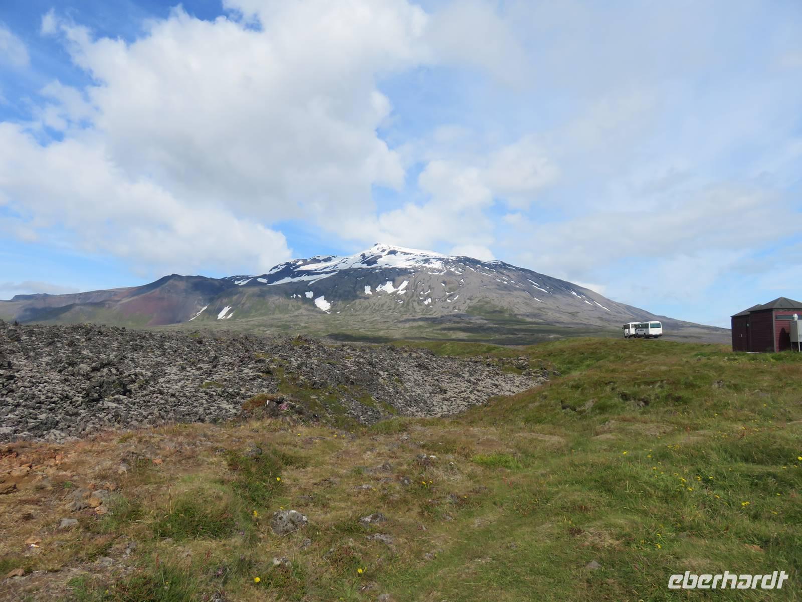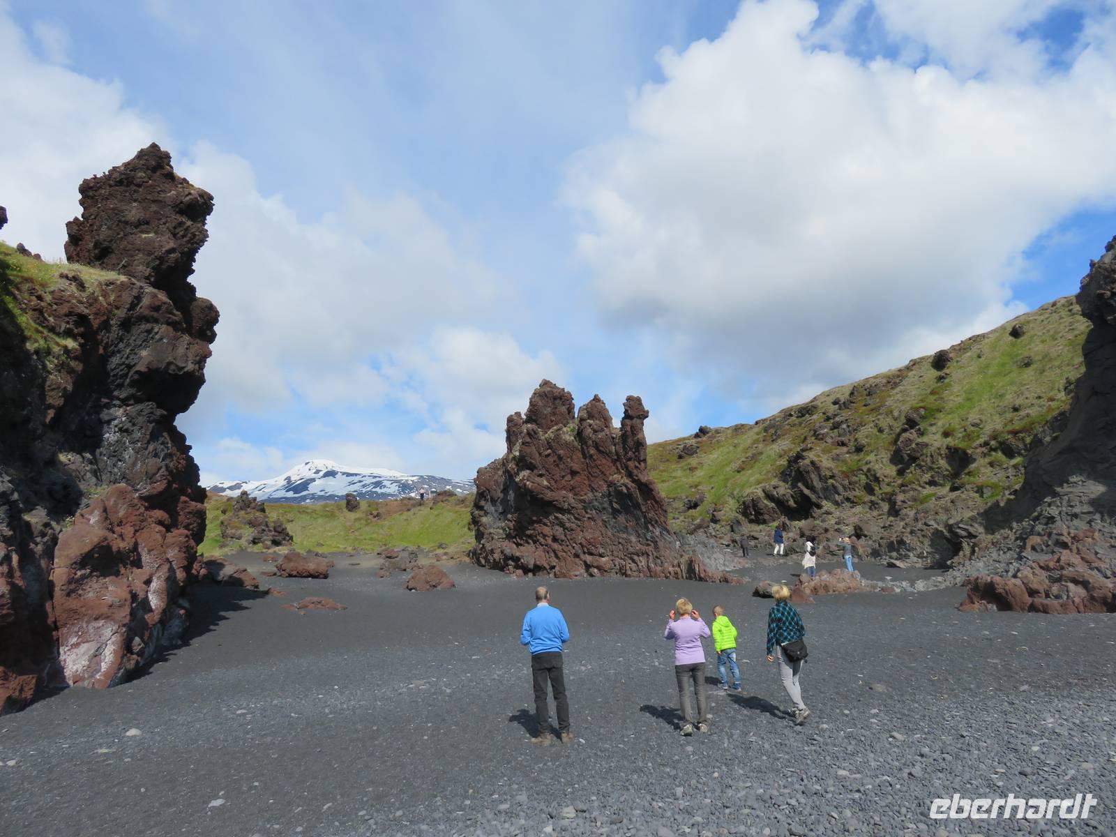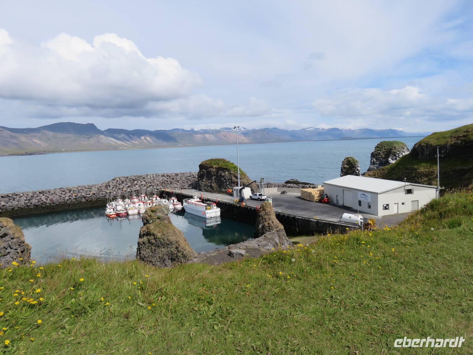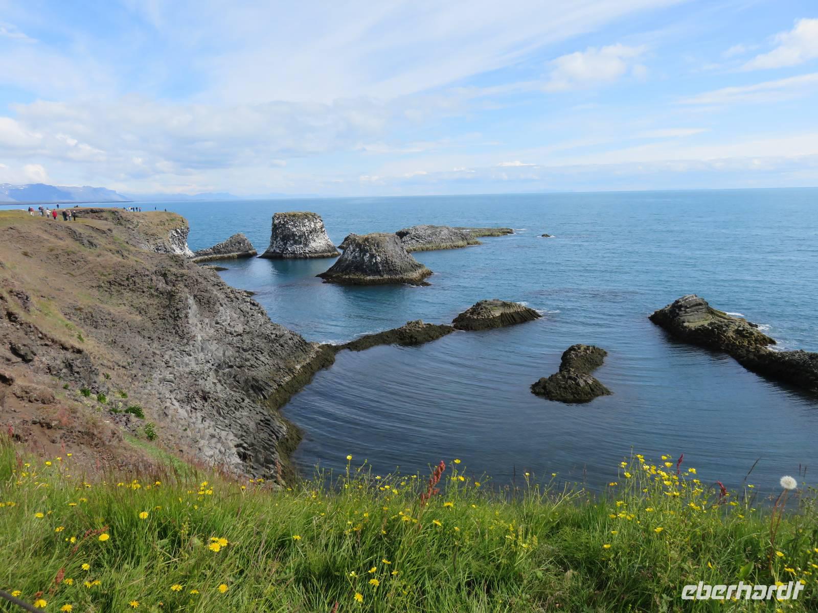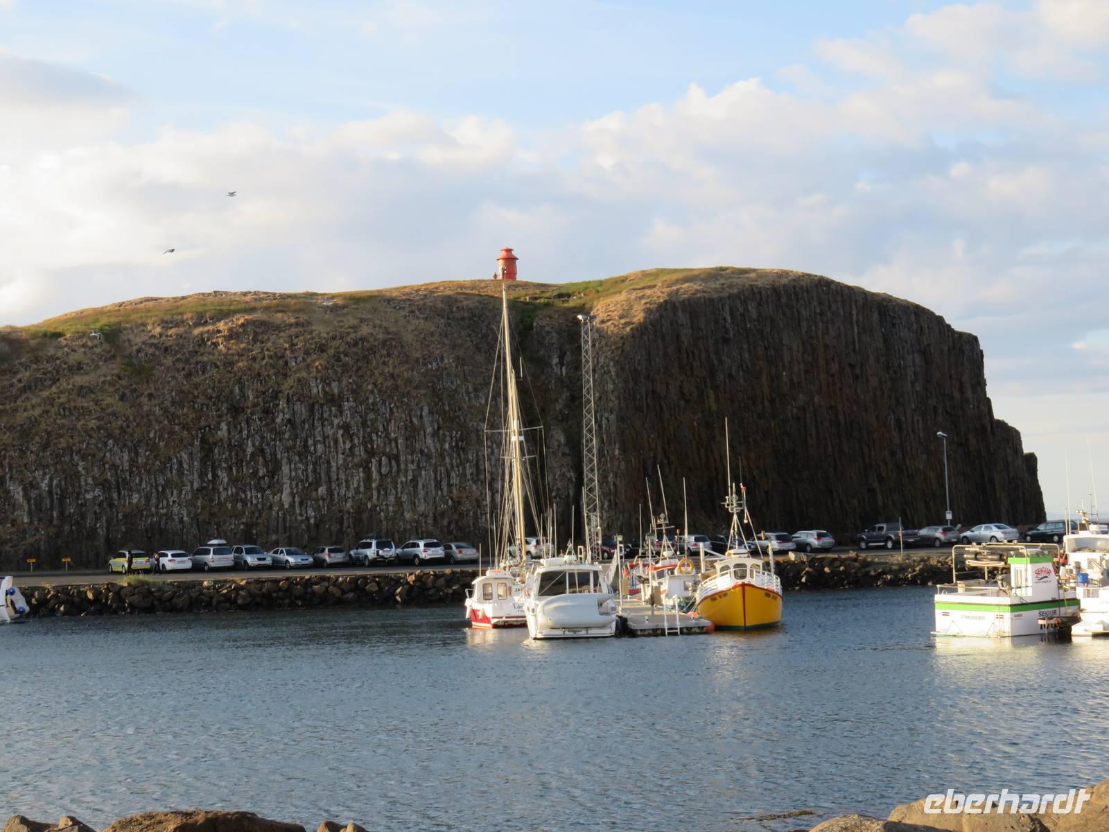 Am Morgen verließen wir Reykjavík. Zunächst kauften wir uns für die Mittagspause alle etwas in einer Bäckerei. Danach setzten wir unsere Tour nach Borgarnes fort. Die Fahrt führte uns durch die wunderschöne Landschaft auf die Halbinsel Snaefellsnes. Nach einem weiteren kurzen Stopp, erreichten wir eine kleine Kirche. Von hier eröffnete sich uns ein herrlicher Blick auf den vergletscherten Vulkan Snaefellsjökull, der der Halbinsel seinen Namen gab. Snaefellsjökull bedeutet so viel wie Schneeberg. Wir unternahmen einen kleinen Spaziergang zum Strand und sahen die erstarrten Lavaformationen. Es ging weiter nach Arnastapi an der Steilküste im Süden der Halbinsel. Wir wanderten am Rand der Steilküste entlang und waren beeindruckt von den einzigartigen verschiedensten Vulkangesteinsformen, die wir entdecken konnten. Basaltsäulen ragten in verschiedenen Varianten aus dem Meer oder bildeten die Steilküste. Lavaformationen waren zu erkennen, wie sie sich einst ihren Weg ins Meer gebahnt hatten. Das Meer hatte riesige Löcher in die Küste gearbeitet an deren Wänden Möwen nisteten. Bei schönstem Sonnenschein genossen wir die Aussicht. Nach einer ausgiebigen Pause setzten wir unsere Fahrt fort. Bei Dritvik Djupalonssandur unternahmen wir nochmals eine kleine Wanderung hinunter zum Meer. Einige probierten sich an den Kraftsteinen, mit denen in früheren Zeiten die Männer ihre Kräfte maßen. Am Strand lagen noch Teile eines Schiffswraks, welches 1948 hier strandete. Auch hier sahen wir, mit welchen Kräften das Wasser die Gesteinsformationen formte und bis heute formt. Auf dem Rückweg entdeckenden wir sogar noch versteinerte Trolle. Wir sahen einen Troll, einen Bär und einen Hund. Nun legten wir unsere letzte Etappe bis zum kleinen Ort Stykkisholmur. Wir erreichten unser Hotel und nach einem schmackhaften Abendessen, erkundeten wir den kleinen Ort. Wir sahen die moderne Kirche, welche erst im Jahr 1990 erbaut wurde, den Hafen und einige erklommen den Felsen mit dem Leuchtturm. Ihnen eröffnete sich eine fantastische Sicht auf den Ort und zu den Vulkanen.