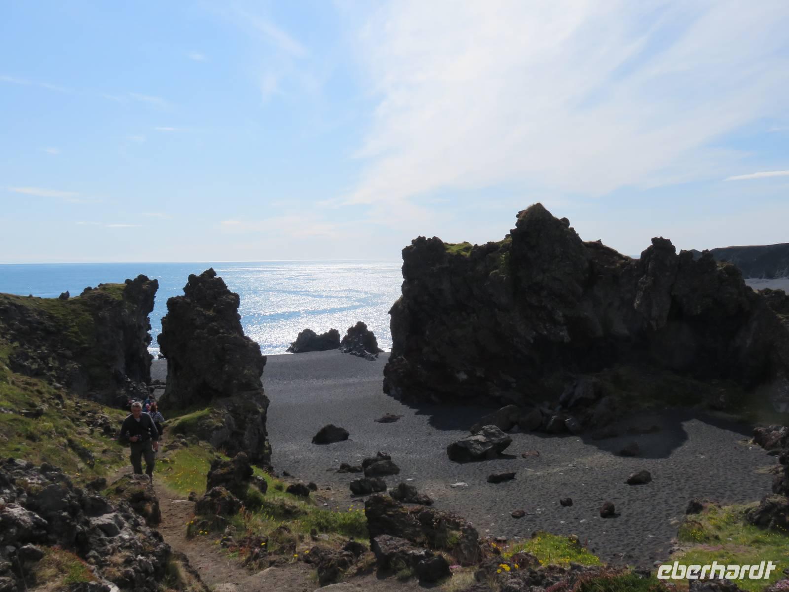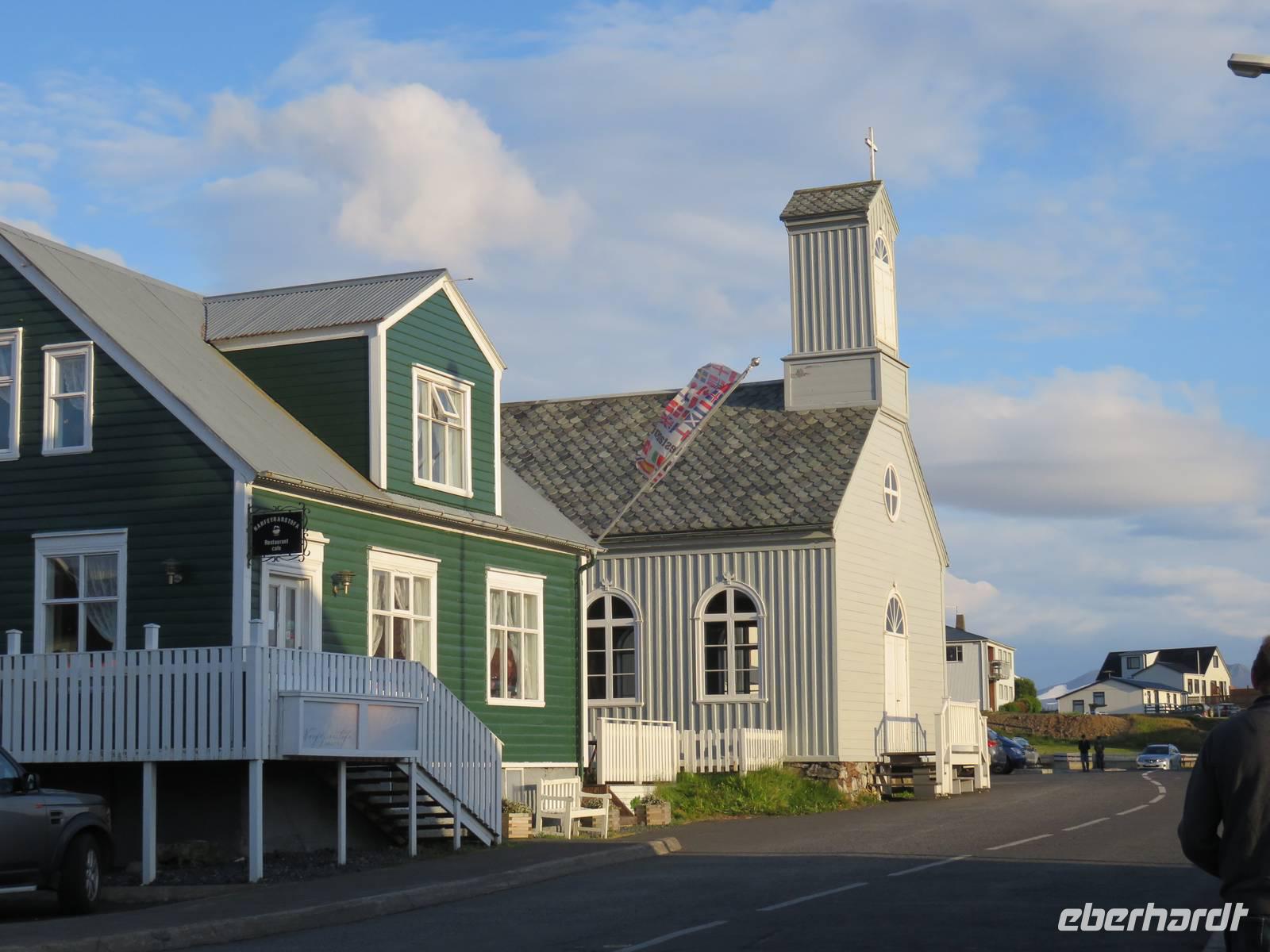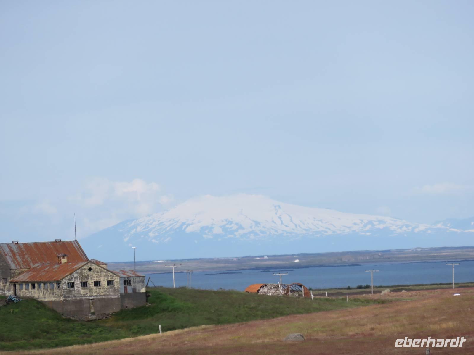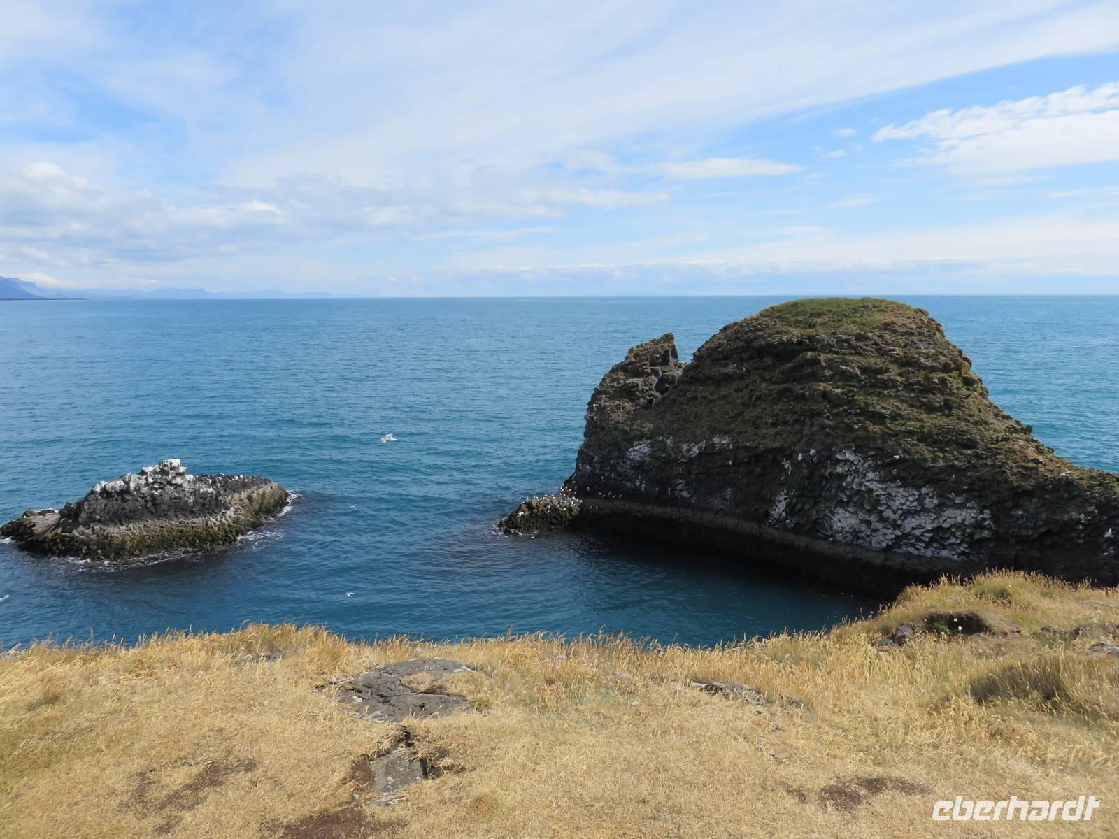 Am Morgen verließen wir Reykjavík. Zunächst kauften wir uns für die Mittagspause alle etwas in einer Bäckerei. Danach setzten wir unsere Tour nach Borgarnes fort. Die Fahrt führte uns durch die wunderschöne Landschaft auf die Halbinsel Snaefellsnes. Nach einem weiteren kurzen Stopp, erreichten wir eine kleine Kirche. Von hier eröffnete sich uns ein herrlicher Blick auf den vergletscherten Vulkan Snaefellsjökull, der der Halbinsel seinen Namen gab. Snaefellsjökull bedeutet so viel wie Schneeberg. Wir unternahmen einen kleinen Spaziergang zum Strand und sahen die erstarrten Lavaformationen. Es ging weiter nach Arnastapi an der Steilküste im Süden der Halbinsel. Wir wanderten am Rand der Steilküste entlang und waren beeindruckt von den einzigartigen verschiedensten Vulkangesteinsformen, die wir entdecken konnten. Basaltsäulen ragten in verschiedenen Varianten aus dem Meer oder bildeten die Steilküste. Lavaformationen waren zu erkennen, wie sie sich einst ihren Weg ins Meer gebahnt hatten. Das Meer hatte riesige Löcher in die Küste gearbeitet an deren Wänden Möwen nisteten. Bei schönstem Sonnenschein genossen wir die Aussicht. Nach einer ausgiebigen Pause setzten wir unsere Fahrt fort. Bei Dritvik Djupalonssandur unternahmen wir nochmals eine kleine Wanderung hinunter zum Meer. Einige probierten sich an den Kraftsteinen, mit denen in früheren Zeiten die Männer ihre Kräfte maßen. Am Strand lagen noch Teile eines Schiffswraks, welches 1948 hier strandete. Auch hier sahen wir, mit welchen Kräften das Wasser die Gesteinsformationen formte und bis heute formt. Auf dem Rückweg entdeckenden wir sogar noch versteinerte Trolle. Wir sahen einen Troll, einen Bär und einen Hund. Nun legten wir unsere letzte Etappe bis zum kleinen Ort Stykkisholmur. Wir erreichten unser Hotel und nach einem schmackhaften Abendessen, erkundeten wir den kleinen Ort. Wir sahen die moderne Kirche, welche erst im Jahr 1990 erbaut wurde, den Hafen und einige erklommen den Felsen mit dem Leuchtturm. Ihnen eröffnete sich eine fantastische Sicht auf den Ort und zu den Vulkanen.