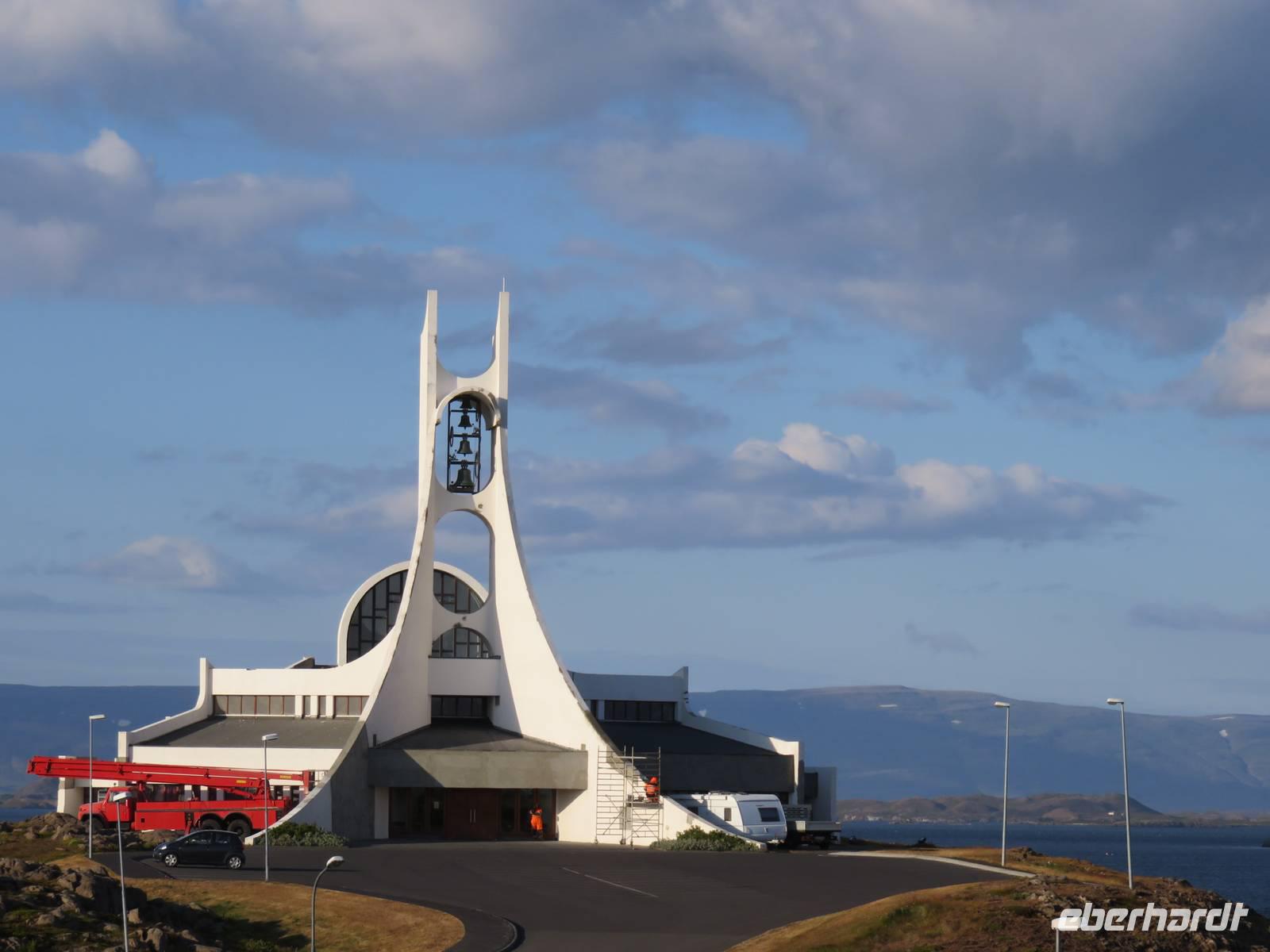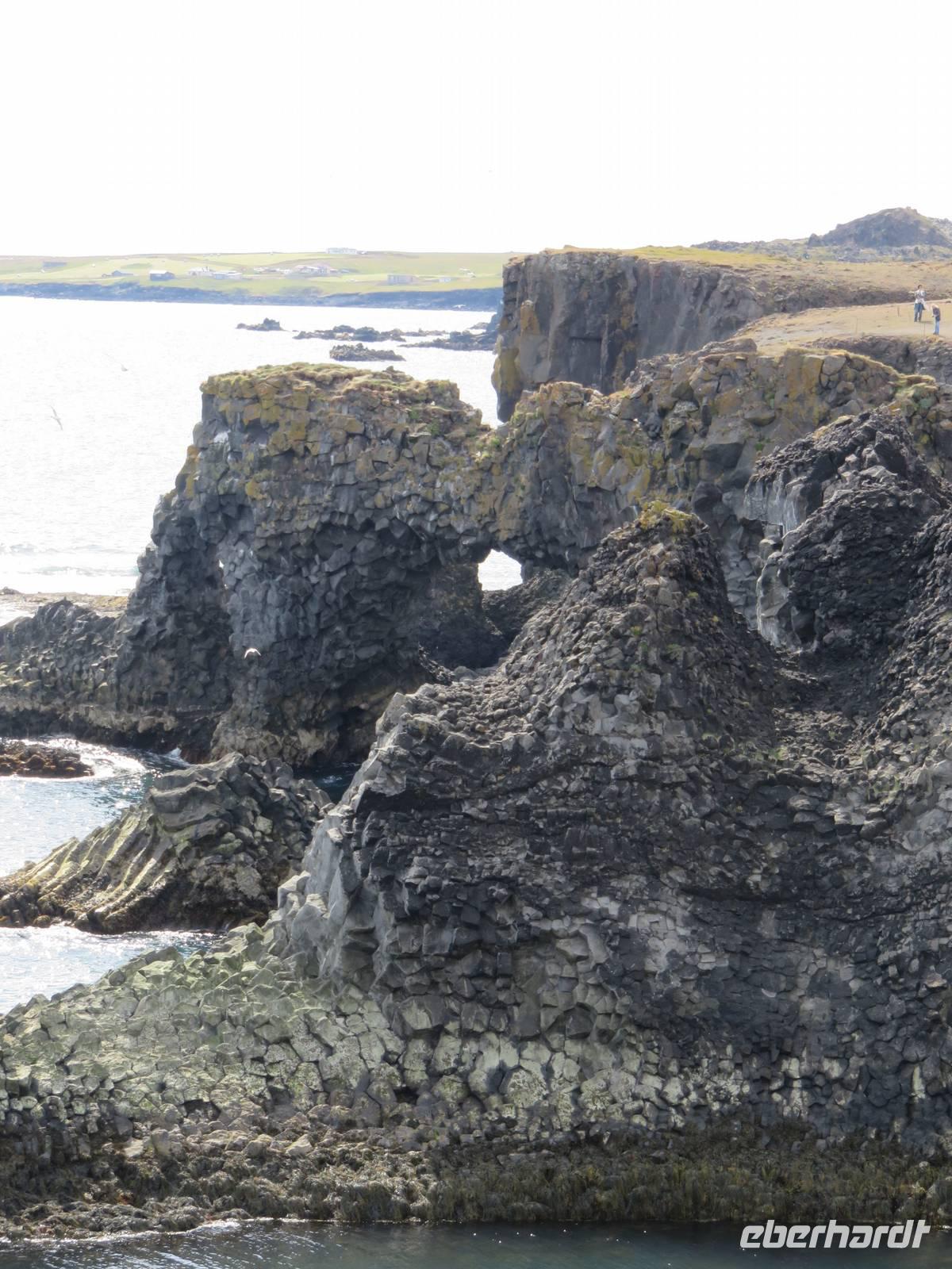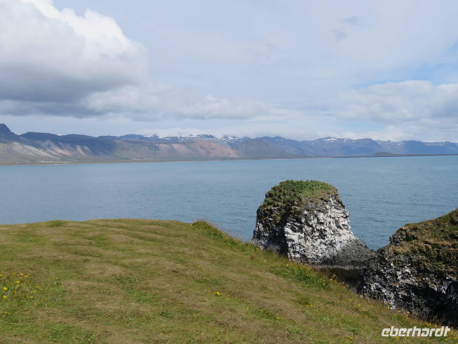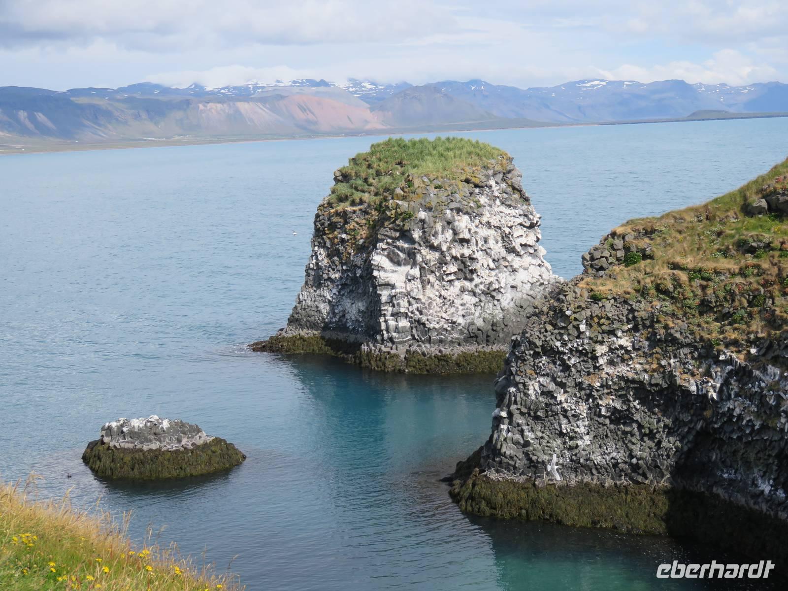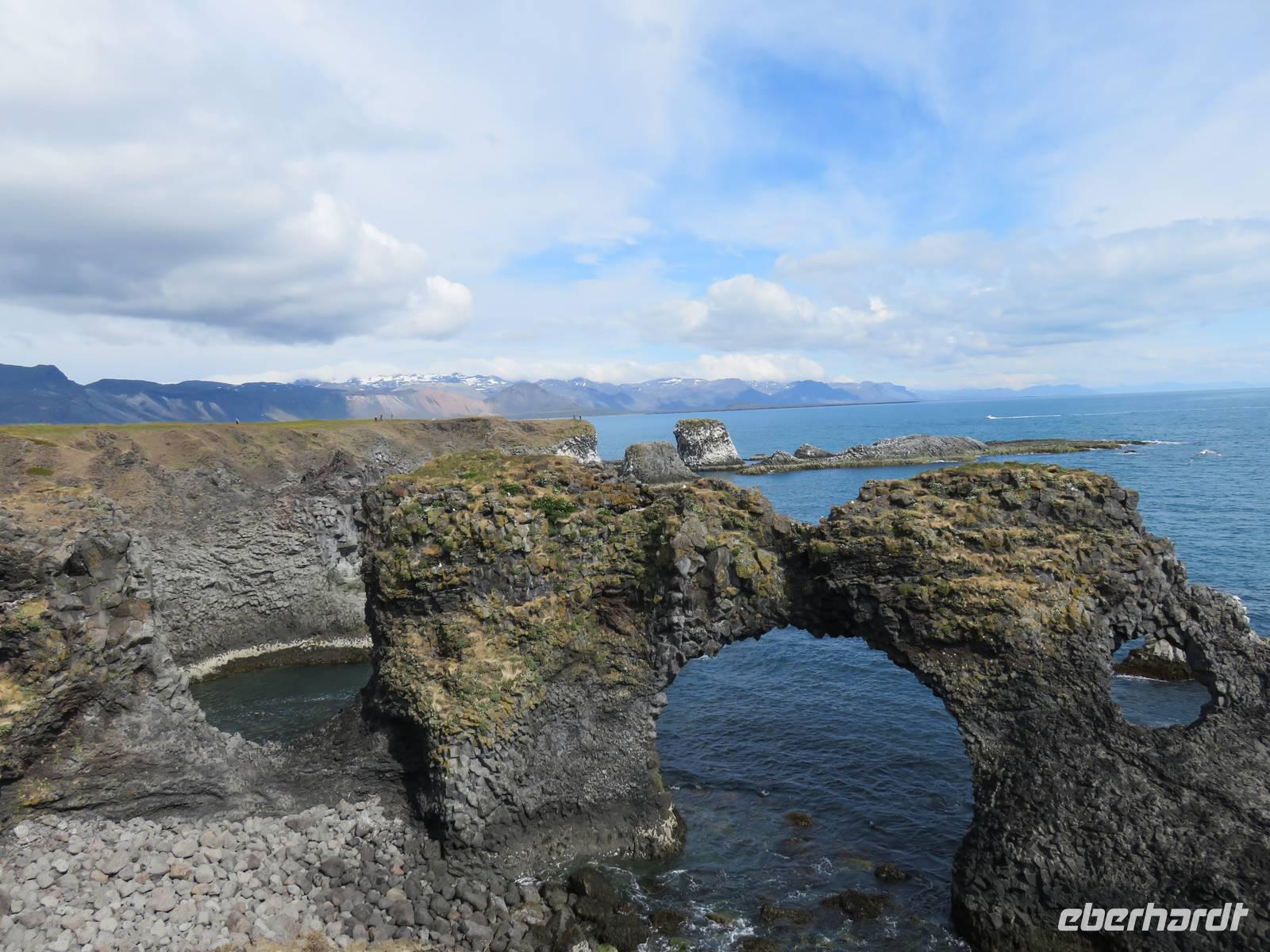 Am Morgen verließen wir Reykjavík. Zunächst kauften wir uns für die Mittagspause alle etwas in einer Bäckerei. Danach setzten wir unsere Tour nach Borgarnes fort. Die Fahrt führte uns durch die wunderschöne Landschaft auf die Halbinsel Snaefellsnes. Nach einem weiteren kurzen Stopp, erreichten wir eine kleine Kirche. Von hier eröffnete sich uns ein herrlicher Blick auf den vergletscherten Vulkan Snaefellsjökull, der der Halbinsel seinen Namen gab. Snaefellsjökull bedeutet so viel wie Schneeberg. Wir unternahmen einen kleinen Spaziergang zum Strand und sahen die erstarrten Lavaformationen. Es ging weiter nach Arnastapi an der Steilküste im Süden der Halbinsel. Wir wanderten am Rand der Steilküste entlang und waren beeindruckt von den einzigartigen verschiedensten Vulkangesteinsformen, die wir entdecken konnten. Basaltsäulen ragten in verschiedenen Varianten aus dem Meer oder bildeten die Steilküste. Lavaformationen waren zu erkennen, wie sie sich einst ihren Weg ins Meer gebahnt hatten. Das Meer hatte riesige Löcher in die Küste gearbeitet an deren Wänden Möwen nisteten. Bei schönstem Sonnenschein genossen wir die Aussicht. Nach einer ausgiebigen Pause setzten wir unsere Fahrt fort. Bei Dritvik Djupalonssandur unternahmen wir nochmals eine kleine Wanderung hinunter zum Meer. Einige probierten sich an den Kraftsteinen, mit denen in früheren Zeiten die Männer ihre Kräfte maßen. Am Strand lagen noch Teile eines Schiffswraks, welches 1948 hier strandete. Auch hier sahen wir, mit welchen Kräften das Wasser die Gesteinsformationen formte und bis heute formt. Auf dem Rückweg entdeckenden wir sogar noch versteinerte Trolle. Wir sahen einen Troll, einen Bär und einen Hund. Nun legten wir unsere letzte Etappe bis zum kleinen Ort Stykkisholmur. Wir erreichten unser Hotel und nach einem schmackhaften Abendessen, erkundeten wir den kleinen Ort. Wir sahen die moderne Kirche, welche erst im Jahr 1990 erbaut wurde, den Hafen und einige erklommen den Felsen mit dem Leuchtturm. Ihnen eröffnete sich eine fantastische Sicht auf den Ort und zu den Vulkanen.